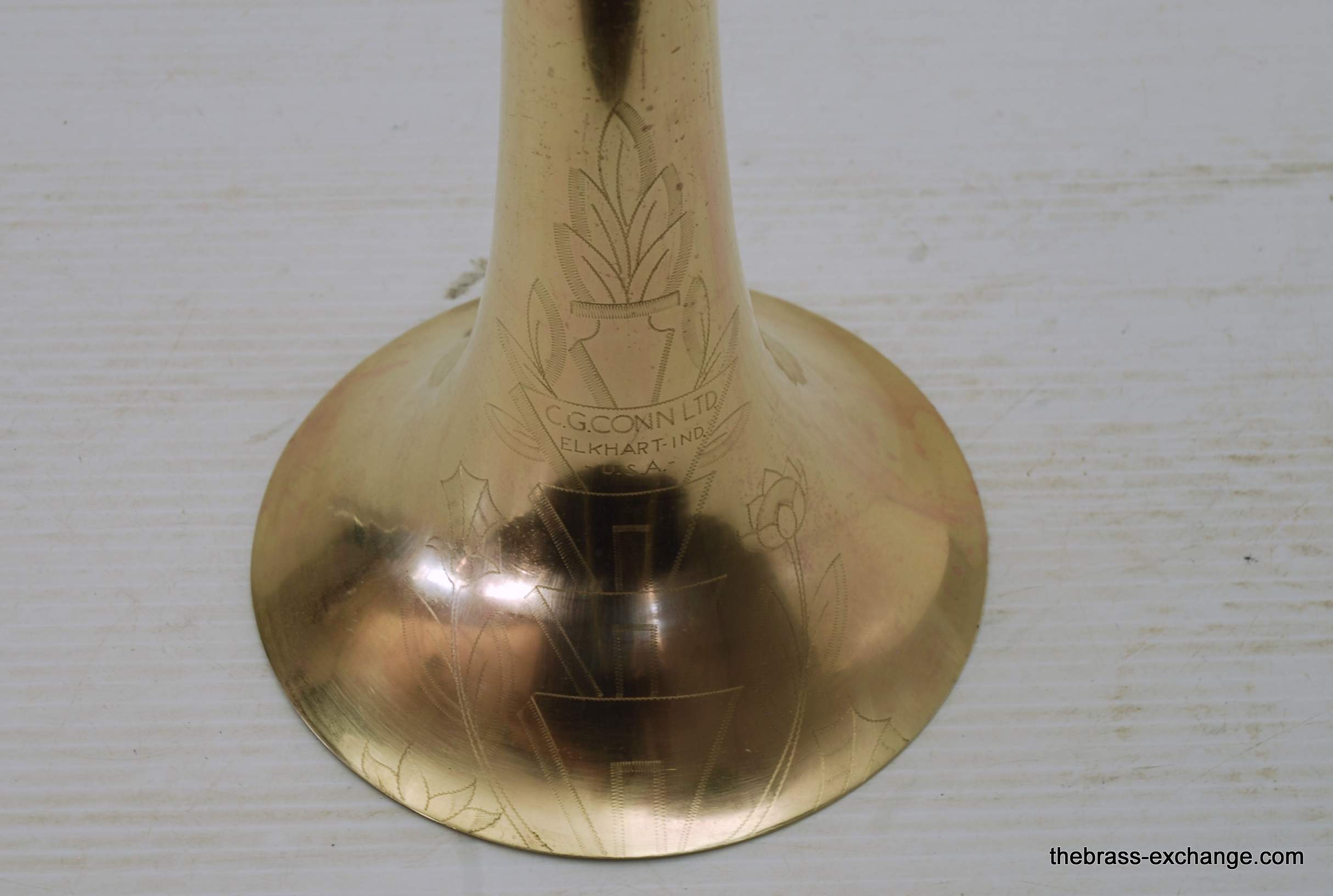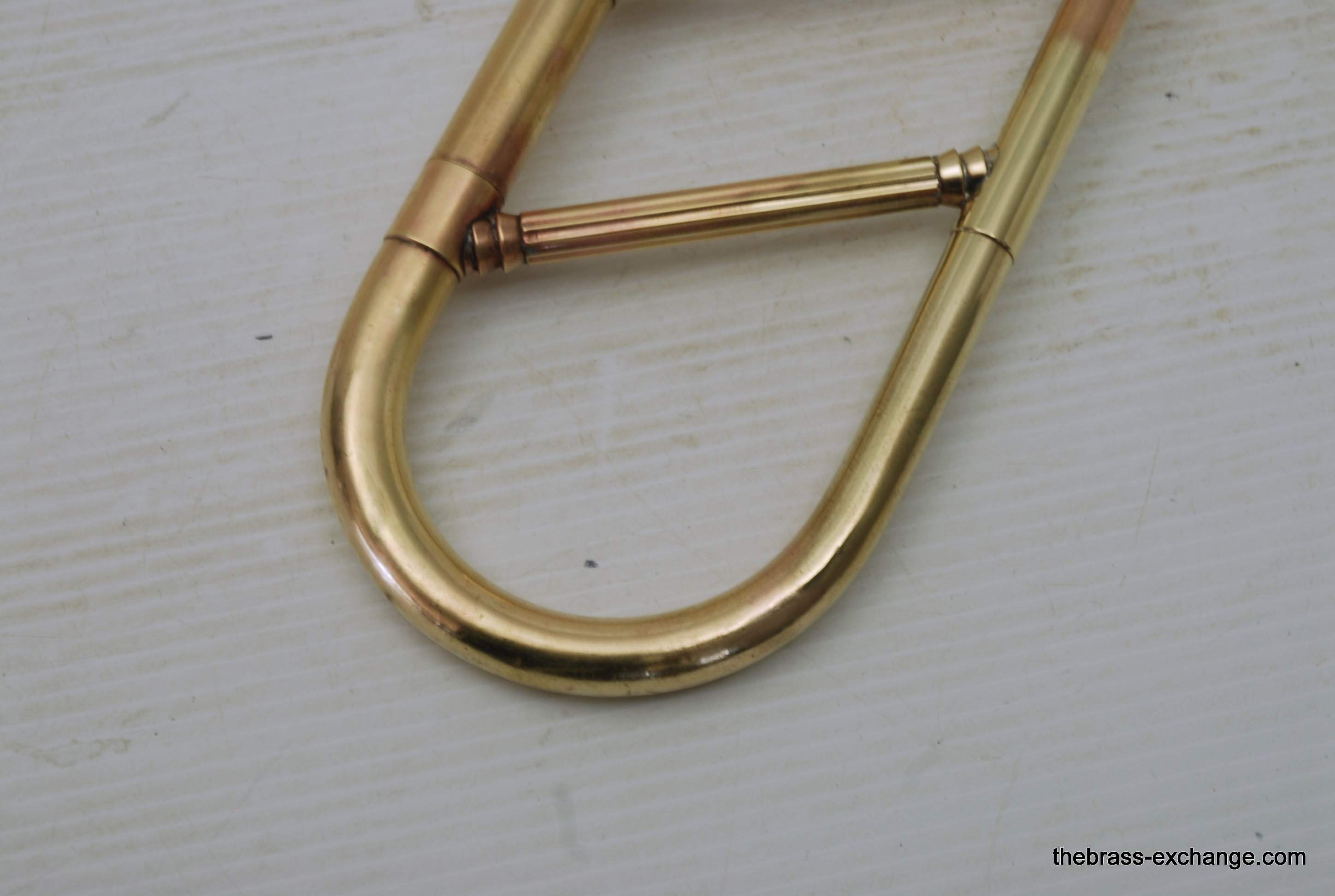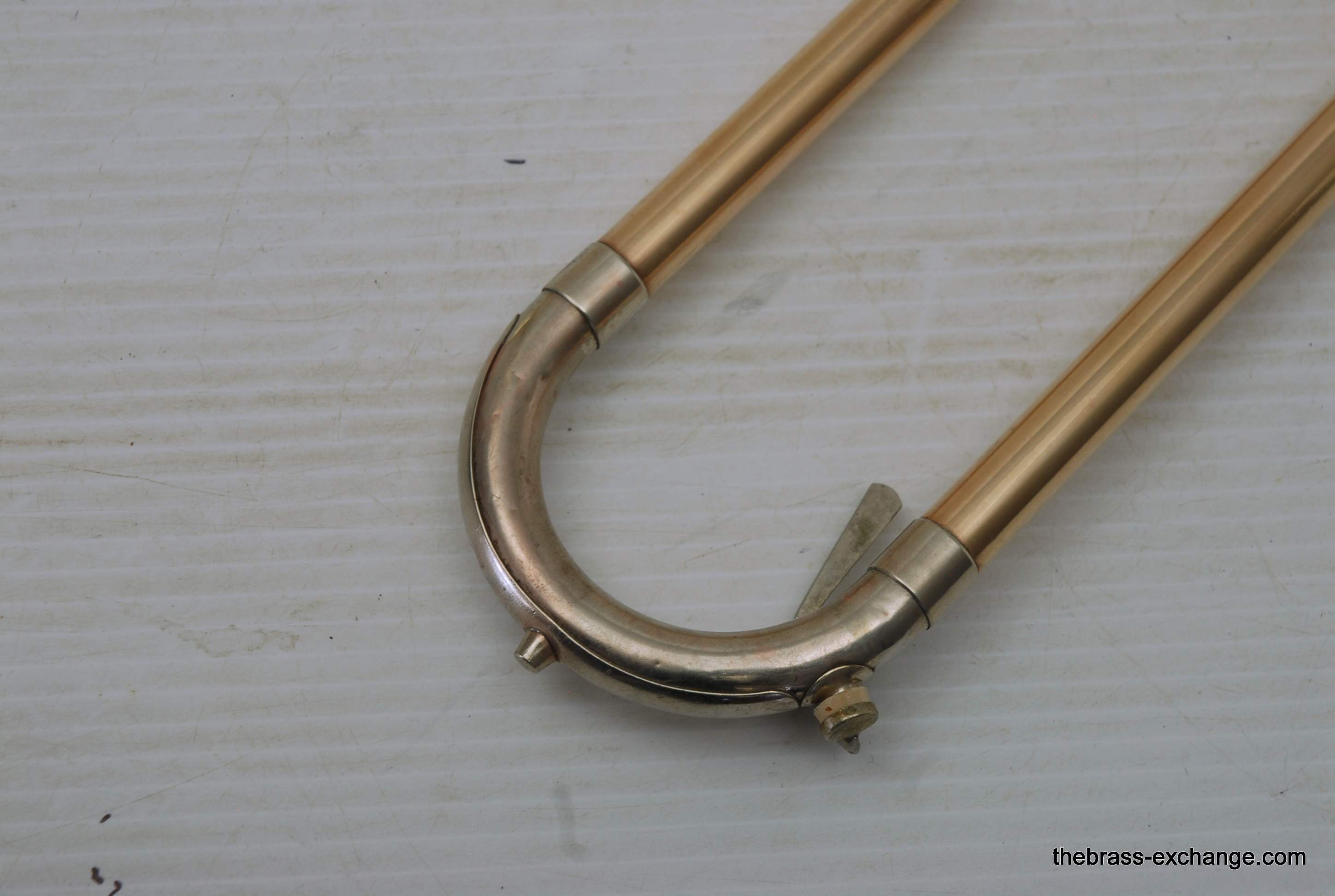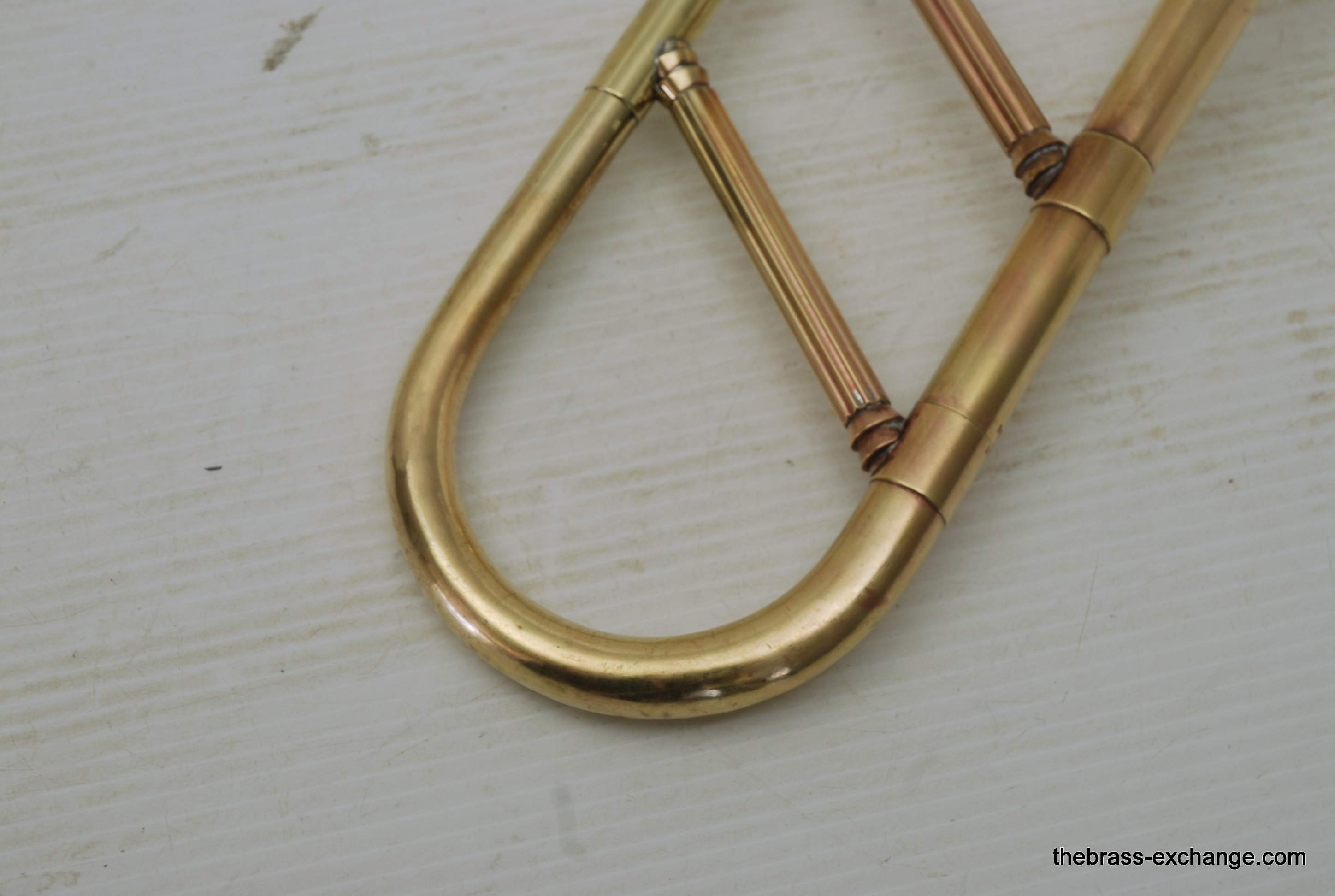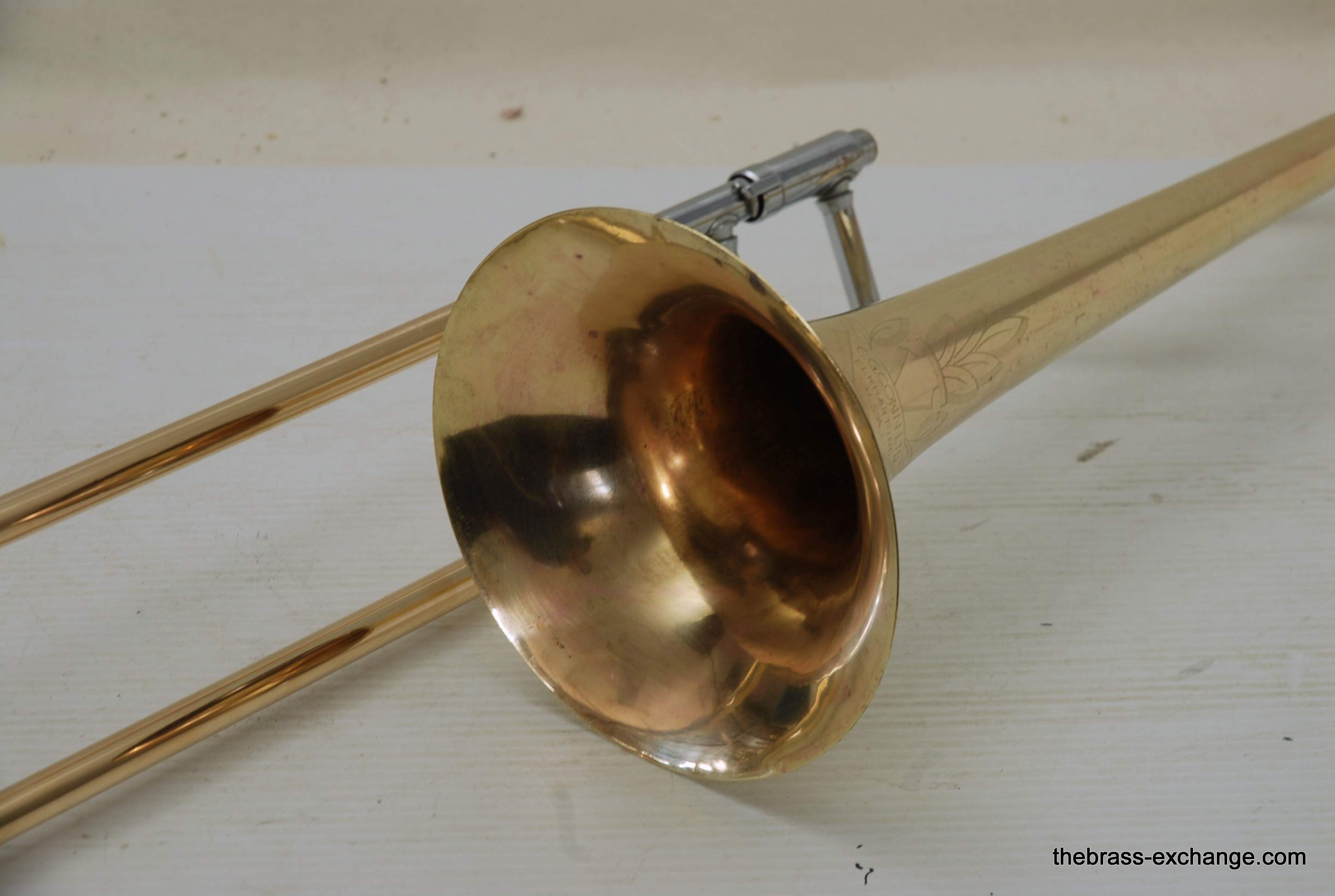 Conn 44H Vocabell Vintage 1947. This model is also known as the Conqueror. Has 7” yellow brass rimless bell. The alloy is heavier gauge than most of the vintage Conns. Handslide is .485 bore standard weight. We have had many 44H’s over the years here and know a good one when we play it. This one is good. It is super straight. Handslide is very good and without inner slide defects, very straight tubes and plays loose. Unlacquered bell section, but never any bell damage. Is a very straight horn. Is the type of horn that you can play lead in a big band, trad jazz, dixie. Feels and sounds great. Has had the full shop service including chemical bath and slide adjust. Does not have original case, no case included. In-stock