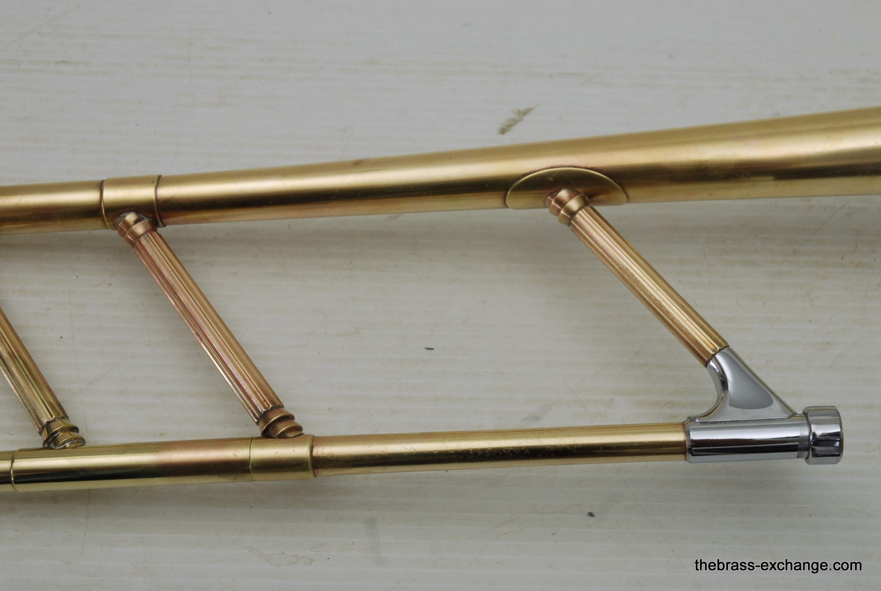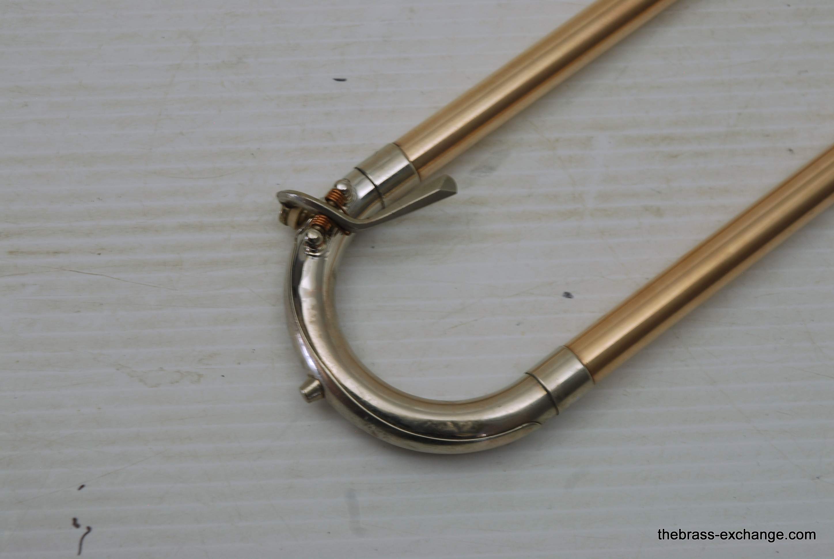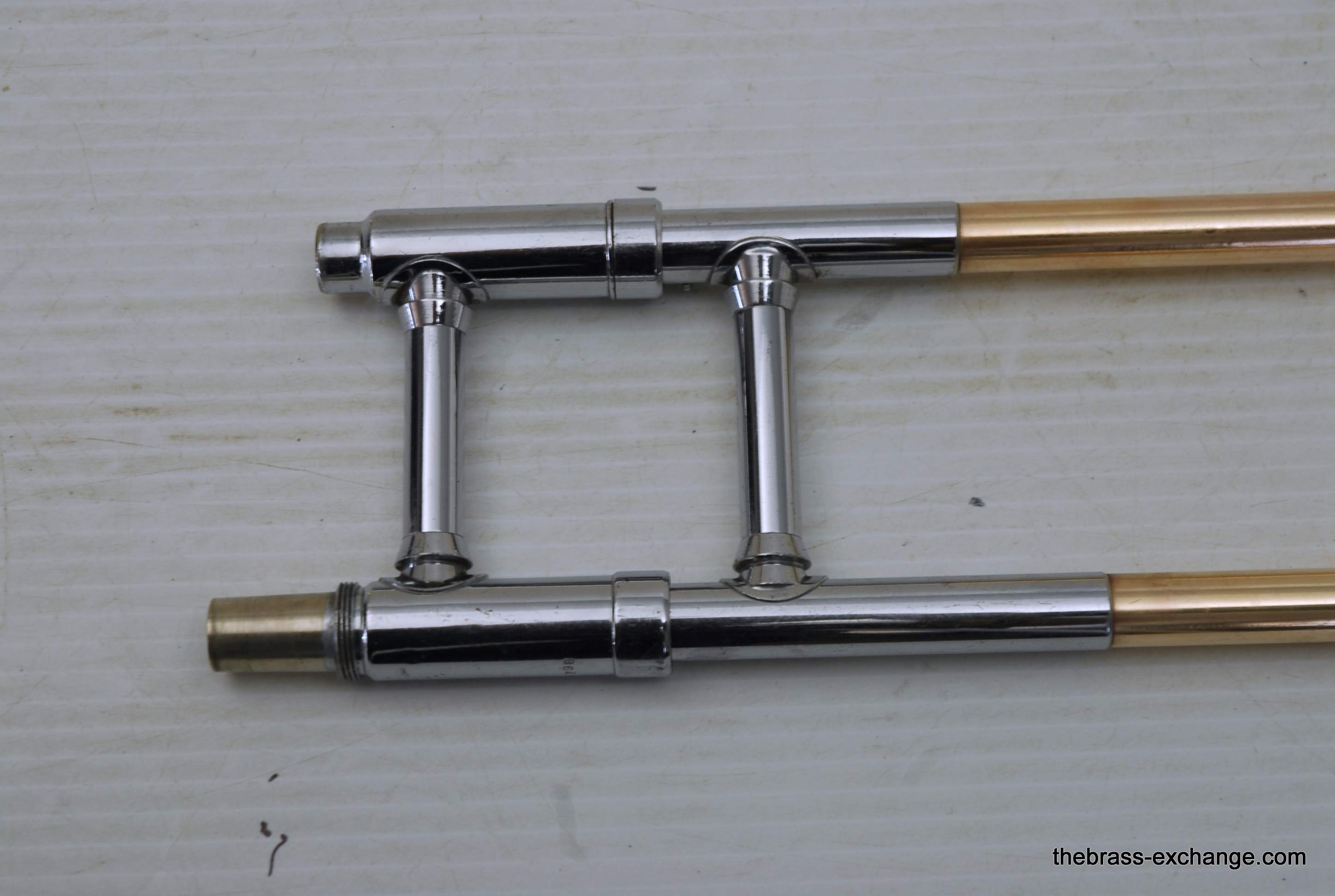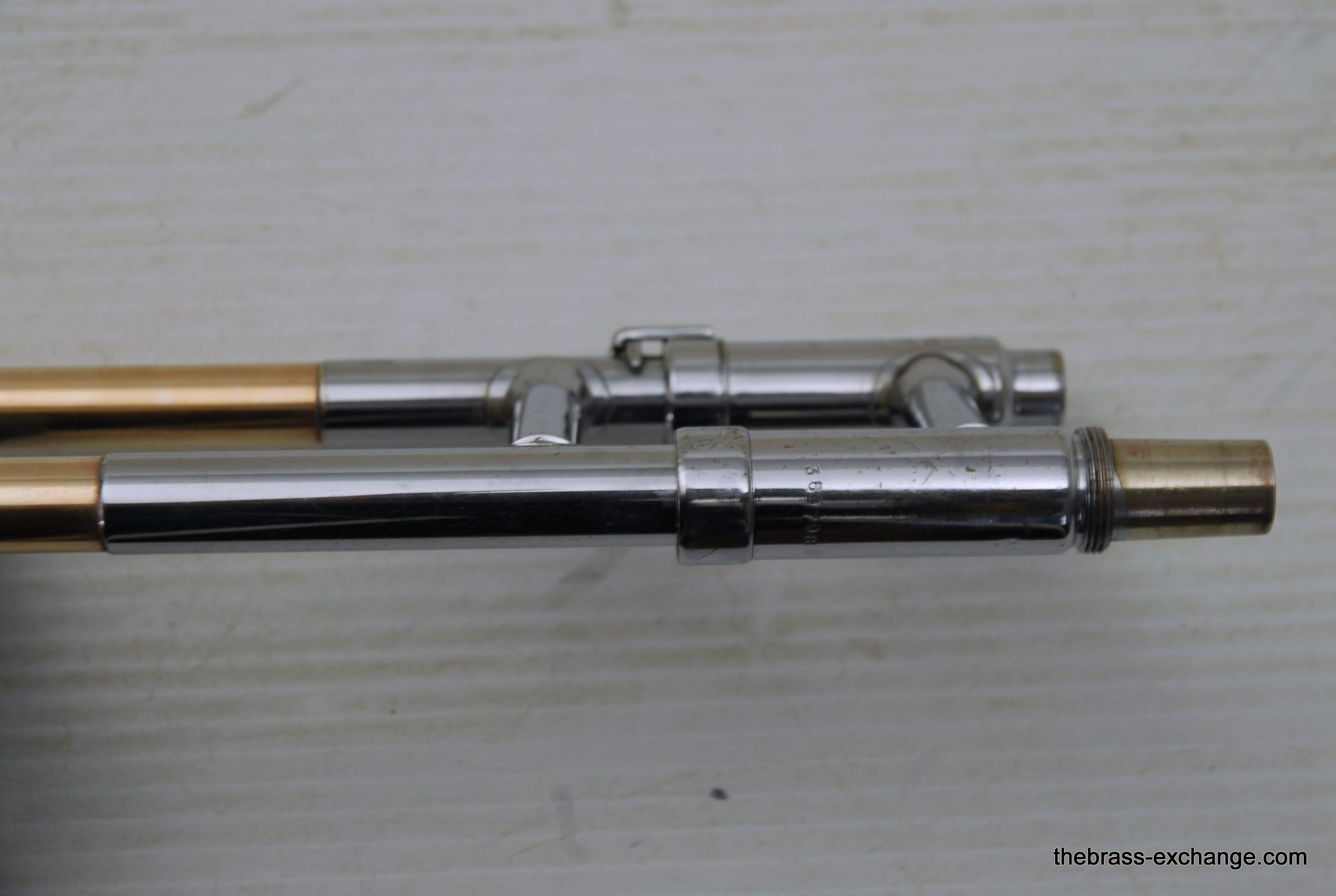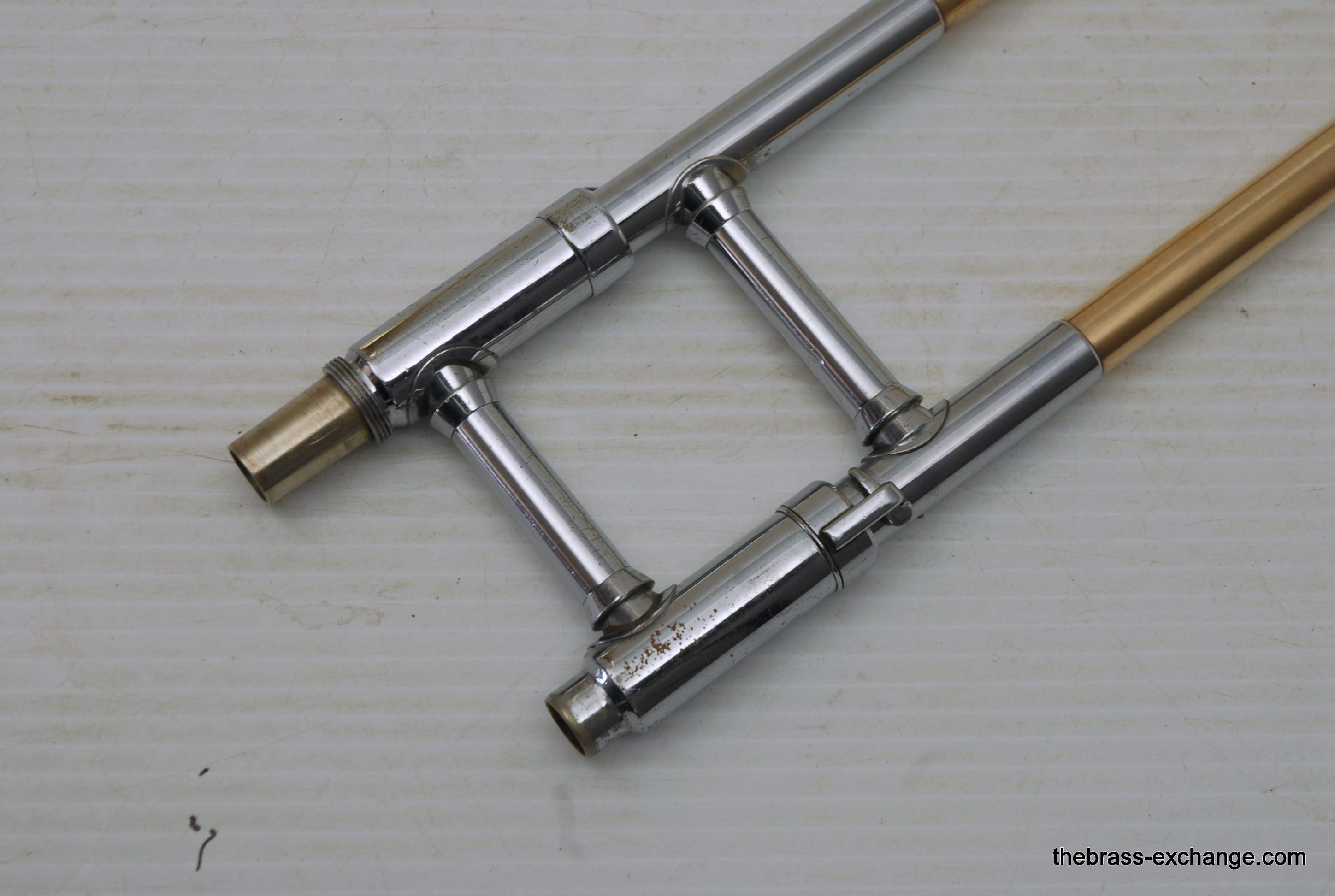 Conn 44H Vocabell Vintage 1947. This model is also known as the Conqueror. Has 7” yellow brass rimless bell. The alloy is heavier gauge than most of the vintage Conns. Handslide is .485 bore standard weight. We have had many 44H’s over the years here and know a good one when we play it. This one is good. It is super straight. Handslide is very good and without inner slide defects, very straight tubes and plays loose. Unlacquered bell section, but never any bell damage. Is a very straight horn. Is the type of horn that you can play lead in a big band, trad jazz, dixie. Feels and sounds great. Has had the full shop service including chemical bath and slide adjust. Does not have original case, no case included. In-stock