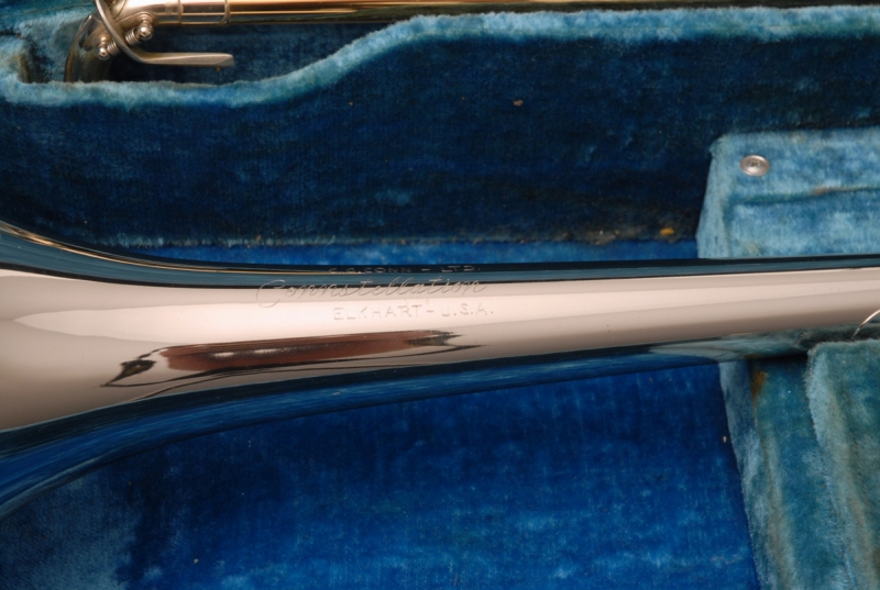 The 48H was part of Conn’s professional line and features standard specs for the model: an 8-inch nickel silver bell, .500 bore handslide, and distinctive styling that made the Connstellation a favorite among lead players in the 1950s and ’60s. This one still has its original mouthpiece and hard case, completing the rare collector-grade package.