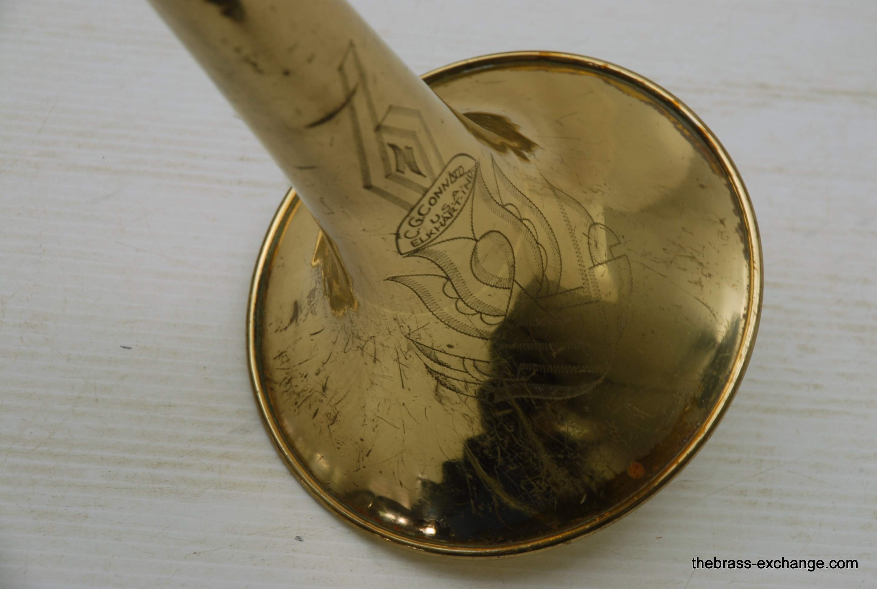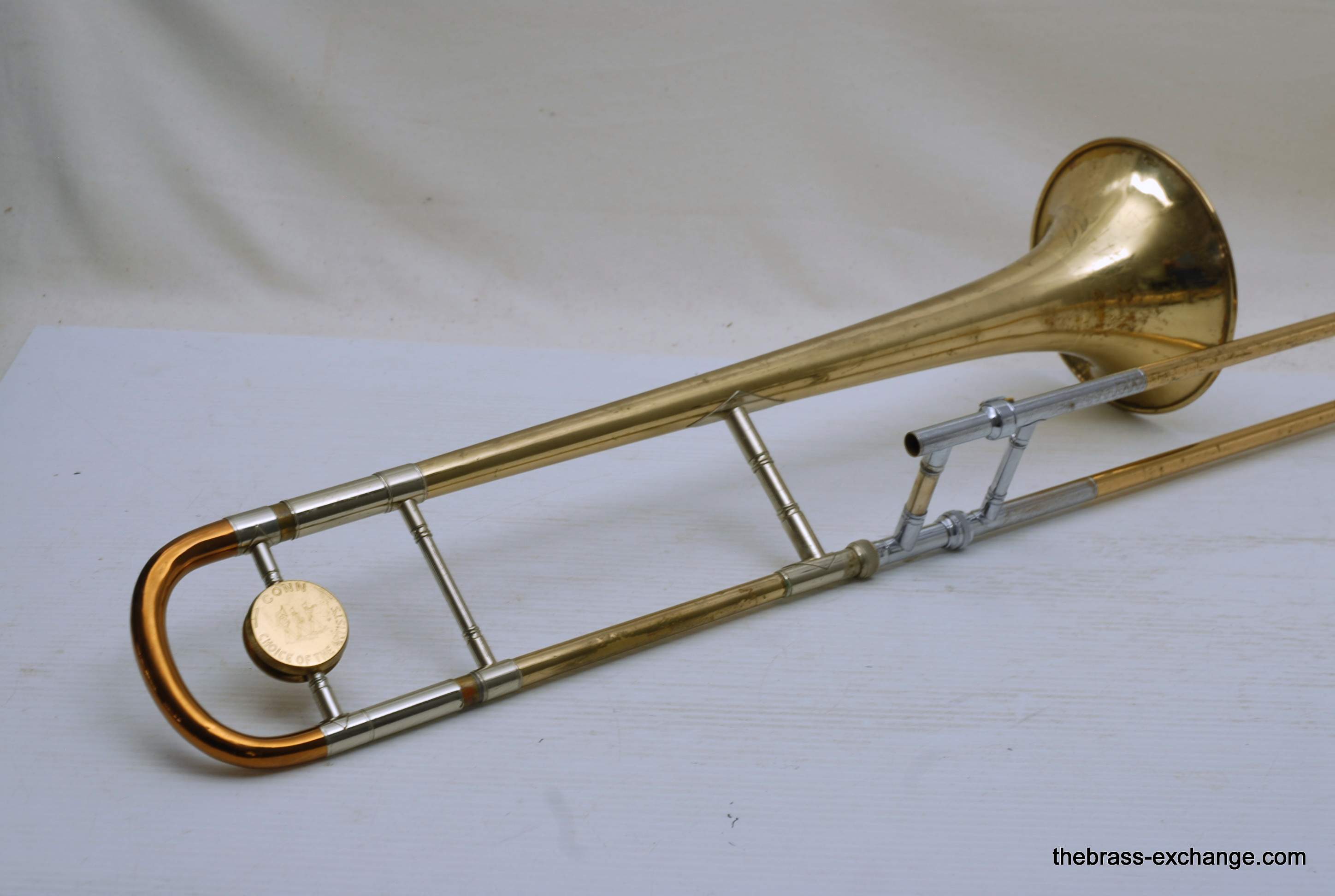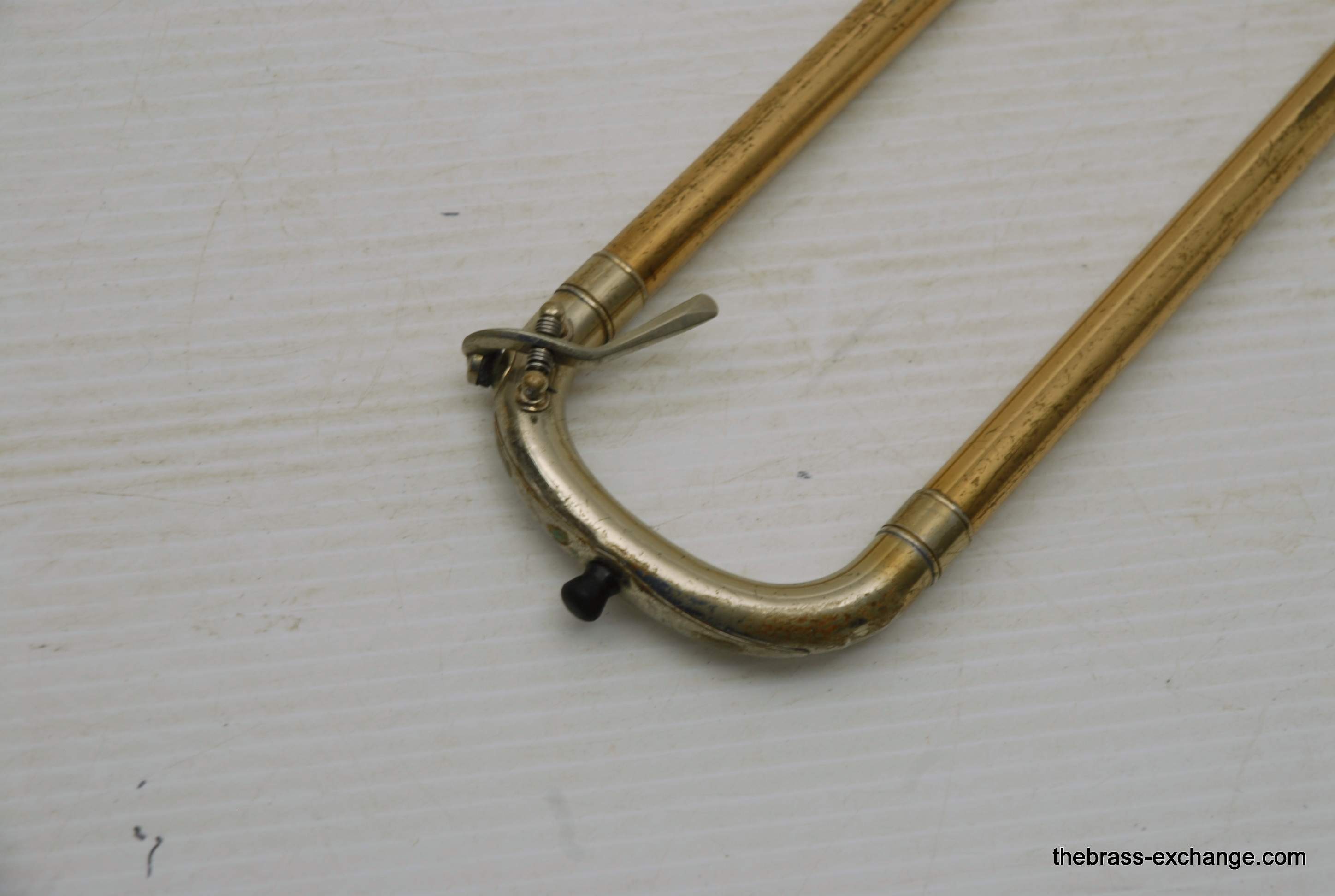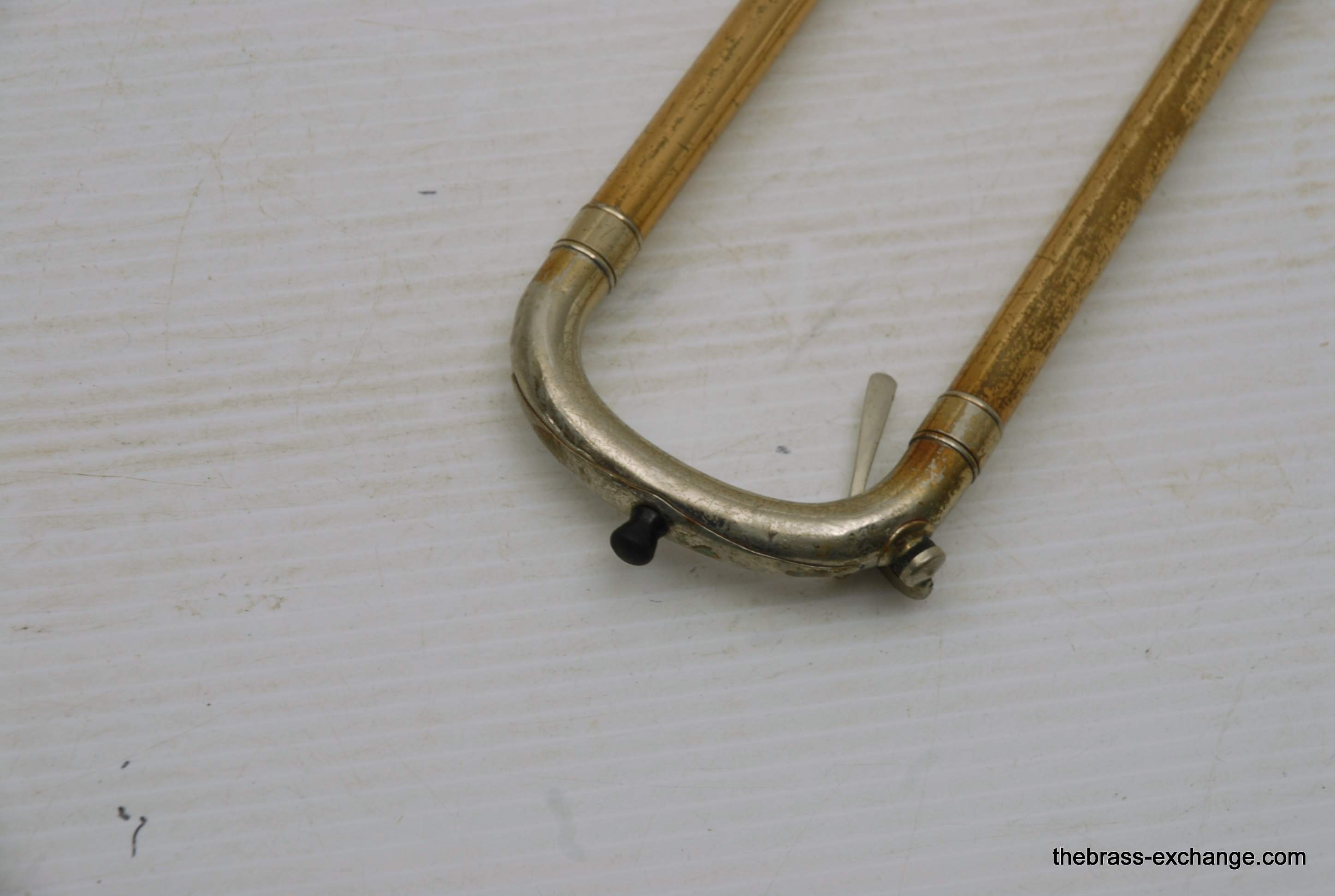 Conn 4H L-W Vintage 1948 Small Bore Tenor Trombone, SN 379607. Classic small bore tenor, professional level, Elkhart IN make. This the the Light weight model and is stamped L-W by the SN. Has yellow brass bell, brass handslide with nickel silver end crook. Tuning Slide is gold brass, has fancy 2 piece Conn balance weight. All original parts and lacquer. Has had full shop service including chemical bath. Bell section has the half moon deco style engraving. This is a good playing 4H. There is some plating loss on the slide inner- but there are different types of plating loss- this is smooth wear and does not create drag or tension in the slide because the tubes are totally straight, and the slide falls very easily with gravitiy. This would be an awesome vintage horn for any player lookng in this size. Attention Parents looking for a horn for a younger kid: This is professional level, and pro quality build. Modern day student models do not even compare to quality or playabiltiy. I highly reccomend this horn for a kid starting out. Has new MTS case, made in Indiana, includes mouthpiece. In-stock for immediate delivery.
