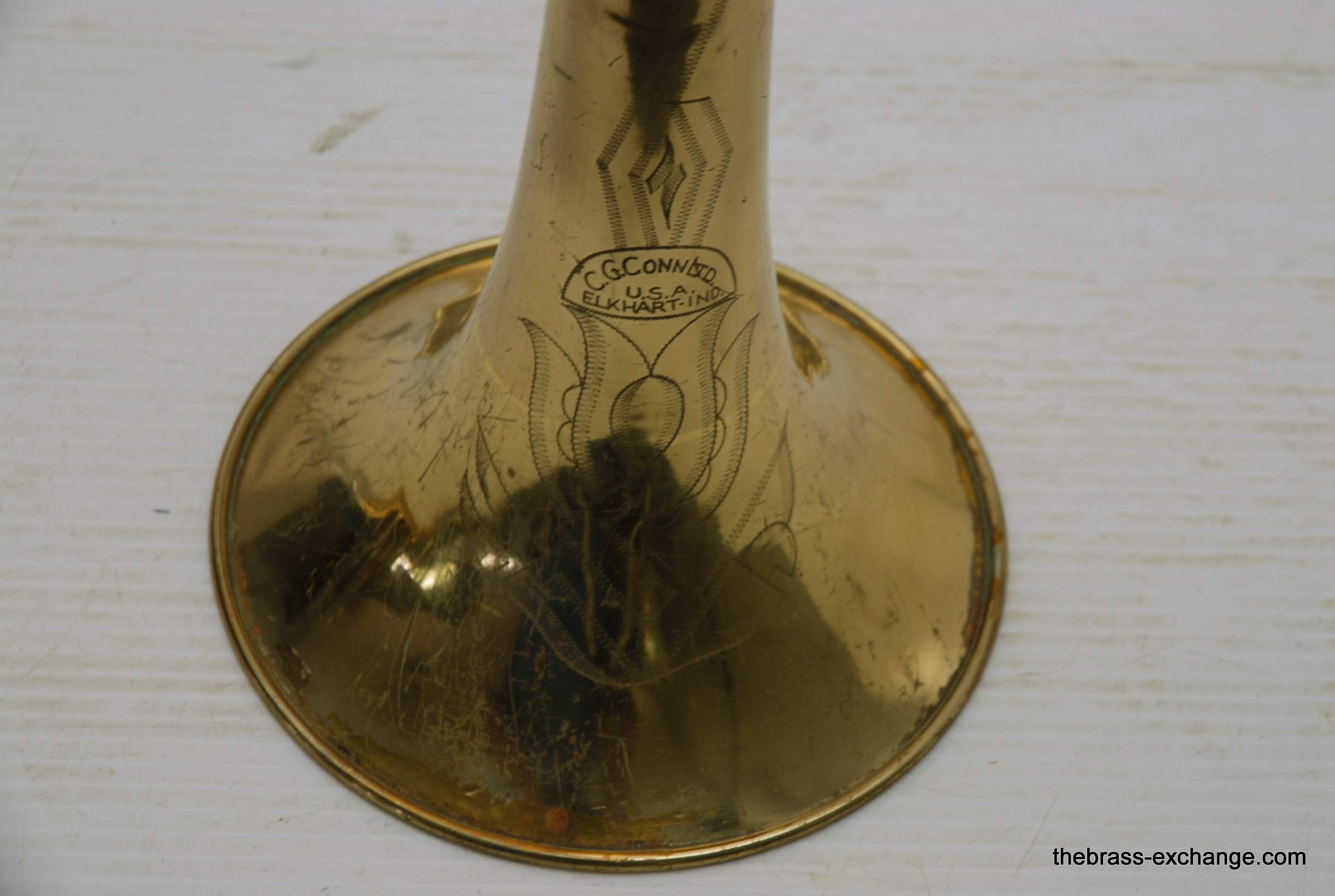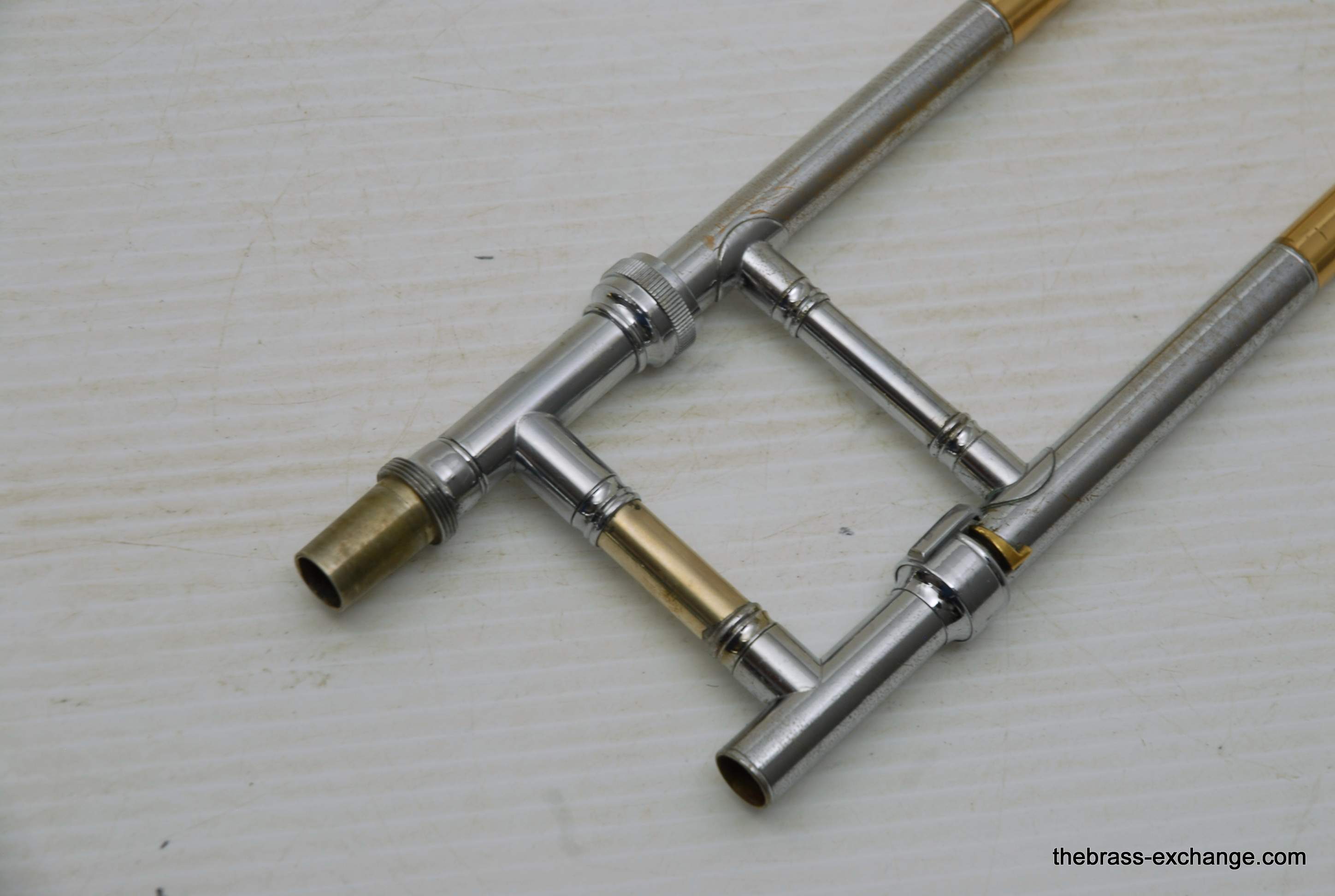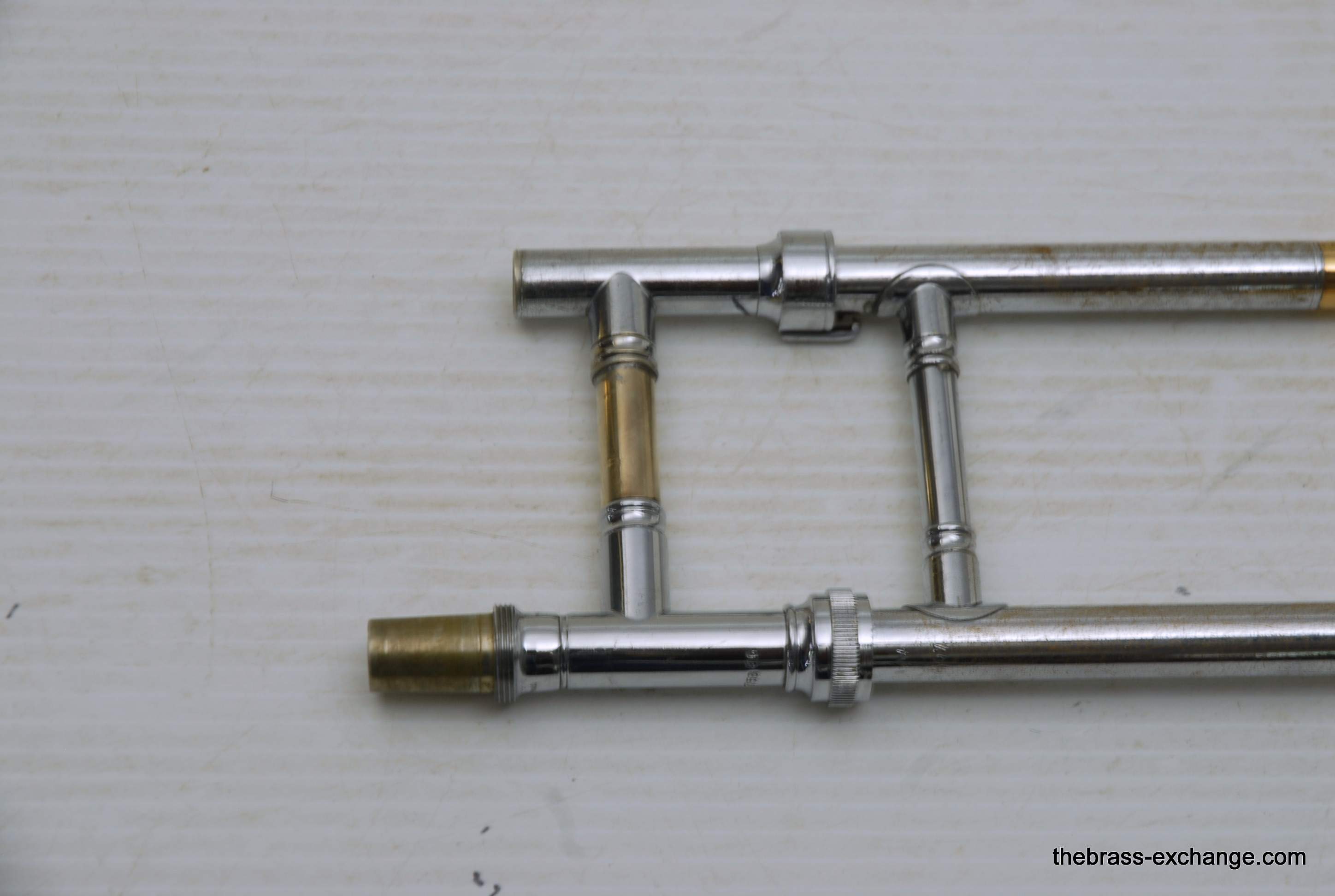 Conn 4H L-W Vintage 1948 Small Bore Tenor Trombone, SN 379607. Classic small bore tenor, professional level, Elkhart IN make. This the the Light weight model and is stamped L-W by the SN. Has yellow brass bell, brass handslide with nickel silver end crook. Tuning Slide is gold brass, has fancy 2 piece Conn balance weight. All original parts and lacquer. Has had full shop service including chemical bath. Bell section has the half moon deco style engraving. This is a good playing 4H. There is some plating loss on the slide inner- but there are different types of plating loss- this is smooth wear and does not create drag or tension in the slide because the tubes are totally straight, and the slide falls very easily with gravitiy. This would be an awesome vintage horn for any player lookng in this size. Attention Parents looking for a horn for a younger kid: This is professional level, and pro quality build. Modern day student models do not even compare to quality or playabiltiy. I highly reccomend this horn for a kid starting out. Has new MTS case, made in Indiana, includes mouthpiece. In-stock for immediate delivery.