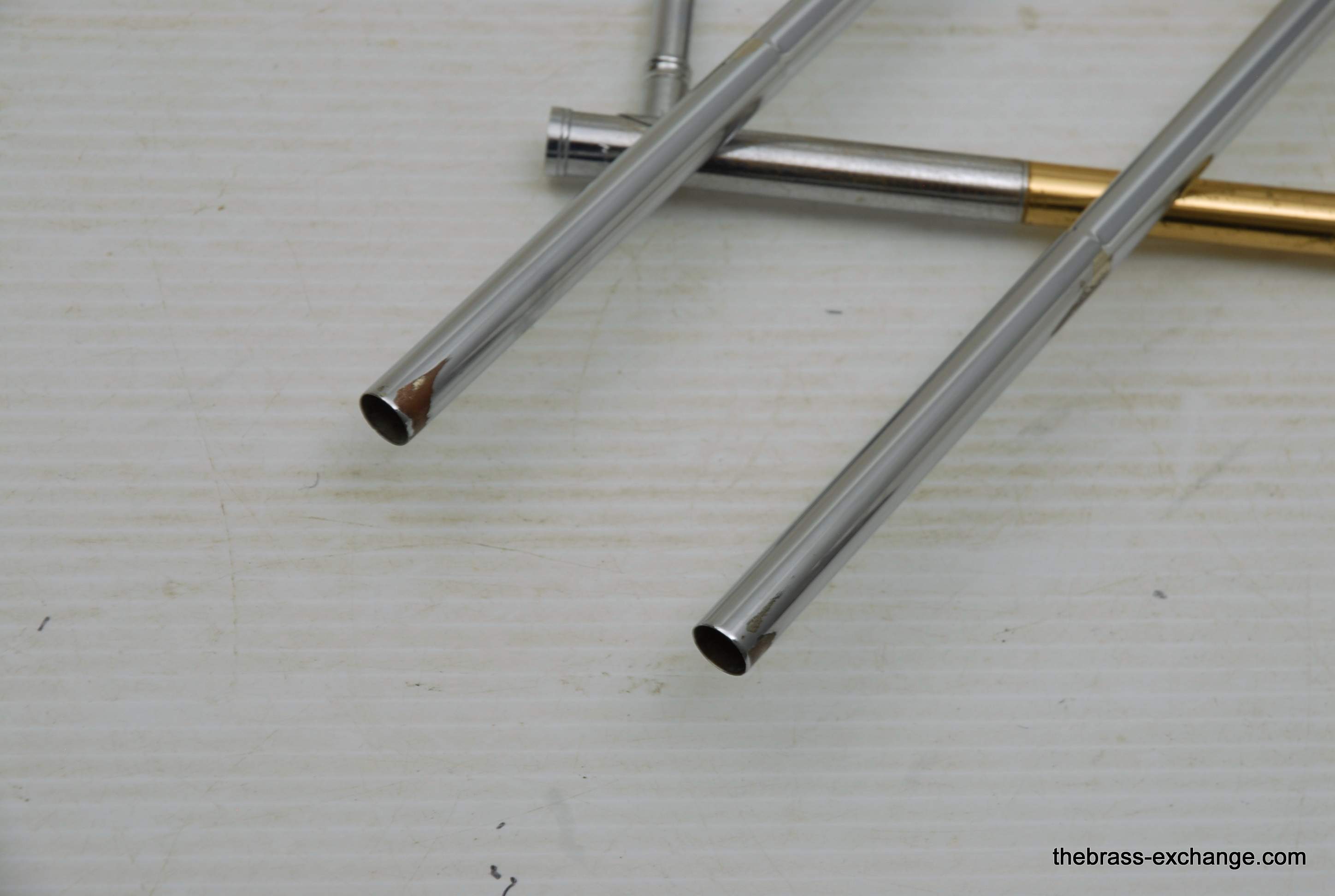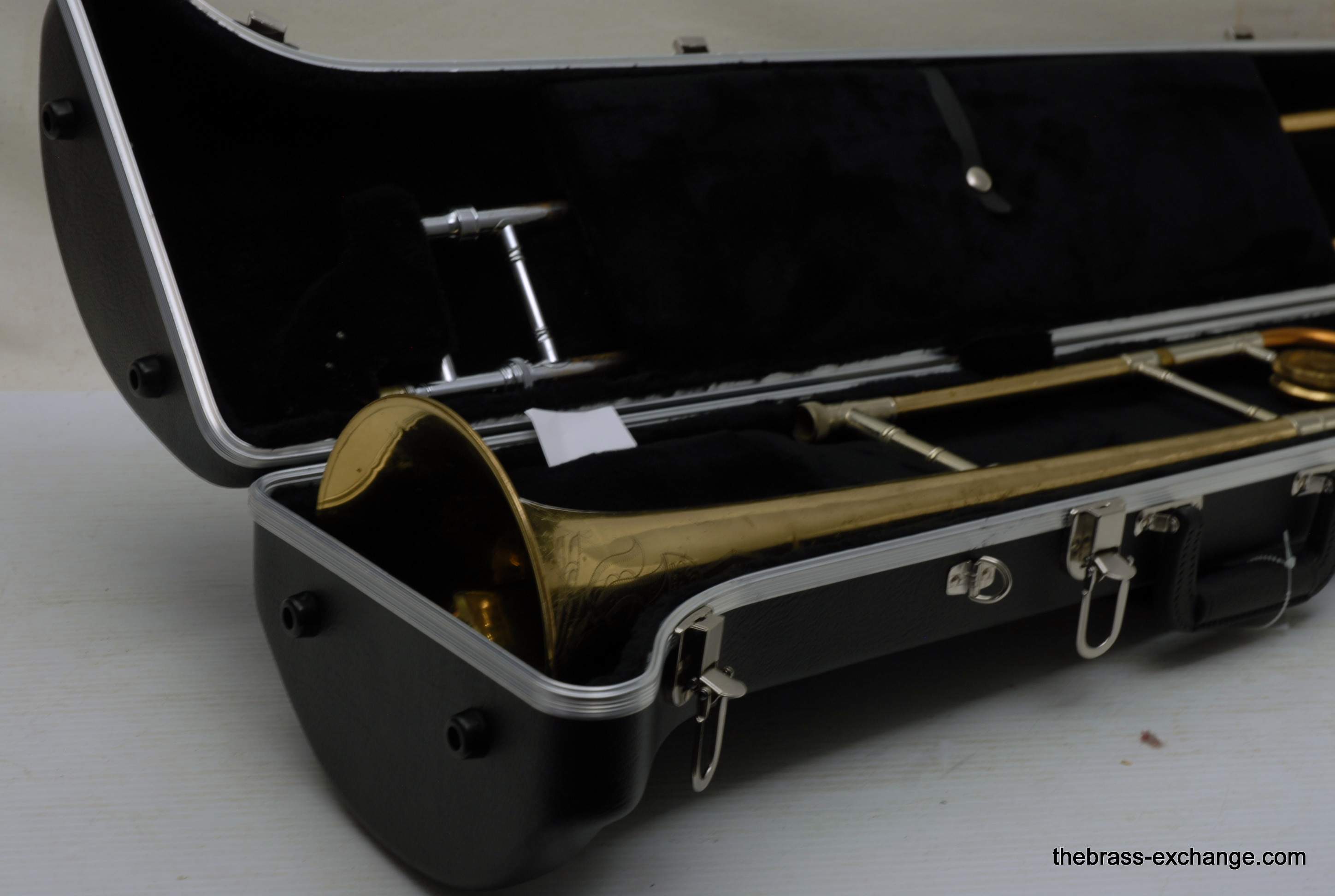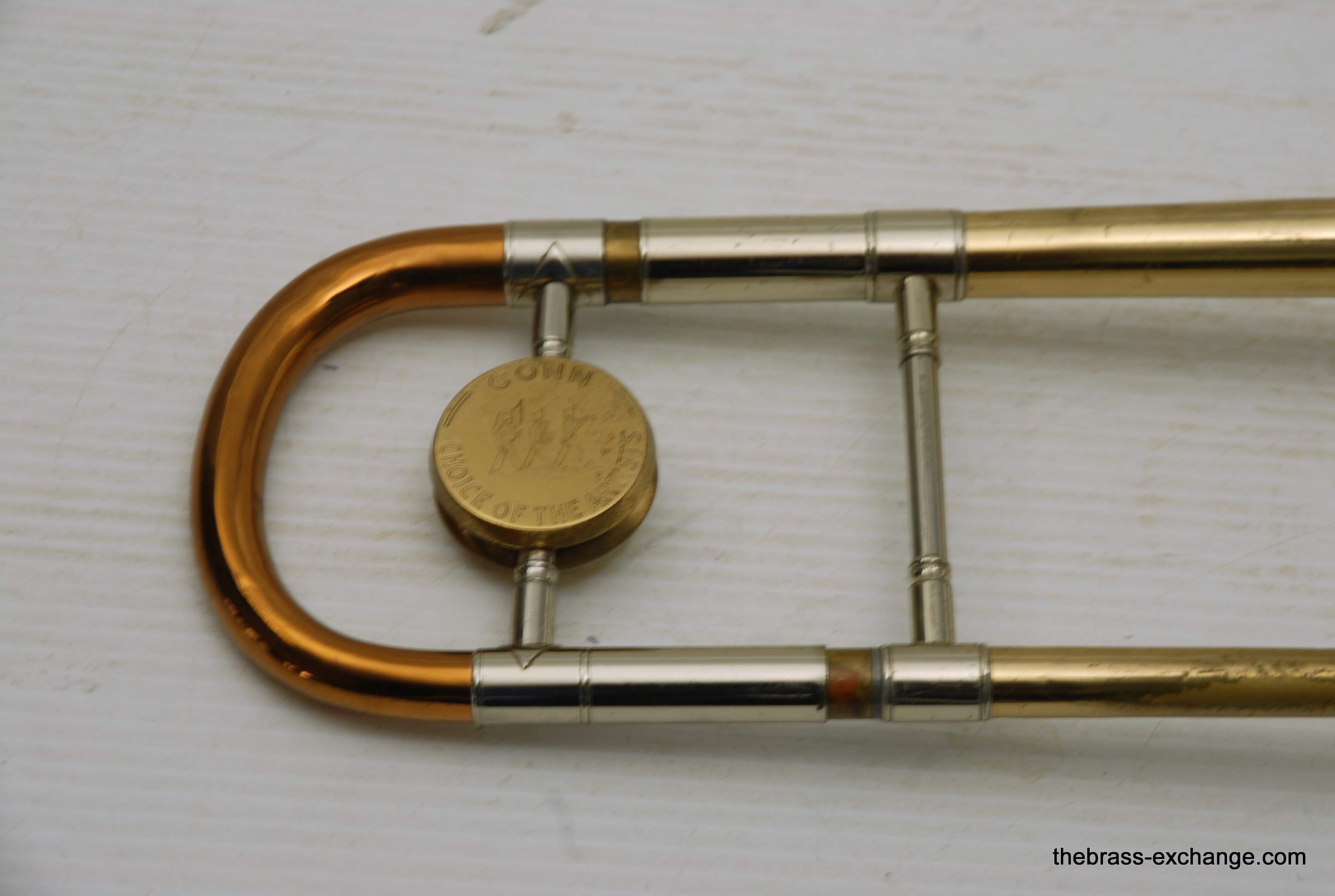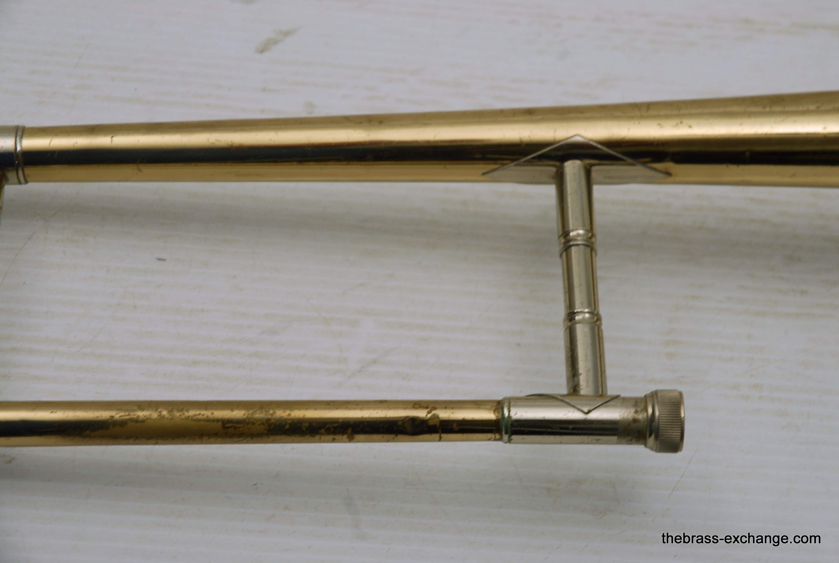 Conn 4H L-W Vintage 1948 Small Bore Tenor Trombone, SN 379607. Classic small bore tenor, professional level, Elkhart IN make. This the the Light weight model and is stamped L-W by the SN. Has yellow brass bell, brass handslide with nickel silver end crook. Tuning Slide is gold brass, has fancy 2 piece Conn balance weight. All original parts and lacquer. Has had full shop service including chemical bath. Bell section has the half moon deco style engraving. This is a good playing 4H. There is some plating loss on the slide inner- but there are different types of plating loss- this is smooth wear and does not create drag or tension in the slide because the tubes are totally straight, and the slide falls very easily with gravitiy. This would be an awesome vintage horn for any player lookng in this size. Attention Parents looking for a horn for a younger kid: This is professional level, and pro quality build. Modern day student models do not even compare to quality or playabiltiy. I highly reccomend this horn for a kid starting out. Has new MTS case, made in Indiana, includes mouthpiece. In-stock for immediate delivery.