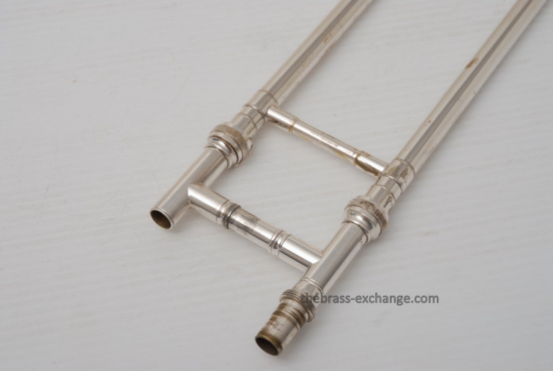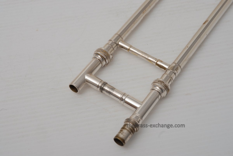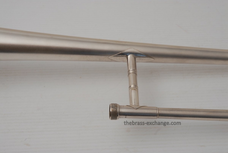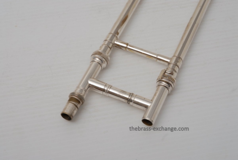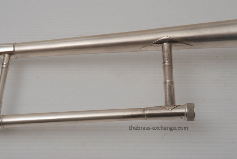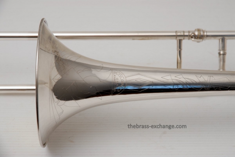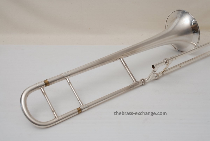 Conn 4H from around 1947.  Satin Silver-Gloss two tone finish with gold wash inner bell.  Stunning appearance.  Has .485 bore with 7" bell.  Handslide is flawless, perfect alignment, no chrome loss, is super light and is about as good as any slide can get whether new modern make, or pro slide set-up.  This is a true artist model vintage Conn.  Would make a great lead, big band horn, trad jazz, Teagarden, Kid Ory Style. Perfect alternative to the 2B.  Plays incredibly easy with lots of center and focus.  The upper range is simply a breeze on this classic vintage Conn.