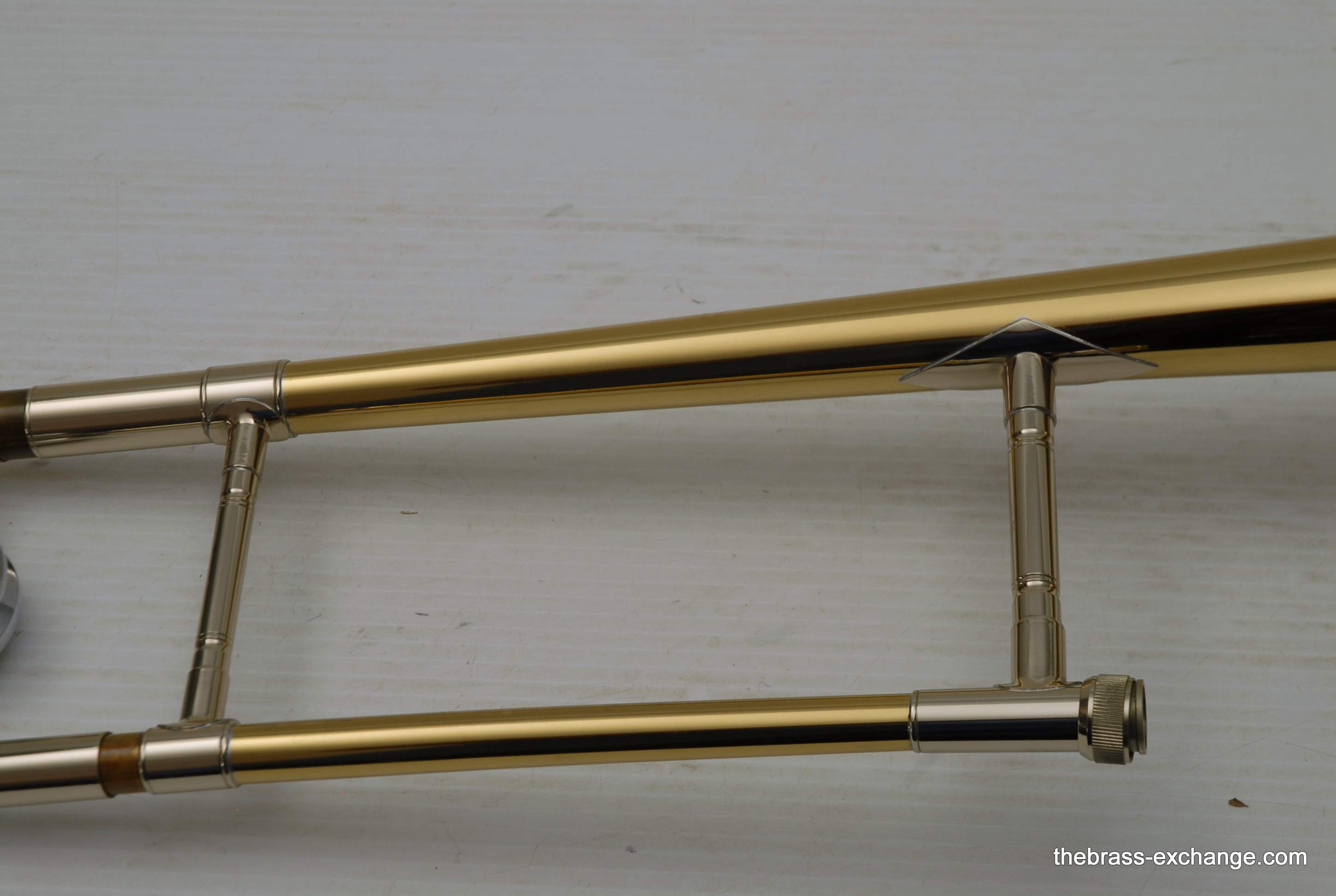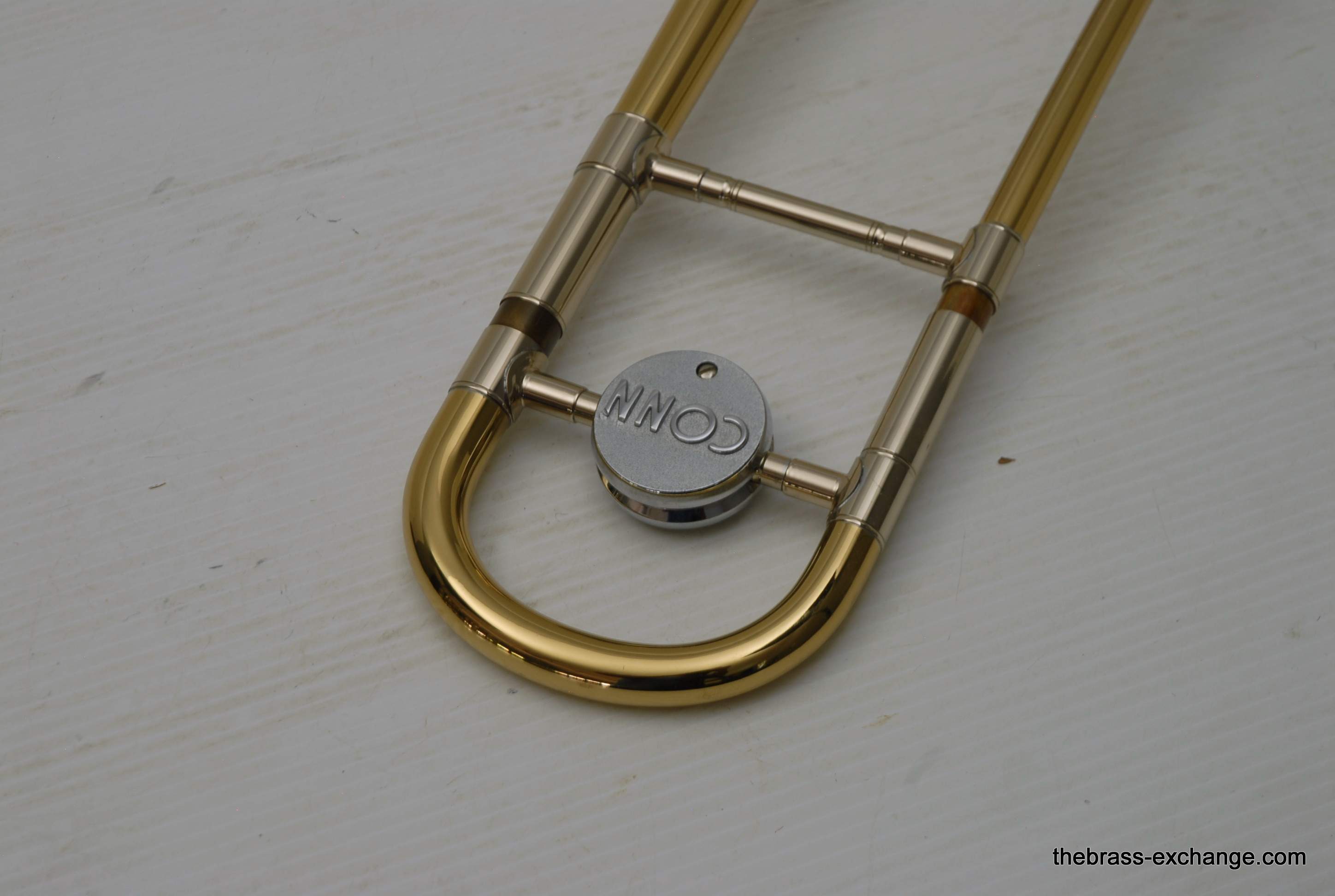 The instrument shows no signs of major repairs or damage. One improvement worth noting: the hand brace on the slide appears to have been professionally re-set to relieve stress and improve ergonomics and alignment—often a necessary adjustment on older Conn models.