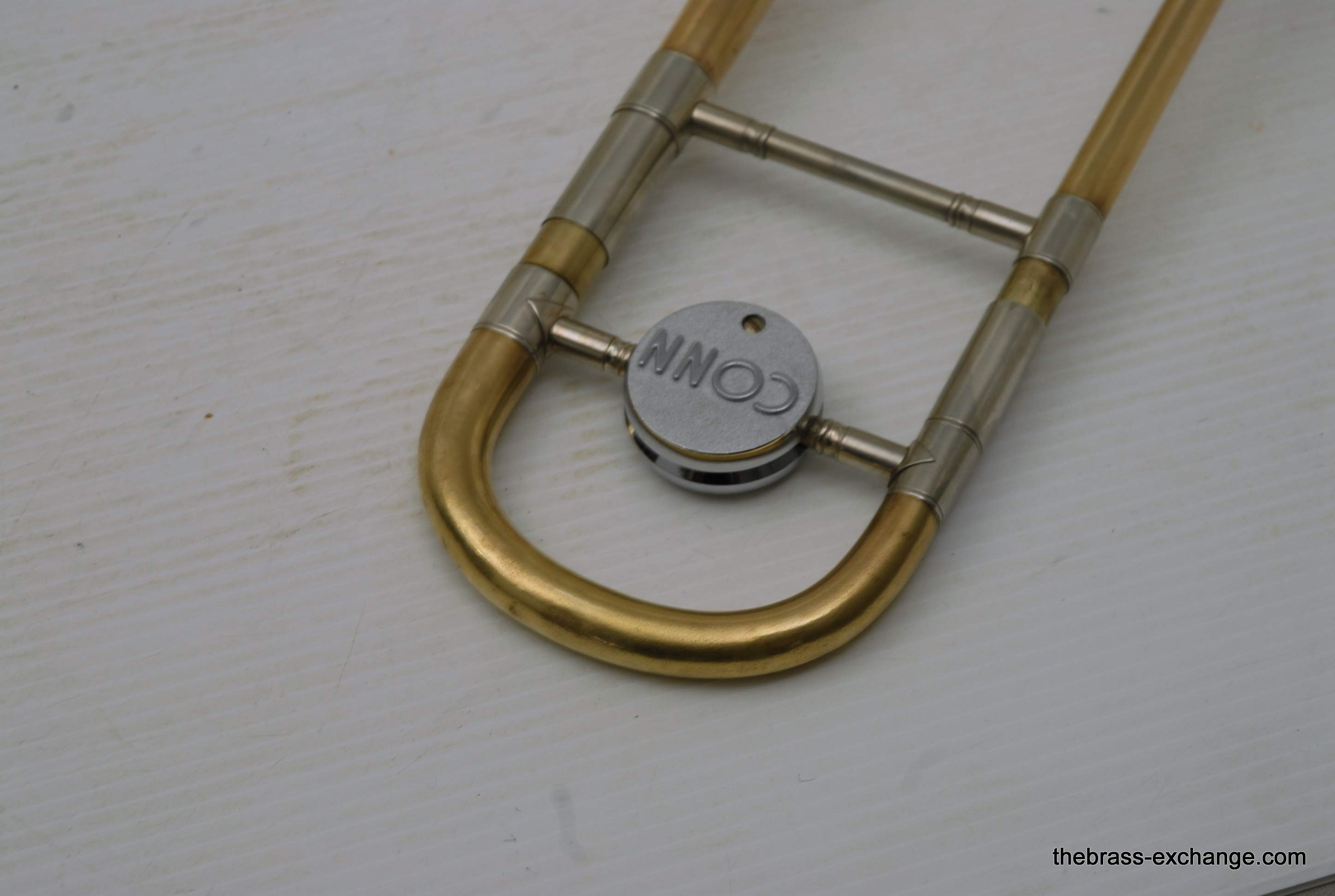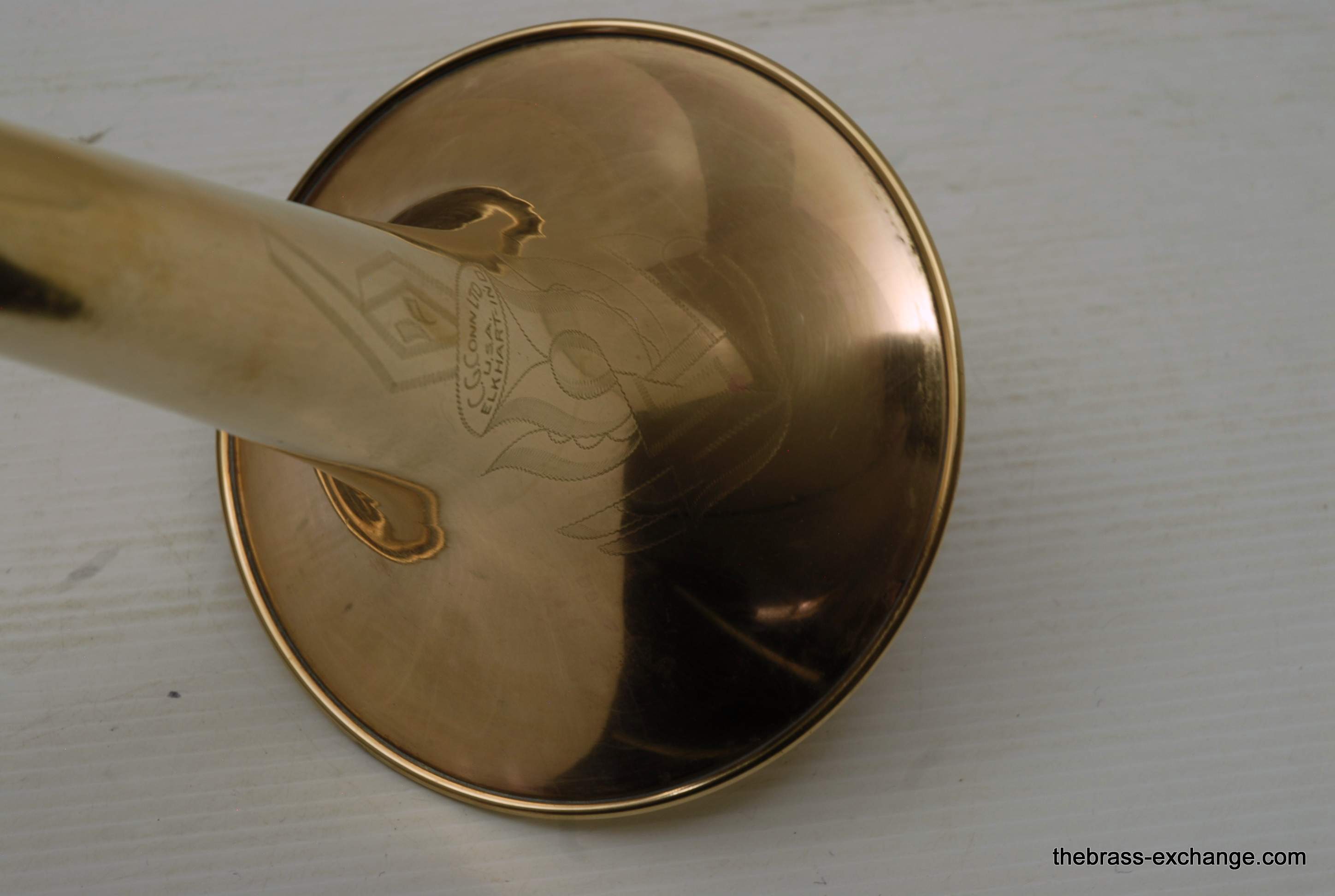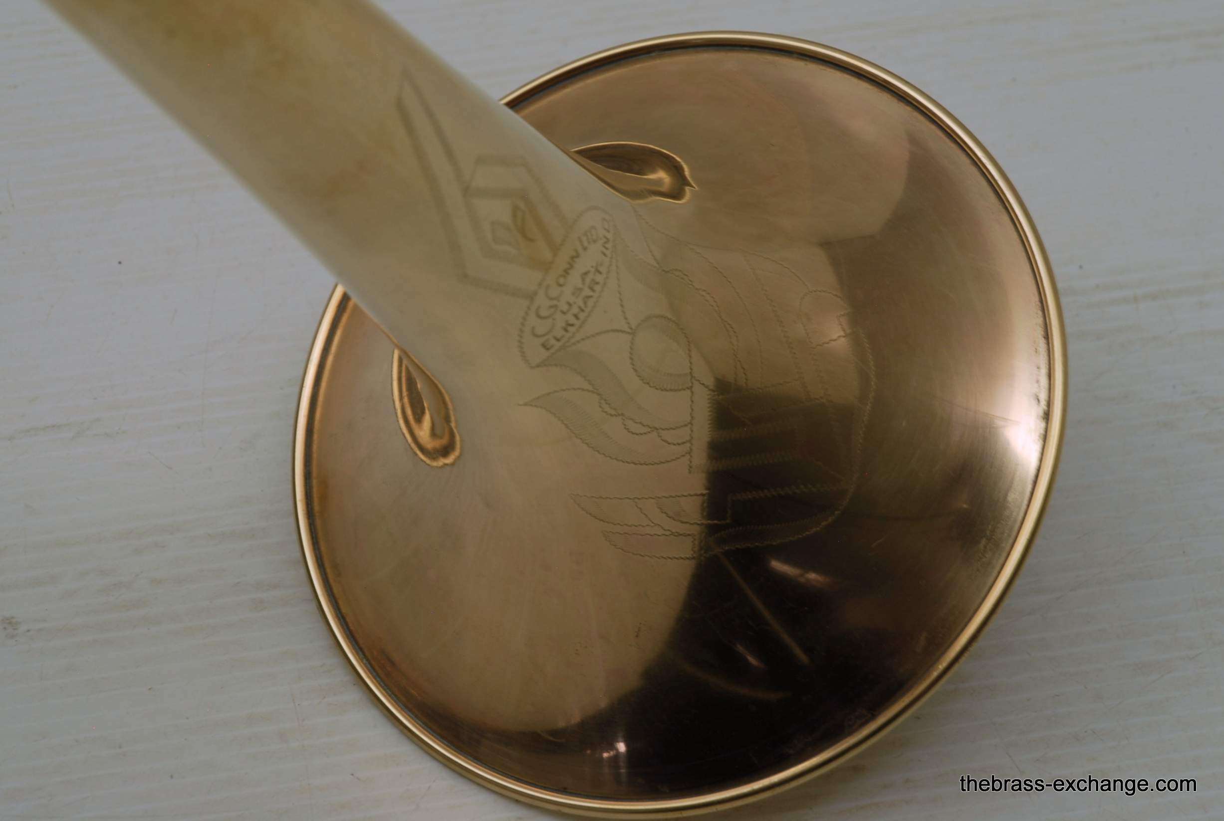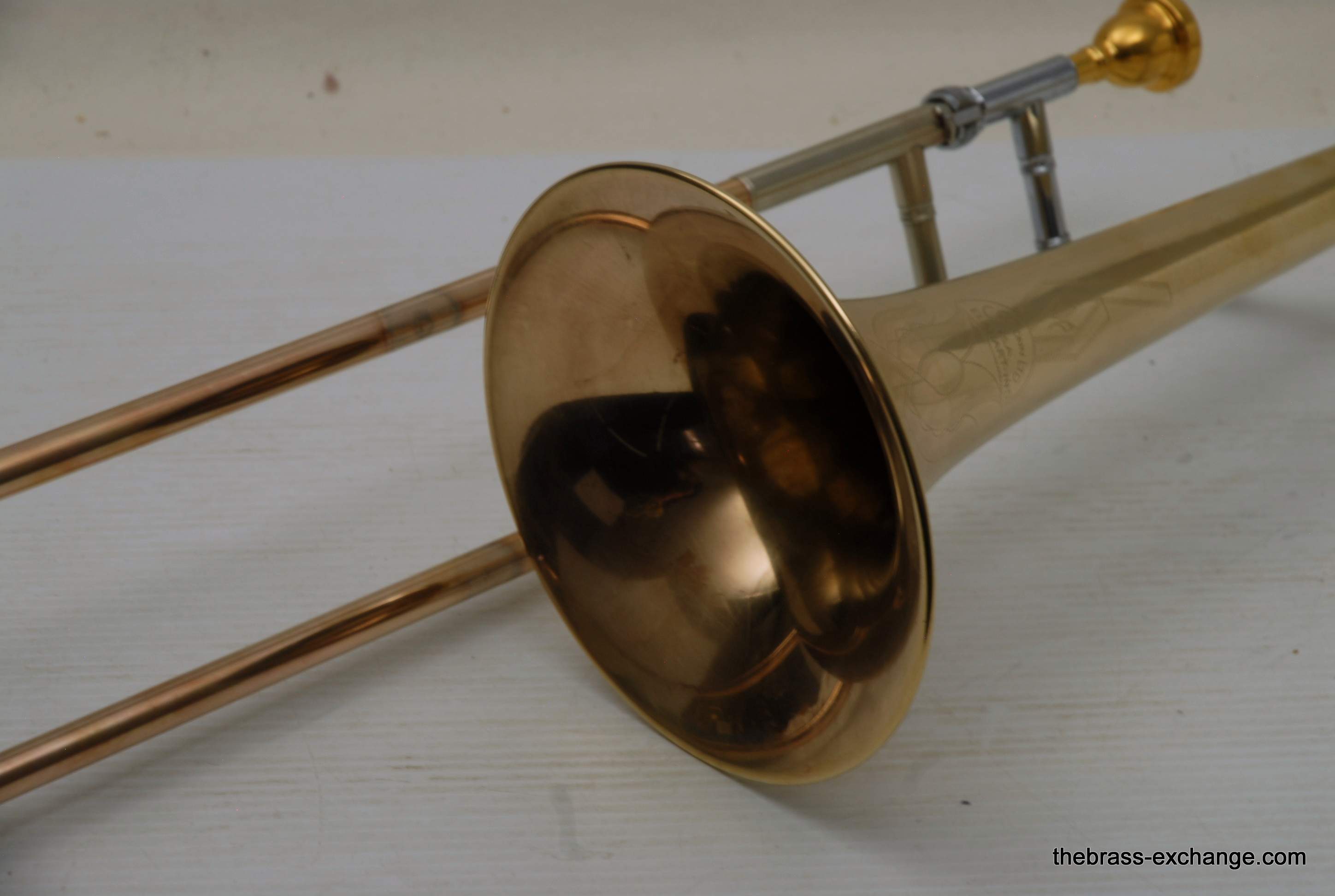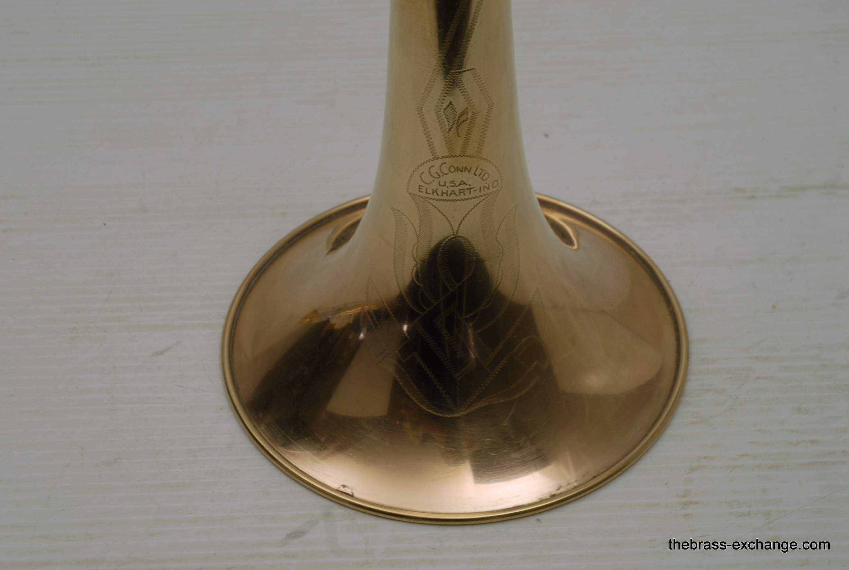 Conn 6H Vintage Trombone from 1941. It's hard to believe that this horn has survived through the years. First of all, I am personally a 6H guy. I have played on probably 100 of them over the years, and currently use them for small group, and even lead in a big band or jazz trombone quartet. Sometimes I feel that the 8" bell is a little too wide and the sound is more spread out for lead. This 1941 6H has a 7.5" bell. For any 6H player out there that has ever felt the way I have, this could be the answer. It feels like a 6H all the way, but has more center. Also, it's a weightier horn. The sound has enormous projection. The high register screams on it. It's raw brass 7.5" bell with .500 bore gold brass hand slide- is all stock and original, except no lacquer. Has the half-moon deco style engraving. Has never had major damage- super straight horn, hand slide tubes are without plating defect. The slide is excellent and is gig ready. One thing that I noticed about the bell is that it may have a little more copper in the alloy. It looks that way, and plays with warmth, but not quite the same as gold brass. The gold-plated mouthpiece in the main photo is not included. I kept it on the horn after demoing it because it looks great in the pics. I should probably keep this 6H for myself, but.... like the owner of the pet store... I can't keep the puppies. Case not included. The original case was trashed. In-stock for immediate delivery.