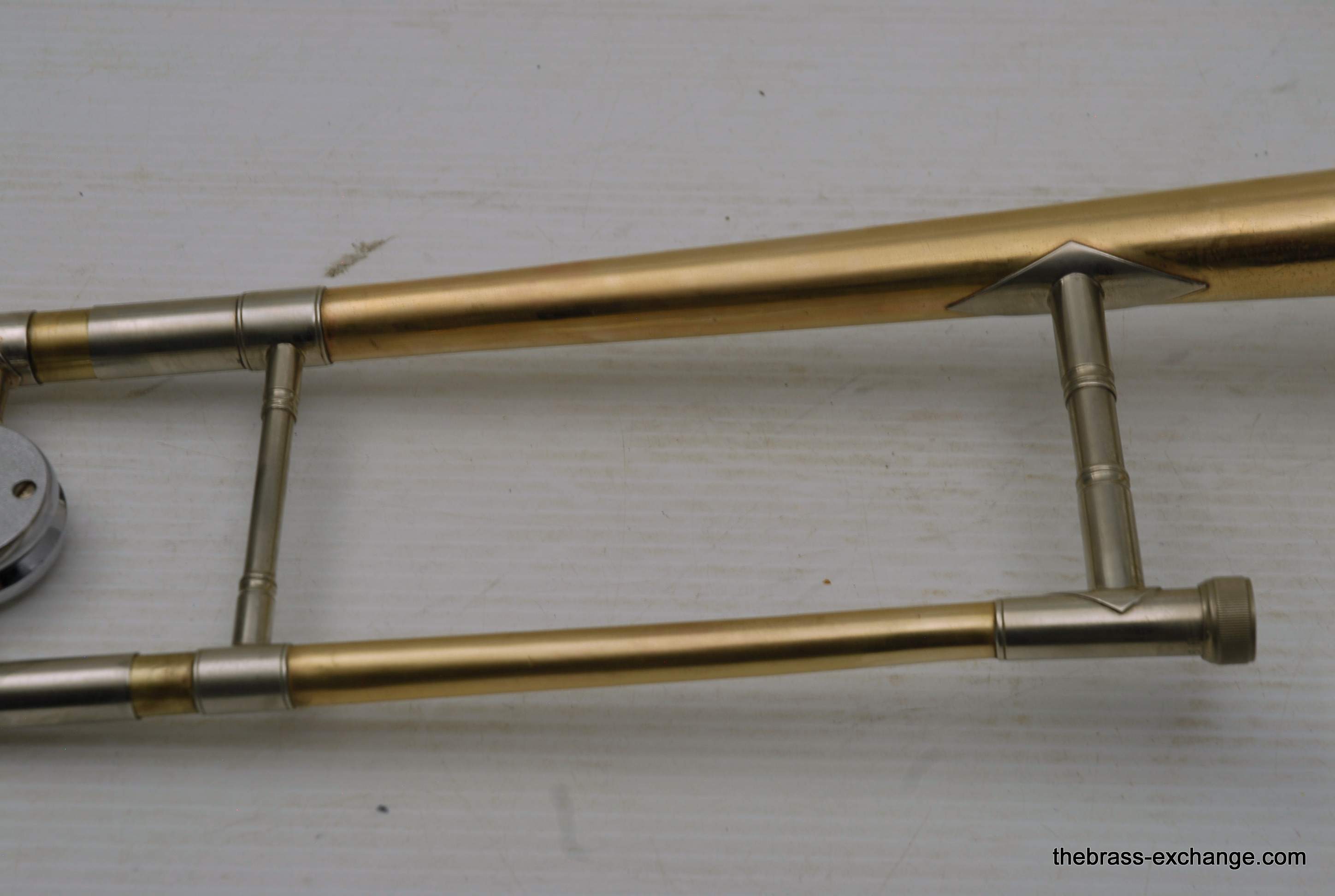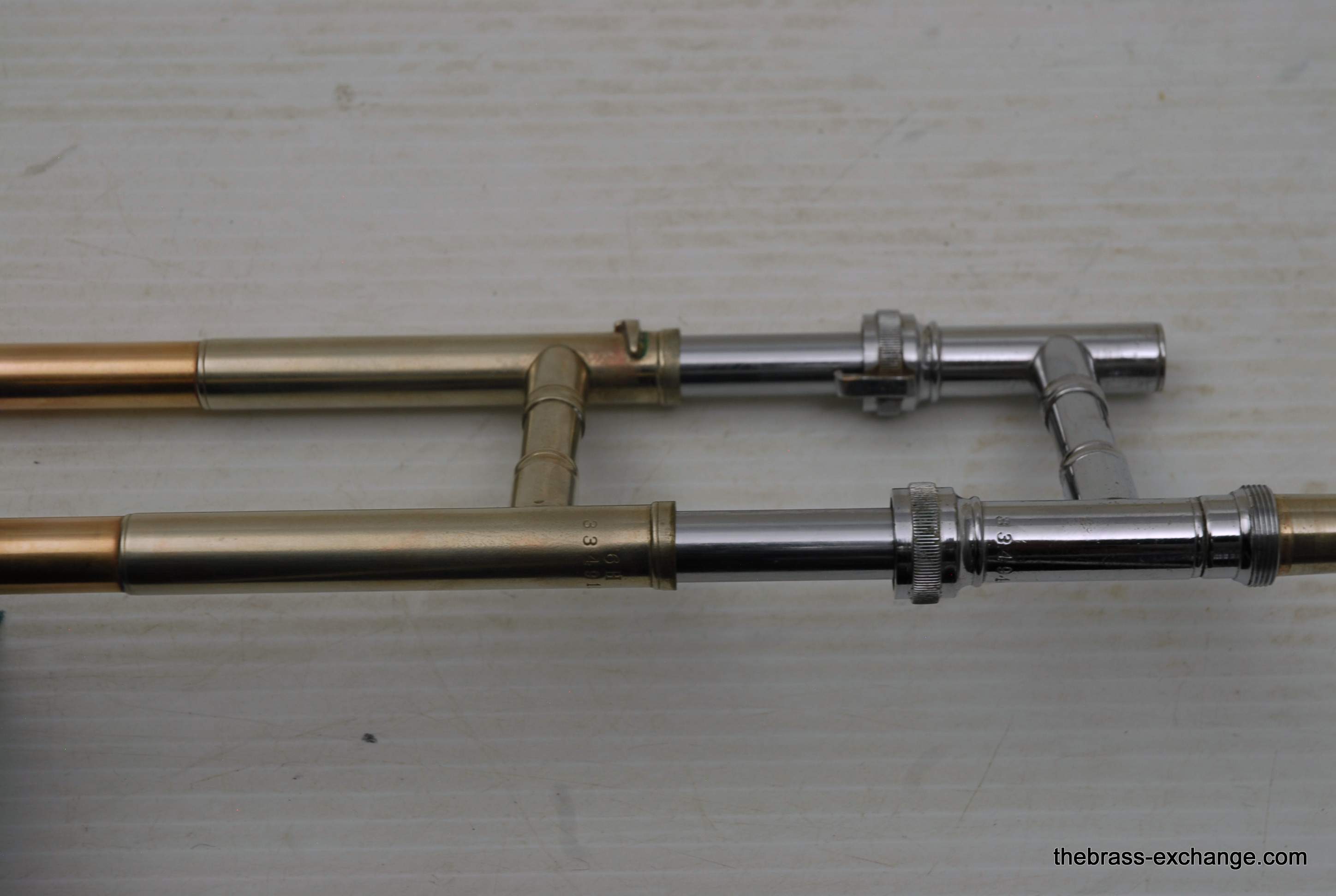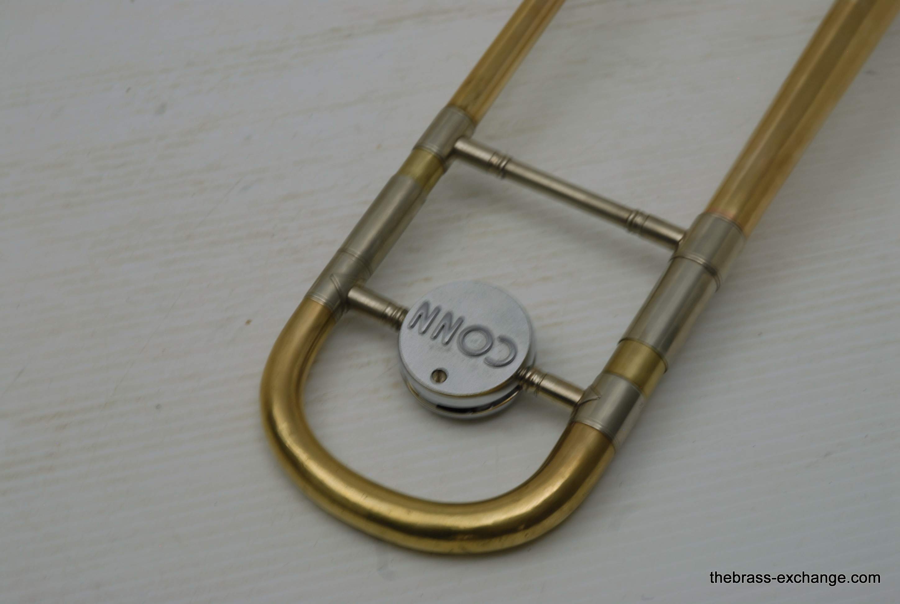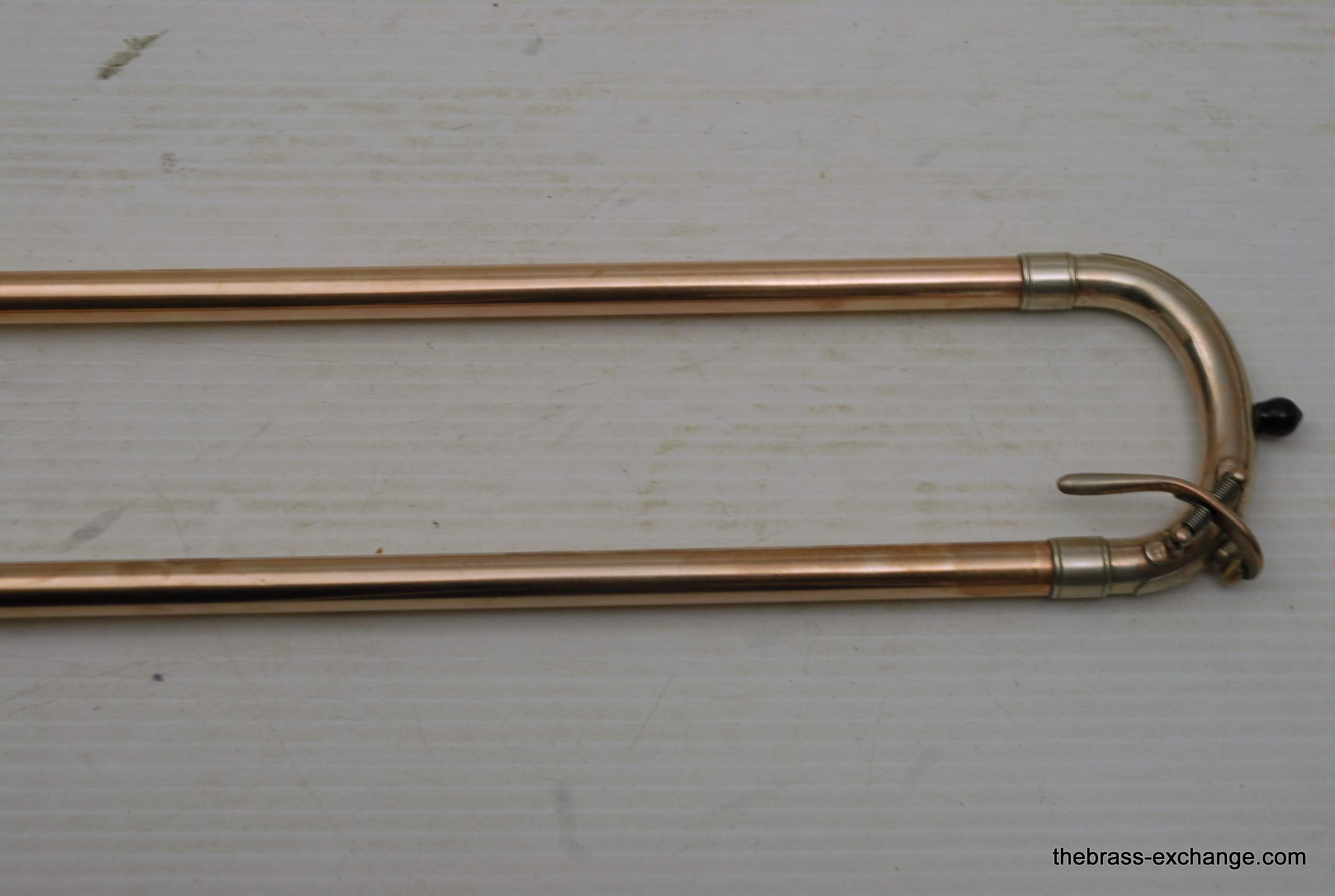 Conn 6H Vintage Trombone from 1941. It's hard to believe that this horn has survived through the years. First of all, I am personally a 6H guy. I have played on probably 100 of them over the years, and currently use them for small group, and even lead in a big band or jazz trombone quartet. Sometimes I feel that the 8" bell is a little too wide and the sound is more spread out for lead. This 1941 6H has a 7.5" bell. For any 6H player out there that has ever felt the way I have, this could be the answer. It feels like a 6H all the way, but has more center. Also, it's a weightier horn. The sound has enormous projection. The high register screams on it. It's raw brass 7.5" bell with .500 bore gold brass hand slide- is all stock and original, except no lacquer. Has the half-moon deco style engraving. Has never had major damage- super straight horn, hand slide tubes are without plating defect. The slide is excellent and is gig ready. One thing that I noticed about the bell is that it may have a little more copper in the alloy. It looks that way, and plays with warmth, but not quite the same as gold brass. The gold-plated mouthpiece in the main photo is not included. I kept it on the horn after demoing it because it looks great in the pics. I should probably keep this 6H for myself, but.... like the owner of the pet store... I can't keep the puppies. Case not included. The original case was trashed. In-stock for immediate delivery.