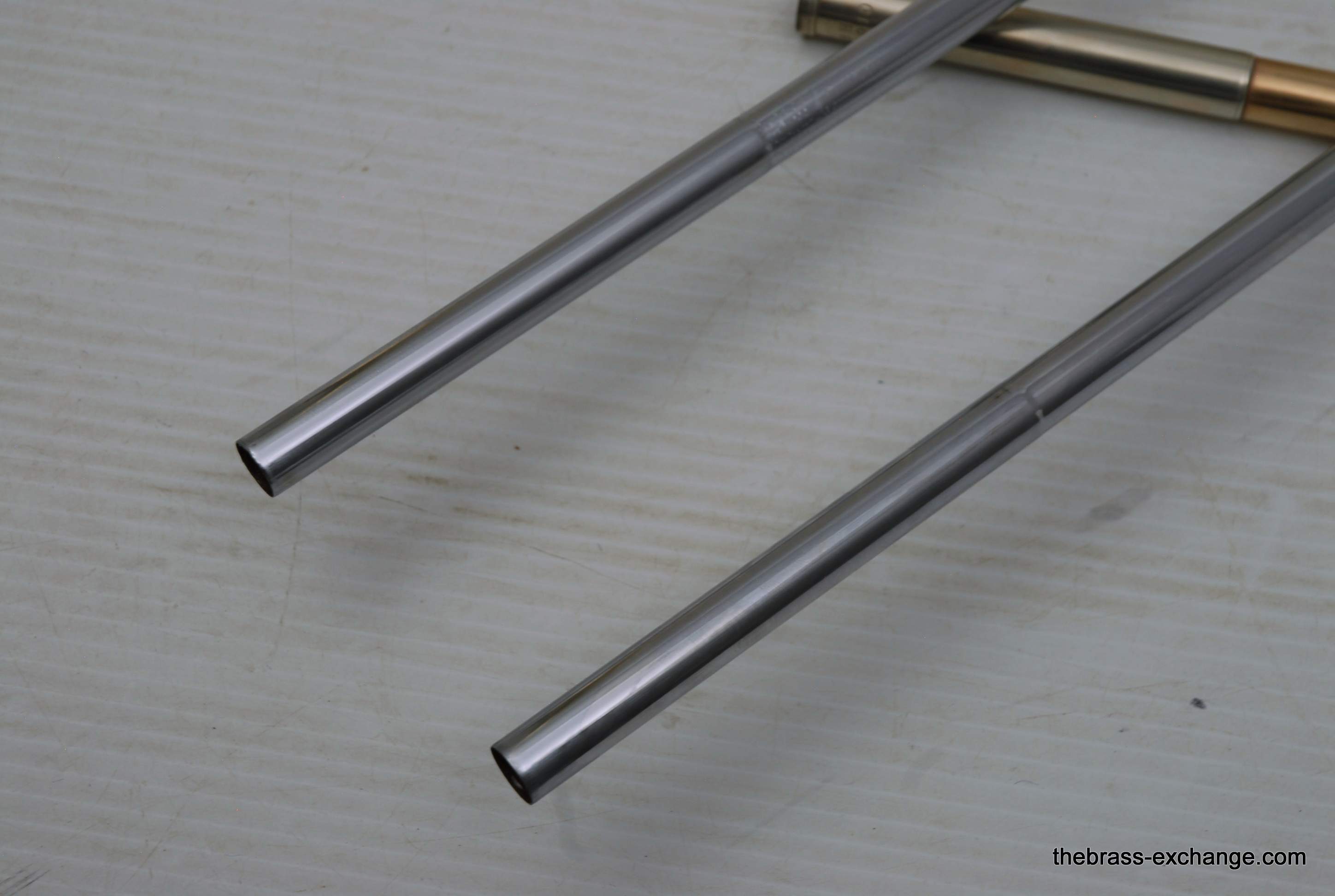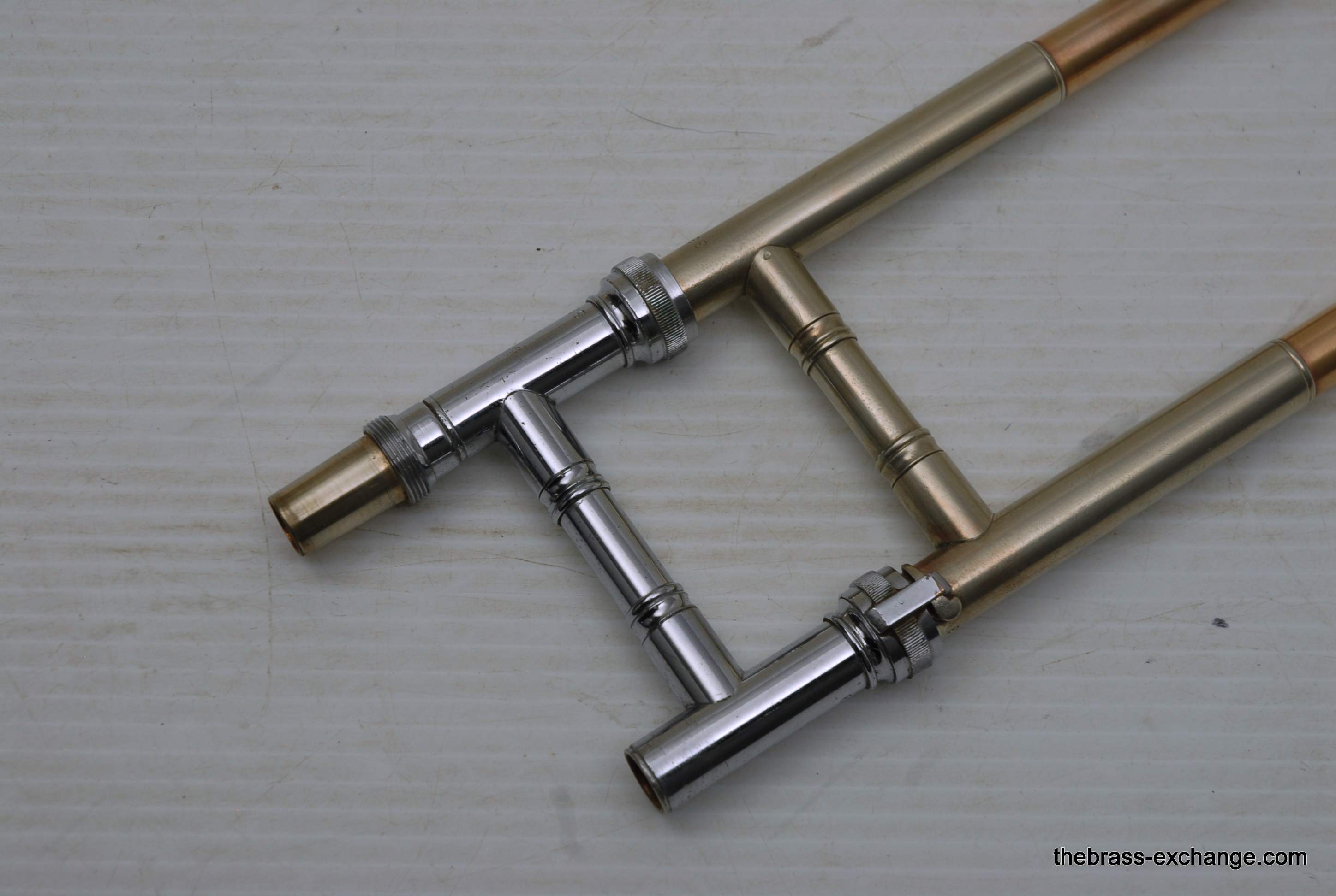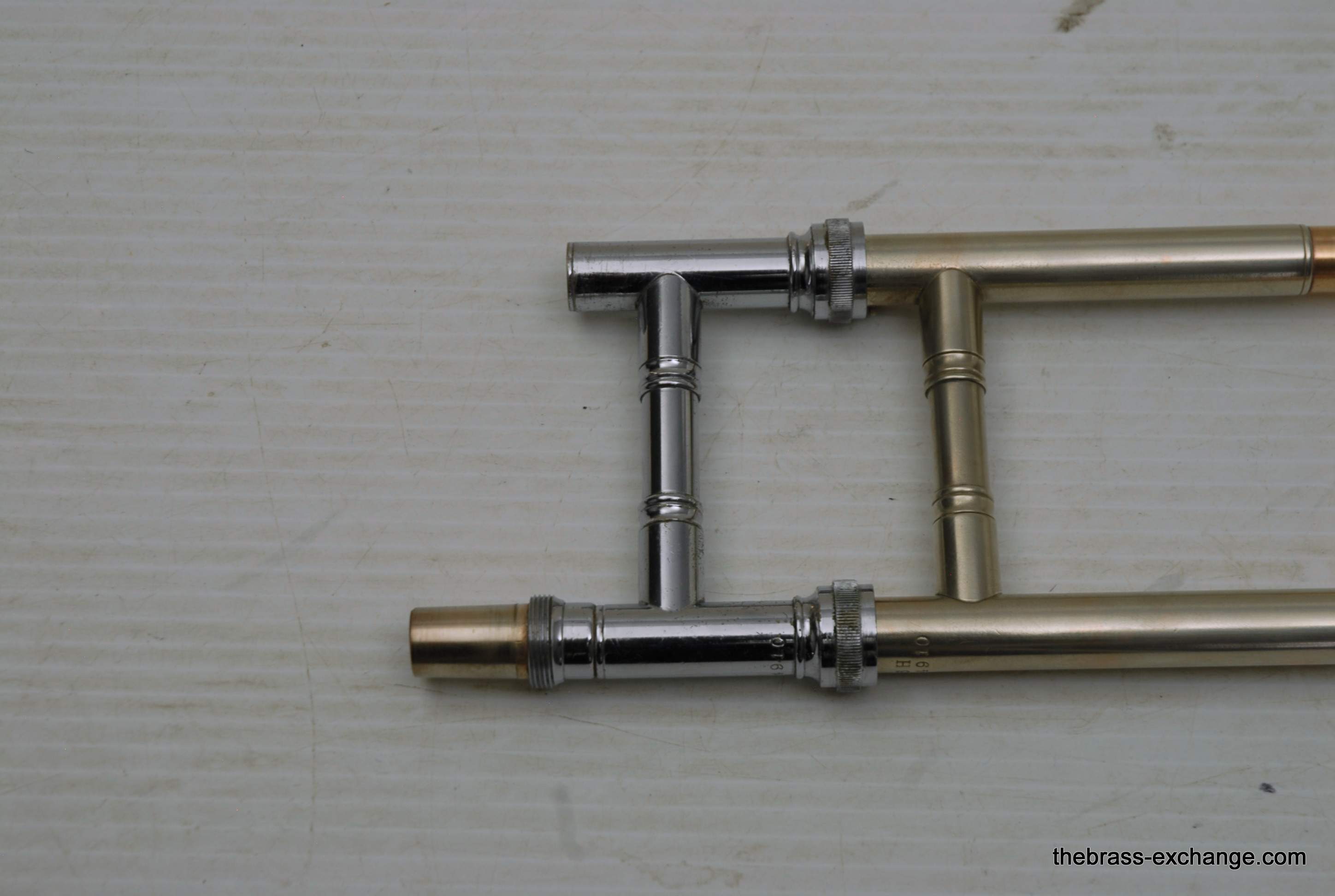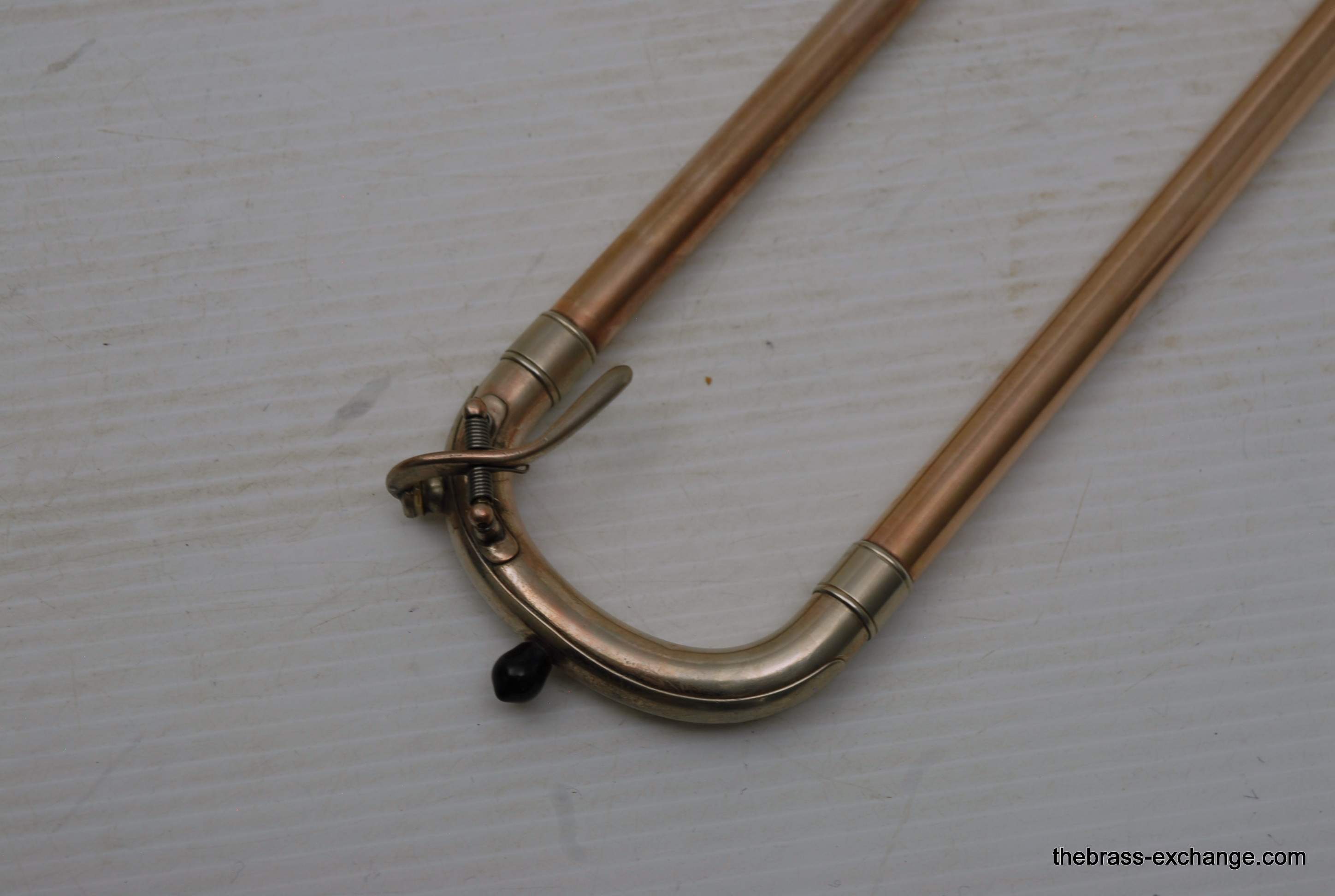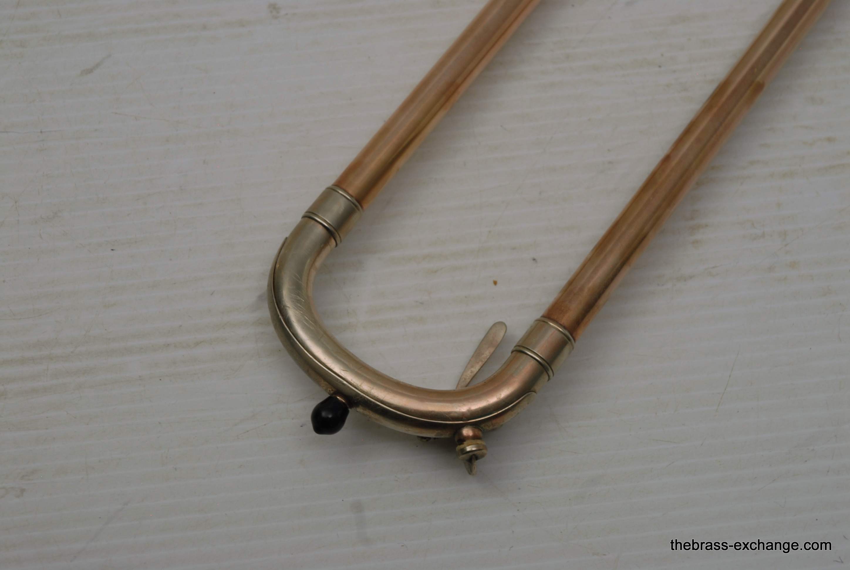 Conn 6H Vintage Trombone from 1941. It's hard to believe that this horn has survived through the years. First of all, I am personally a 6H guy. I have played on probably 100 of them over the years, and currently use them for small group, and even lead in a big band or jazz trombone quartet. Sometimes I feel that the 8" bell is a little too wide and the sound is more spread out for lead. This 1941 6H has a 7.5" bell. For any 6H player out there that has ever felt the way I have, this could be the answer. It feels like a 6H all the way, but has more center. Also, it's a weightier horn. The sound has enormous projection. The high register screams on it. It's raw brass 7.5" bell with .500 bore gold brass hand slide- is all stock and original, except no lacquer. Has the half-moon deco style engraving. Has never had major damage- super straight horn, hand slide tubes are without plating defect. The slide is excellent and is gig ready. One thing that I noticed about the bell is that it may have a little more copper in the alloy. It looks that way, and plays with warmth, but not quite the same as gold brass. The gold-plated mouthpiece in the main photo is not included. I kept it on the horn after demoing it because it looks great in the pics. I should probably keep this 6H for myself, but.... like the owner of the pet store... I can't keep the puppies. Case not included. The original case was trashed. In-stock for immediate delivery.