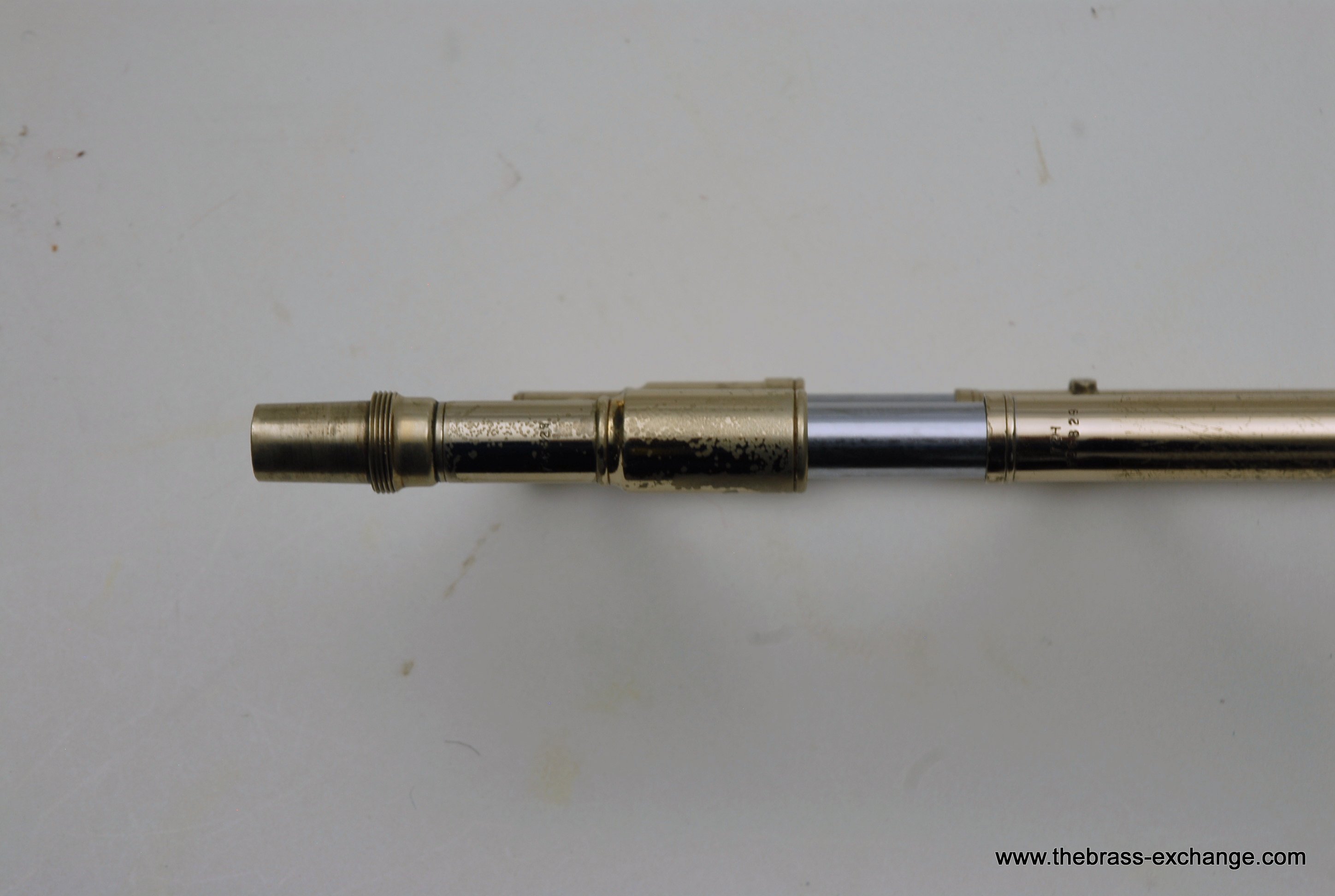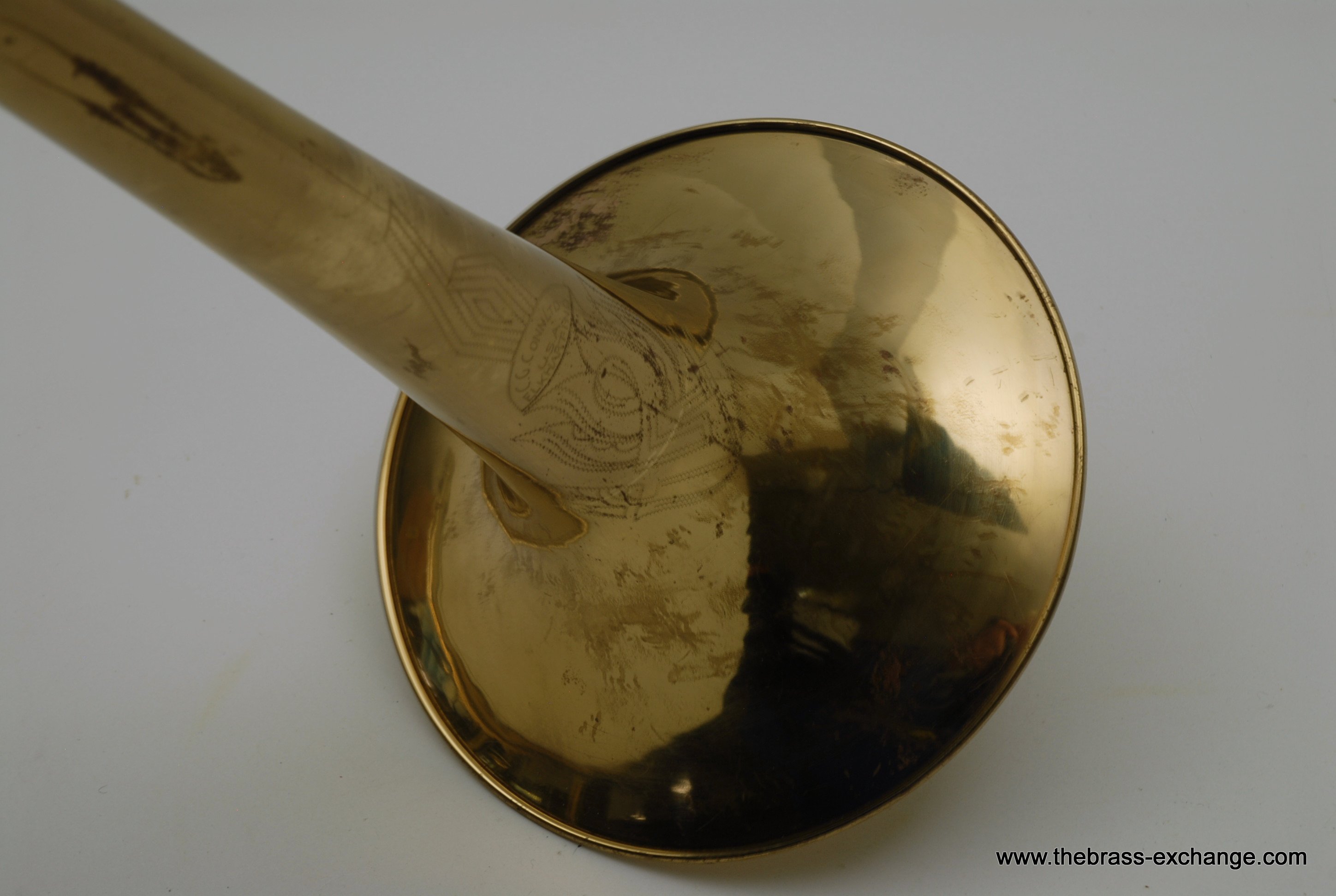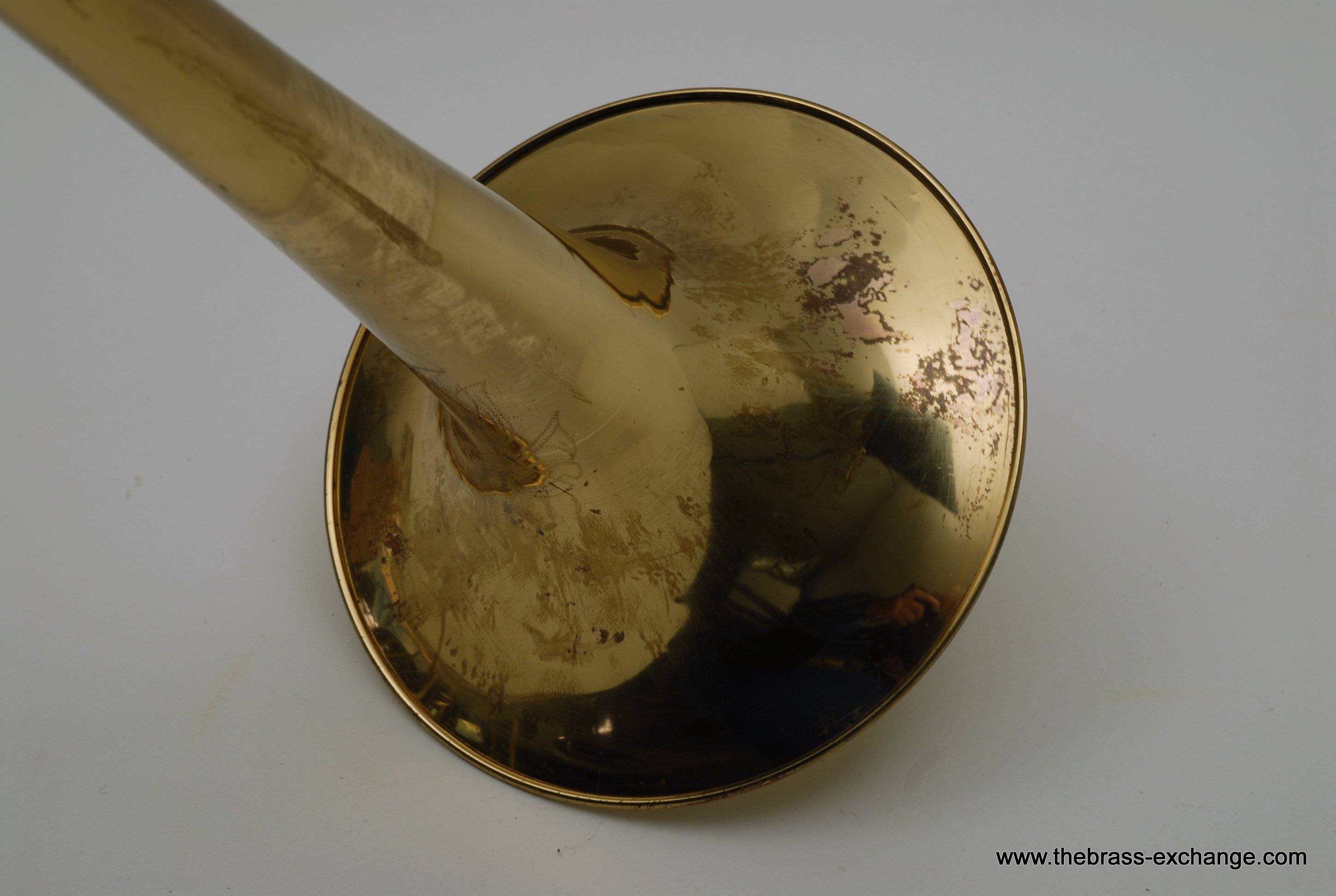 It features a 9.5" yellow brass bell with unsoldered rim, a .562 bore slide, and a nickel silver end crook. The valve works perfectly, and the handslide is smooth and aligned, with no plating wear on the inner tubes β€” extremely rare for a horn of this age. The bell is straight, though it has seen prior dent removal and significant lacquer wear throughout. Despite its appearance, this horn plays exceptionally well.