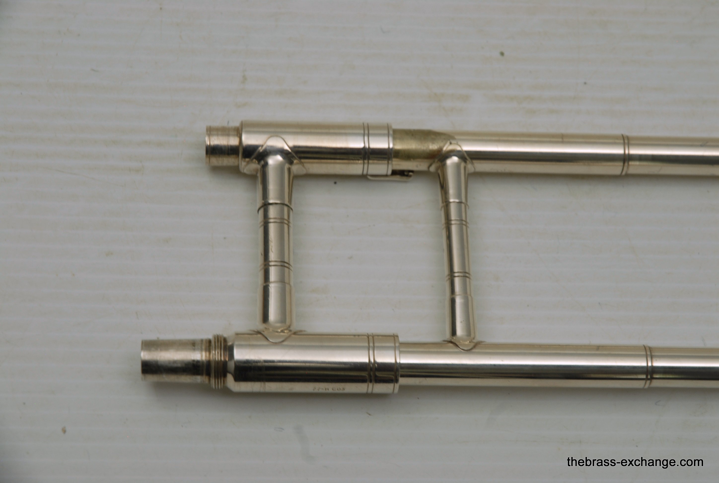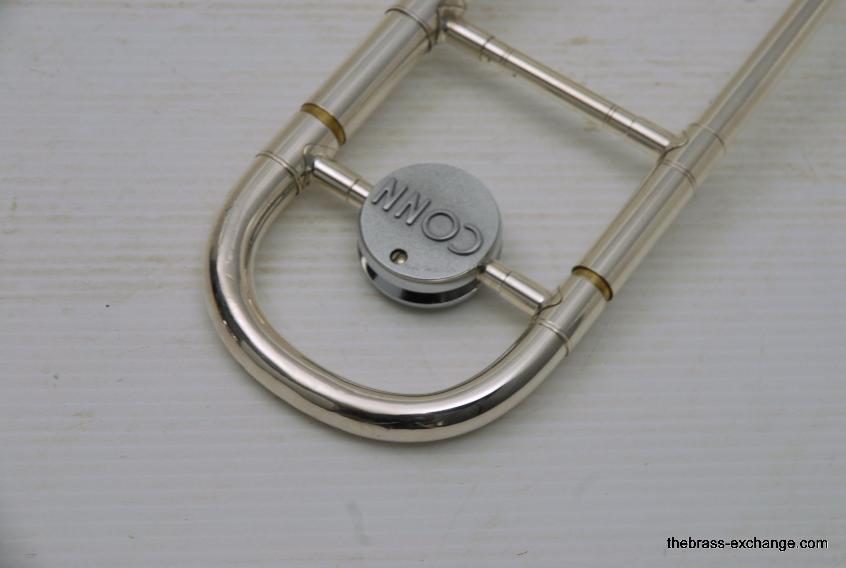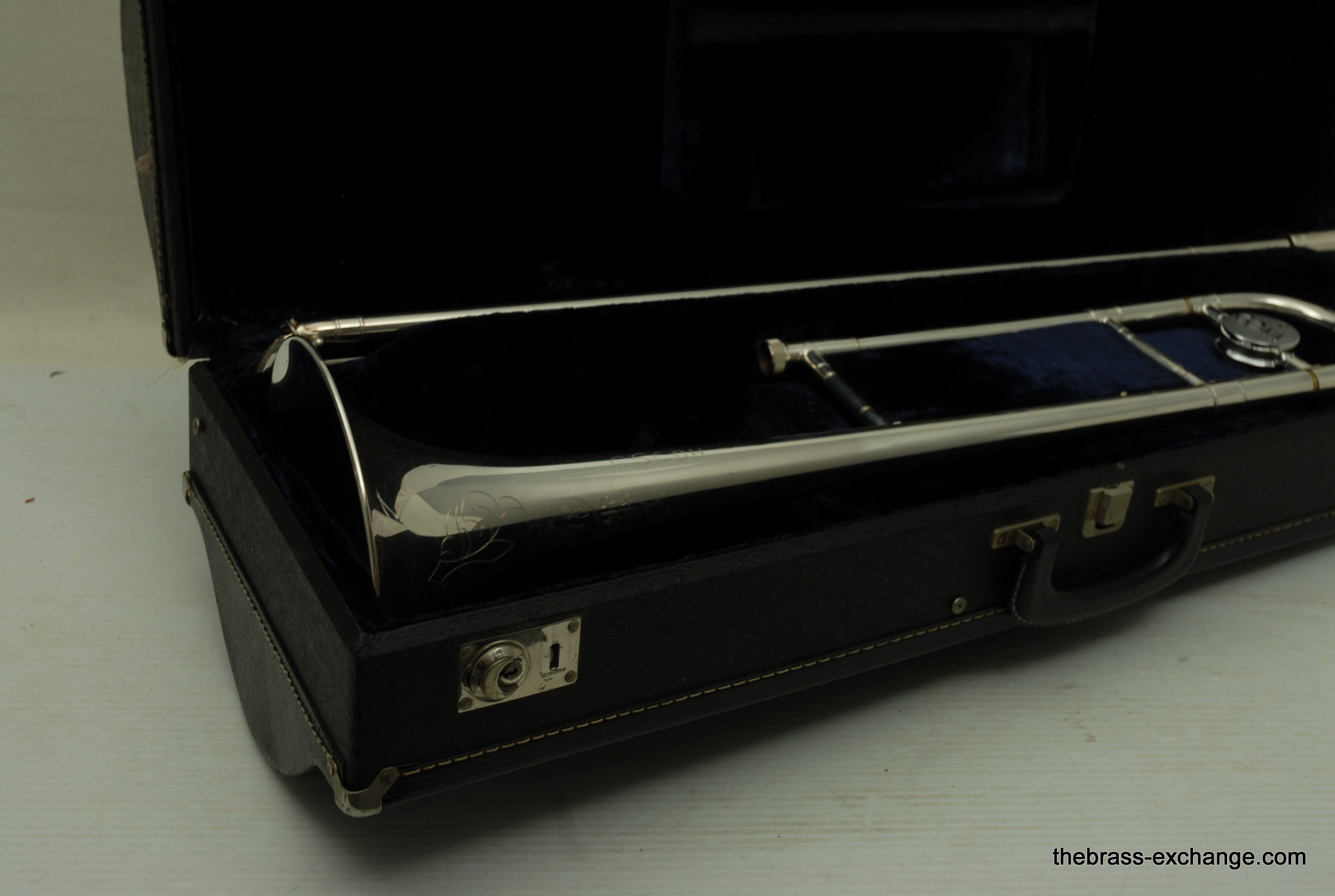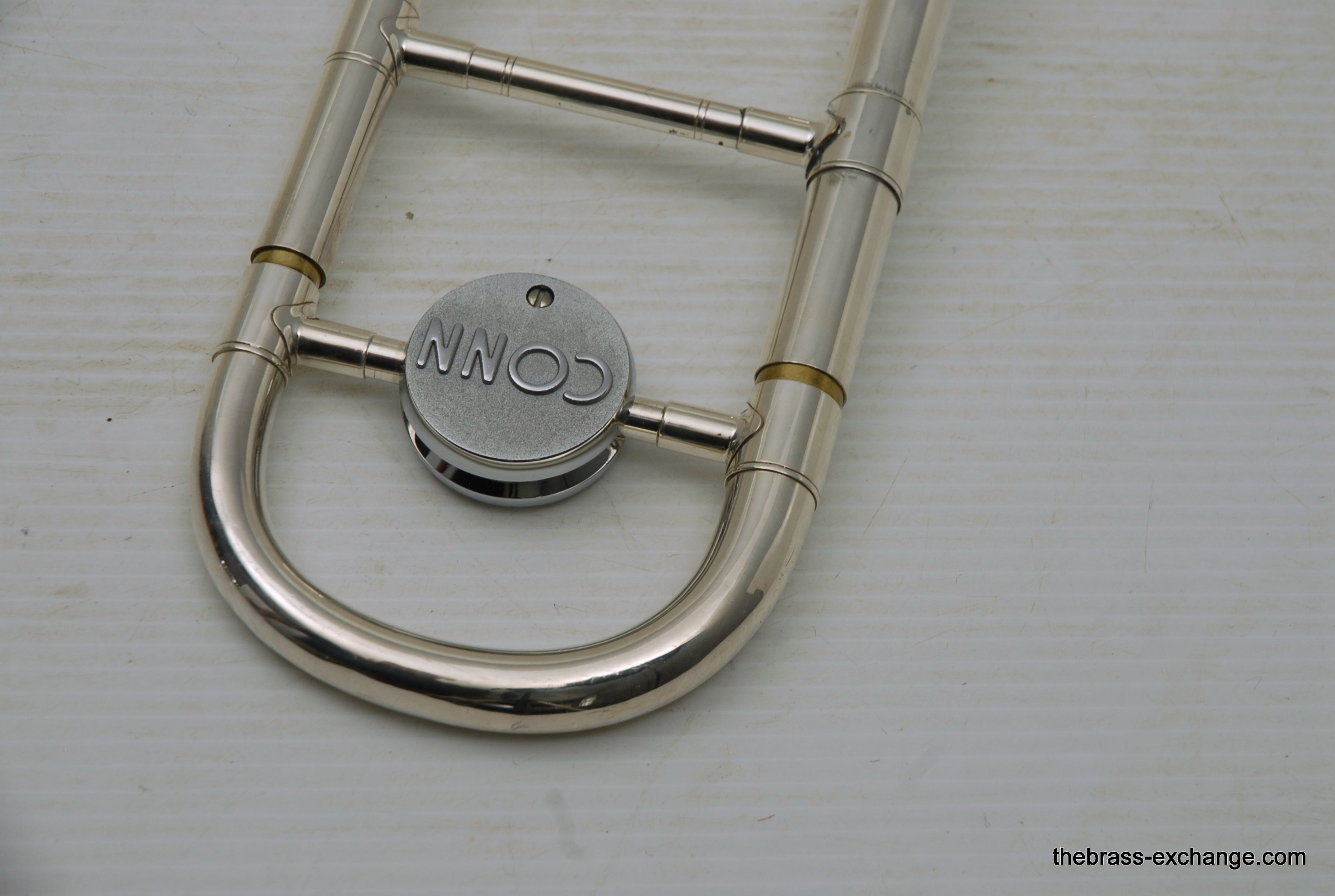 Conn 77H Small Bore Jazz Trombone. Silver Plated .500 bore with 7.5" Bell section. This is a 1970's Make. Very similar to the 6H model, except the bell is a little less in diameter. It plays with a lot of focus and sizzle. Would be a great lead or jazz horn for someone looking to cut above the rest. The upper register is a like a laser on this horn. Would be a great college player horn for jazz band, but also a terrific horn for anyone looking to play on a vintage Conn. Would also be a great horn for marching band becasue most of the other guys in the trombone section are playing on traditional yellow brass. Silver horns stand out in the crowd which makes it much easier to spot your favorite player from the grandstand. Original case. Has great slide, no previous damage or repairs. No service needed to improve playability. In-stock for immediate delivery.