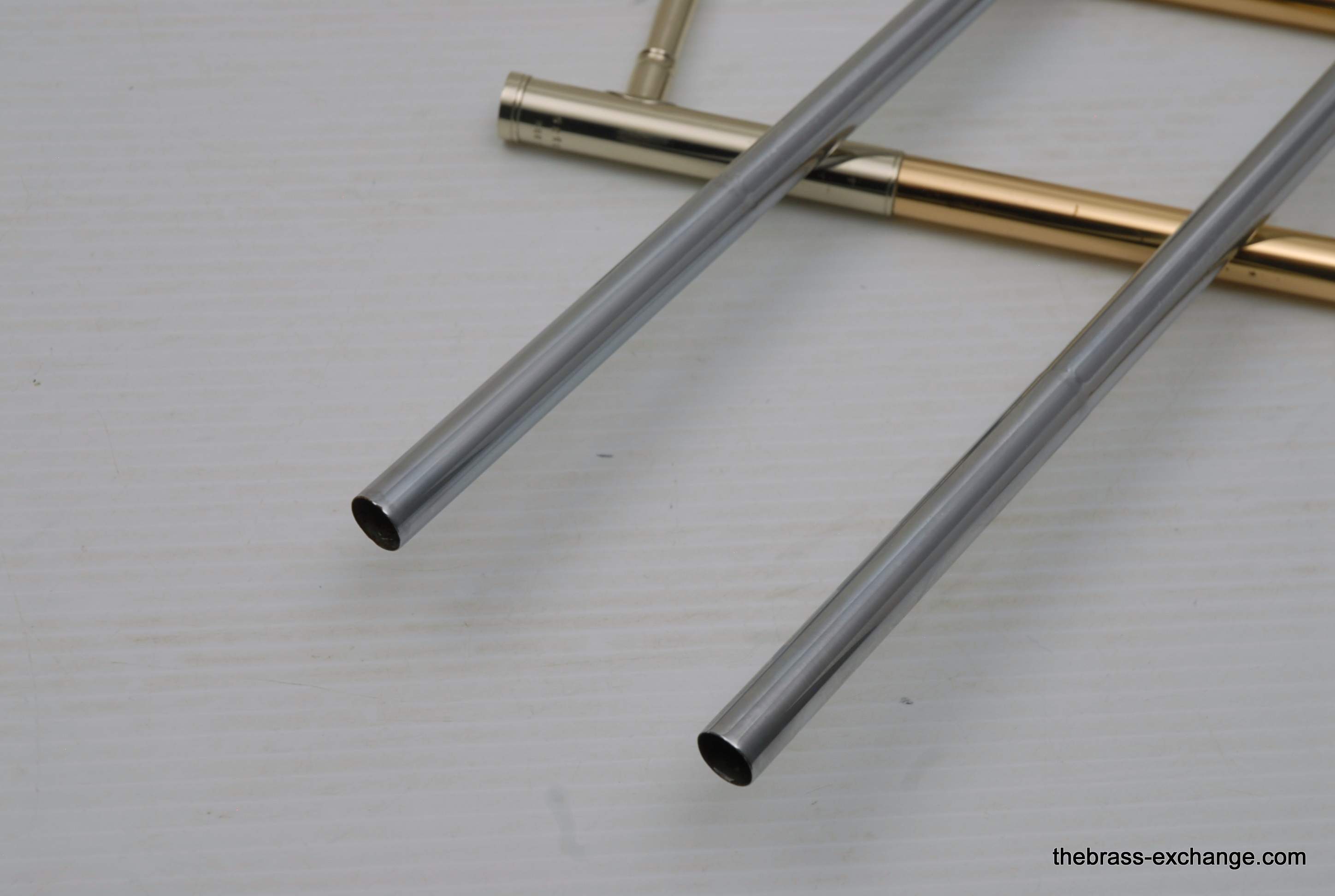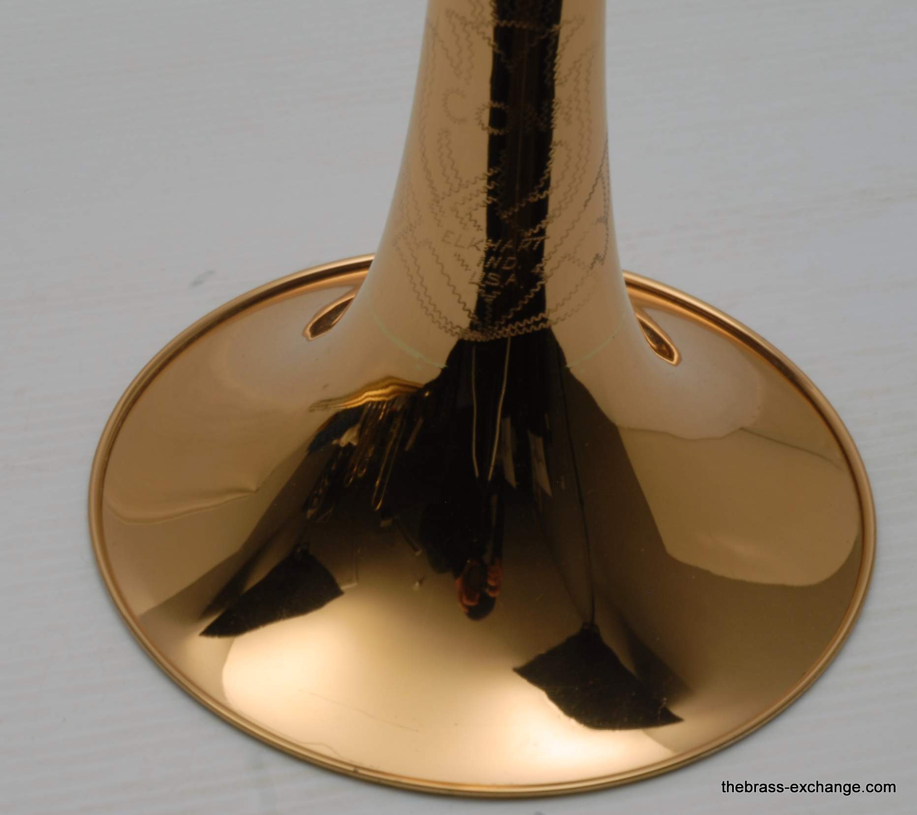 We completed a full professional shop service, including chemical cleaning, rotor service (with disassembly and polish of the valve casing), restrung linkage, water key rebuild, and full slide adjustment. There are no dents, dings, or significant signs of use. The bell has never been damaged or repaired, and the slide shows no plating loss or red rot. This is one of the cleanest examples of an Elkhart 88H we've had since the founding of The Brass Exchange.