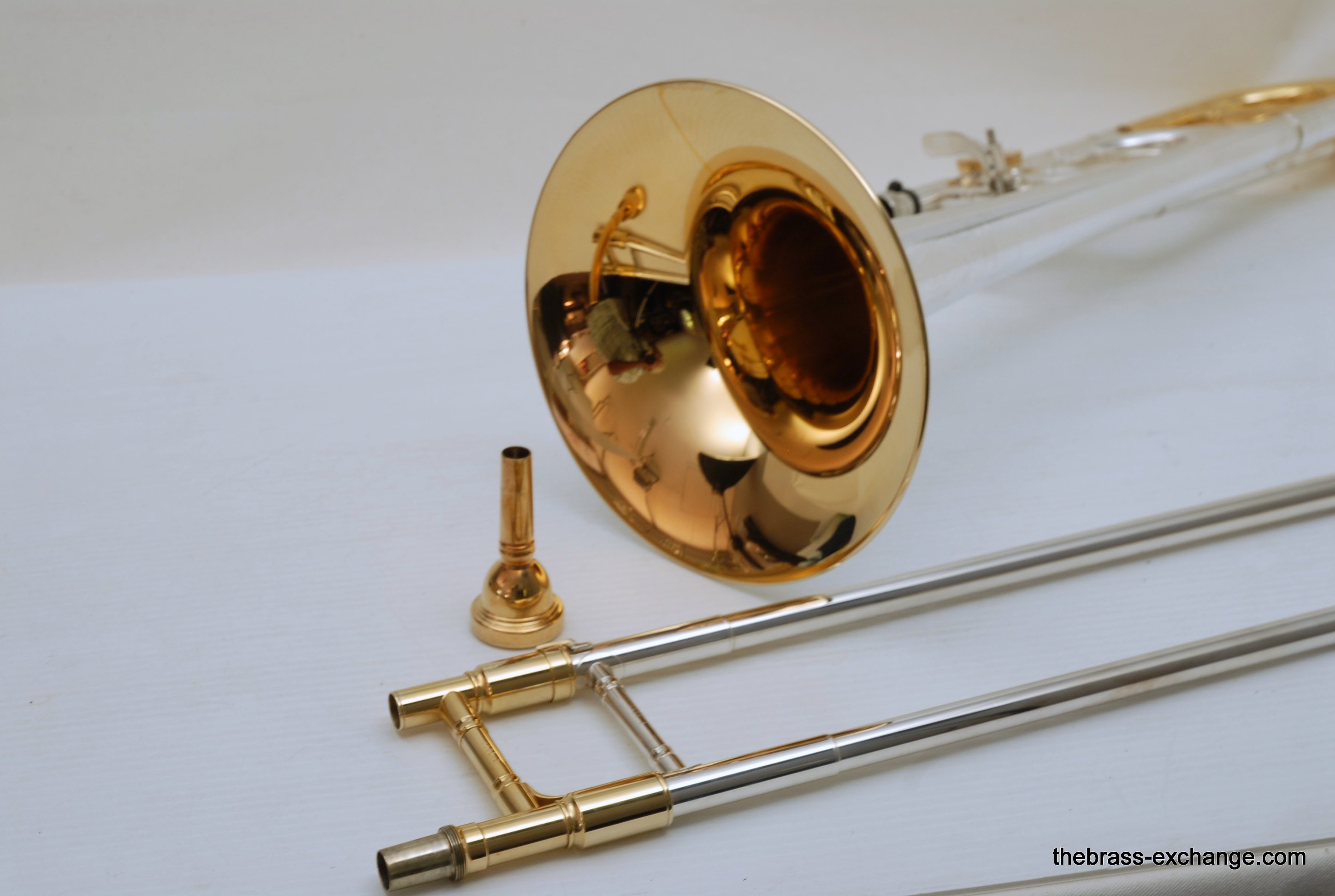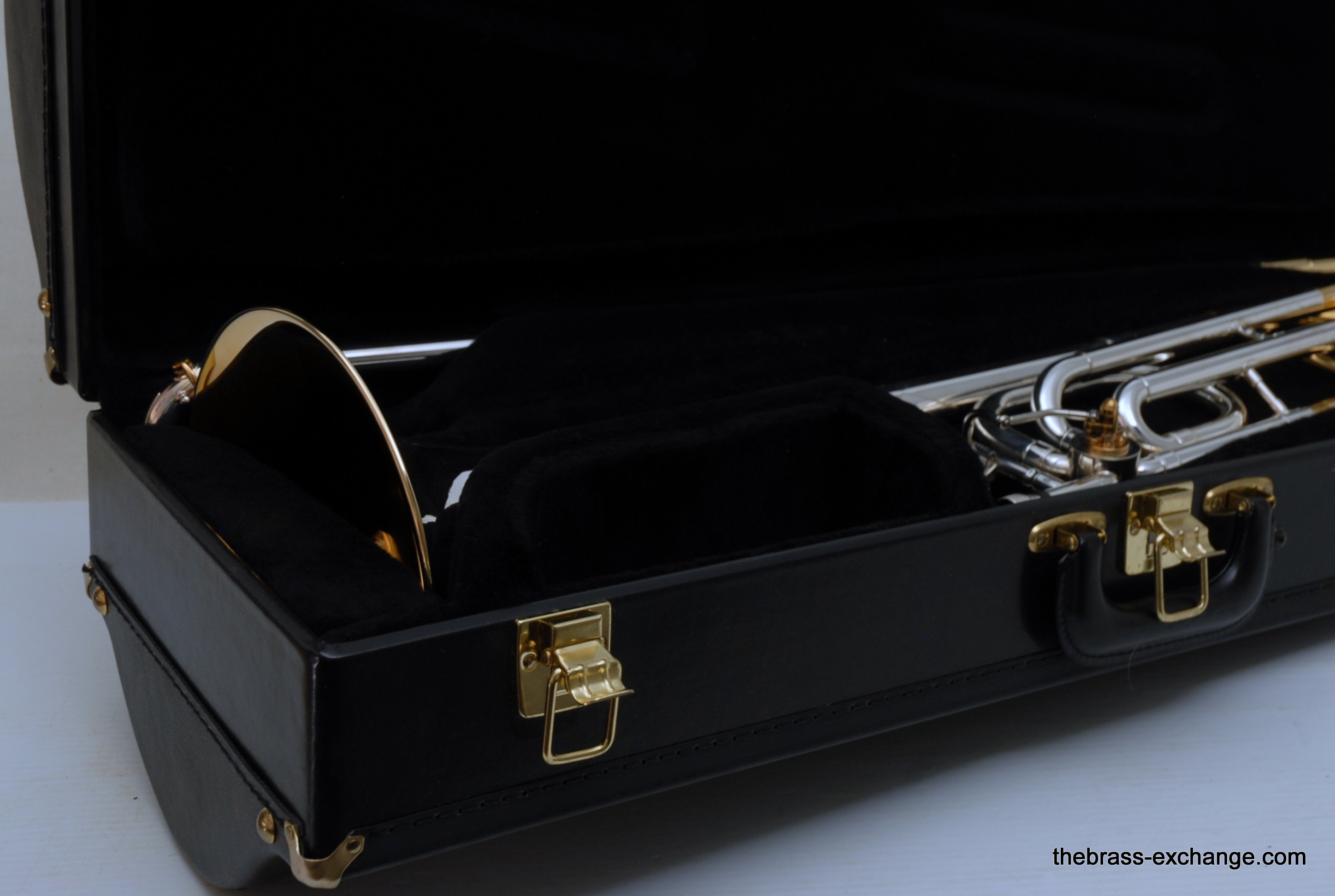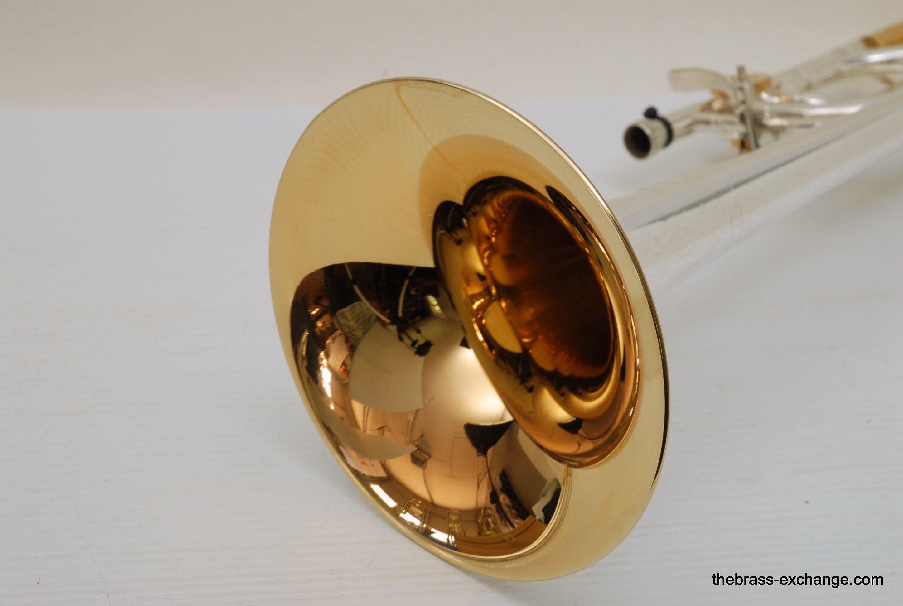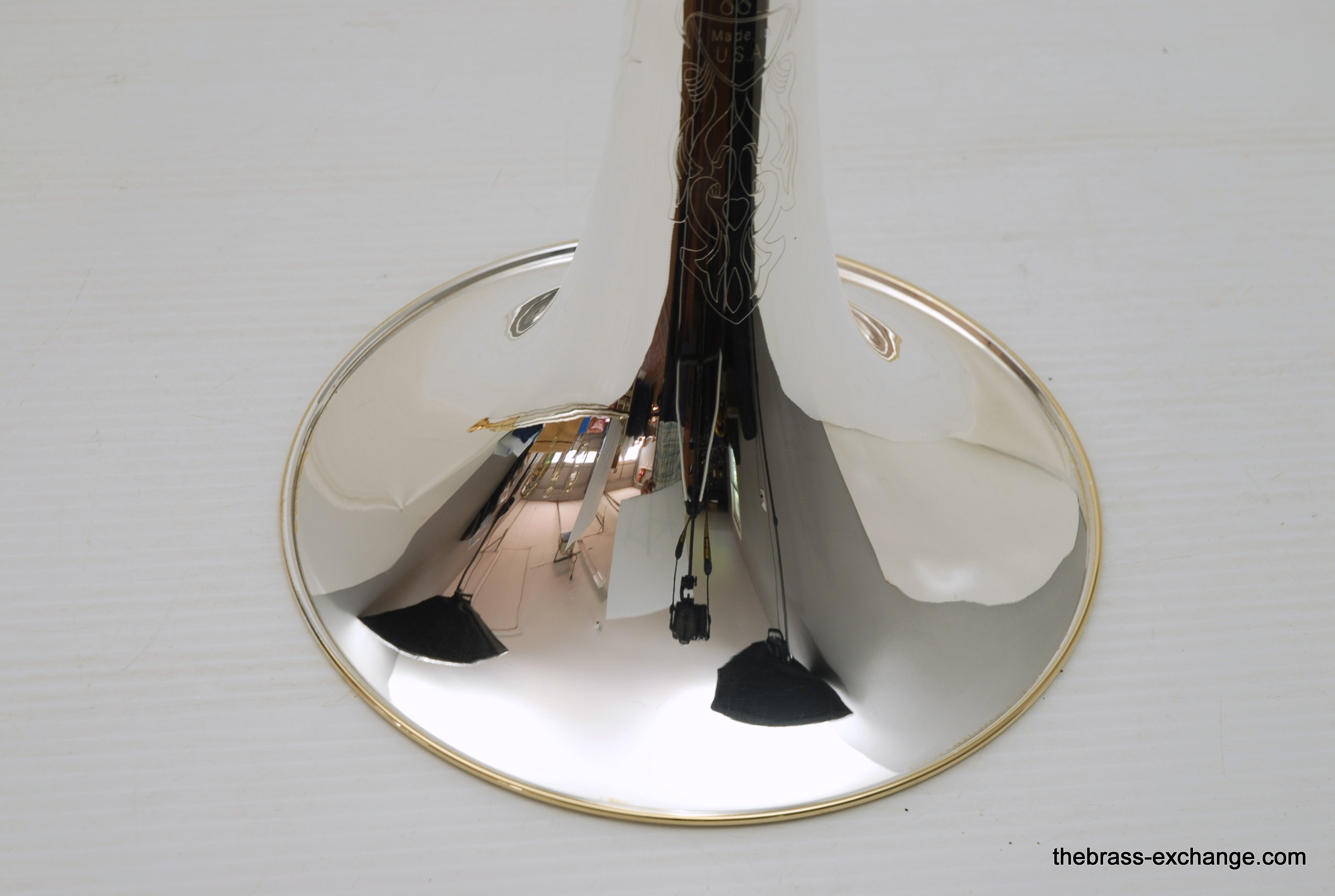 Conn 88H SXG Model. New Old Stock from the 1990's/ Every once in a while something amazing like this 88H SXG becomes available. New, this model sells for well over 4K. This is new old stock, which means that it hasn't been owned and played. It is in perfect condition, just like a new one, but without the long wait or the higher price. They may not even be available any longer. Sterling silver bell with lots of gold trim everywhere, even the back of the valve, linkeage, and water key. Conn went all out on this one. It plays amazing. Tremendous amout of energy coming out of the front, lots of projection and super clarity. We like the traditional wrap on this one. If you have ever played in a band or pit orchestra with no room behind you, then you understand why the long tuning slide on the open wrap 88HO or 42BO can be a hassle. This one is perfect, and is even gold plated. Handslide is fantastic. Valve is super fast and quiet. Will not dissapoint. Comes with Original New Case and gold plated mouthpiece. In-stock for immediate delivery.