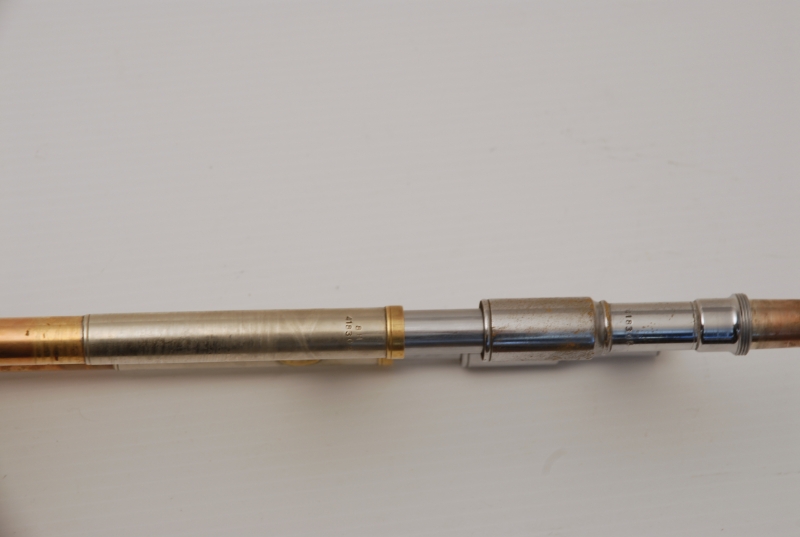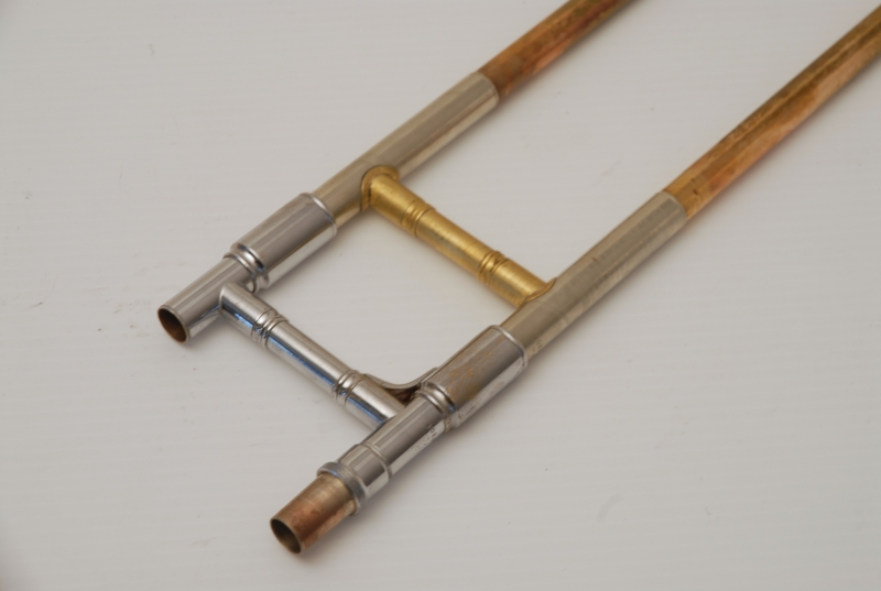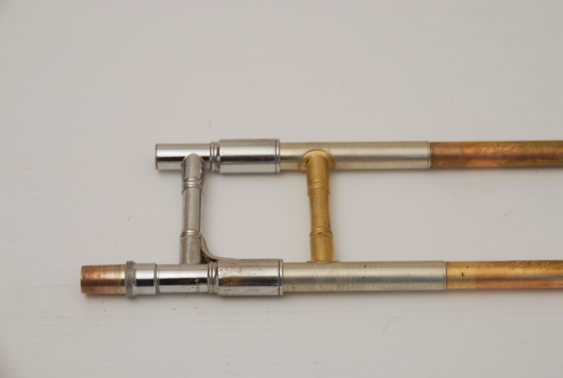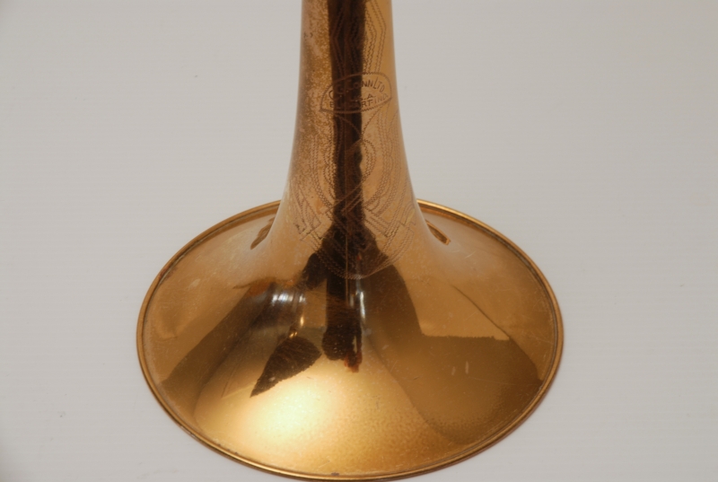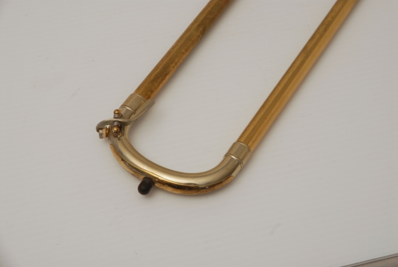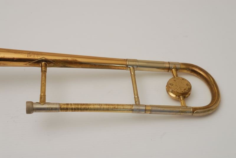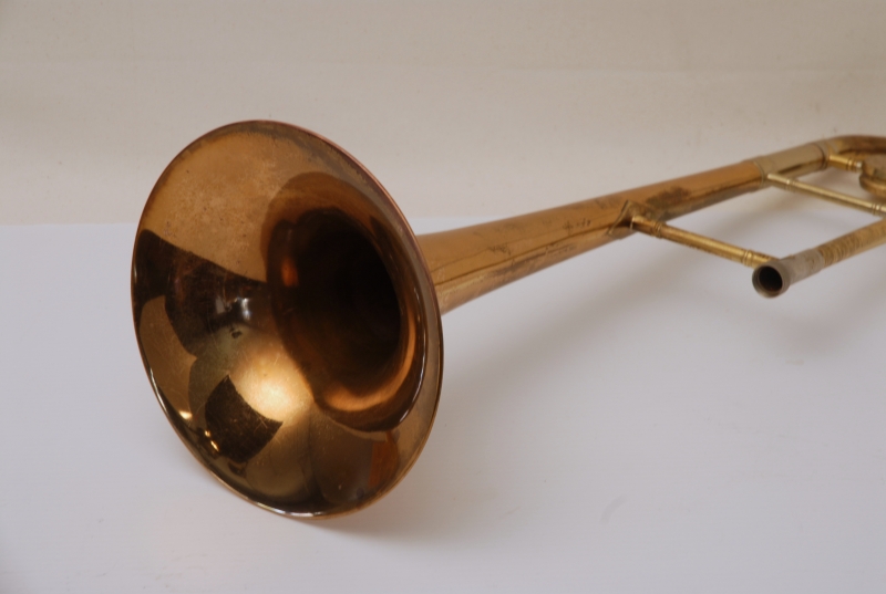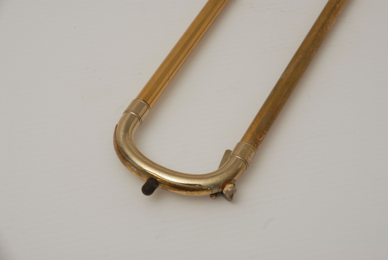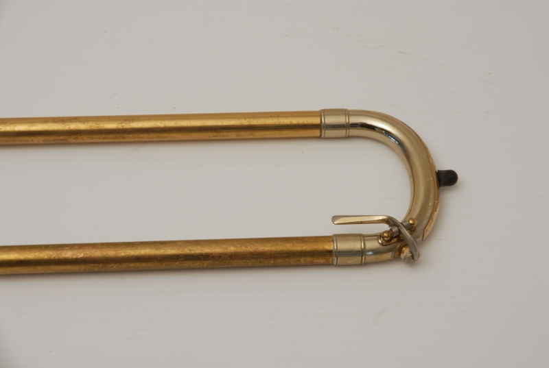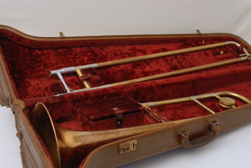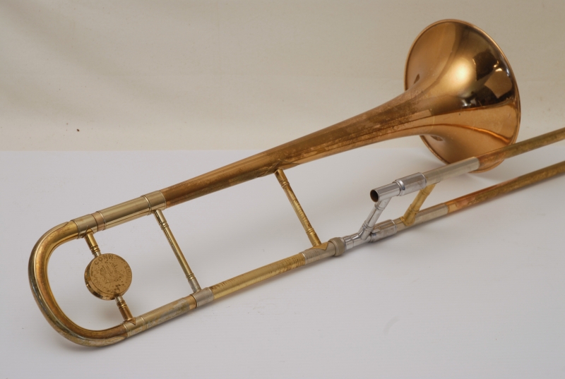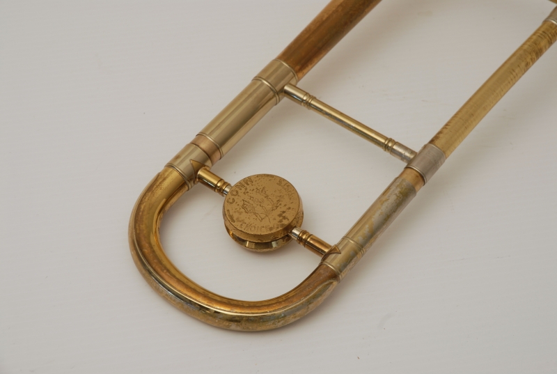 Conn 8H from the early 1950's Elkhart era.  This is a very special horn and plays fantastic.  It is from the same collection of the 2 78H's listed on our website currently.  Has been freshly cleaned and serviced.  All of the parts and lacquer are original.  Has not been damaged or repaired previously that we can tell.  Has the classic 8H rose brass 8.5" flare.  Tuning slide has a brace guard as does the hand slide end crook.  This model was made without a slide lock, and has springs in first position.  Half moon engraving on bell section and old style 2-piece gold lacquer counter weight.  The neckpipe and outer slide around the grip area have imprints from a previous vinyl protective wrap.  We feel that when old horns play great as is, there it can be sort of risky to overhaul them for cosmetic reasons only.  This one plays fantastic and has a magical tone quality.  Handslide is very smooth despsite some inner wear. We reccomend leaving it alone.  With proper care and slide prep, this is a fantastic vintage 8H.  Has the original case, in need of repair, yet still functional.  Mouthpiece not included.
