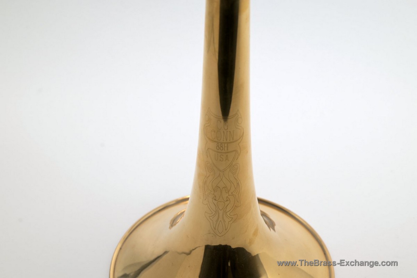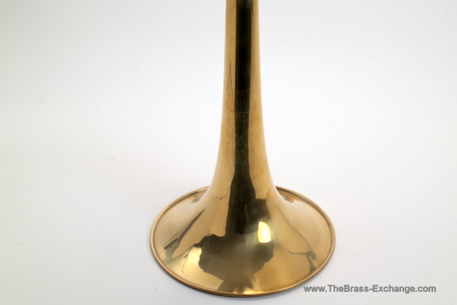 The bell is the familiar Conn 8.5" rose brass 8H bell, presented here in an unlacquered finish. The bell section includes a custom yellow brass neckpipe and a standard Conn yellow brass tuning slide.