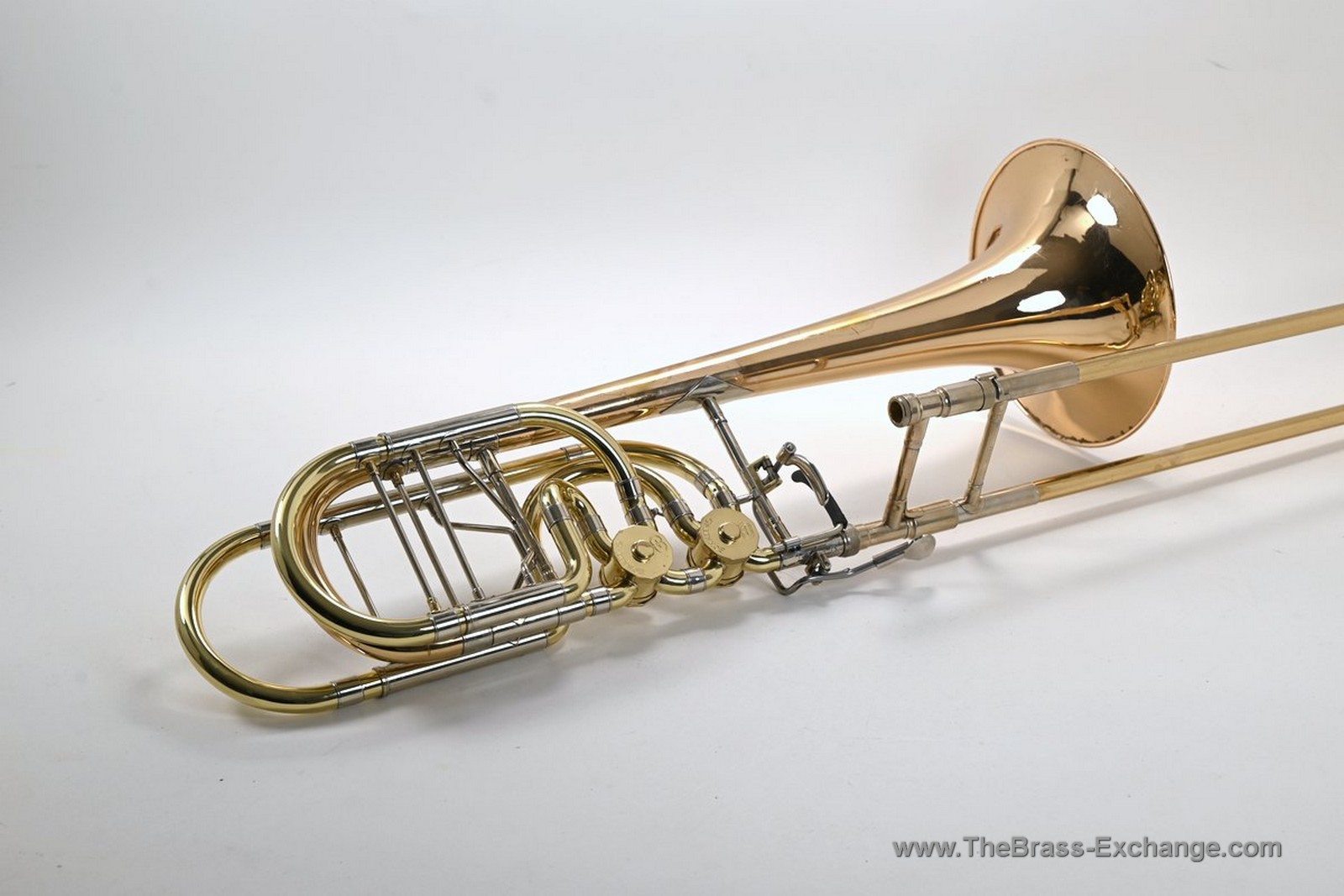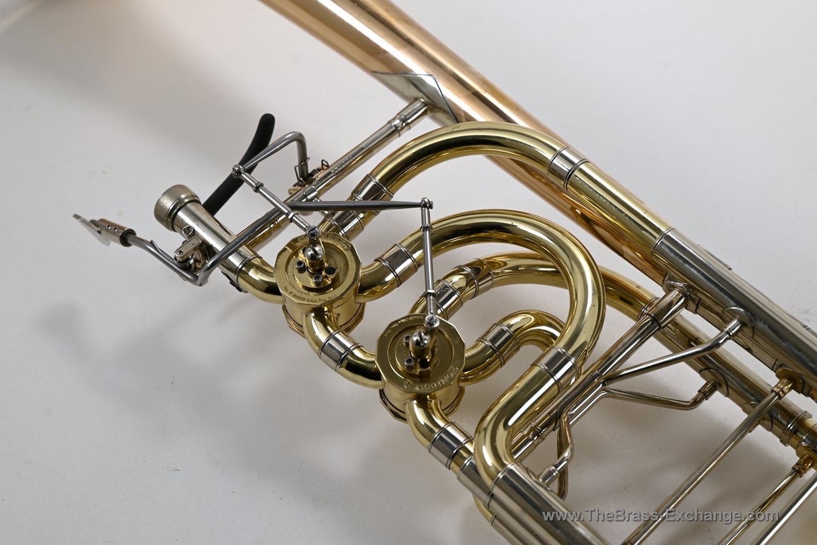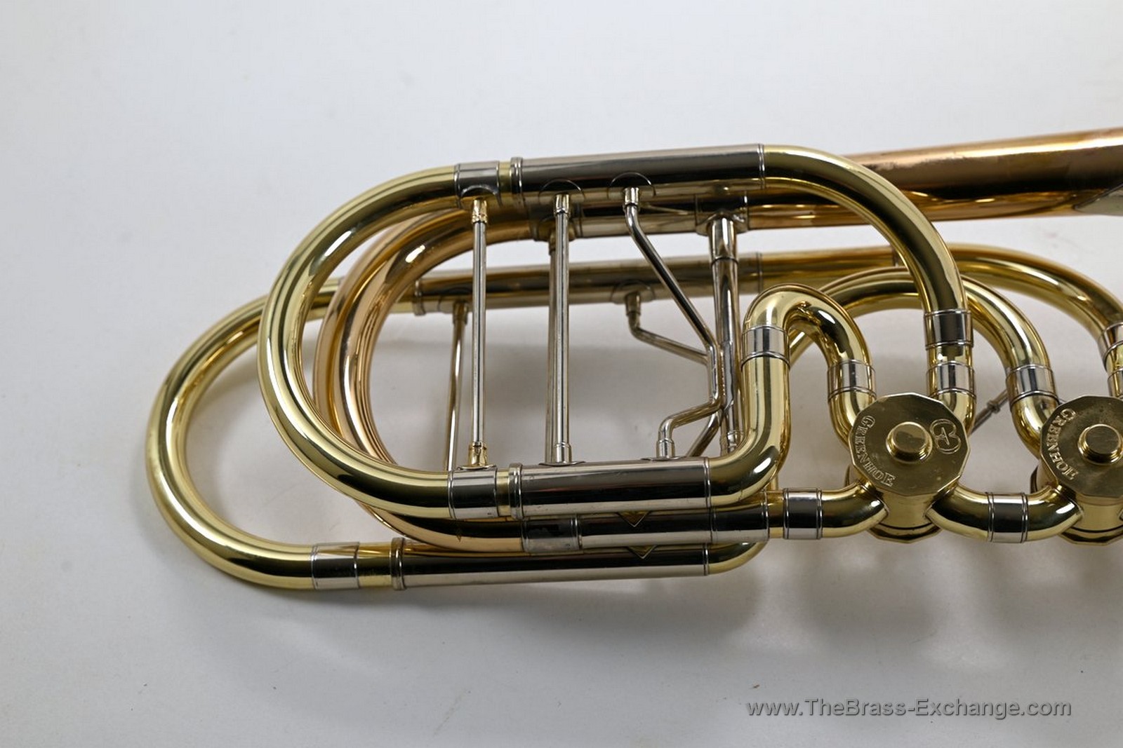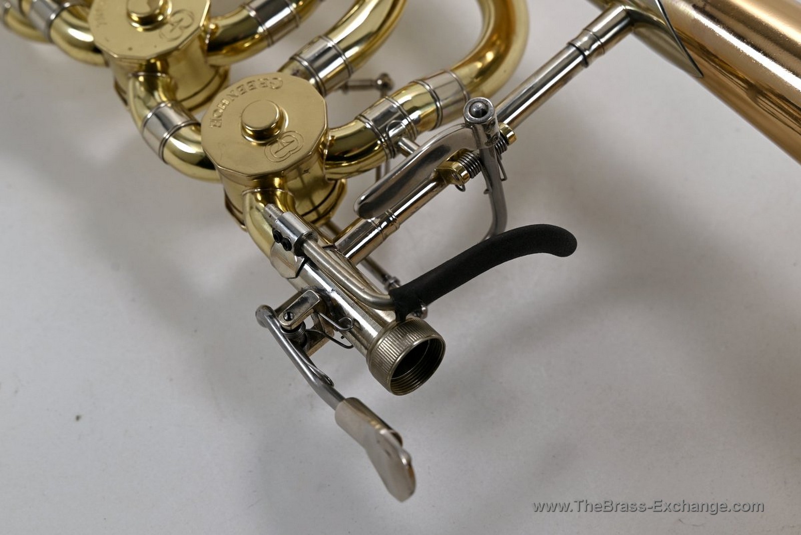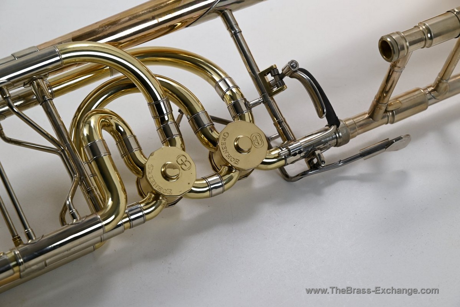 This Conn-Greenhoe bass trombone, built from a Conn 62H bell section paired with Greenhoe independent Gb/D valves, has now been sold and is preserved here as part of The Brass Exchange Archive of Sold instruments.