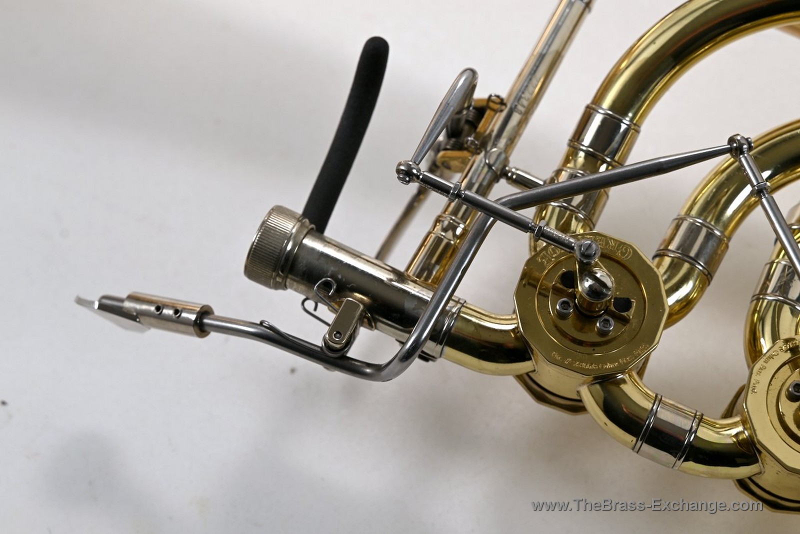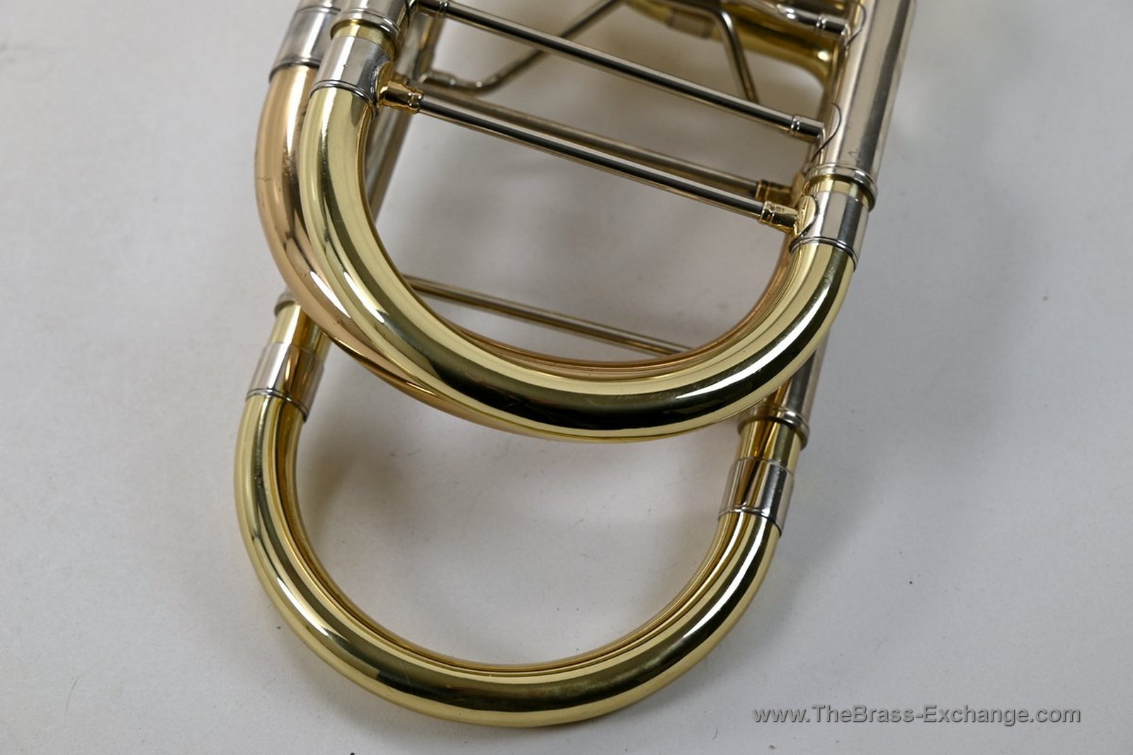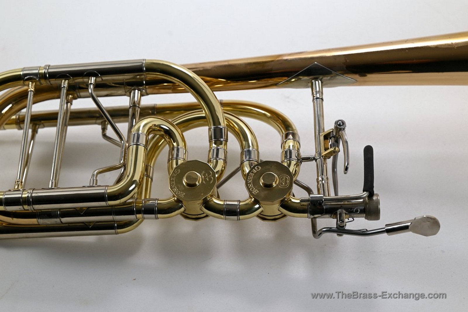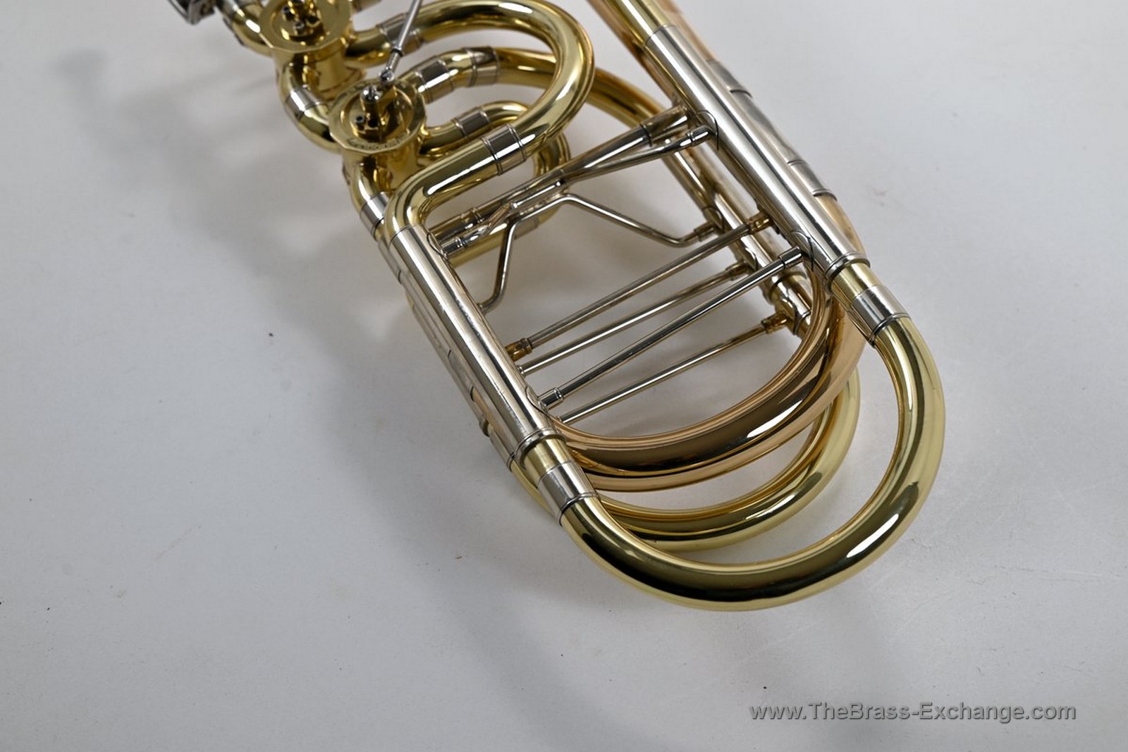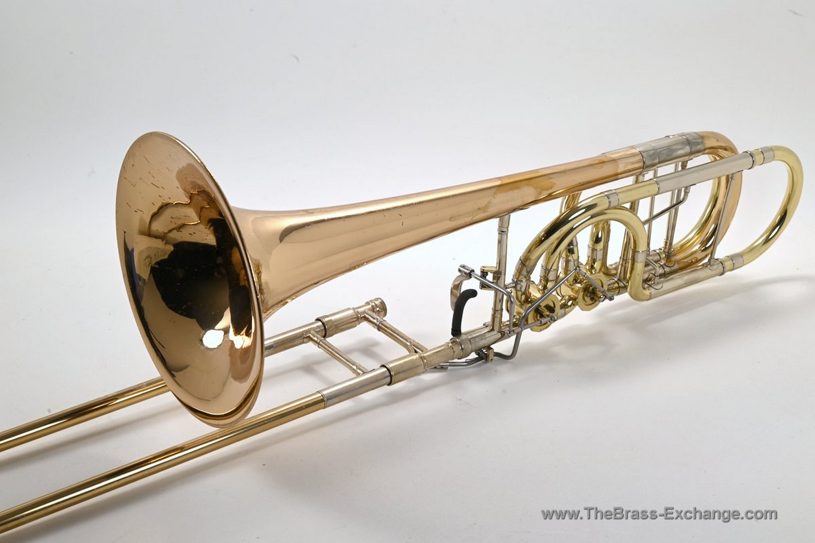 This Conn-Greenhoe bass trombone, built from a Conn 62H bell section paired with Greenhoe independent Gb/D valves, has now been sold and is preserved here as part of The Brass Exchange Archive of Sold instruments.