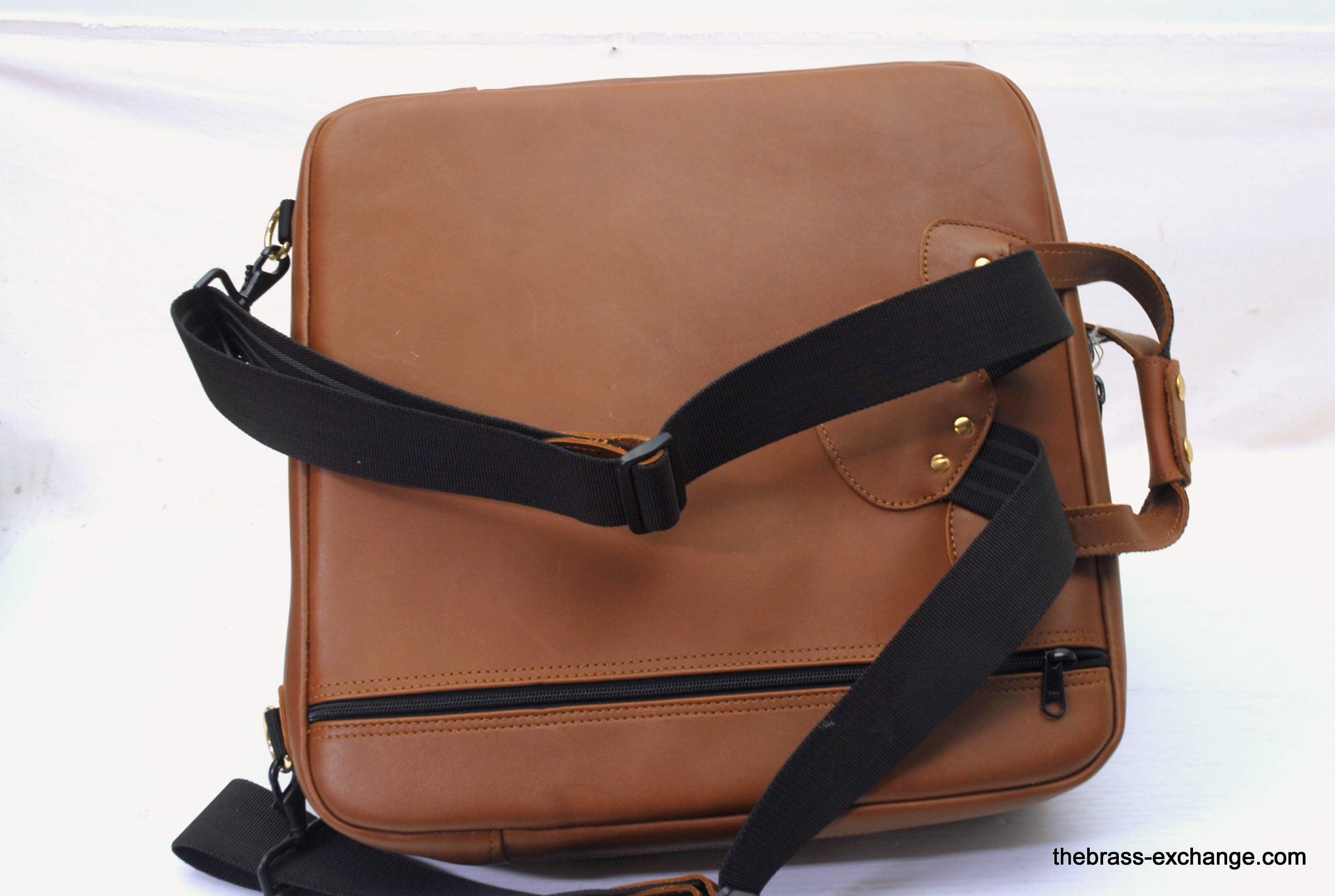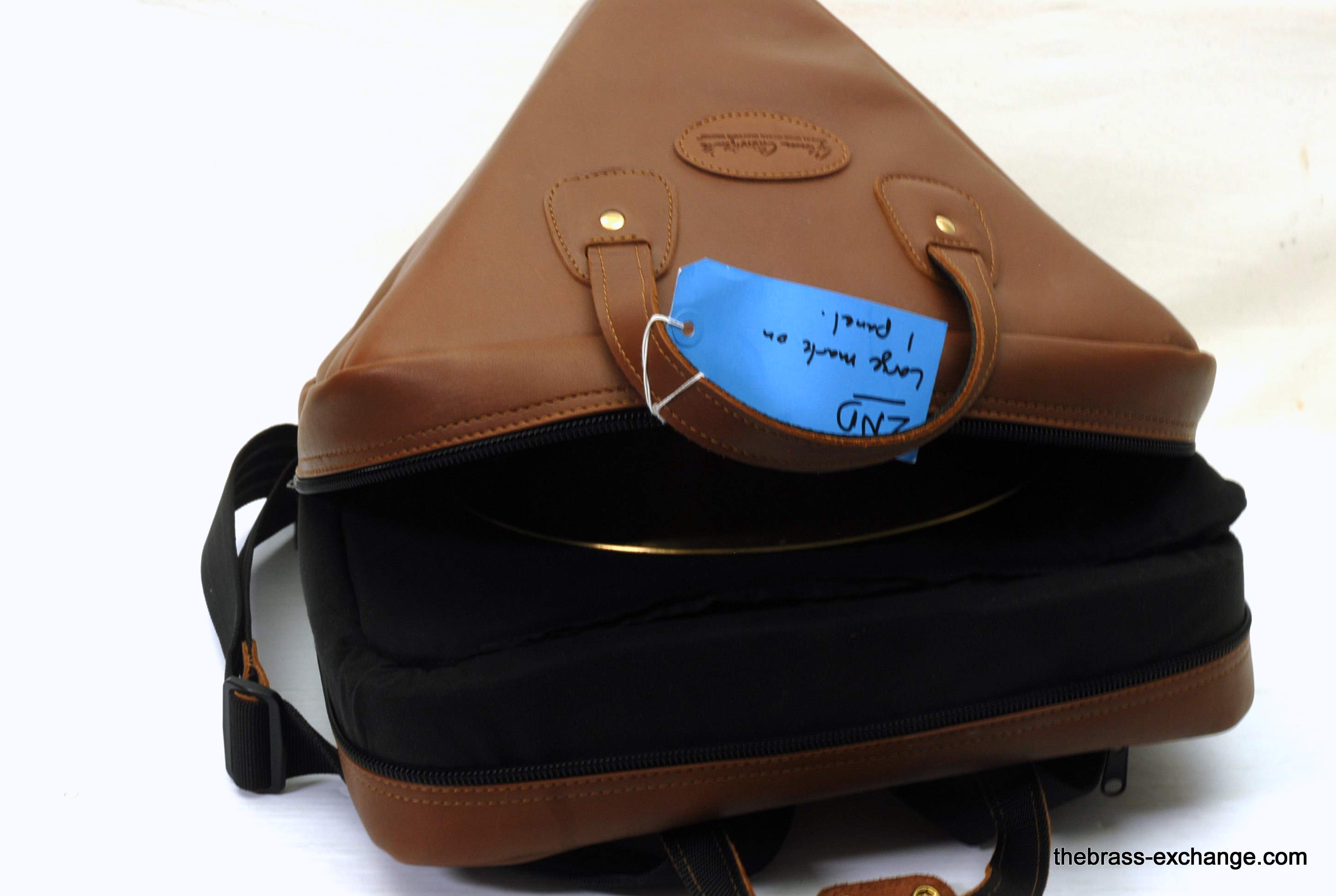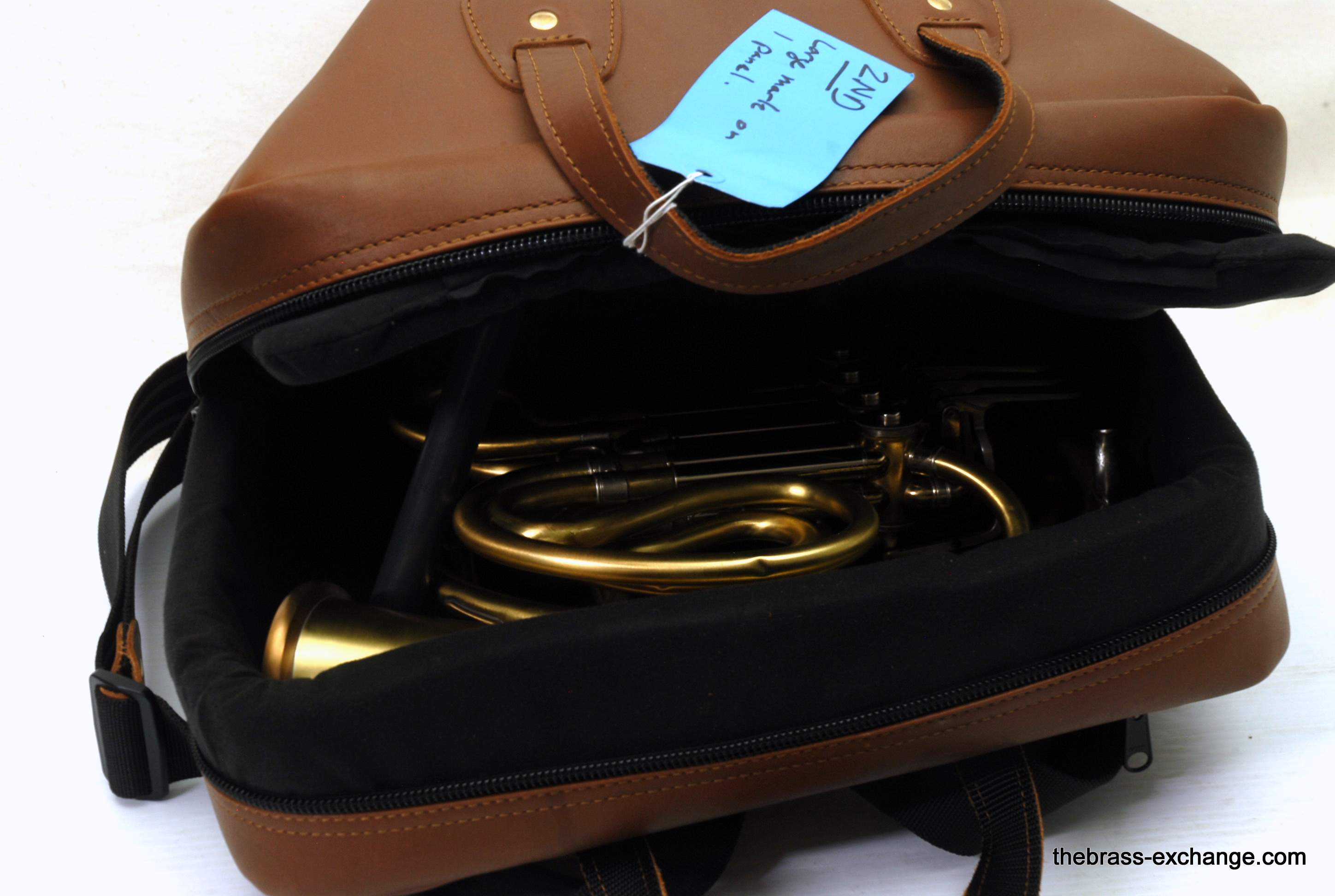 This Cronkhite leather French horn screw bell case in British Tan is brand new and available now as a discounted factory second due to a small cosmetic blemish on one upper panel. Structurally perfect and fully functional, this handcrafted leather case normally sells for $495 +, but is offered here at a much lower price for players who want professional protection without paying full retail.