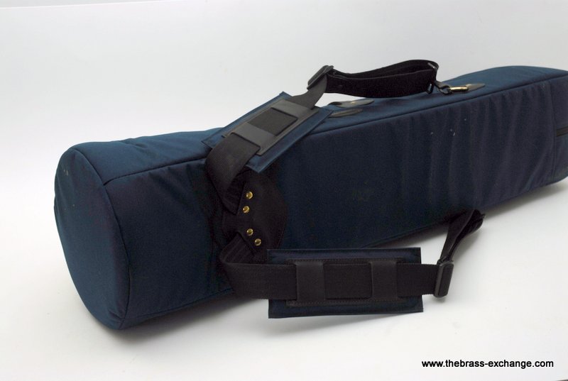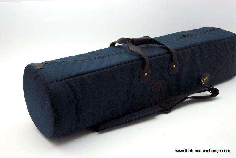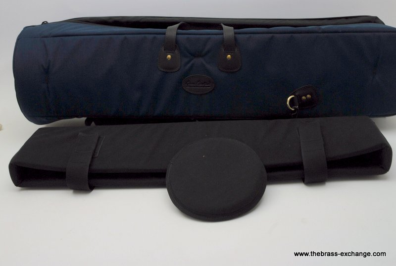 Cronkhite Trombone Gig Bag, Double Model for Large Tenor w/F x2 or Tenor w/F and small bore or alto. Is a recent make, blue cordura. Has double slide compartment and removable opposite end padded disk for extra bell protection. Back pack straps with movable extra shoulder comfort pads. Cronkhite cases are manufactured by Torpedo Bags in MN, U.S. Excellent quality materials, premium zipper which is the industry standard #10 YKK brand. Steel hardware. Made to last.