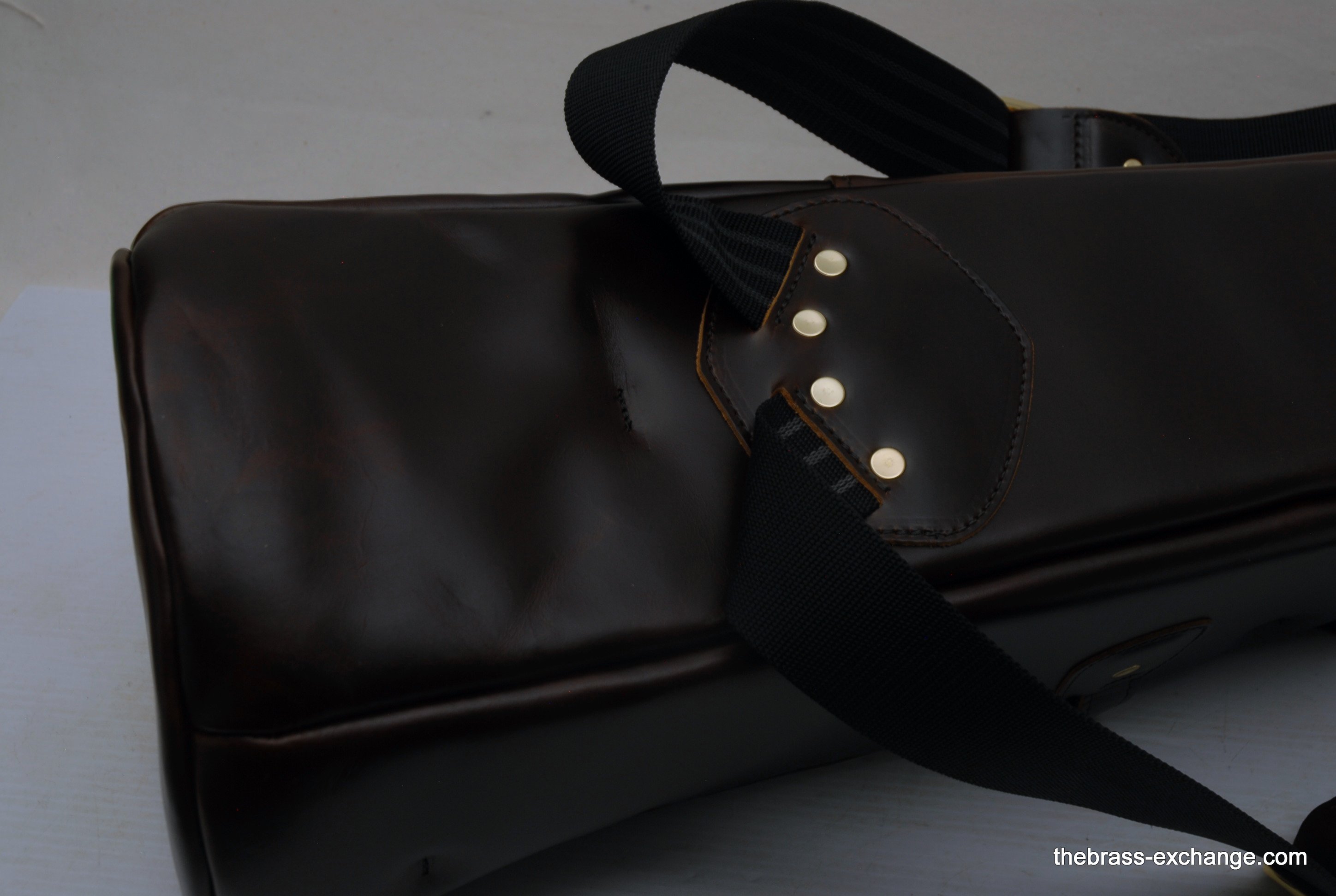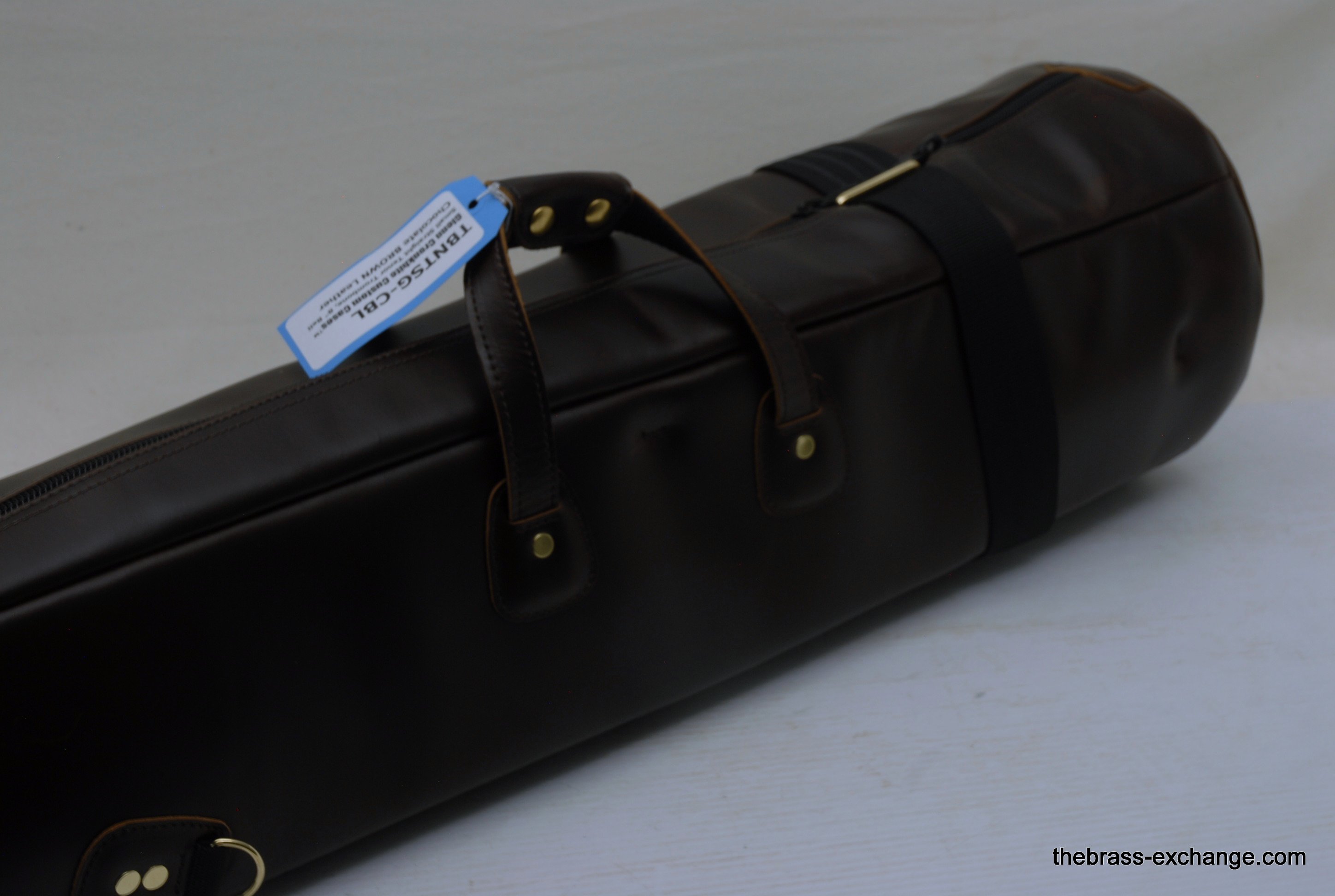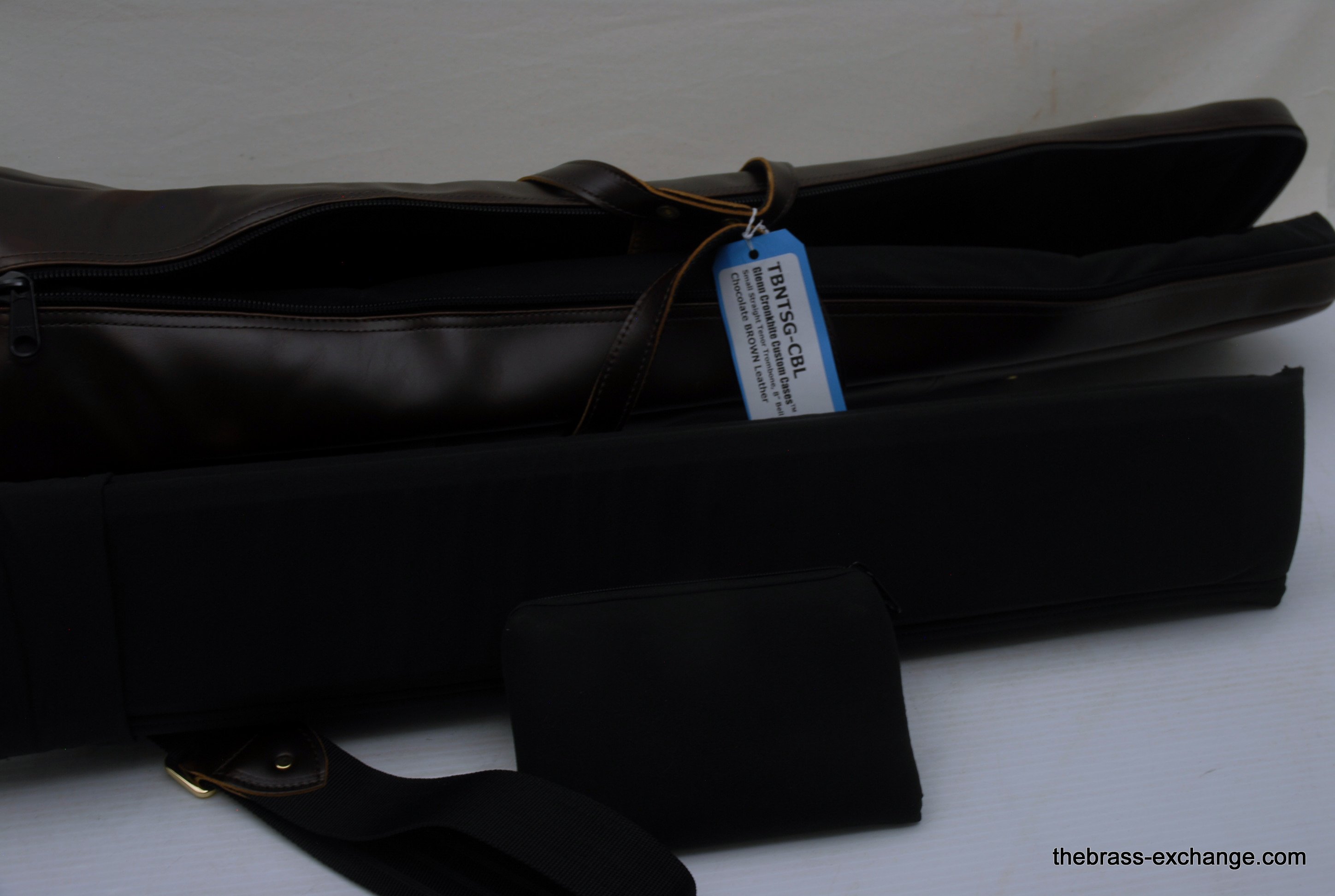 Cronkhite Leather Trombone Gig Bag TTG Model up to 8" Bell, with or without F attachment.  Color:  Brown Chocolate Leather For small bore tenor. Fits comfortably up to 8" Bell. Ideal for King 3B, 2B, Conn 6H, 48H, Bach 16, 12, or any horn with a bell 8" in diameter or less. Will also fit a medium bore with F such as Bach 36B.   There are no pockets or exterior compartments on Cronkhite cases.  The reason, according to Mr. Cronkhite, is so that there is less material protruding that could potentially get caught on something unexpected like a car door.  This Case has structure and offers protection to your instrument. You can stand it on end and it won't tip over. The Bell Compartment is rigid and protective.  The inner compartment is just large enough to fit the straight tenor bell section and the removable slide compartment.  The new Torpedo make Cronkhite cases are every bit as good as the original Cronkhites if not better.  A few improvements include a more closed cell foam interior, which is much softer to the touch, and does not attract organic particles quite as easily.
