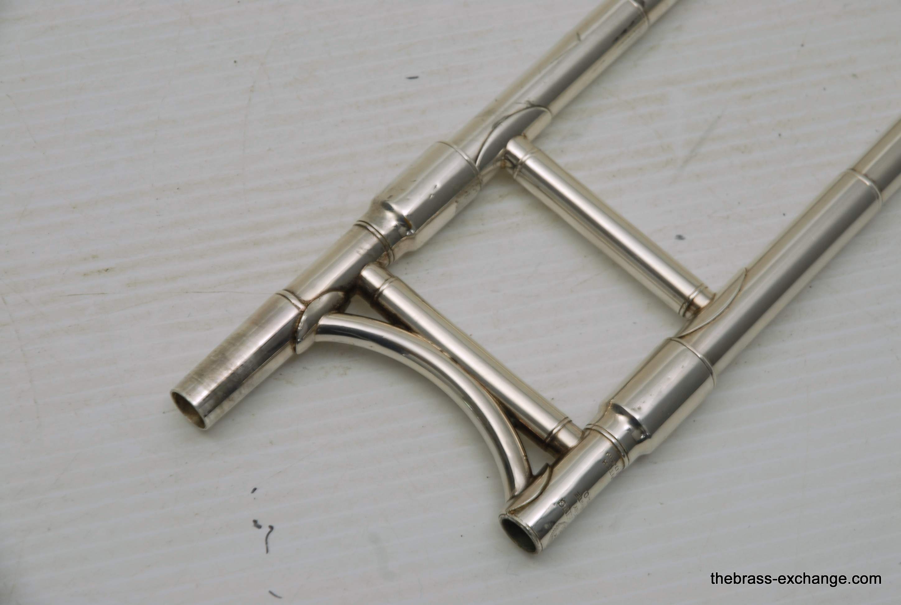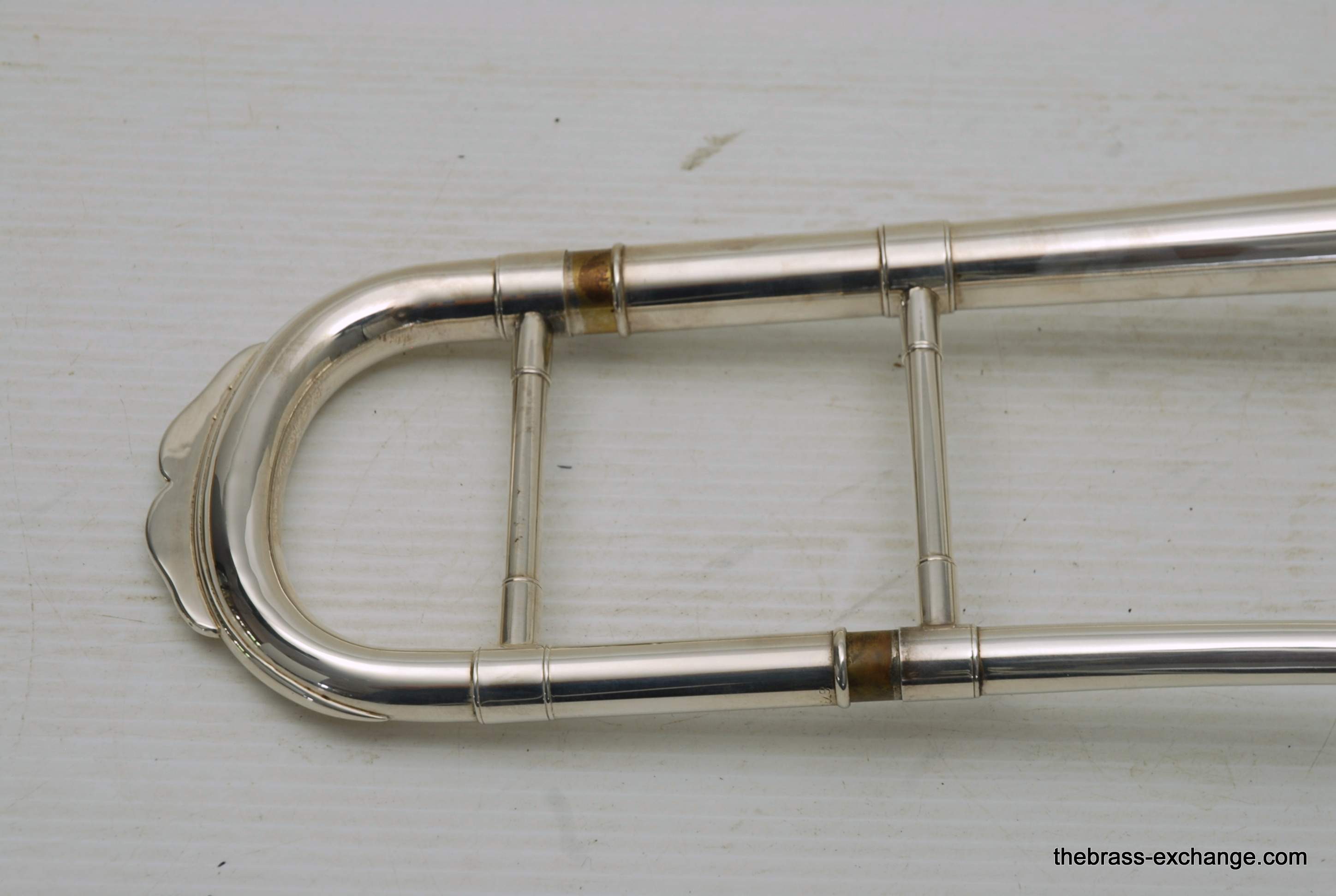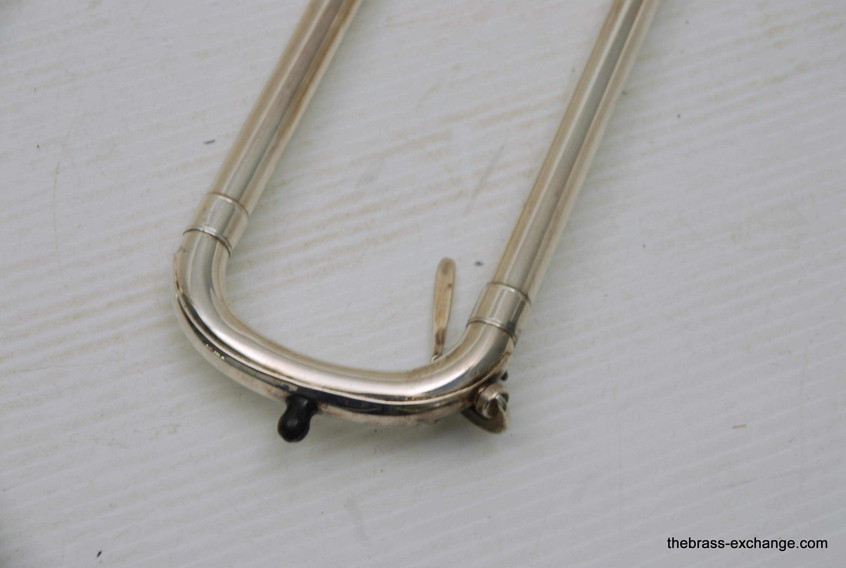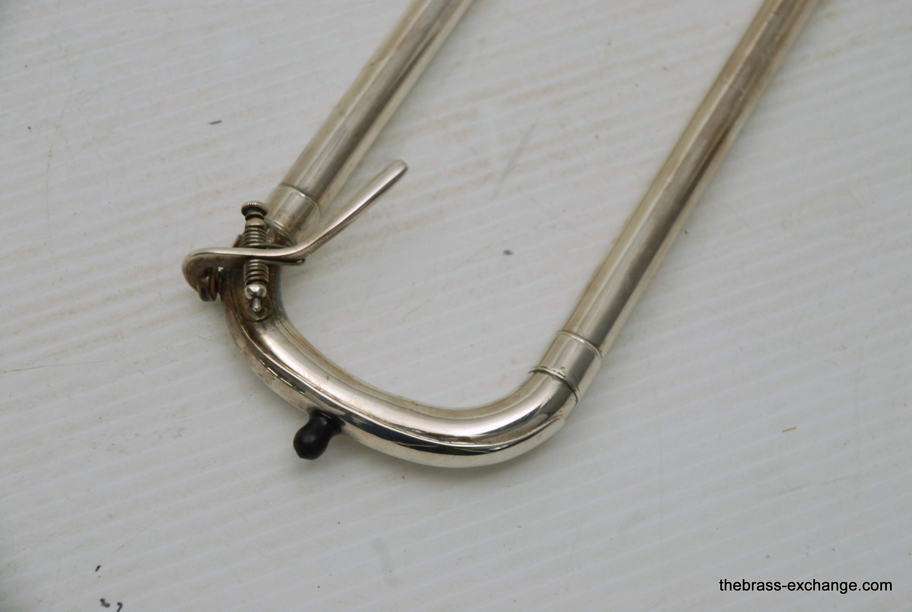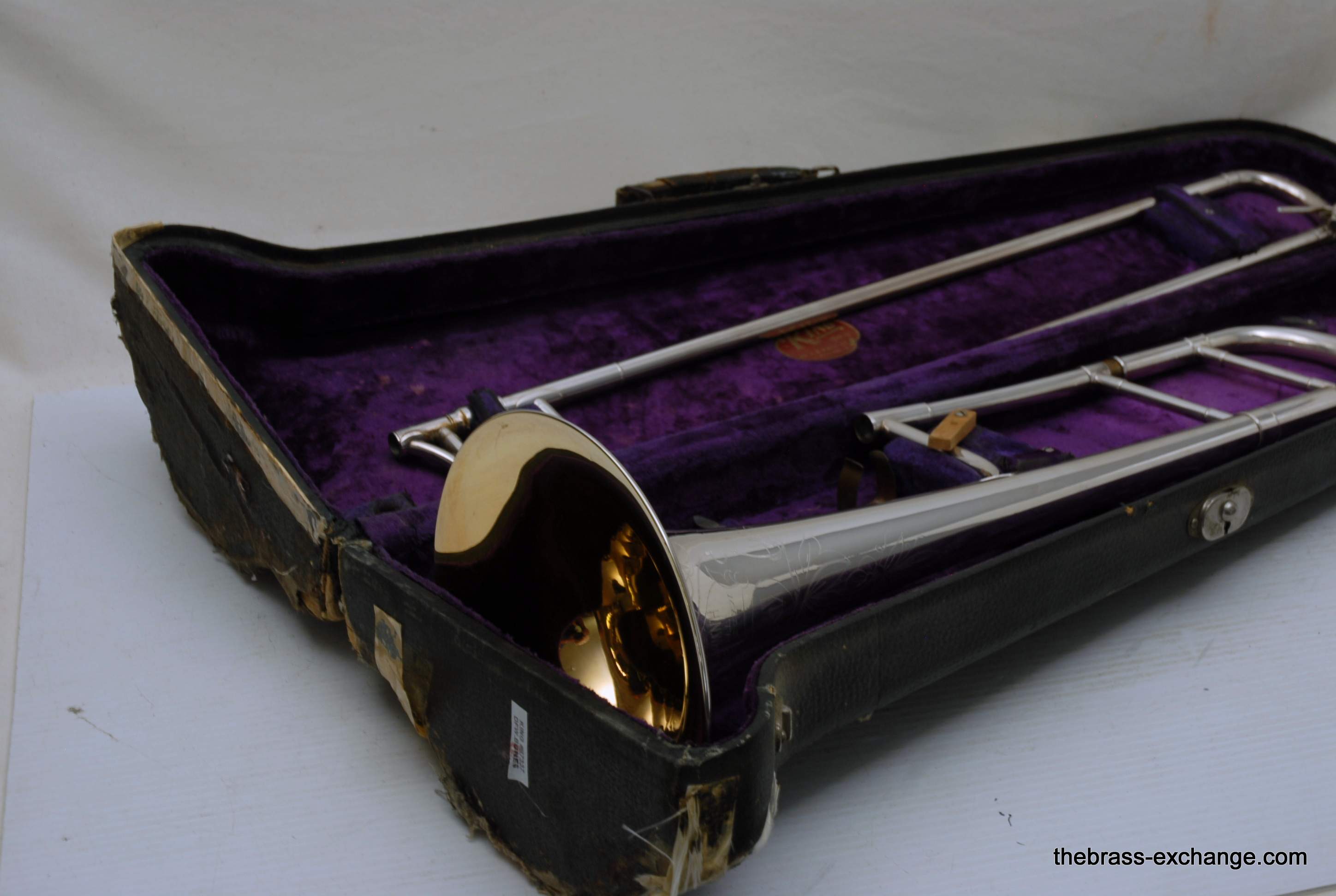 King Symphony Model. H.N. White Model from 1925-1930 SN 87337. Most likely 1926. Has 8" Bell Silver Plated with gold plated inner bell. Handslide bore is .508. Same exact specs as the popular 3B model. This is an early King. This is a super straight horn never damaged. Finish has had restoration. Crisp engraving. Interstingly, innner slide tubes at the stockings were nickel plated. Was a major improvement. We had our slide guy set this one up, the slide is flawless. is both a great playing horn and a King collectible. They did not put slide locks on this model. It is also a friction fit connection between slide and bell receiver, this very common on old trombones. On the mouthpiece reciever it is stamped low pitch, near the lion head, this tunes at A440. It is a very nice playing vintage King. Yes you can take it to a gig today and sound fantastic. These were most likely used in Orchestras, Radio Shows, Night Club Orchestras, back in the day. Takes standard small shank mouthpiece. A standard Bach mouthpiece works perfectly today. Overall, it's a super nice vintage King, and clean as a can be, no dents or dings, no signs of major repair, it's a fantastic representation of what H.N. White was doing nearly 100 years ago. The best part is that is still 100% playable today. Original case in worn condition. Mouthpiece not included. In-stock for immediate delivery.
