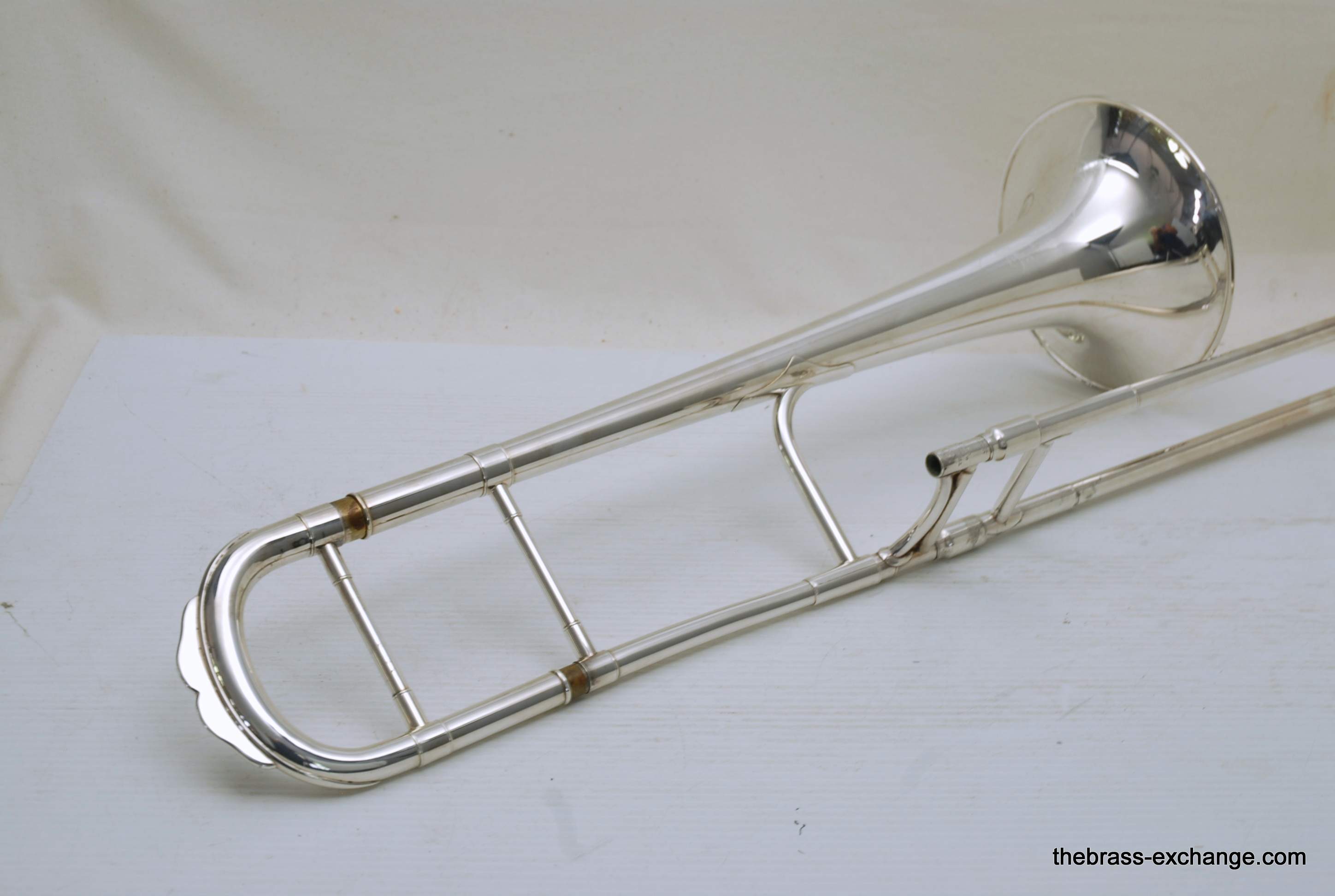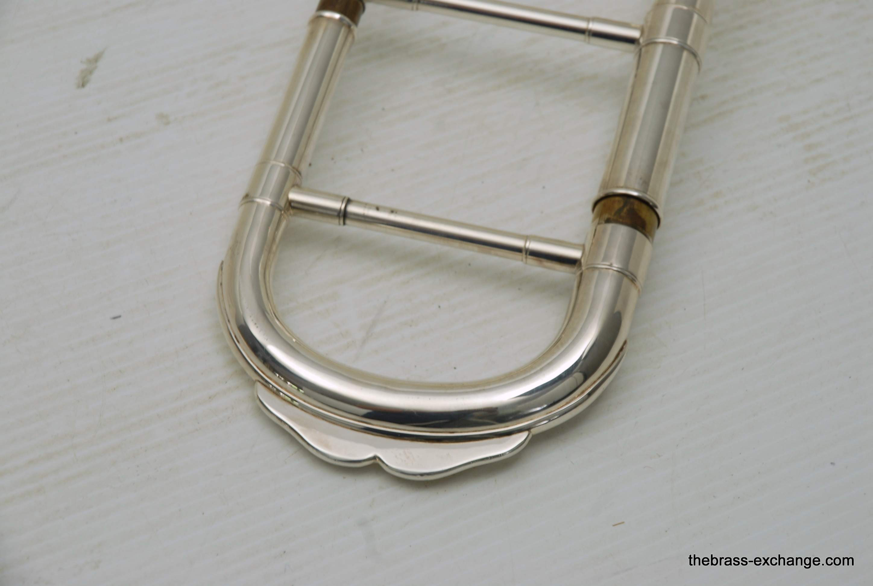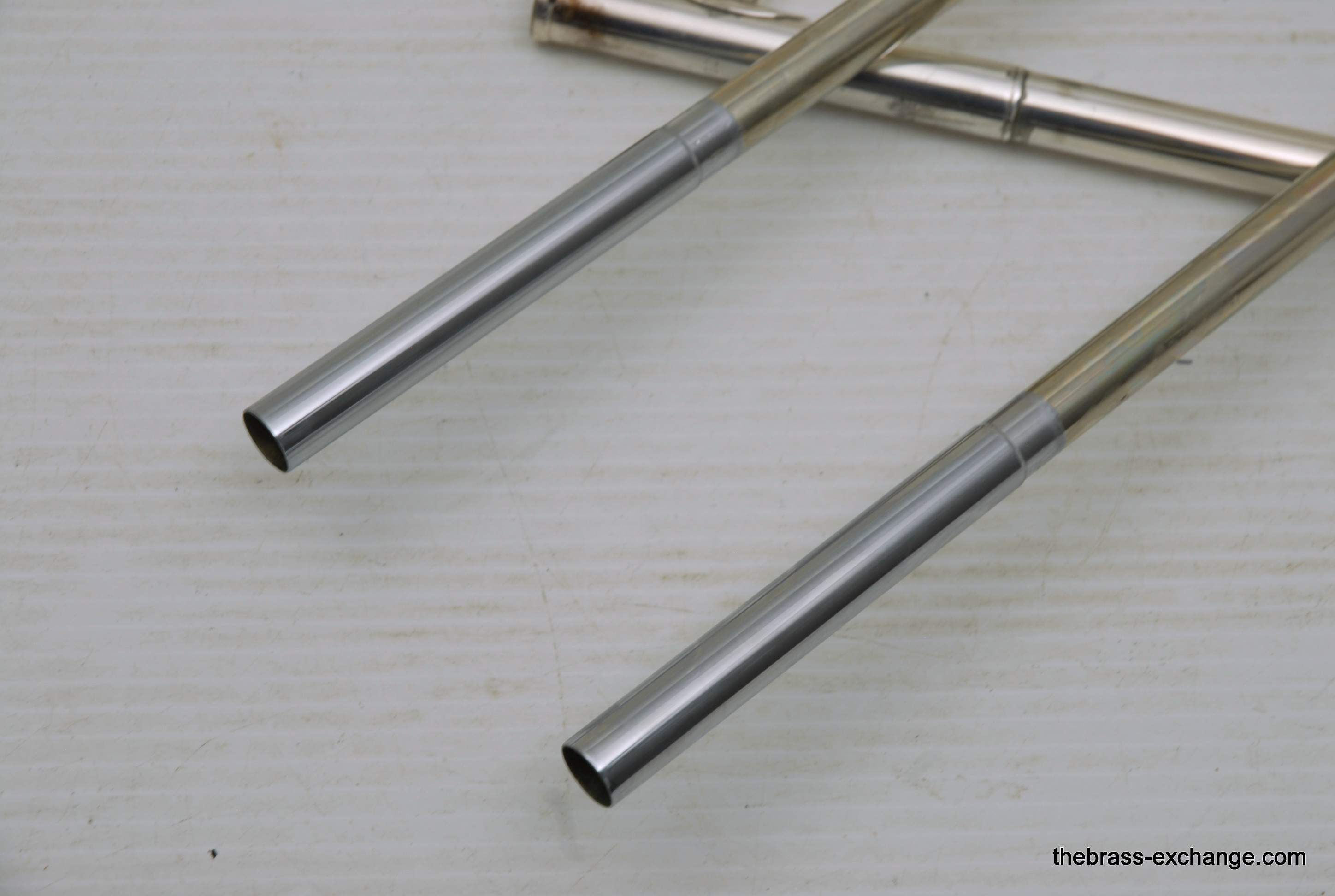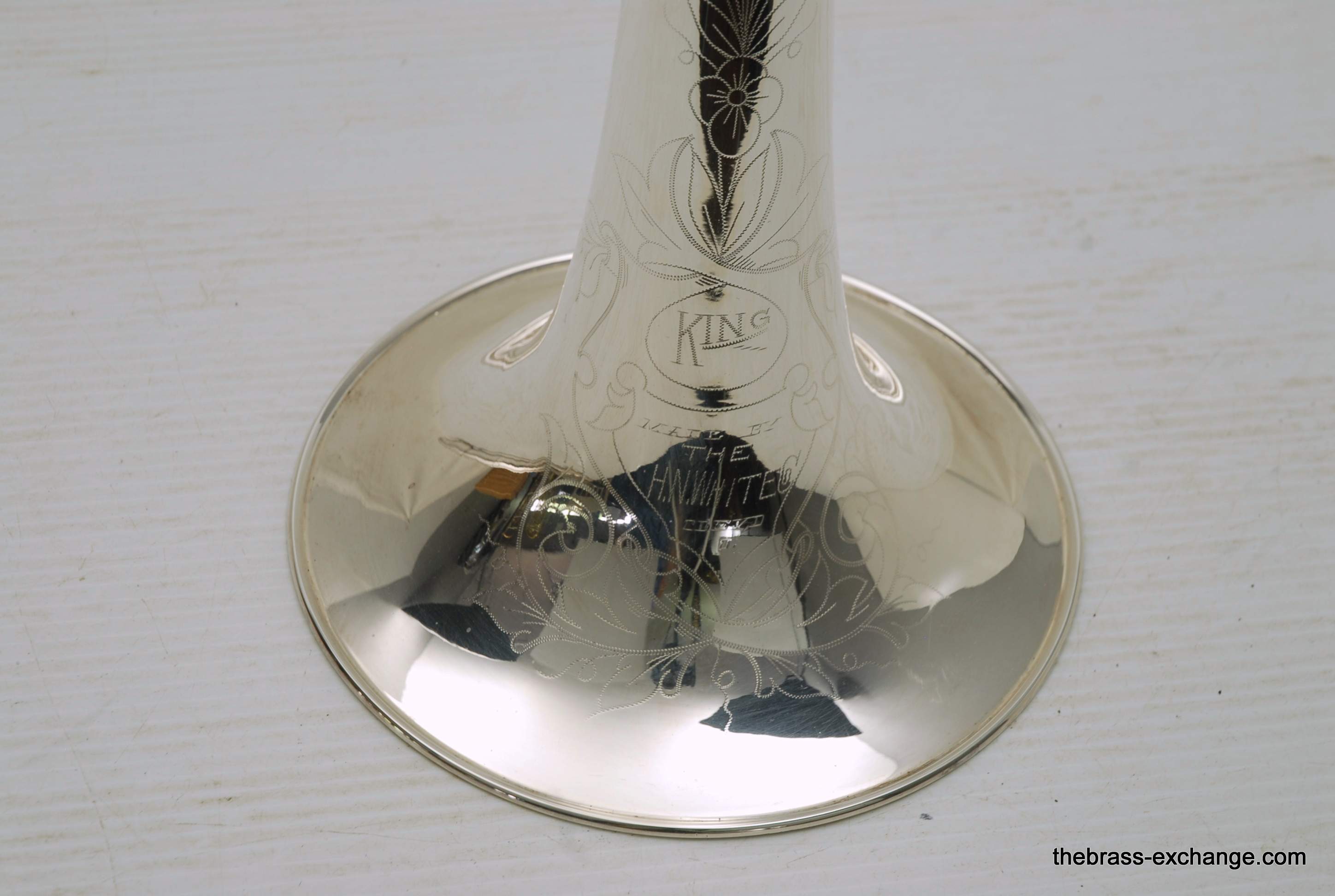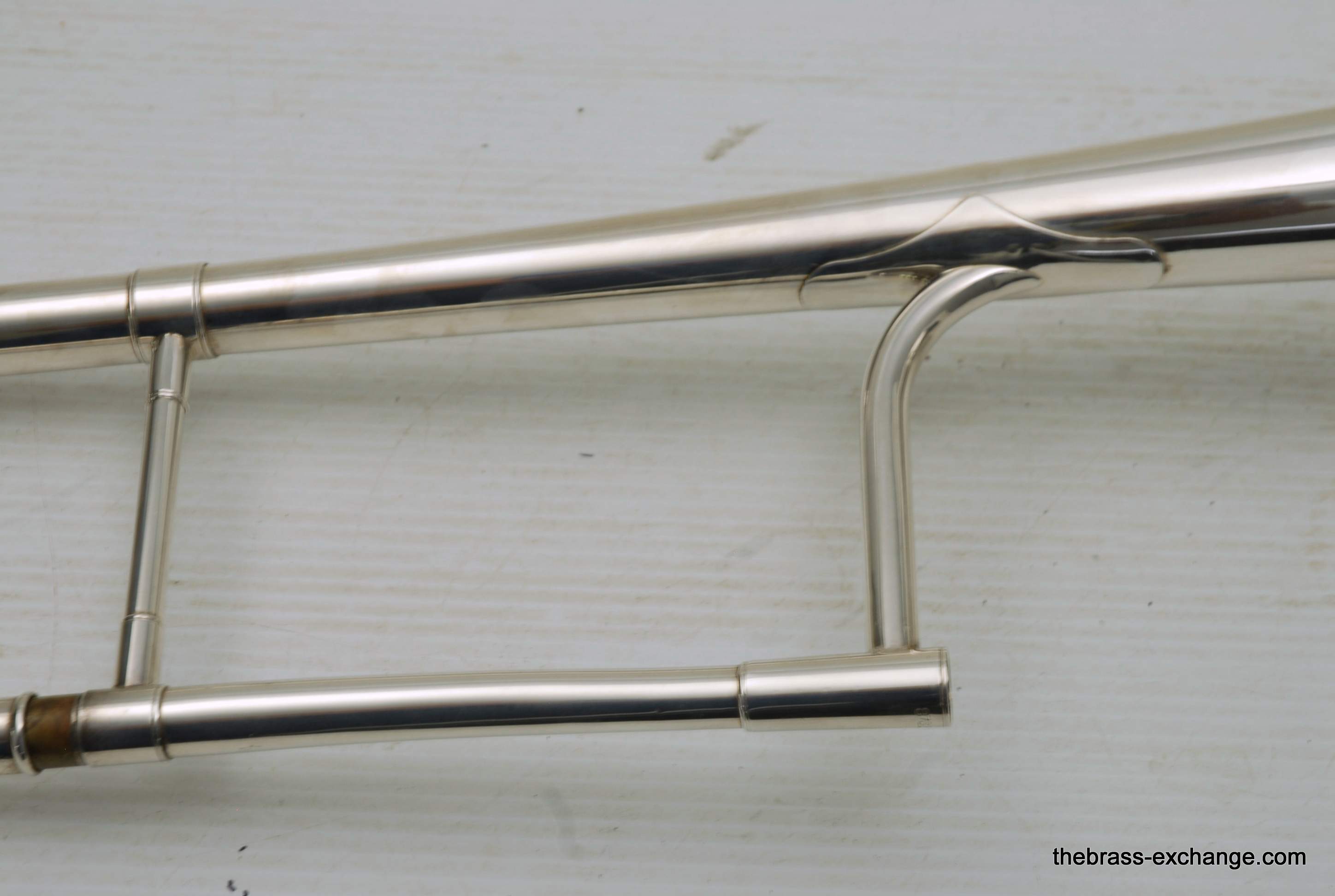 King Symphony Model. H.N. White Model from 1925-1930 SN 87337. Most likely 1926. Has 8" Bell Silver Plated with gold plated inner bell. Handslide bore is .508. Same exact specs as the popular 3B model. This is an early King. This is a super straight horn never damaged. Finish has had restoration. Crisp engraving. Interstingly, innner slide tubes at the stockings were nickel plated. Was a major improvement. We had our slide guy set this one up, the slide is flawless. is both a great playing horn and a King collectible. They did not put slide locks on this model. It is also a friction fit connection between slide and bell receiver, this very common on old trombones. On the mouthpiece reciever it is stamped low pitch, near the lion head, this tunes at A440. It is a very nice playing vintage King. Yes you can take it to a gig today and sound fantastic. These were most likely used in Orchestras, Radio Shows, Night Club Orchestras, back in the day. Takes standard small shank mouthpiece. A standard Bach mouthpiece works perfectly today. Overall, it's a super nice vintage King, and clean as a can be, no dents or dings, no signs of major repair, it's a fantastic representation of what H.N. White was doing nearly 100 years ago. The best part is that is still 100% playable today. Original case in worn condition. Mouthpiece not included. In-stock for immediate delivery.