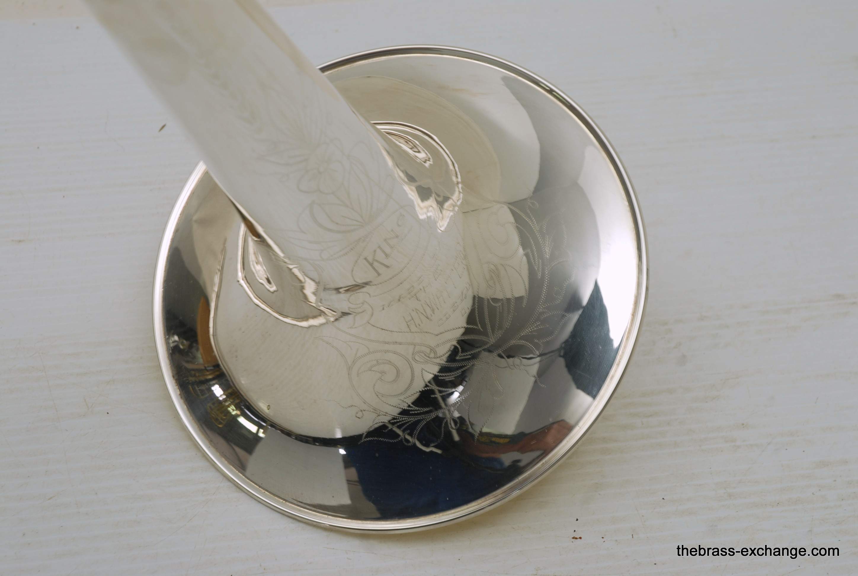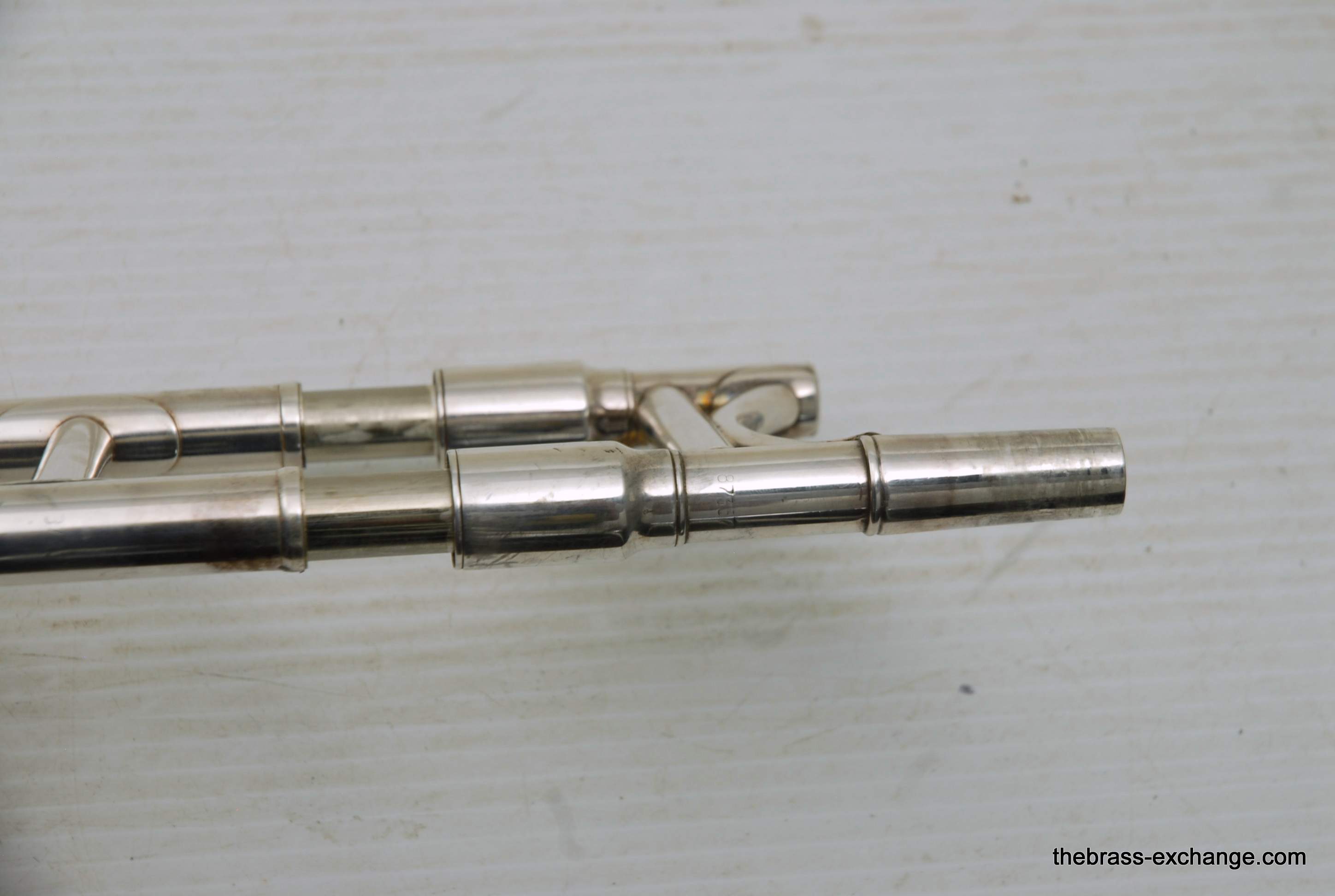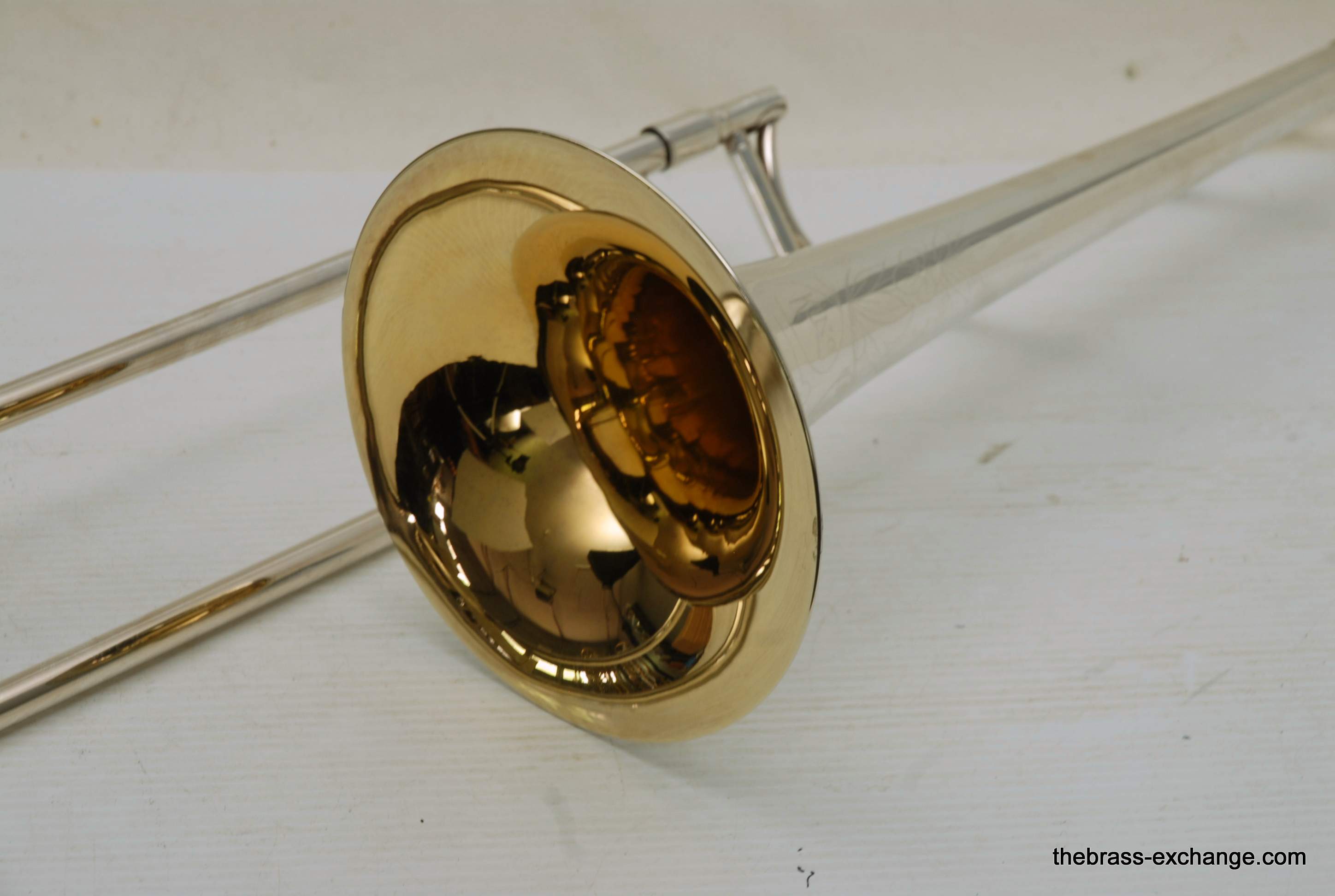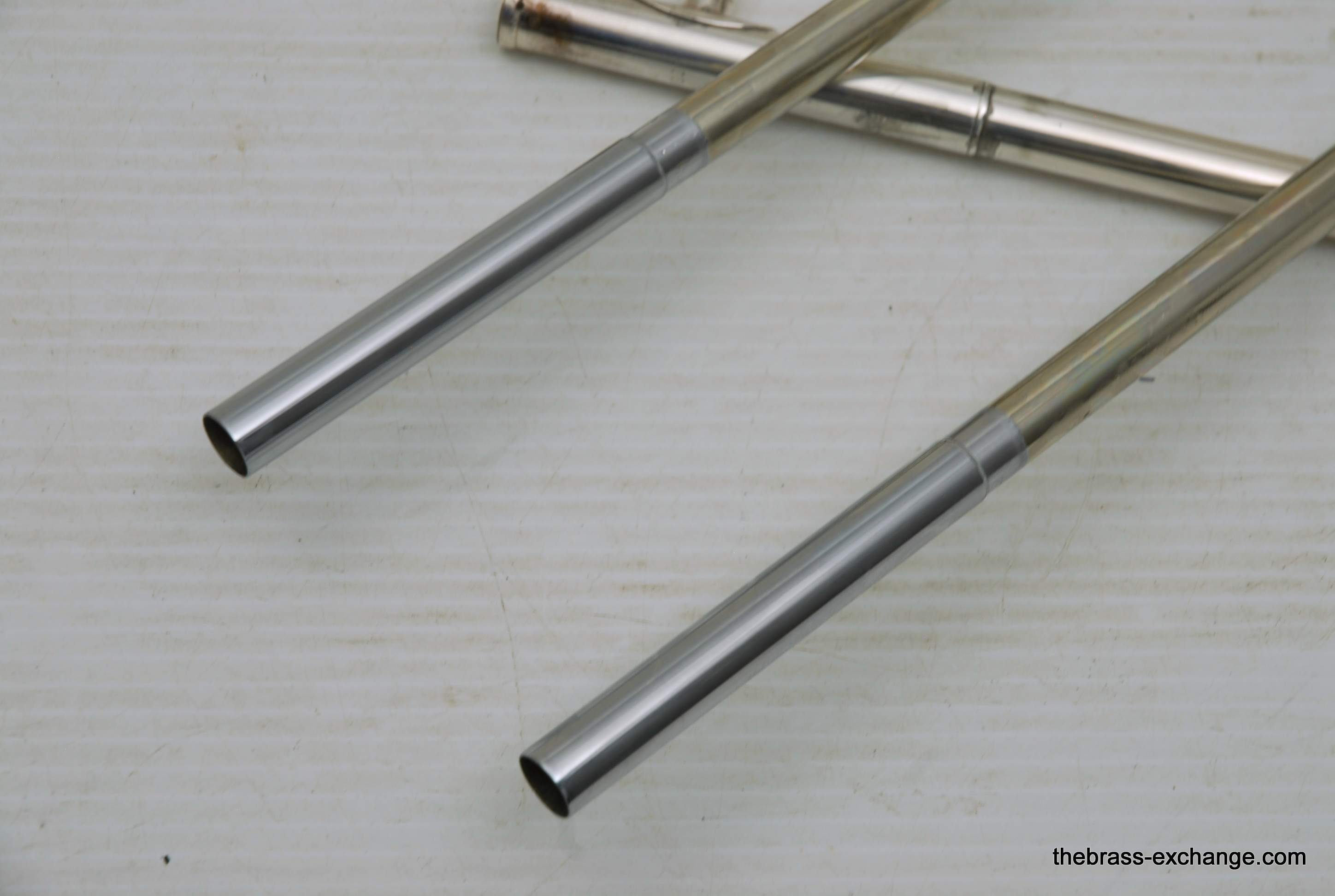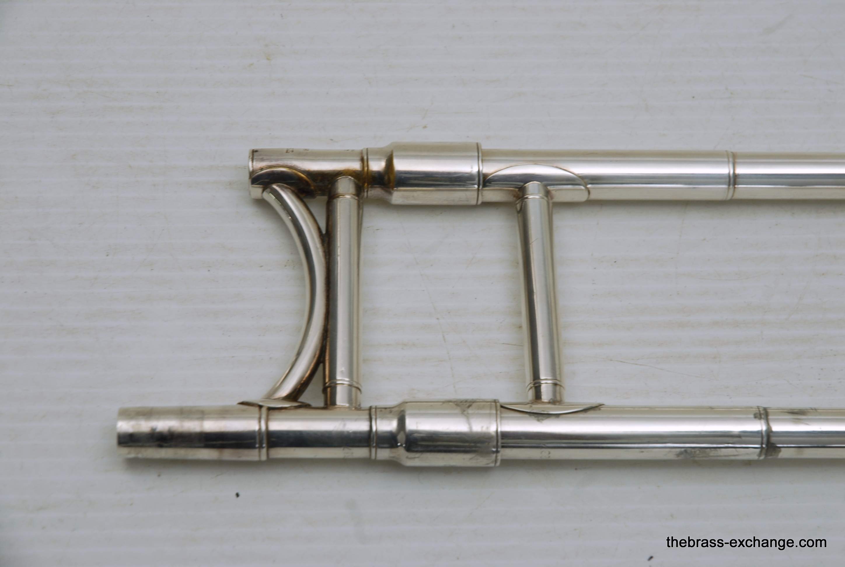 King Symphony Model. H.N. White Model from 1925-1930 SN 87337. Most likely 1926. Has 8" Bell Silver Plated with gold plated inner bell. Handslide bore is .508. Same exact specs as the popular 3B model. This is an early King. This is a super straight horn never damaged. Finish has had restoration. Crisp engraving. Interstingly, innner slide tubes at the stockings were nickel plated. Was a major improvement. We had our slide guy set this one up, the slide is flawless. is both a great playing horn and a King collectible. They did not put slide locks on this model. It is also a friction fit connection between slide and bell receiver, this very common on old trombones. On the mouthpiece reciever it is stamped low pitch, near the lion head, this tunes at A440. It is a very nice playing vintage King. Yes you can take it to a gig today and sound fantastic. These were most likely used in Orchestras, Radio Shows, Night Club Orchestras, back in the day. Takes standard small shank mouthpiece. A standard Bach mouthpiece works perfectly today. Overall, it's a super nice vintage King, and clean as a can be, no dents or dings, no signs of major repair, it's a fantastic representation of what H.N. White was doing nearly 100 years ago. The best part is that is still 100% playable today. Original case in worn condition. Mouthpiece not included. In-stock for immediate delivery.