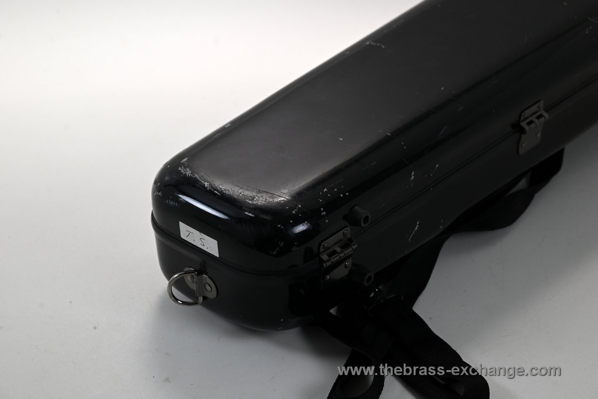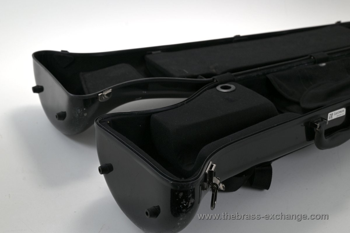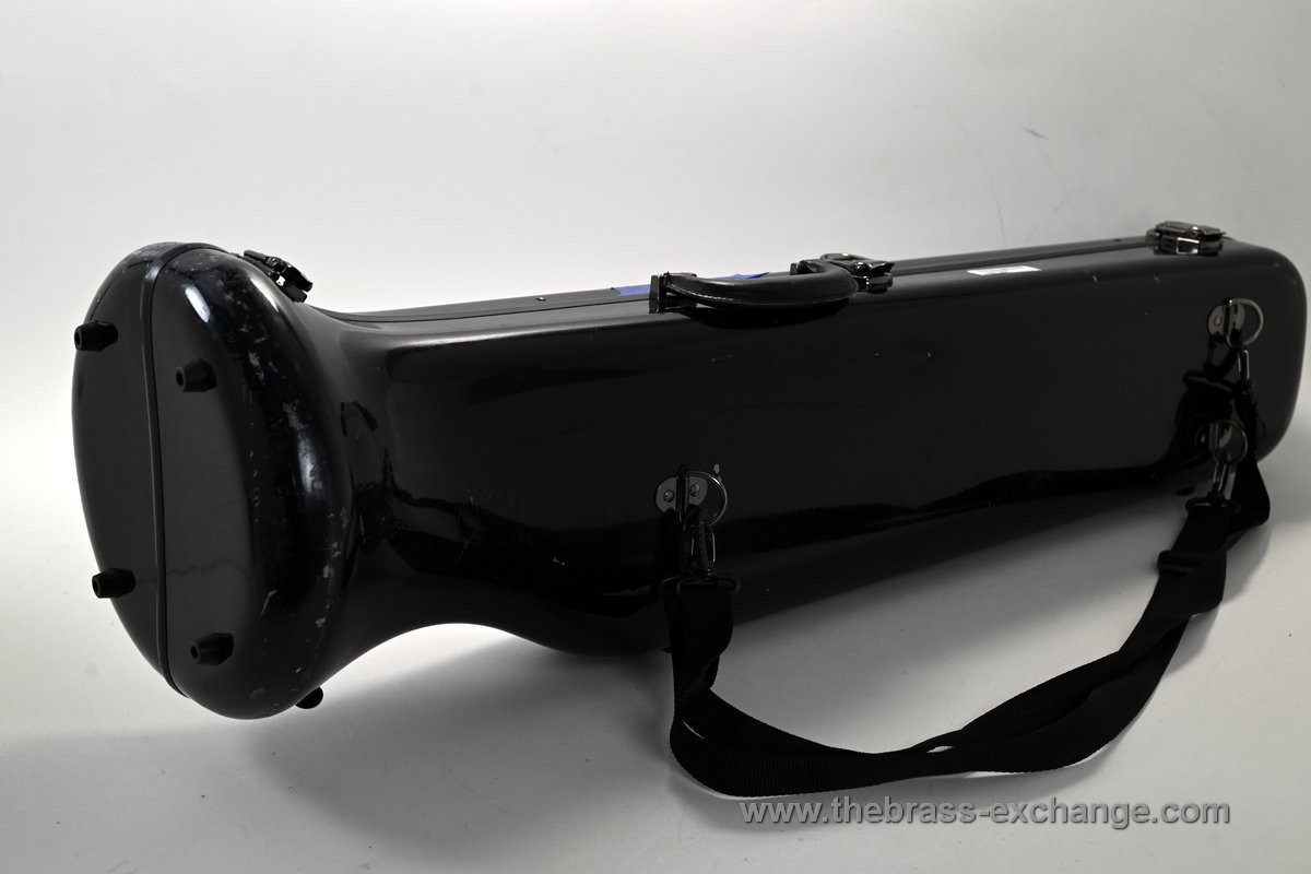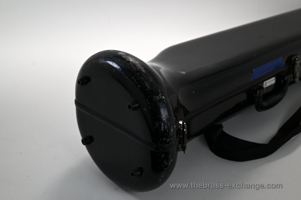 This Eastman fiberglass tenor trombone case is a pre-owned example of a discontinued model. Built with a rigid fiberglass shell, it provides reliable protection while remaining lighter than many hard wooden cases. The Eastman design offers a snug interior fit for a standard tenor trombone and includes storage space for a mouthpiece and small accessories.