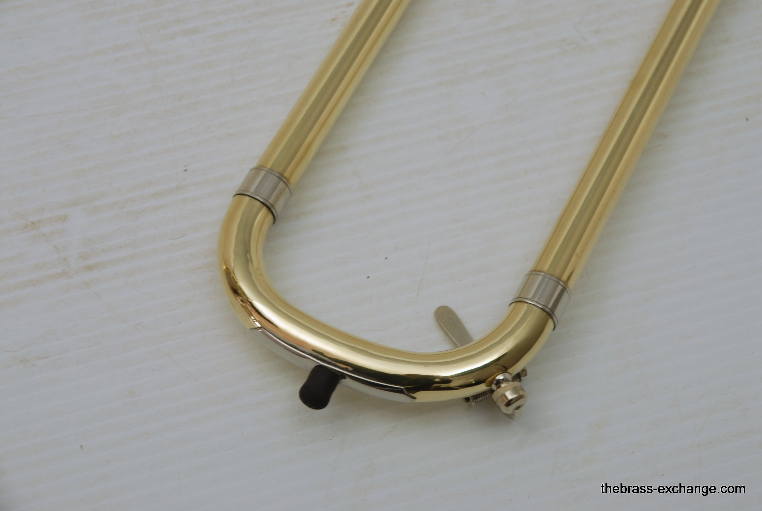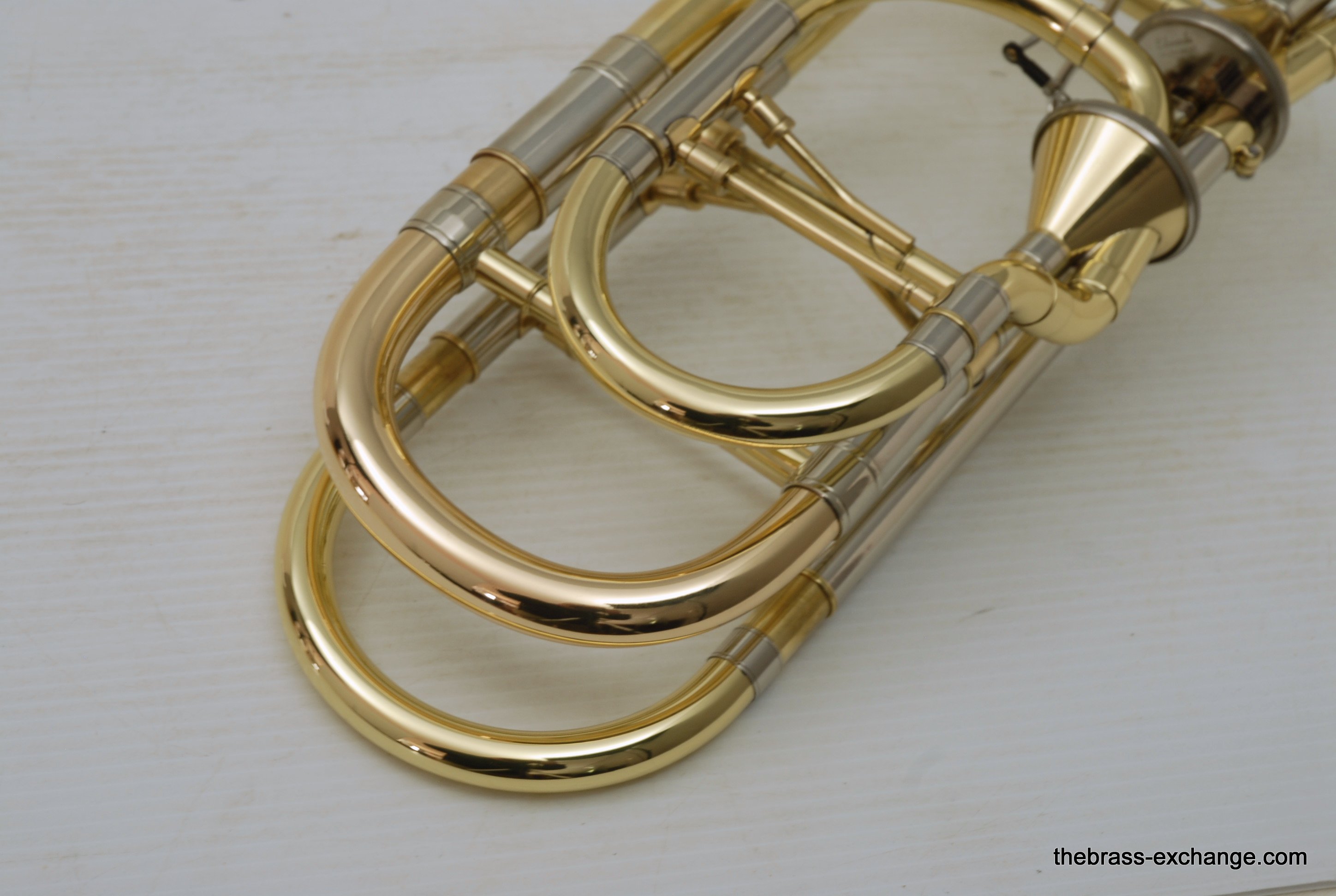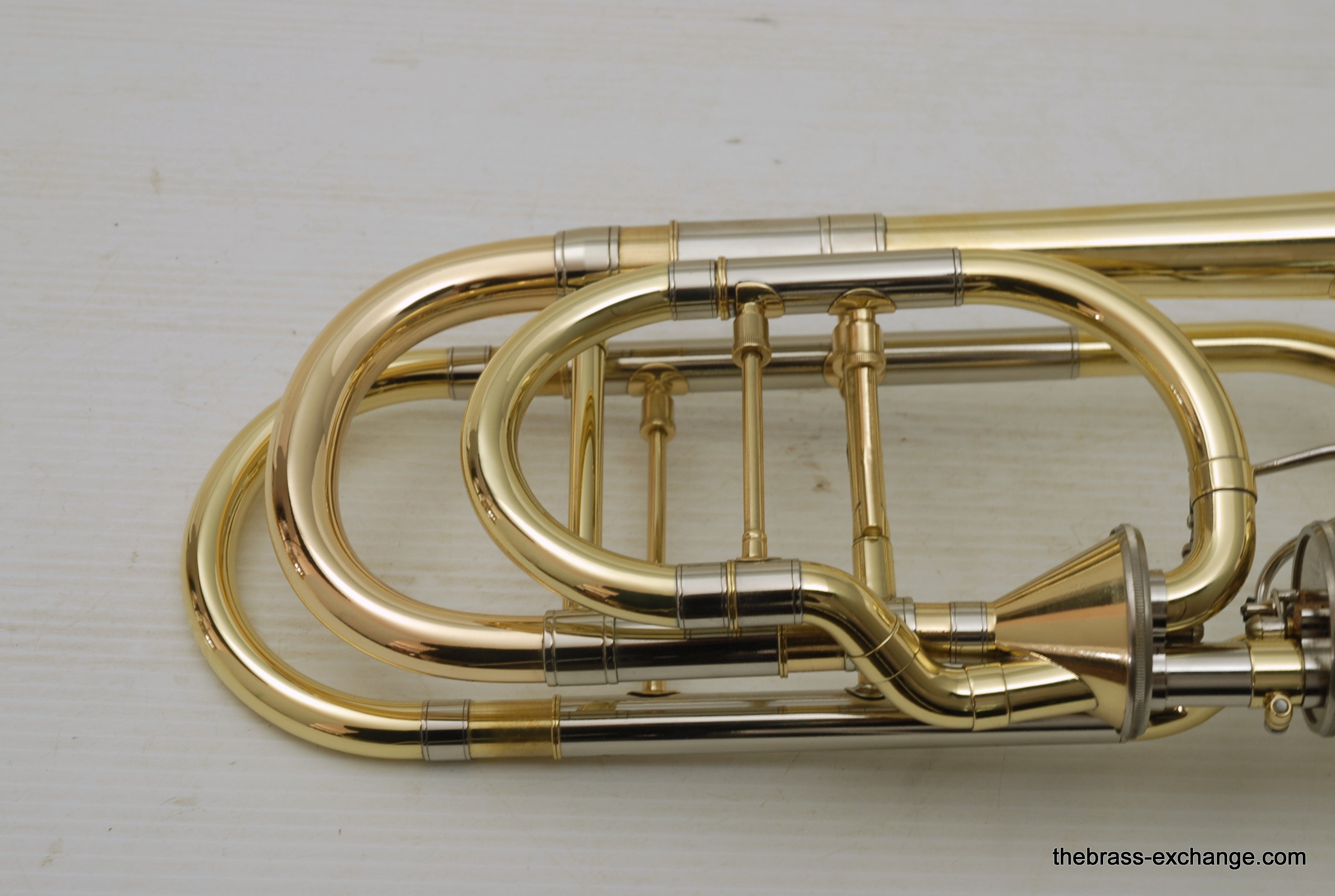 Edwards Custom Bass Trombone. Has independent Axial Flow Valves Bb/F/G/Eb tuning.  Bell section is 9,5" Yellow Brass 1239CF with detachable flare. Handslide is lighweight brass Edwards dual bore .562/5.578.  Plays big and open.   Includes compact travel case, about the size of a viola case, perfect for travel and pro players on the road. This Pre-owned instrument has had full restoration. Full shop service including new lacquer finish on the valve section and all tuning slides. Bell and handslide are unlacquered.  Valve action is perfect, handslide is excellent, inludes 3 removable Edwards leadpipes included. In Stock for immediate delivery.