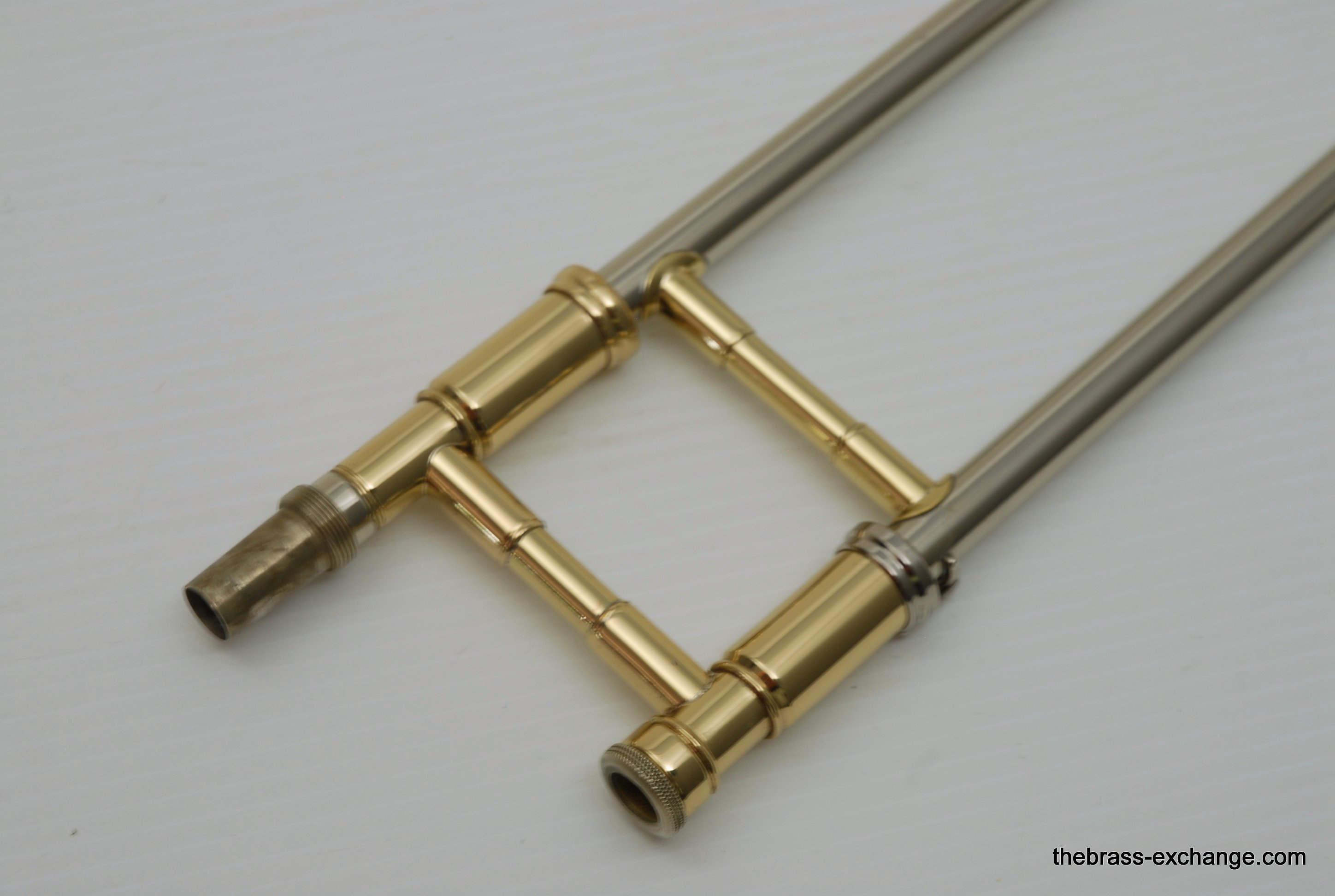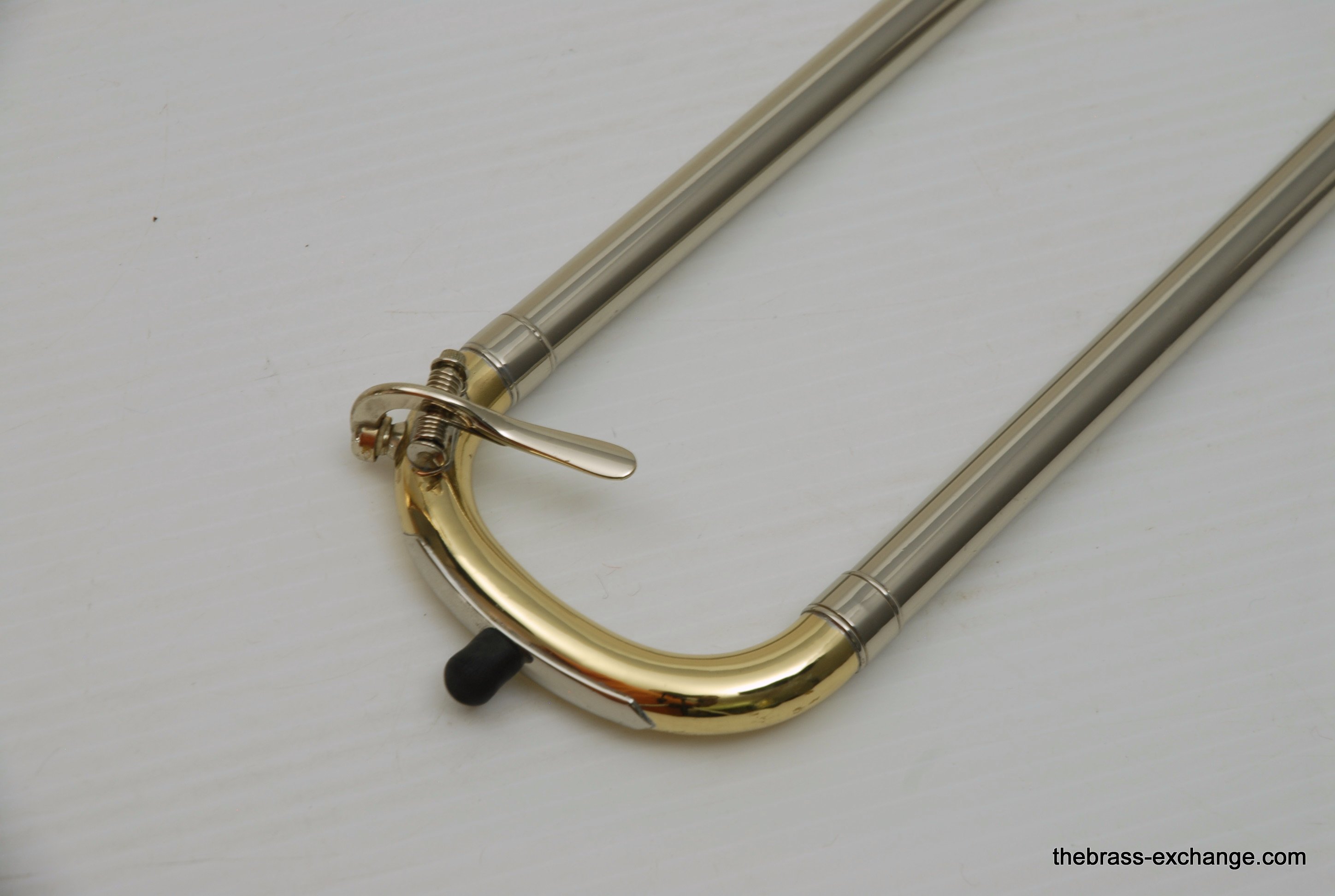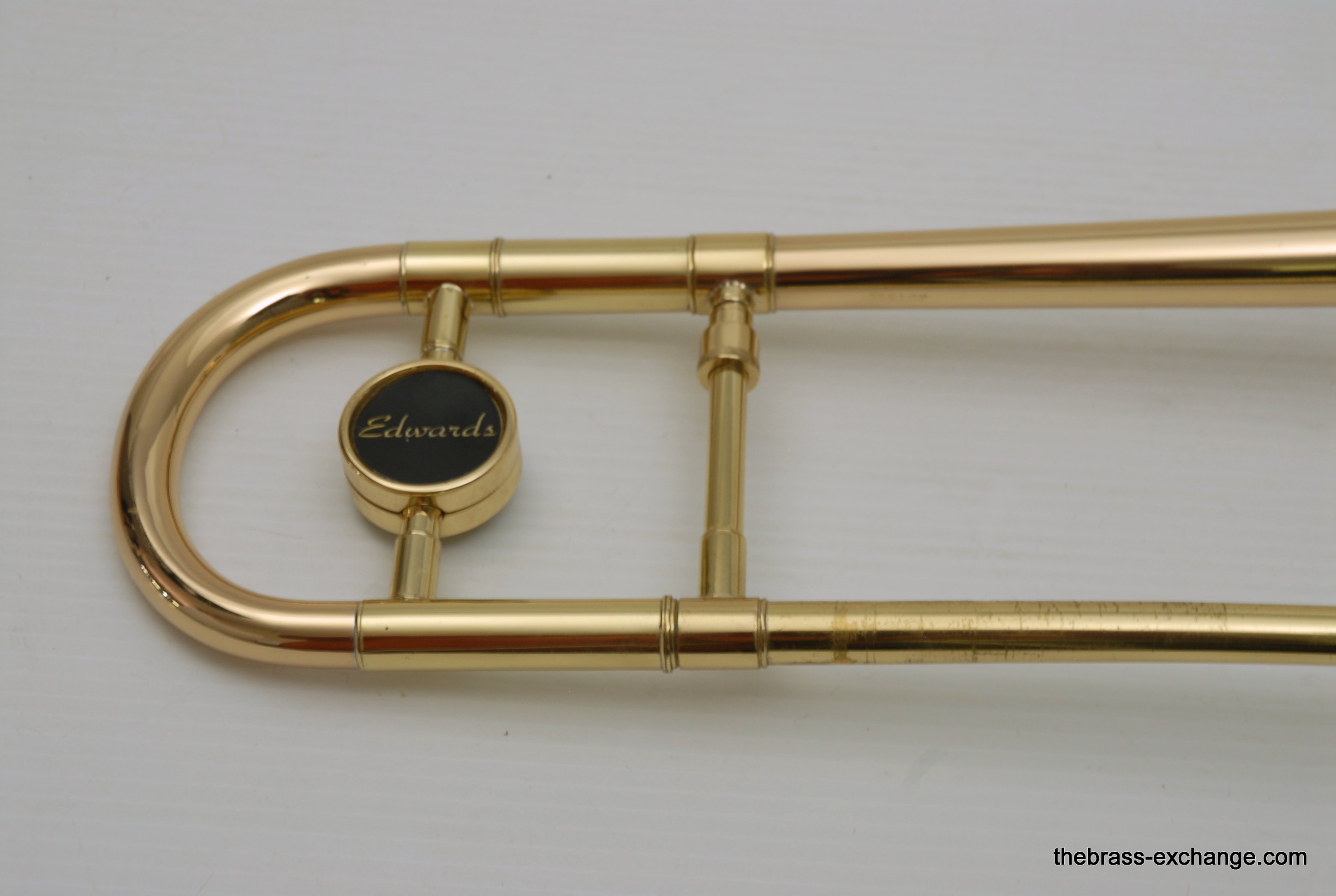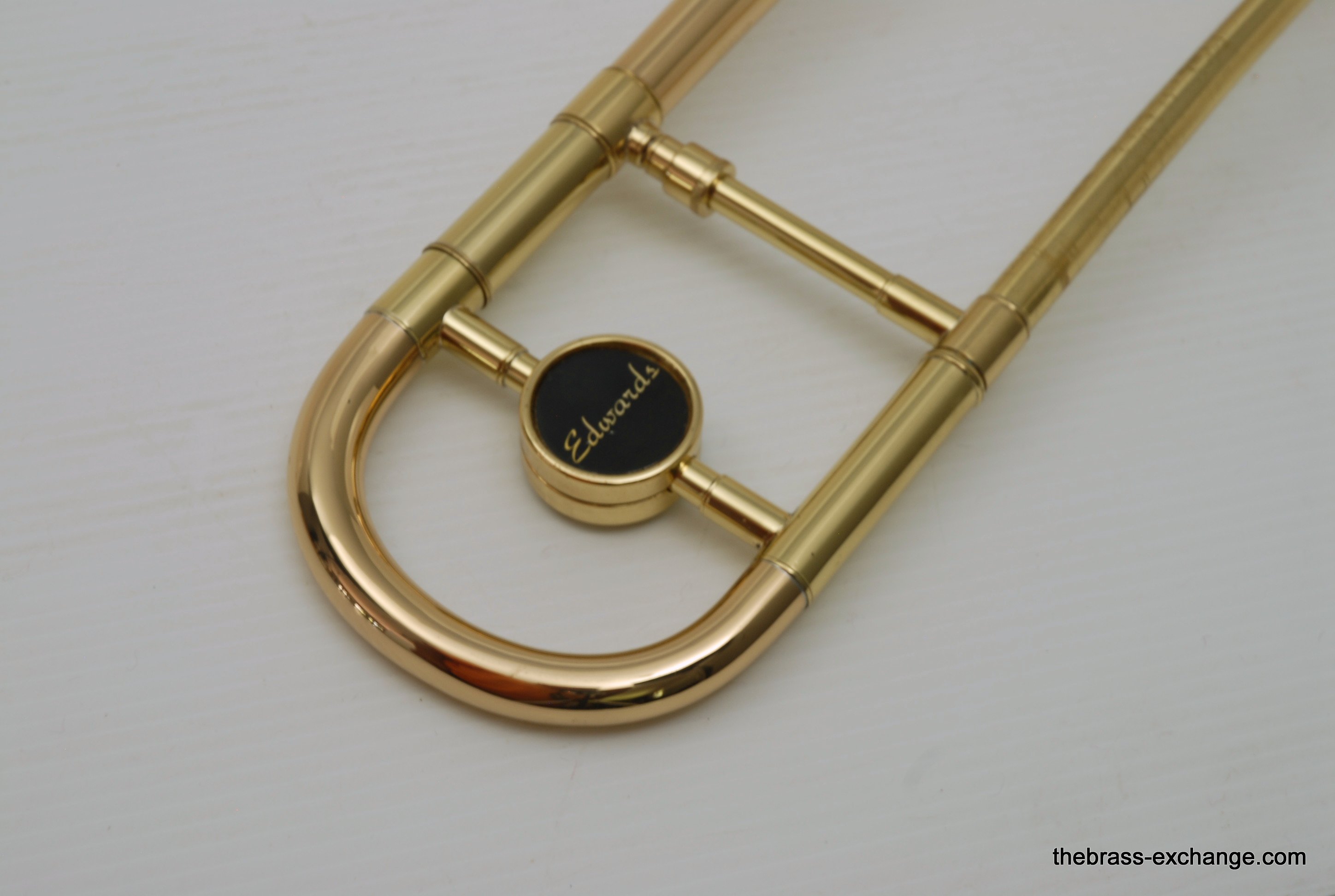 Edwards T302 .500 Bore Jazz Trombone. Has 9191CF Gold brass Bell with LT Nickel Silver Handslide, Yellow Brass Endcrook. This is a gently used custom Edwards, made in Elkhorn, WI. Bell diameter is slightly under 8", but not quite 7.75, is in between. The entire instrument is in excellent condition, never any damage or repairs. A few minor mute dings as pictured, will come out prior to delivery. Handlside has fresh pro set-up, no tension, as smooth as it gets. Would be an excellent lead/jazz horn for any level player. Comes with a protec case, 2 removable leadpipes.