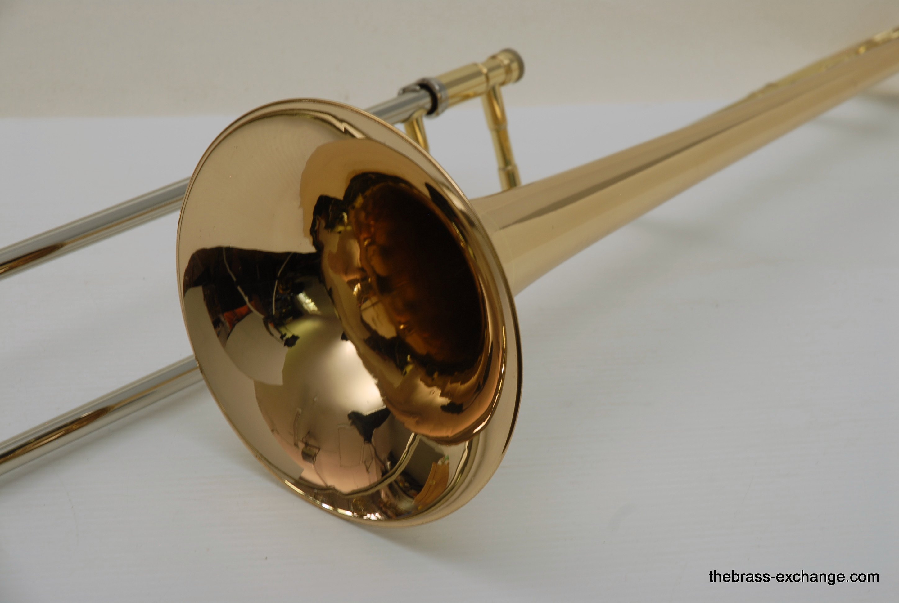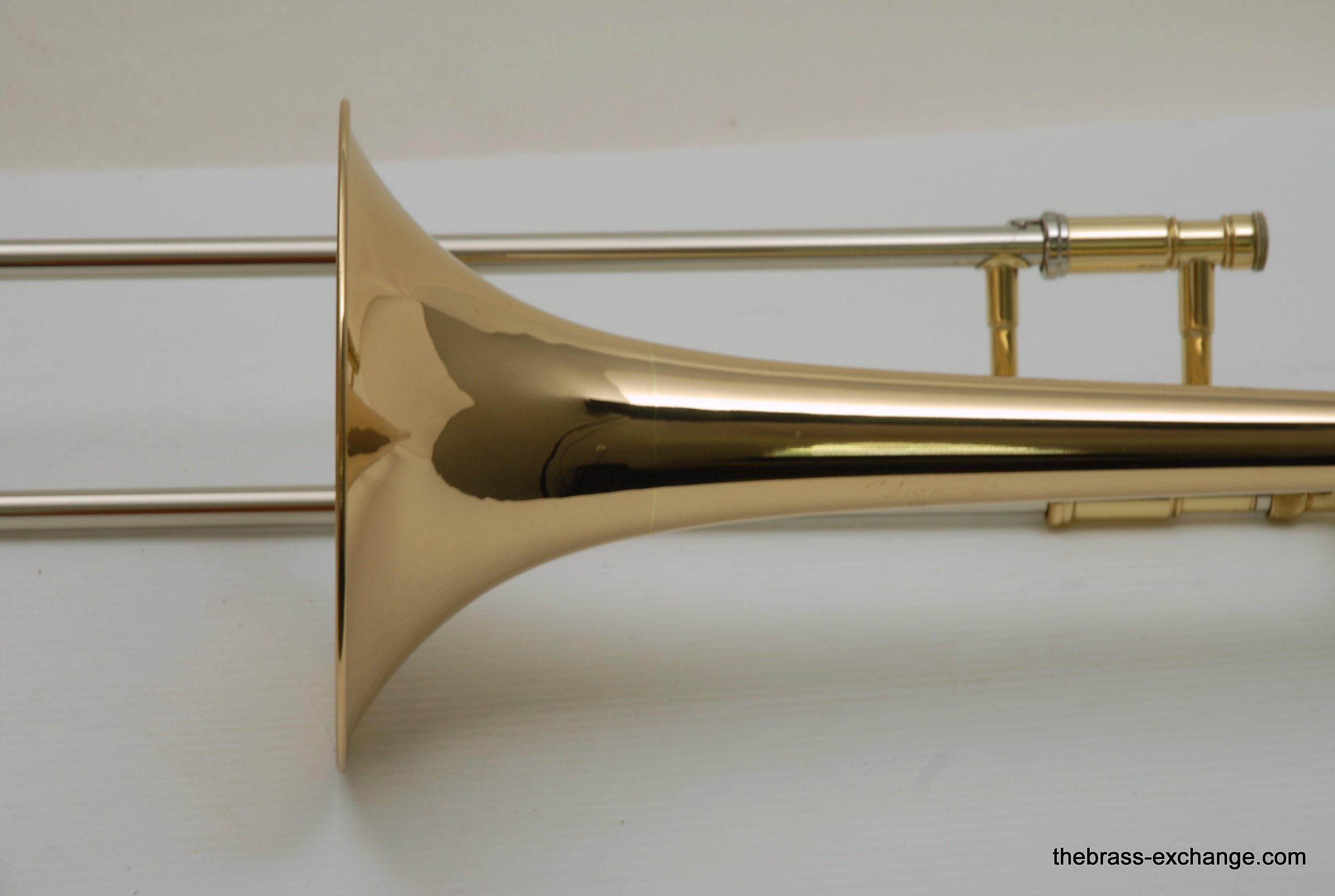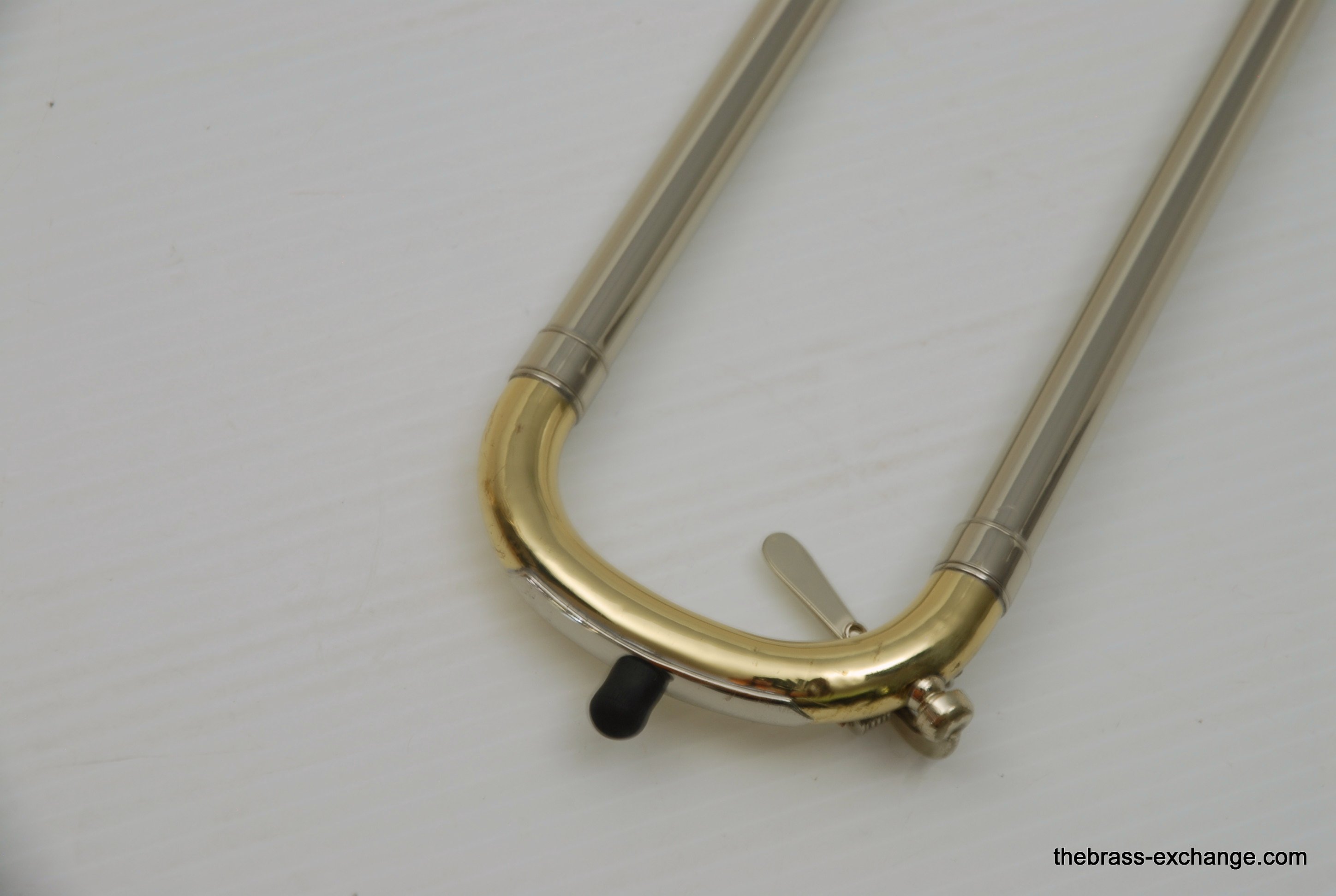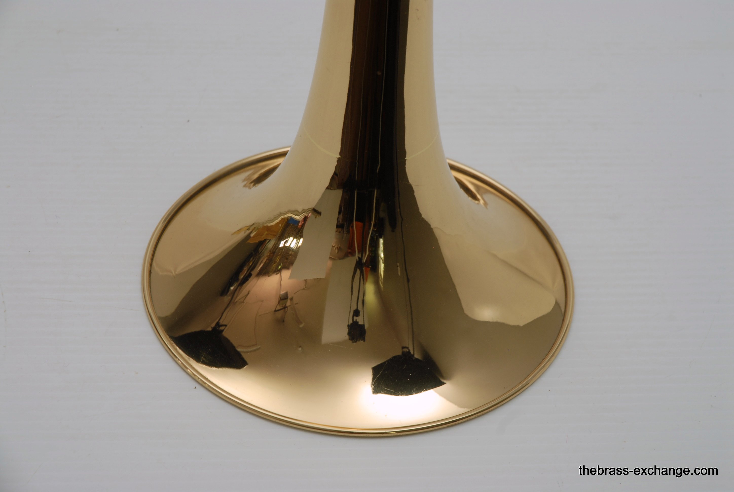 Edwards T302 .500 Bore Jazz Trombone. Has 9191CF Gold brass Bell with LT Nickel Silver Handslide, Yellow Brass Endcrook. This is a gently used custom Edwards, made in Elkhorn, WI. Bell diameter is slightly under 8", but not quite 7.75, is in between. The entire instrument is in excellent condition, never any damage or repairs. A few minor mute dings as pictured, will come out prior to delivery. Handlside has fresh pro set-up, no tension, as smooth as it gets. Would be an excellent lead/jazz horn for any level player. Comes with a protec case, 2 removable leadpipes.