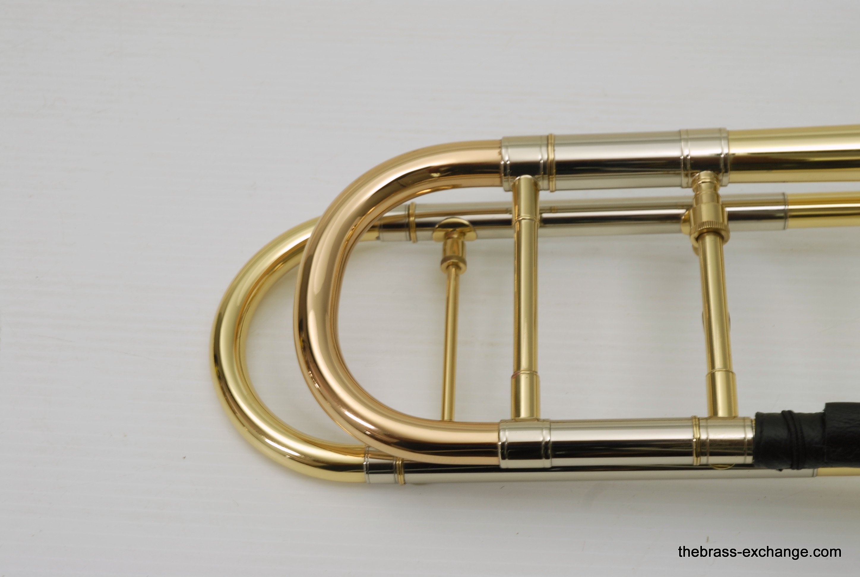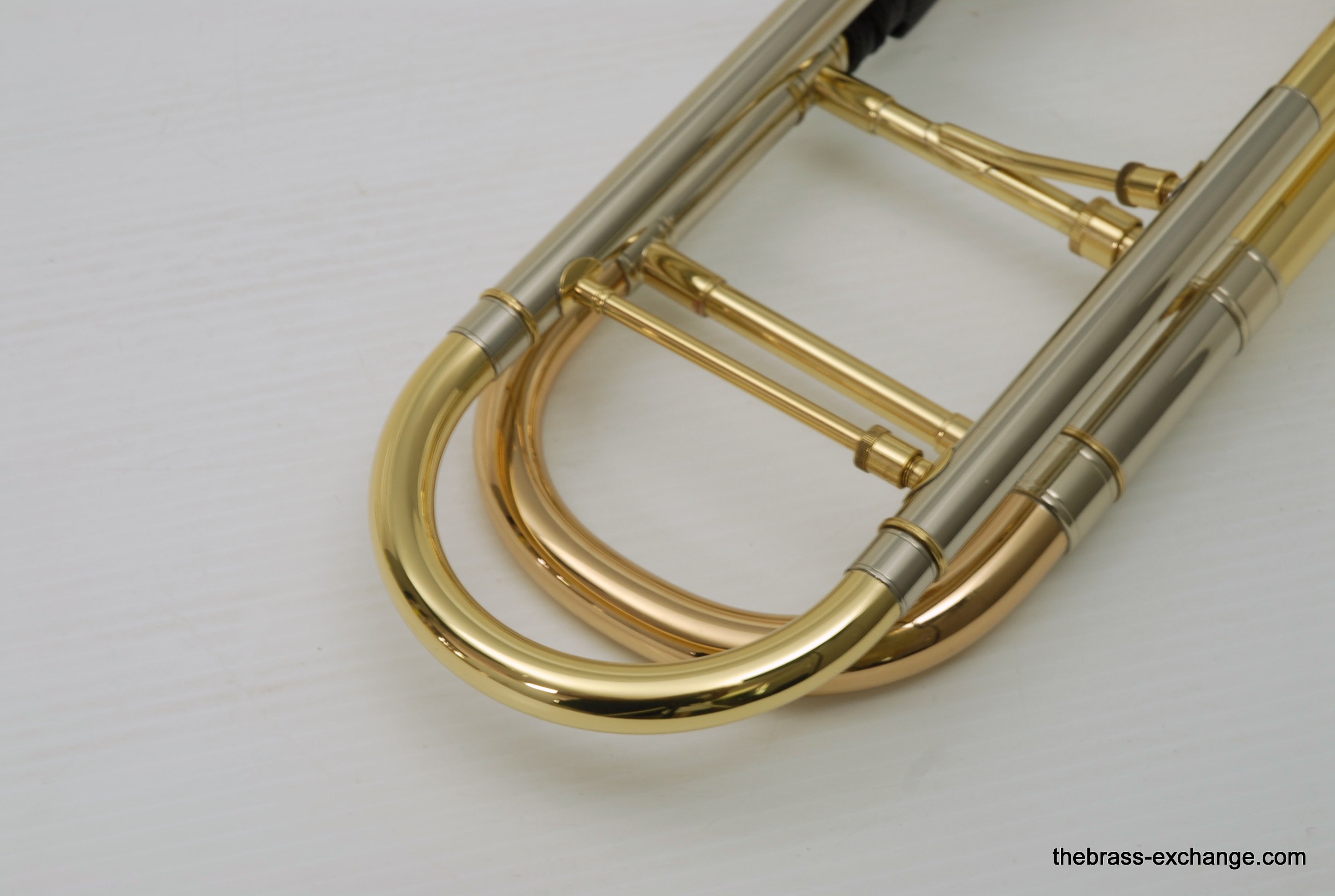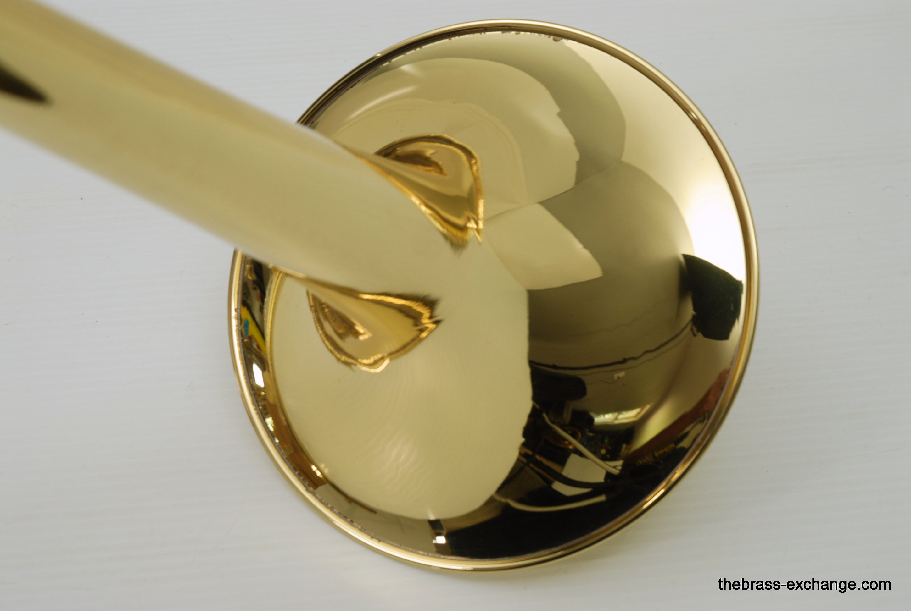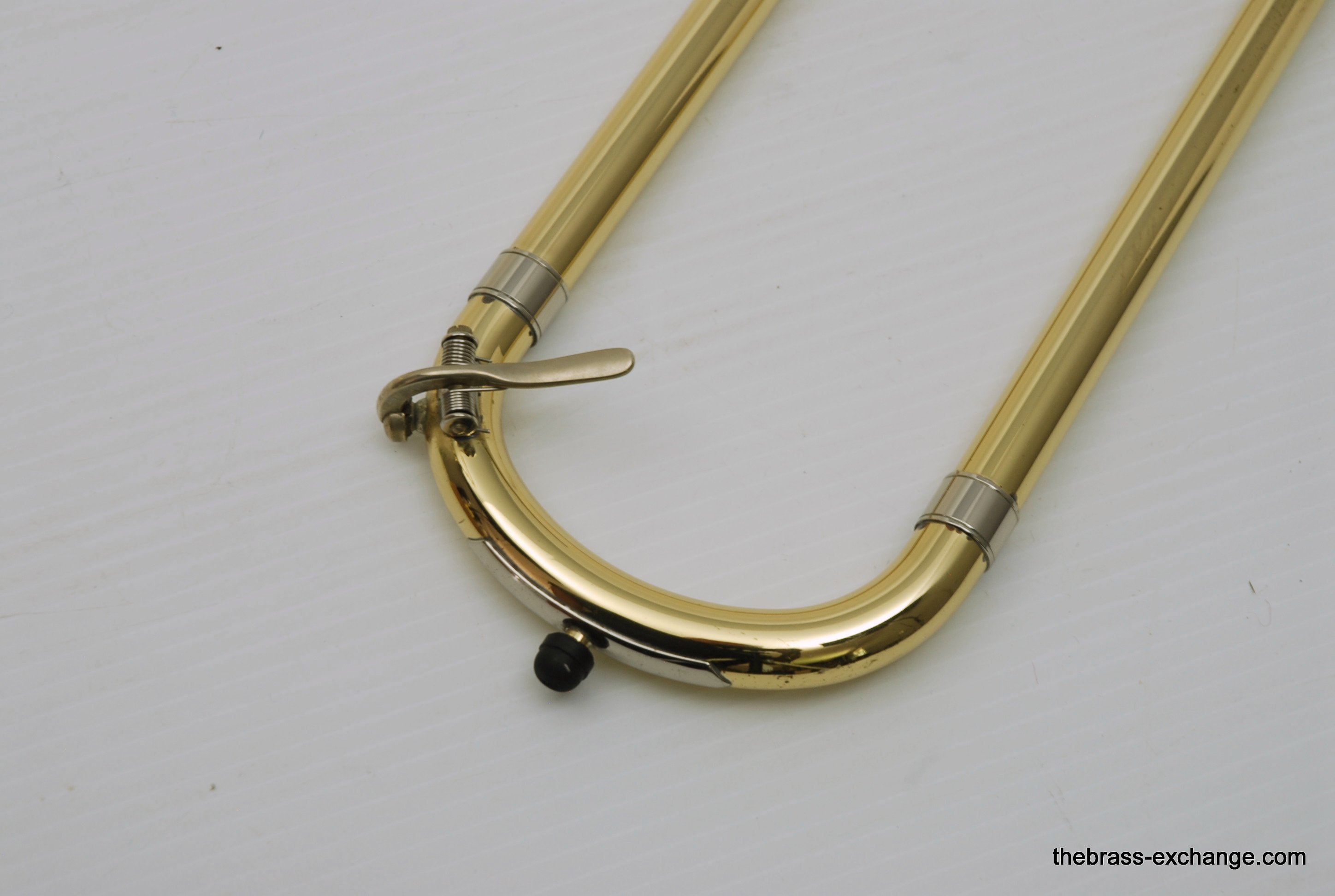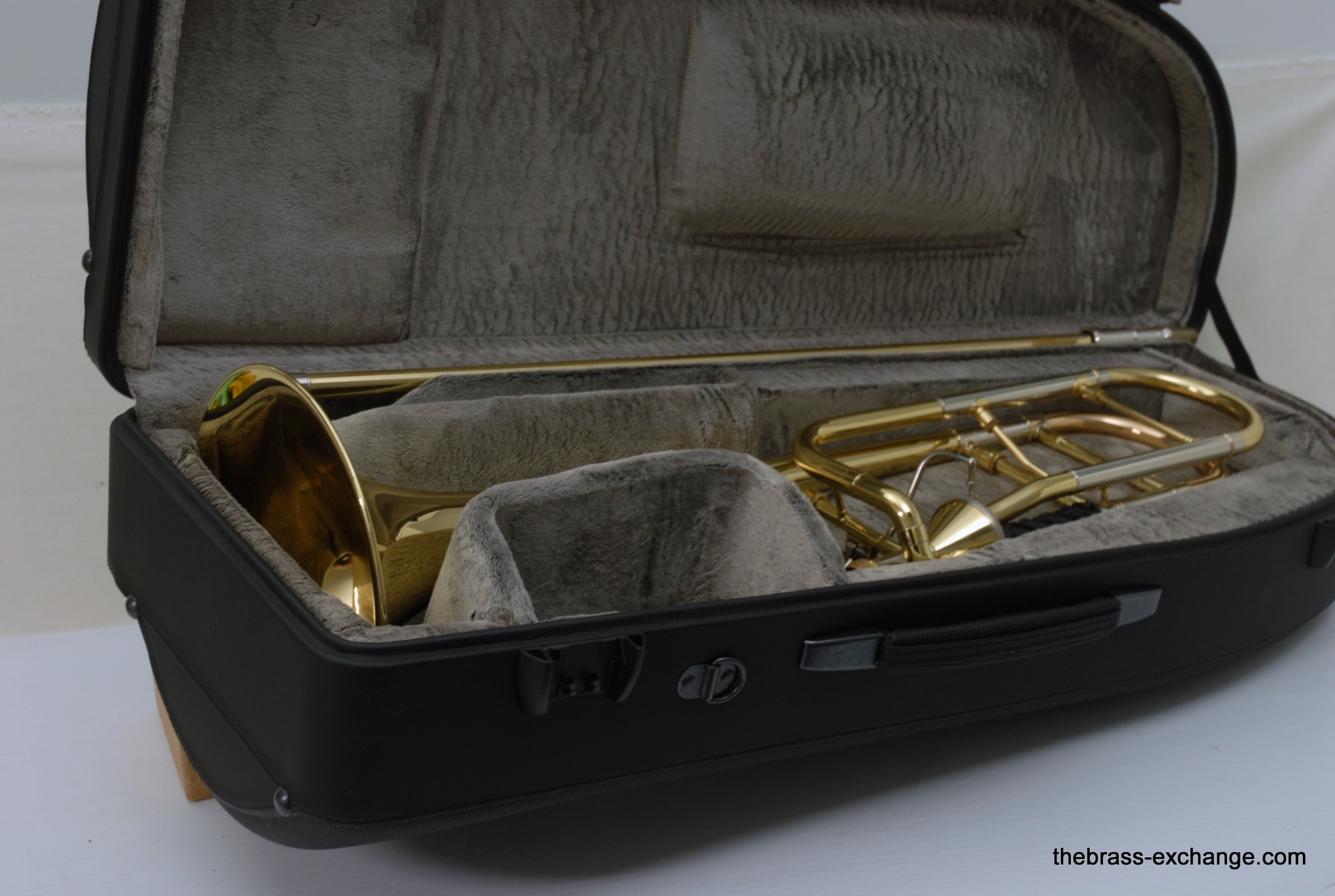 Edwards T350E Custom Large Bore Tenor with Axial Flow. Has 384CF Lightweight yellow brass bell 8.5", gold brass tuning slide, and standard .547 T-STD Lightweight brass handslide with brass endcrook. This is a lightly used custom factory order, single owner in perfect playing condition. Never any damage or repairs. Minimal lacquer wear. Minimal acid blead around the bell rim.  No dents or dings. Handslide and valve action are perfect. Comes with 2 removable leadpipes, one of which is an M&K nickel silver pipe. The 384CF bell is lighweight and responsive, solderd bead wire, tempered alloy, double buffed. Definitely one of the most popular Edwards Bells. It is a fantastic player, overall a great horn. The best part is that you don't have to travel to the Edwards factory for this one, it's in stock for immediate shipping. Includes a new Marco Magi Black Leather Case, The outer Panels are BN material, rugged, durable, original use- motorcycle seats. Maximum scuff and shock resistant. Case includes removable back back straps, which are very comfortable and made to last. Would be an excellent choice for any pro level player or student going away to college. In-stock for immediate delivery.