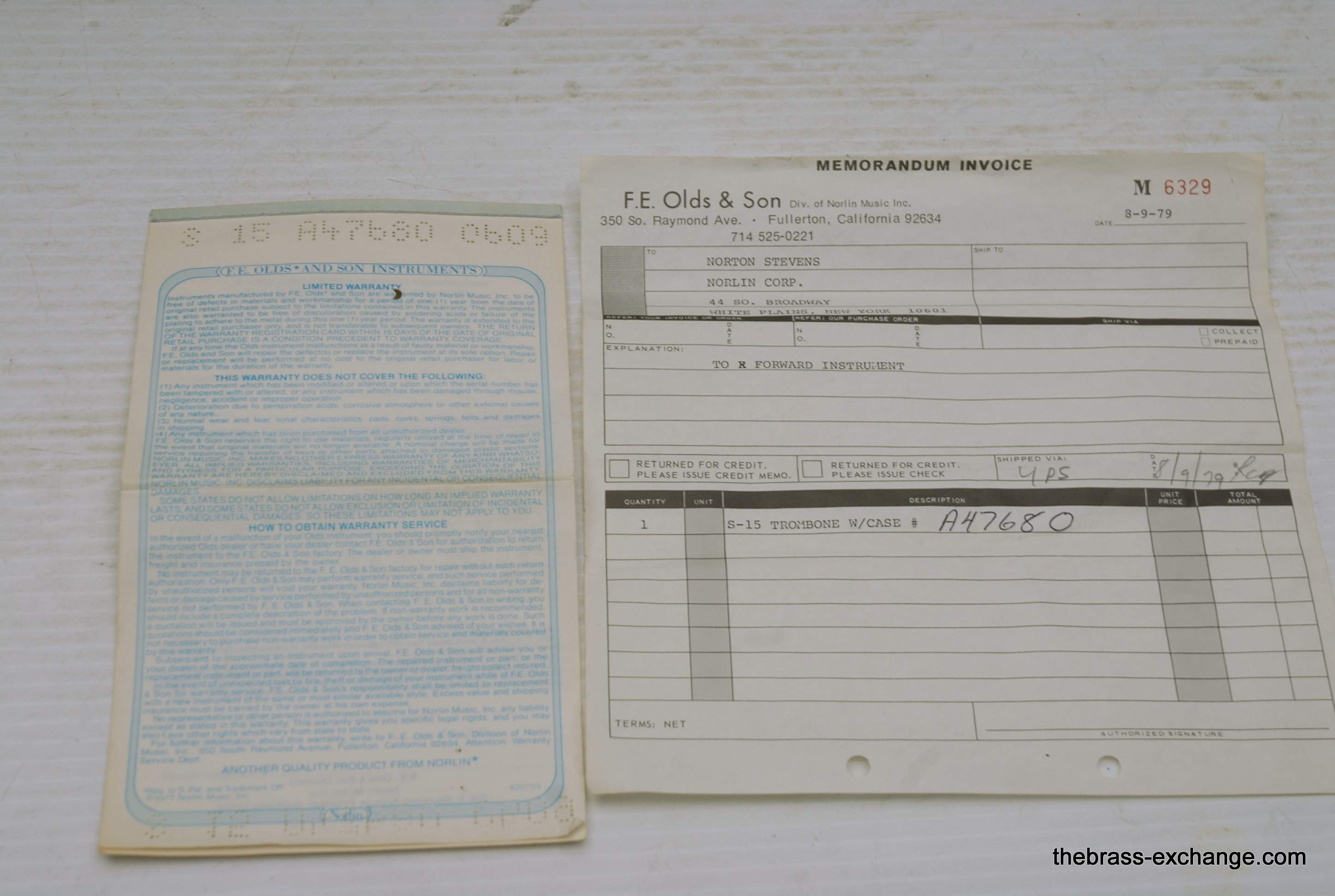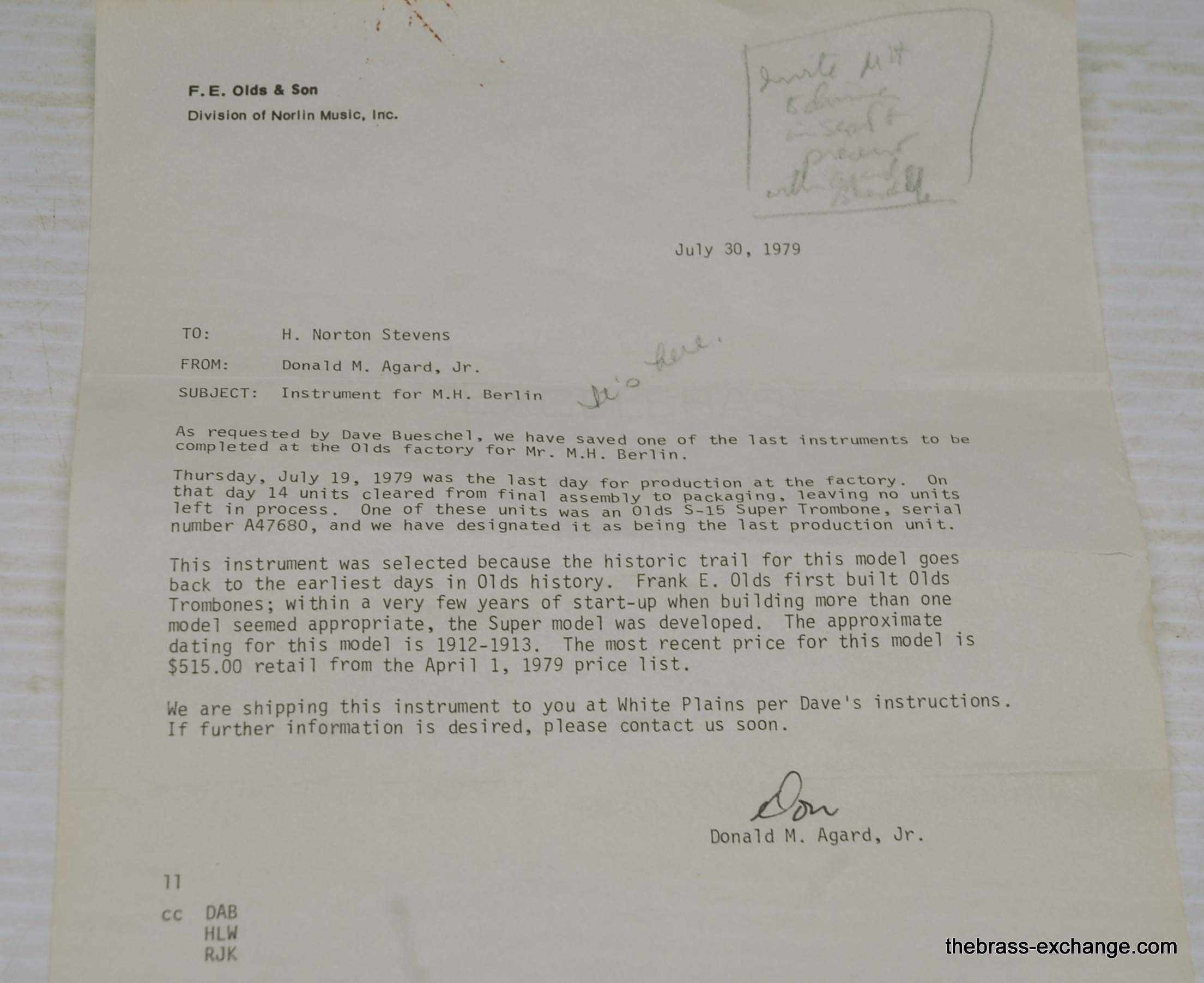 The trombone comes with original paperwork and a letter from Donald Agard, Director of Operations, officially confirming its status as the last instrument manufactured by the company. This letter stands as a remarkable piece of American brass instrument history.