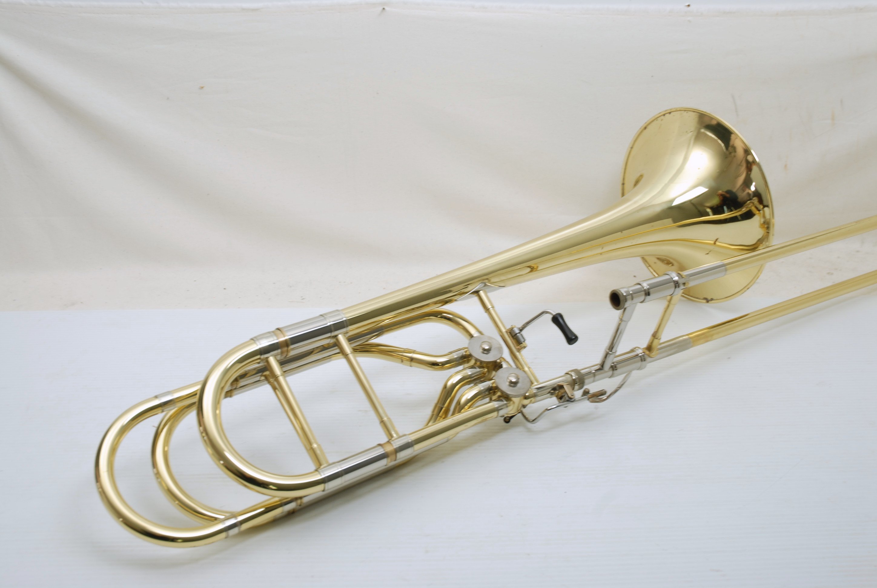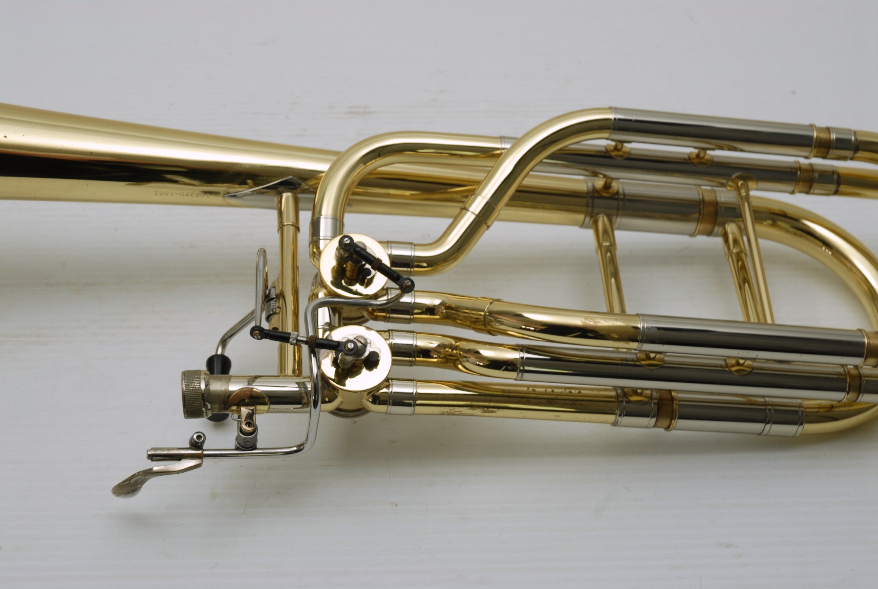 Getzen 1062 Bass Trombone, Dependent Rotor Configuration in standard F/Gb/D tuning. Features a 9.5" Yellow Brass Bell with original factory lacquer. This horn is in great condition and has been fully serviced in our shop, including a deep chemical cleaning, precision alignment, and performance check. The handslide is in very good condition, with smooth action and great alignment—ready to play right out of the case. Comes with one removable leadpipe.
