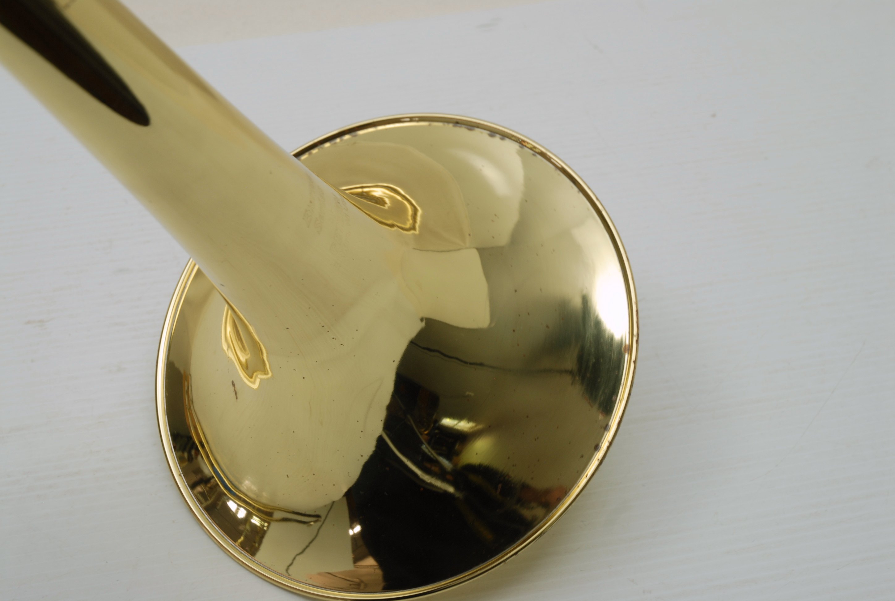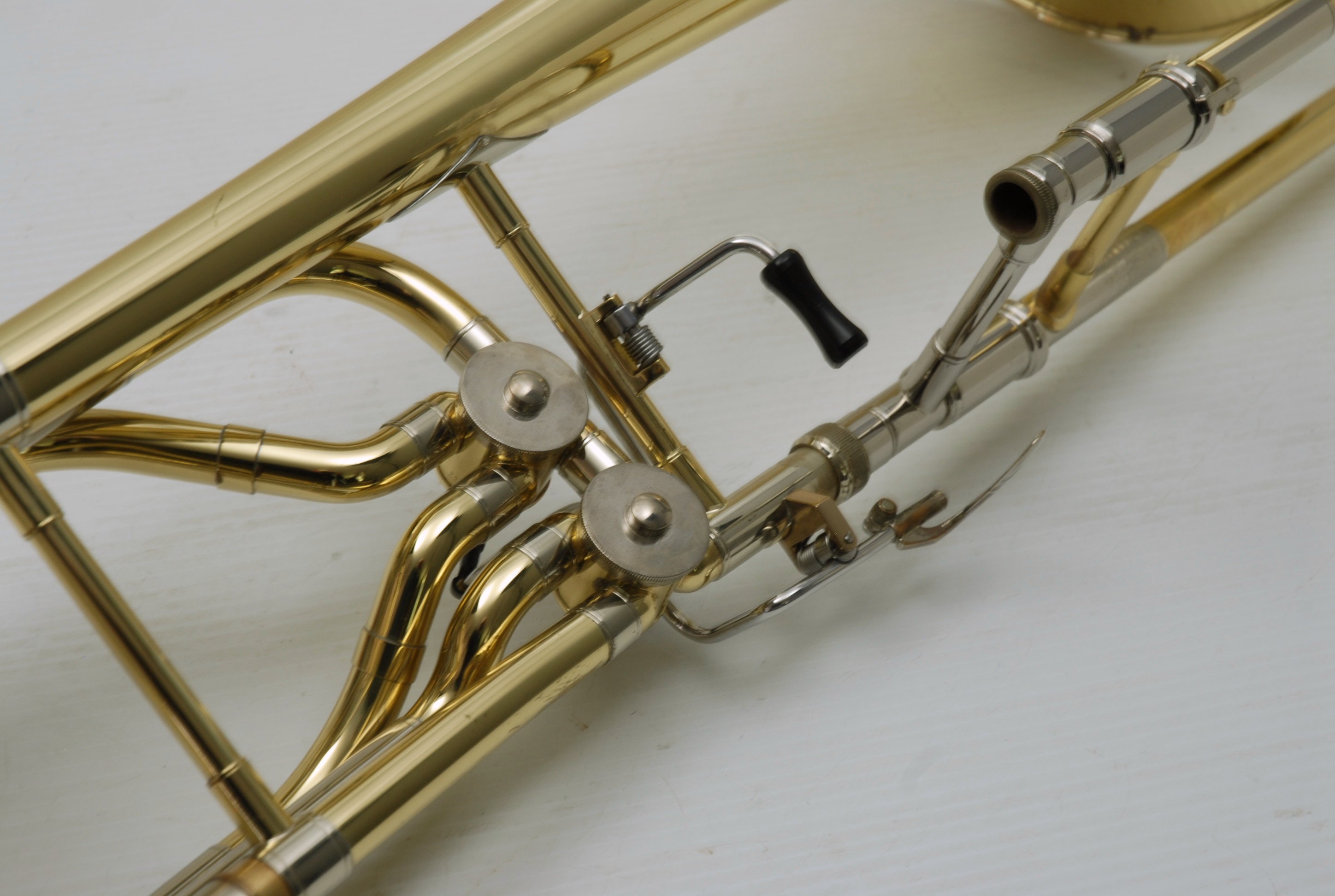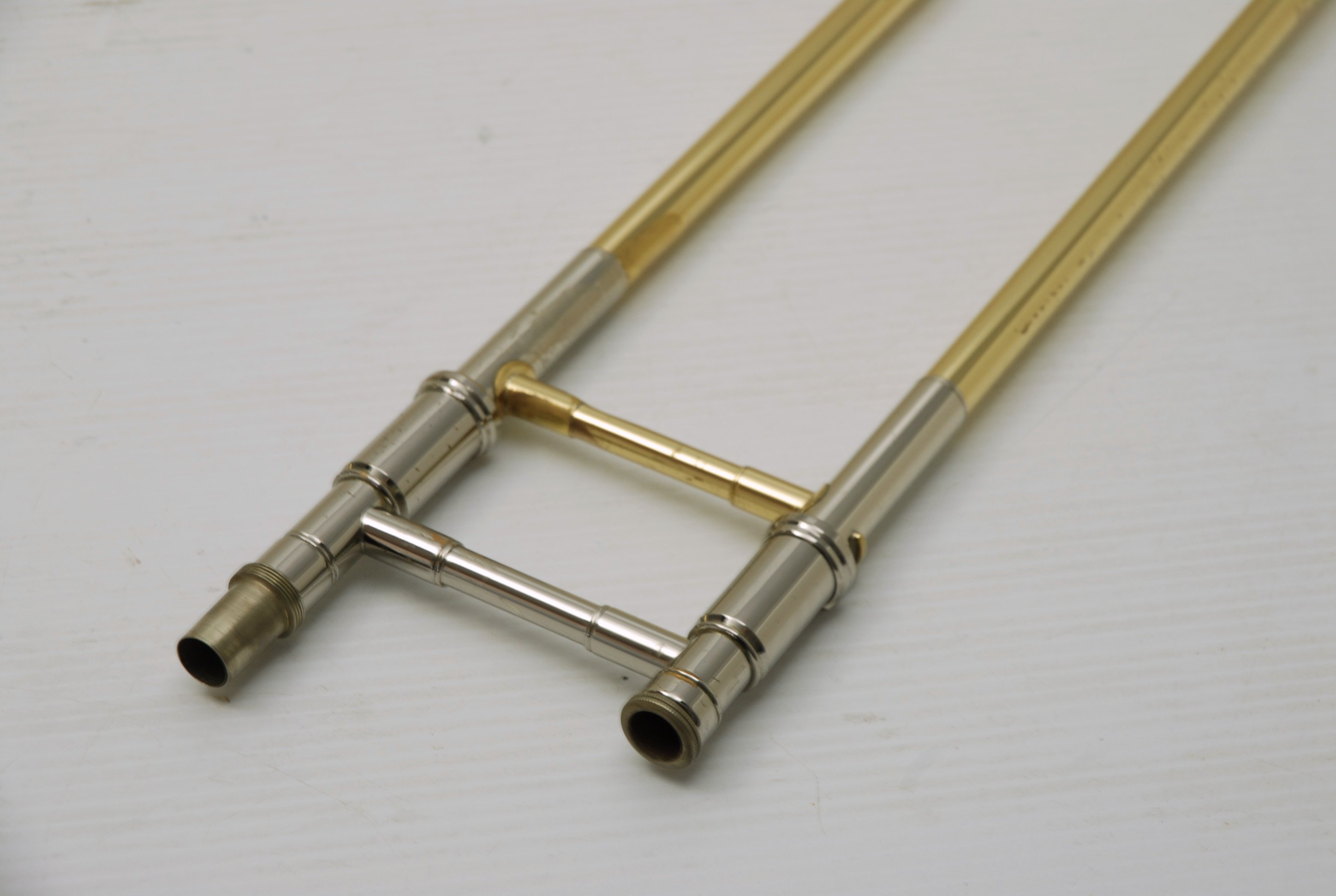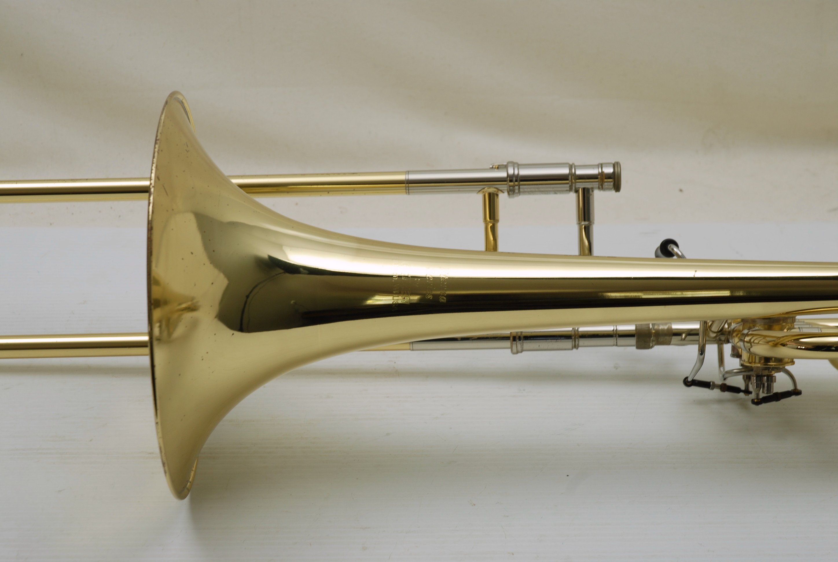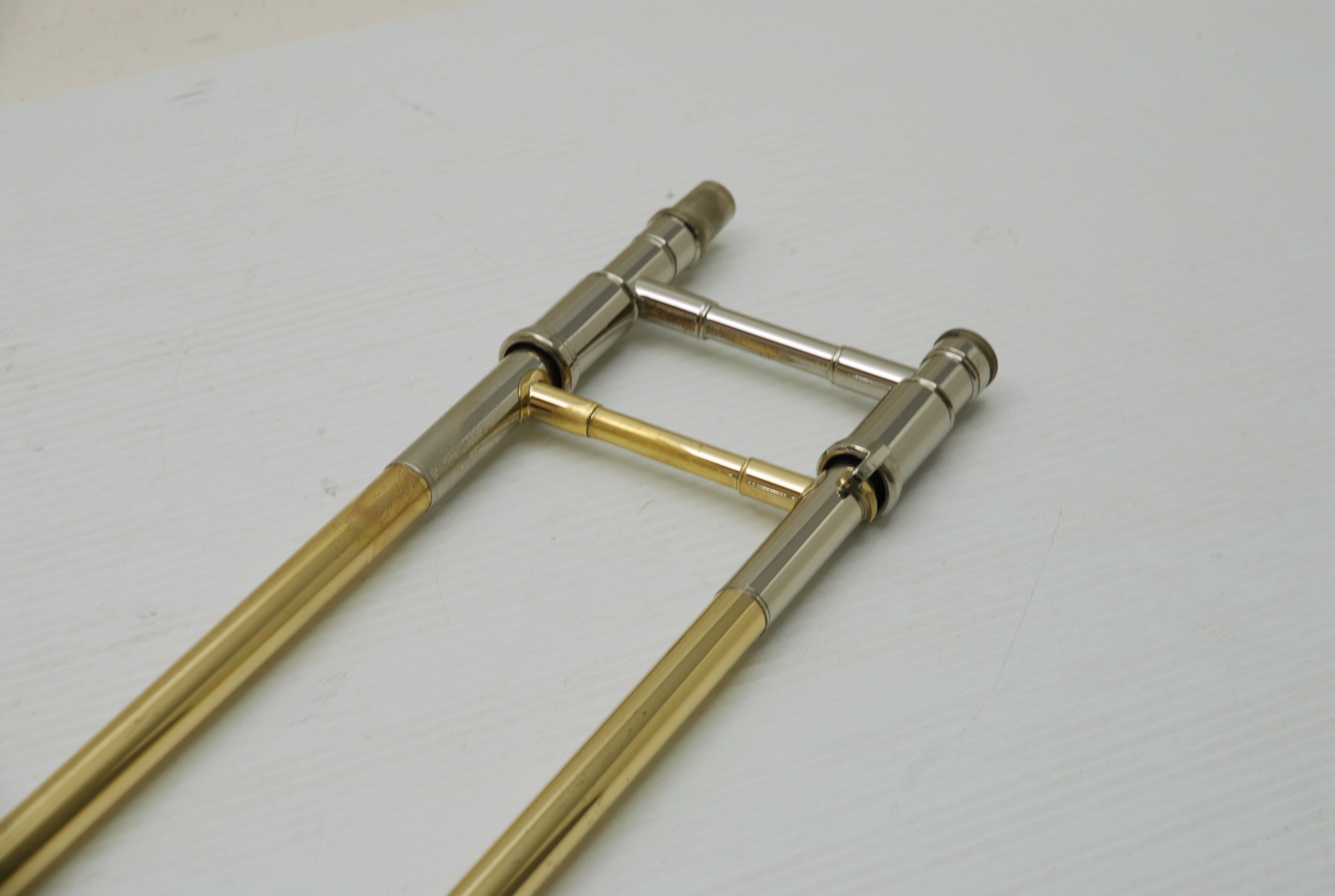 This is an ideal first bass trombone for an advancing student, college player, or even a doubler looking to explore bass. Getzen's 1062 series is known for solid build quality, consistent performance, and reliable valve action. The dependent rotor setup keeps things more traditional and compact, which some players prefer for balance and weight. The bell section had a previous dent that was expertly removed—so well, in fact, that we took another close look and can confidently say there’s no room left for improvement.