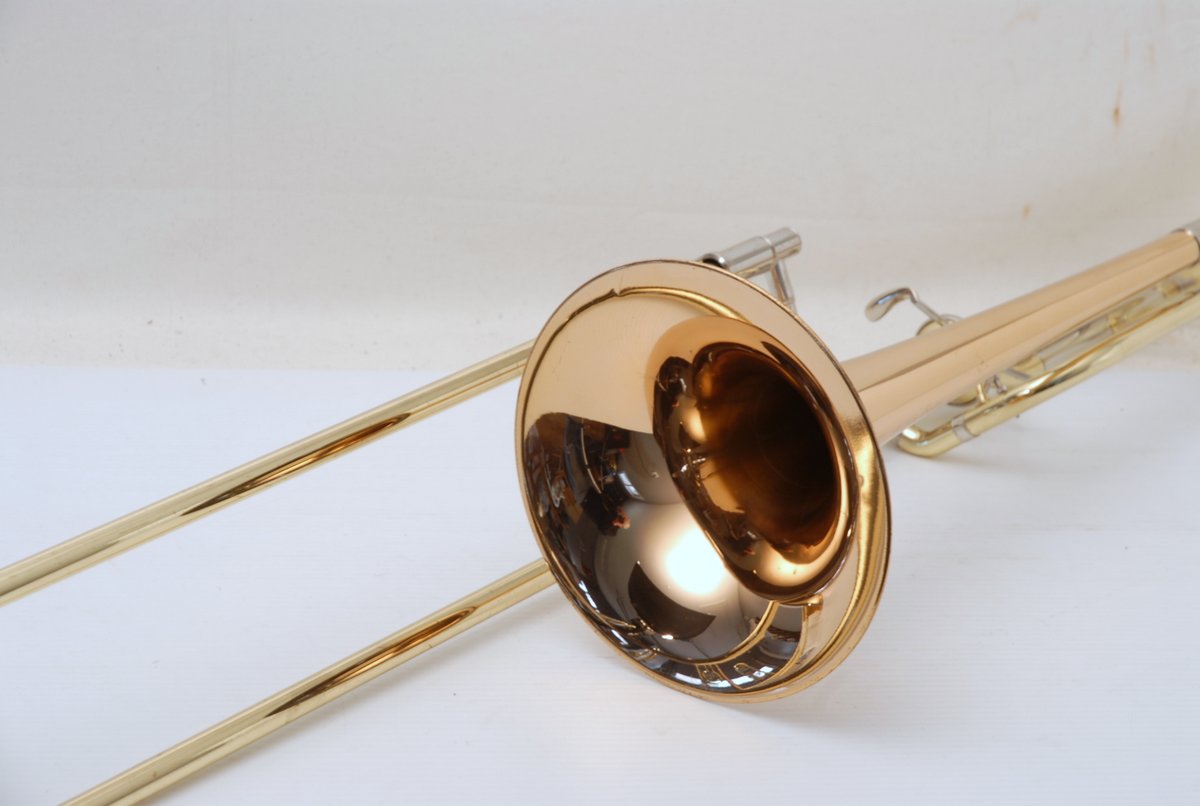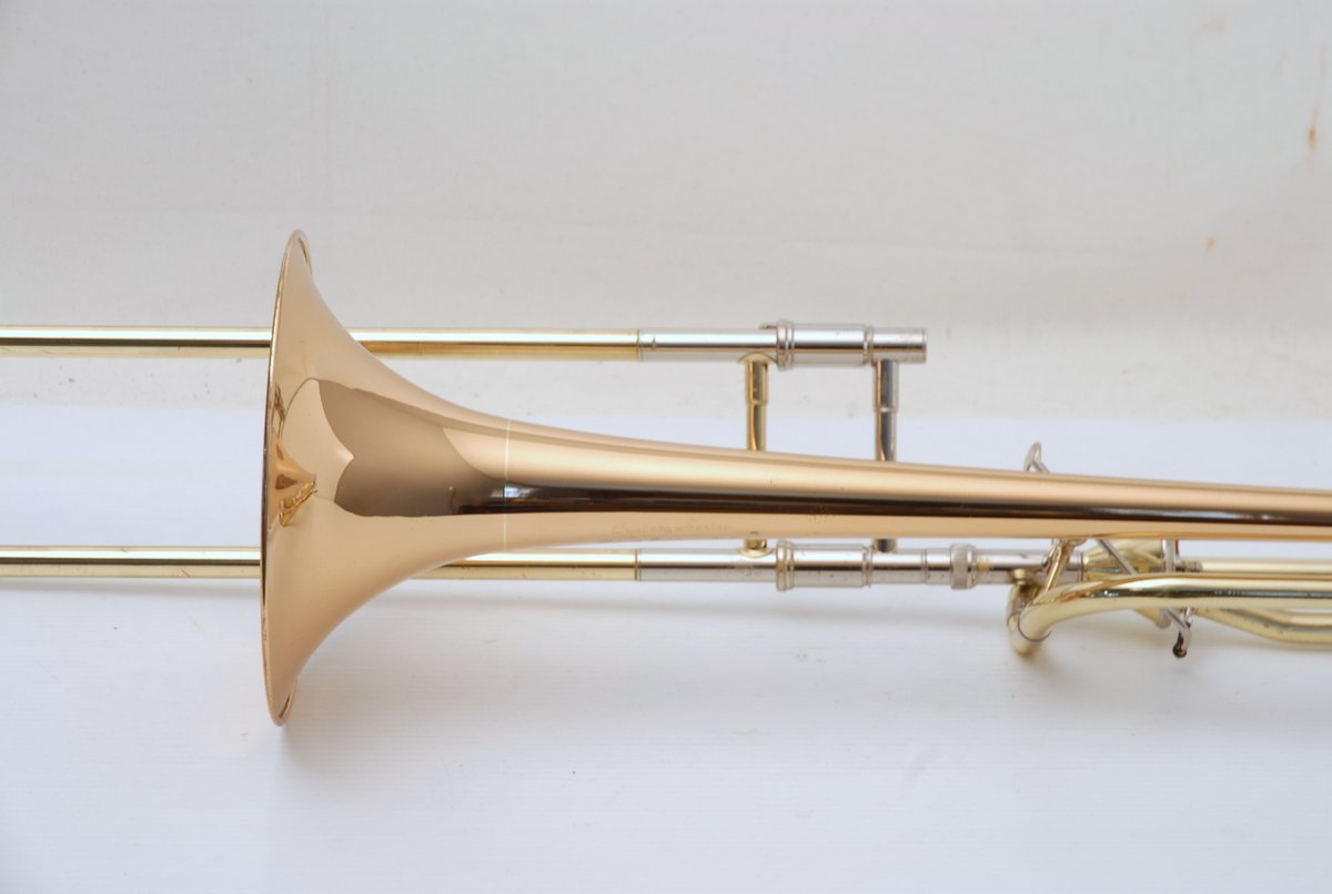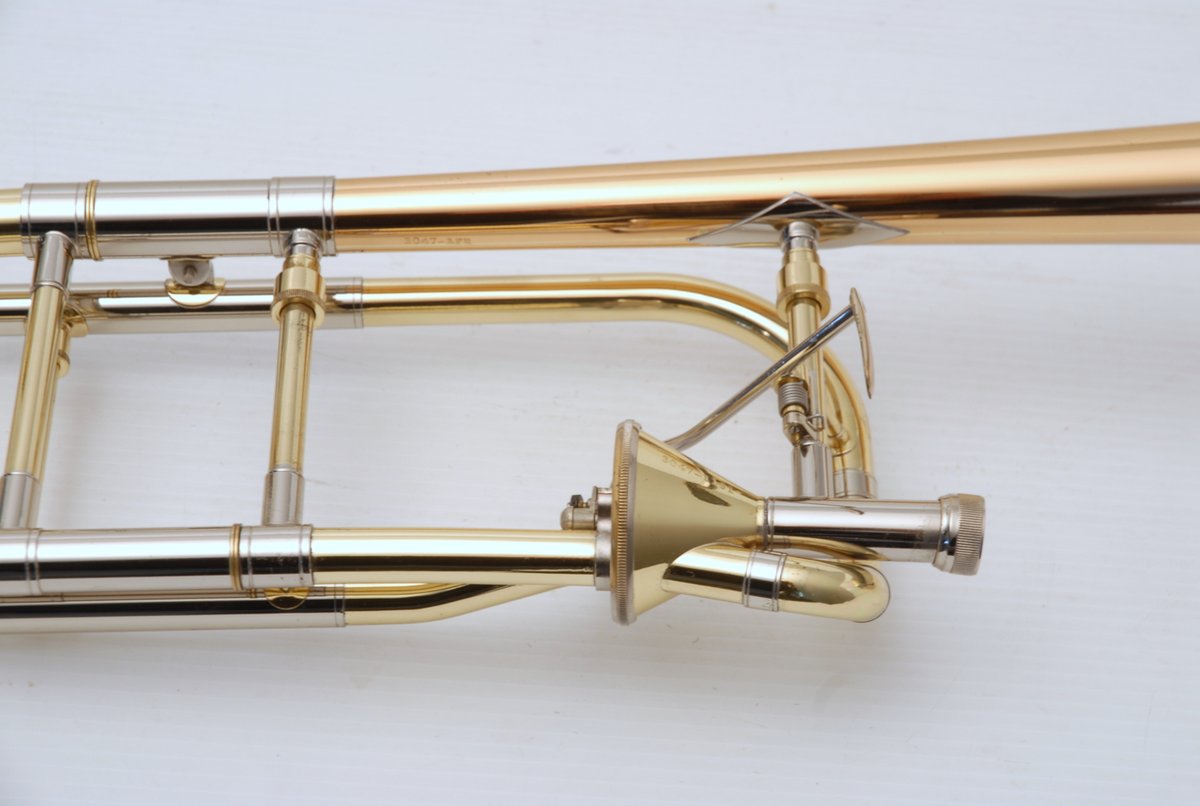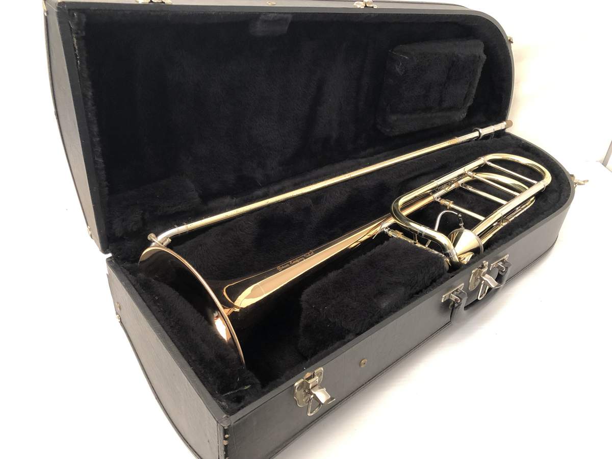Getzen 3047AF-R Rose Brass Bell model with Thayer Valve. Single owner trombone in excellent playing condition. Photo's are in condition upon arrival prior to chemical bath, a couple of very small dings to be taken out of F wrap tubing. Lacquer is in excellent condition. A small amout of acid bleed around part of bell rim, minor lacquer wear on neck and hand grip areas. Valve section is very quick and easy, handslide is fantastic. Would make an excellent large bore tenor for any advancing player. Comes with original case and mouthpiece. A new Getzen 3047 sells new today for $3785. Save Now Play Great!