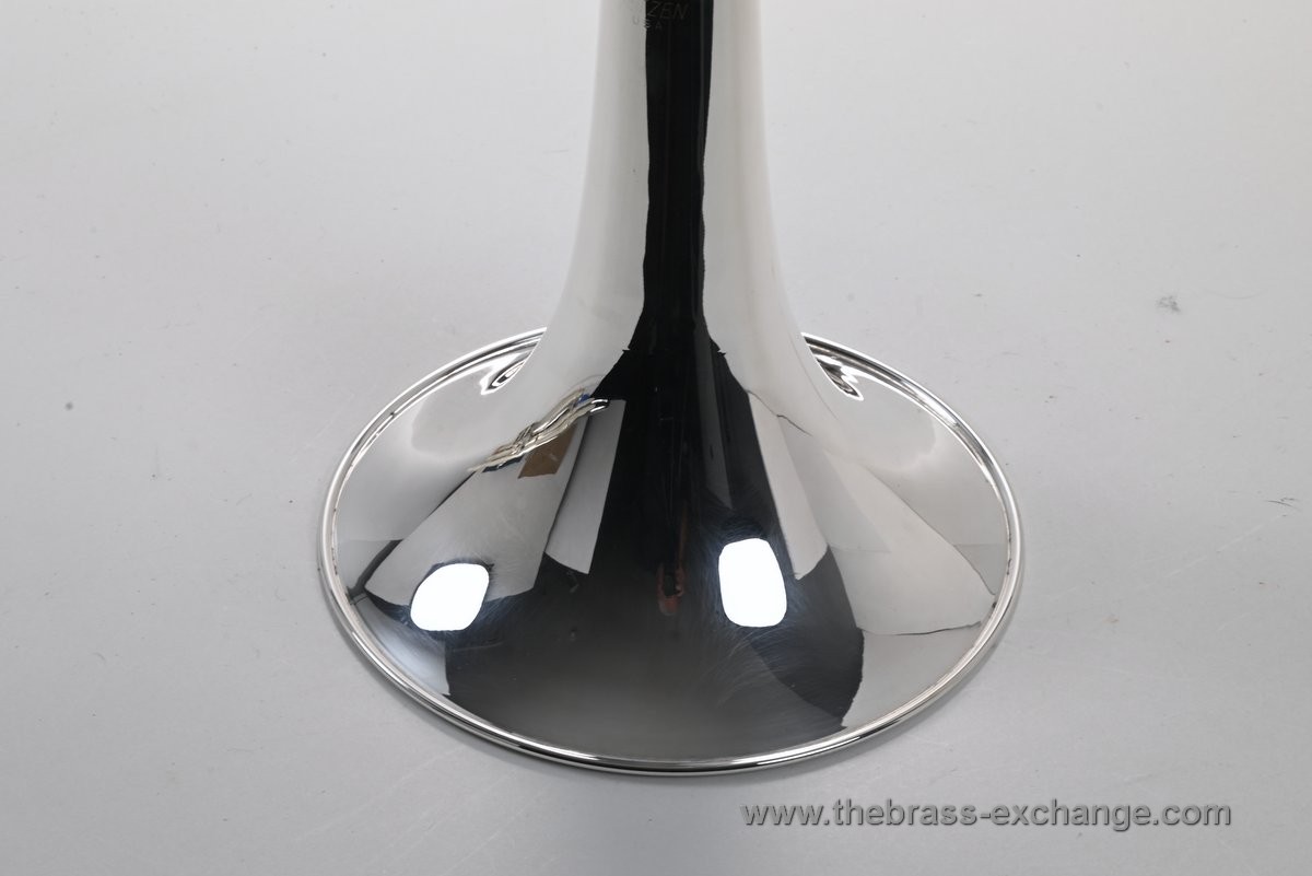 Slightly Used Getzen Eterna Model 998 Silver Valve Trombone in exceptional condition, SN G25751. This professional-level instrument was made in Elkhorn, Wisconsin, and is now discontinued—making it increasingly rare to find one like this. It has seen very little play and has never been damaged. We completed full shop service here including chemical bath and full inspection. Silver plating has been freshly polished and gleams like new.