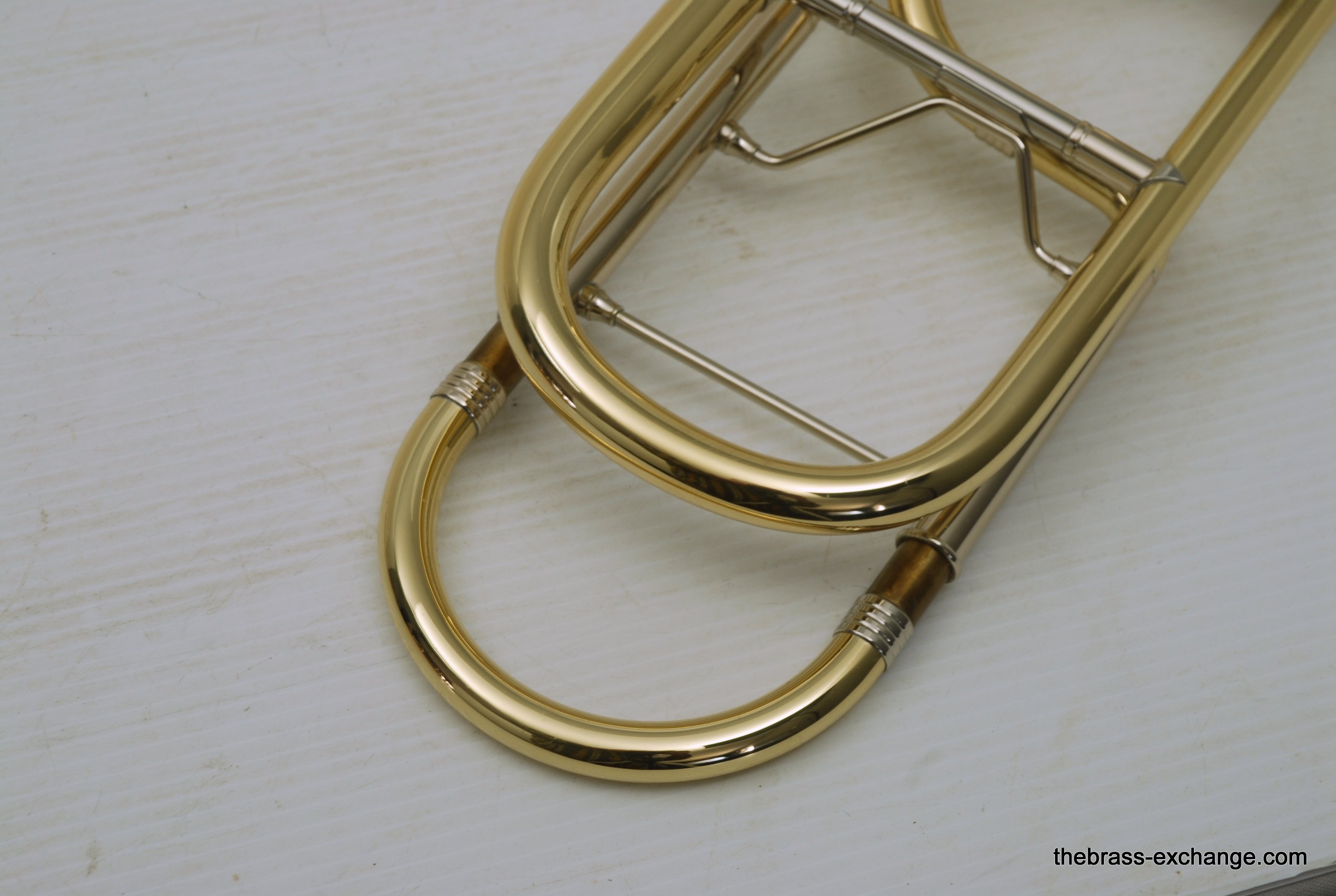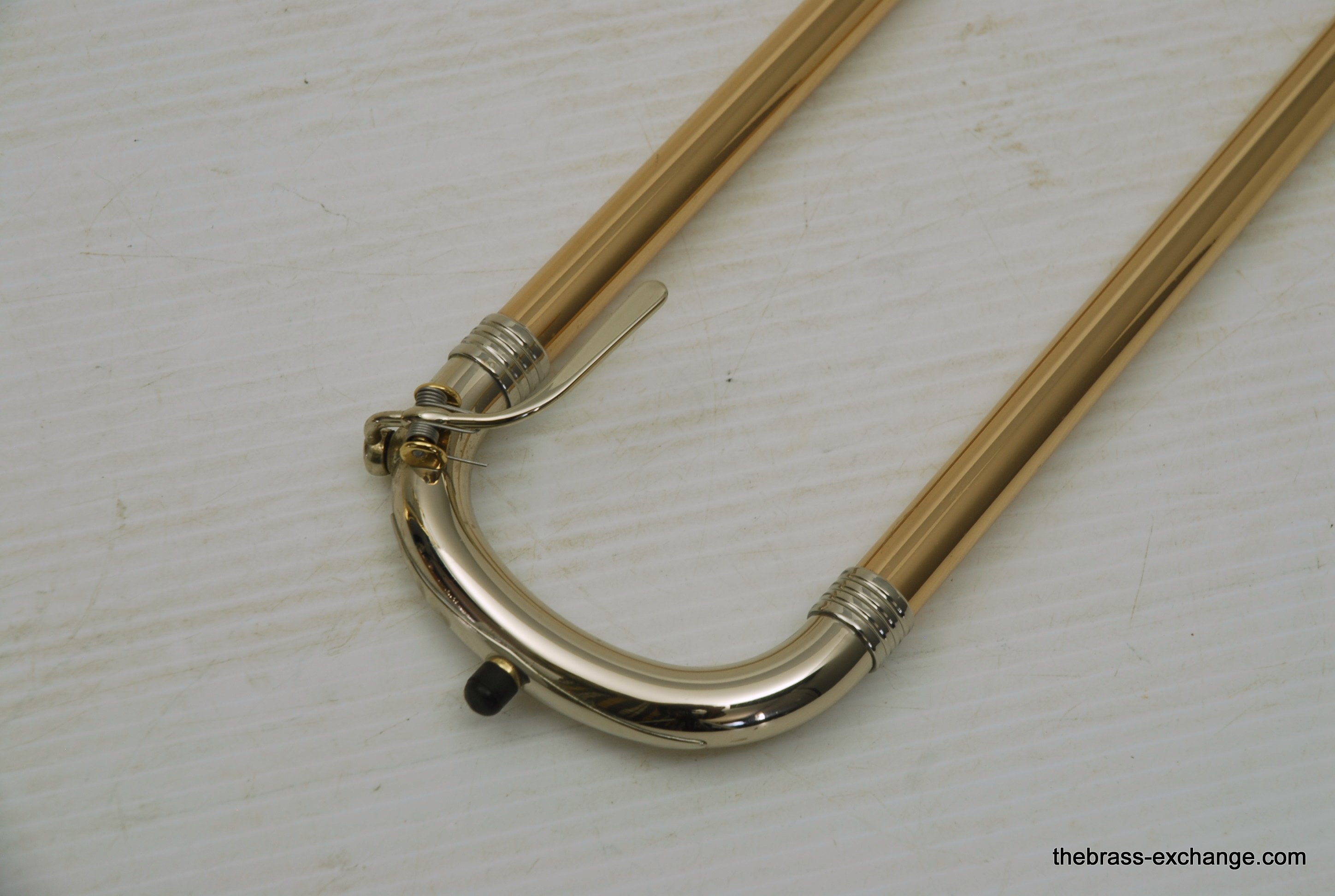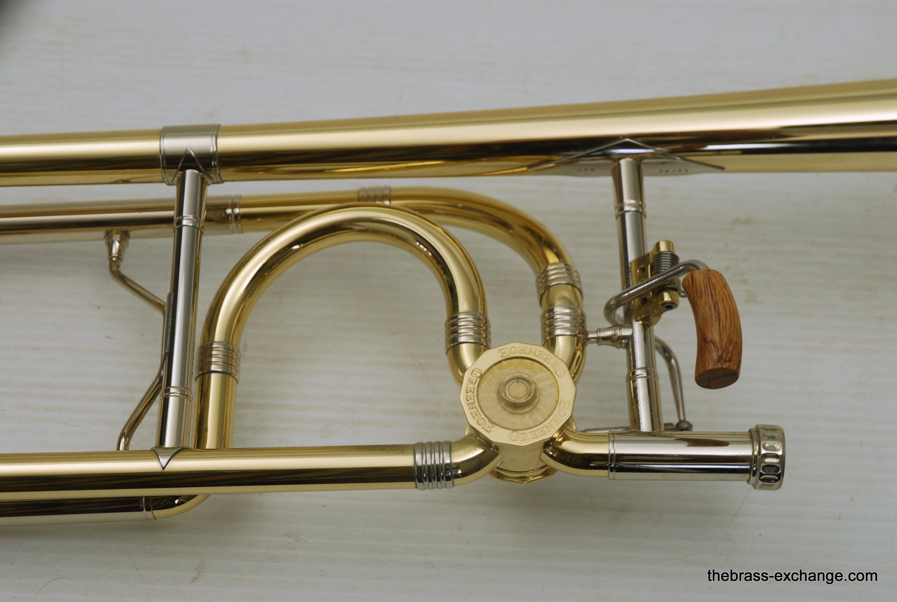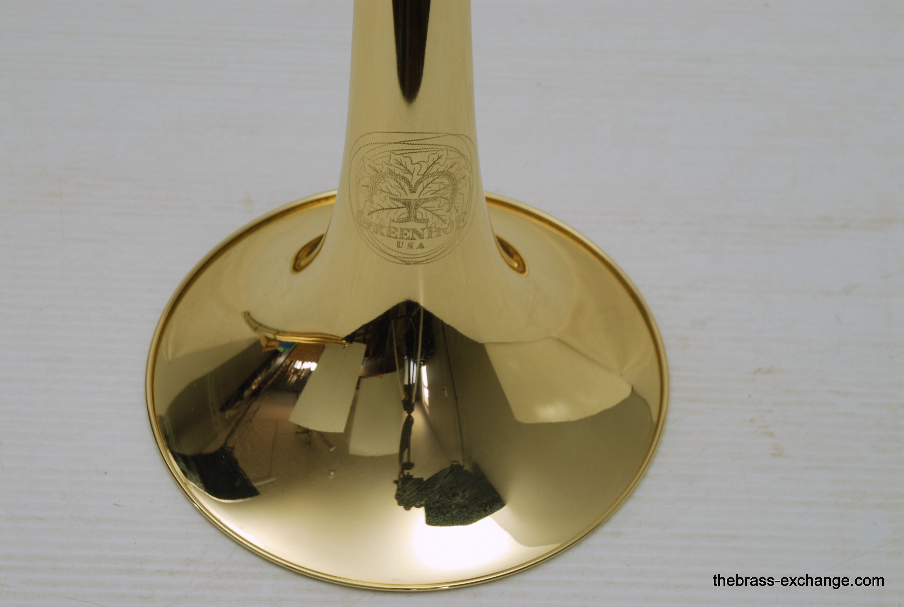 Greenhoe Original Make Tenor Yellow Brass with T.I.S. New Old Stock.  This is indeed another amazing Original Greenhoe .547 tenor made in Wisconsin prior to the closing of the factory.  Has 8.5" Lightweight yellow brass one piece bell, unsoldered rim.  Fantastic Greenhoe rotor, non-modular.  You have to play this one to believe it.  It's sensational.  Handslide is Conn width with T.I.S. tunining in slide, includes one removable leadpipe.  The handslide action is fantastic, about the smoothest slide that you can get, anywhere, and I am very picky when it comes to slides.  This horn is in the style of Conn all the way, unsoldered rim and gold brass slide.  88H Guys, 78H Players, 6H Lovers will take to this one immediately.  Is the type of horn you win an audition with- complex colorful overtones, outstanding projection, amazing intonation.  It really doesn't get any better than this.  Comes with a black Crossrock tenor case.