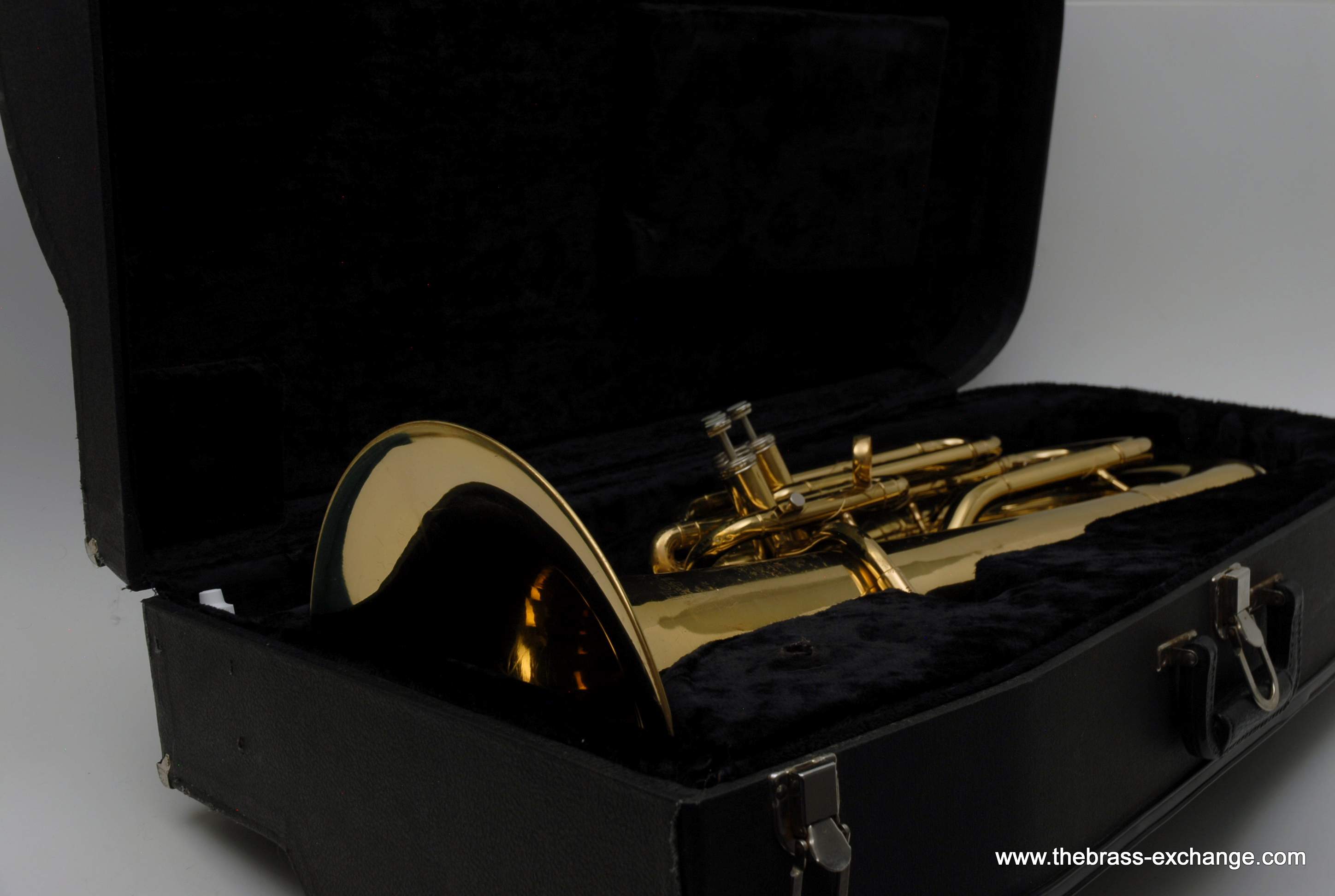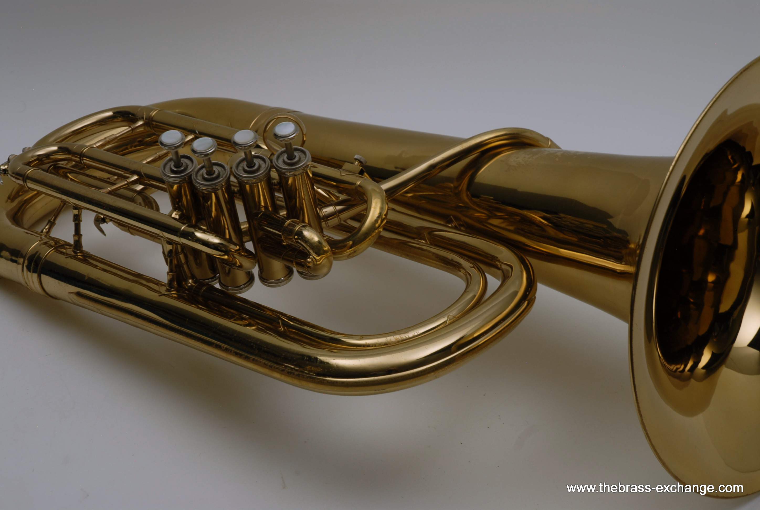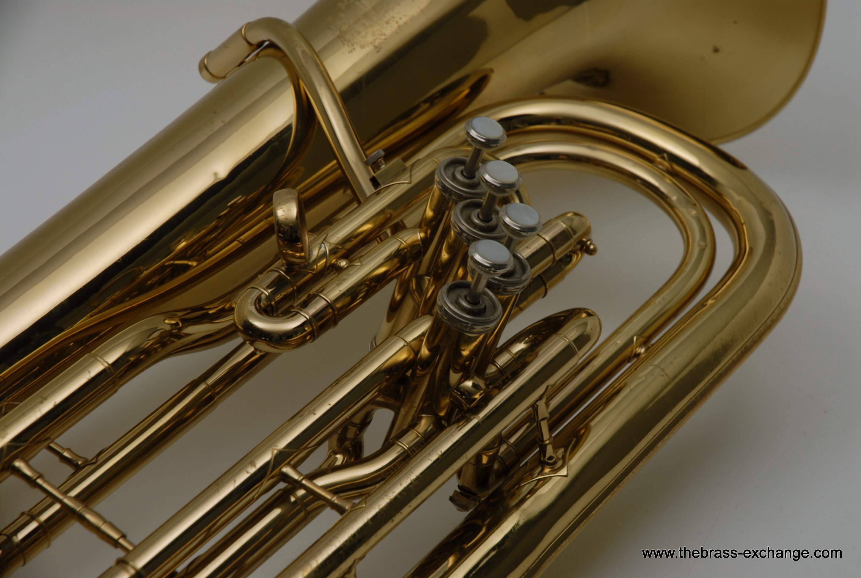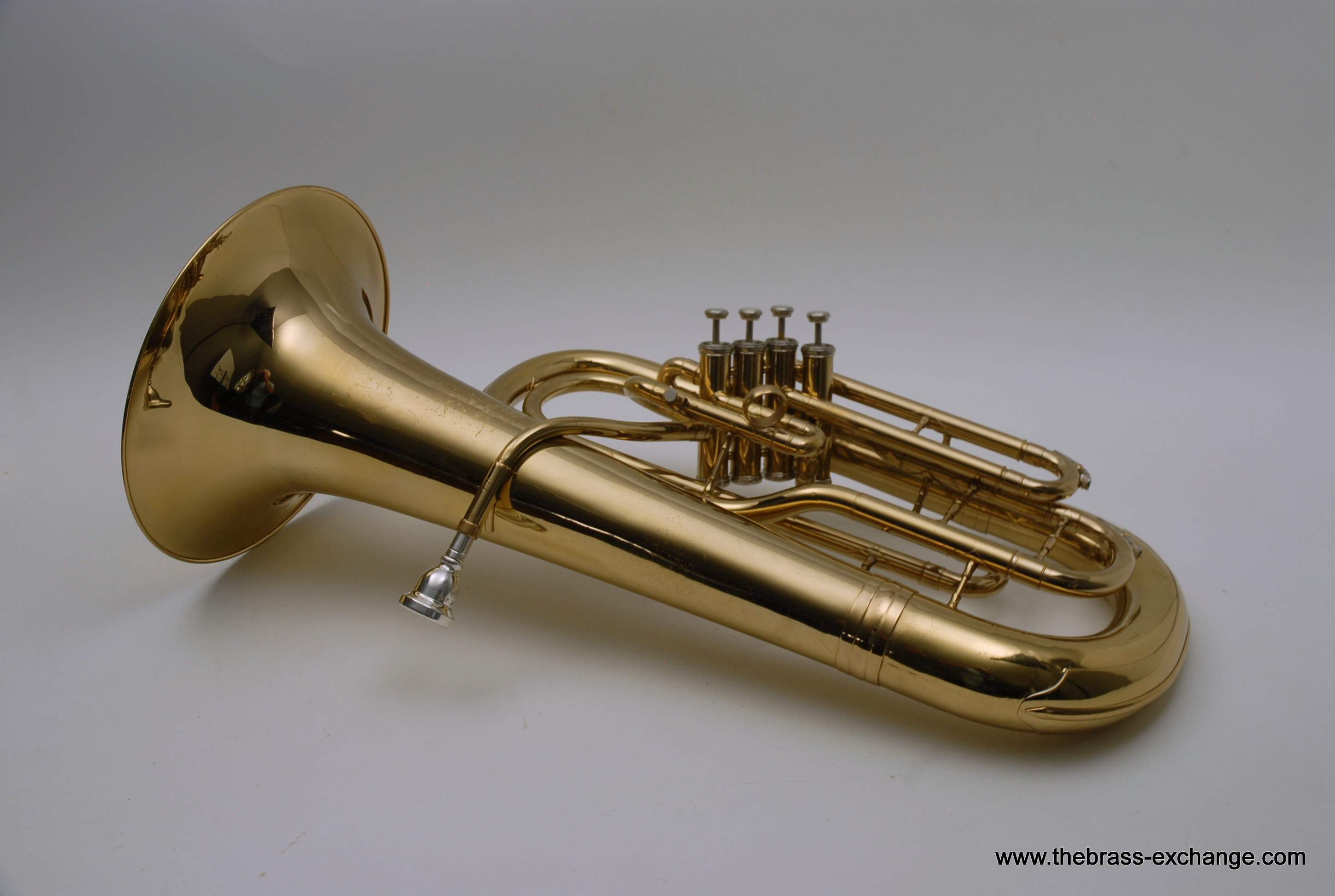 Holton 4 Valve Euphonium, 1960's make.  Front facing piston valves.  Has had full shop service here including pads, felts, chemical bath.  Takes Euro Shank mouthpiece, 2 mouthpieces included.  Original case.  Is not the top professional model available today, but it's not 8K either.  It definitely plays nice and is without any major issues.  Has several minor bow dings, but not too bad, it still plays exactly the way it was designed to play.  Has a rich sound.  Would be a perfect starter horn for any player looking to learn how to play valves.  Original case included.