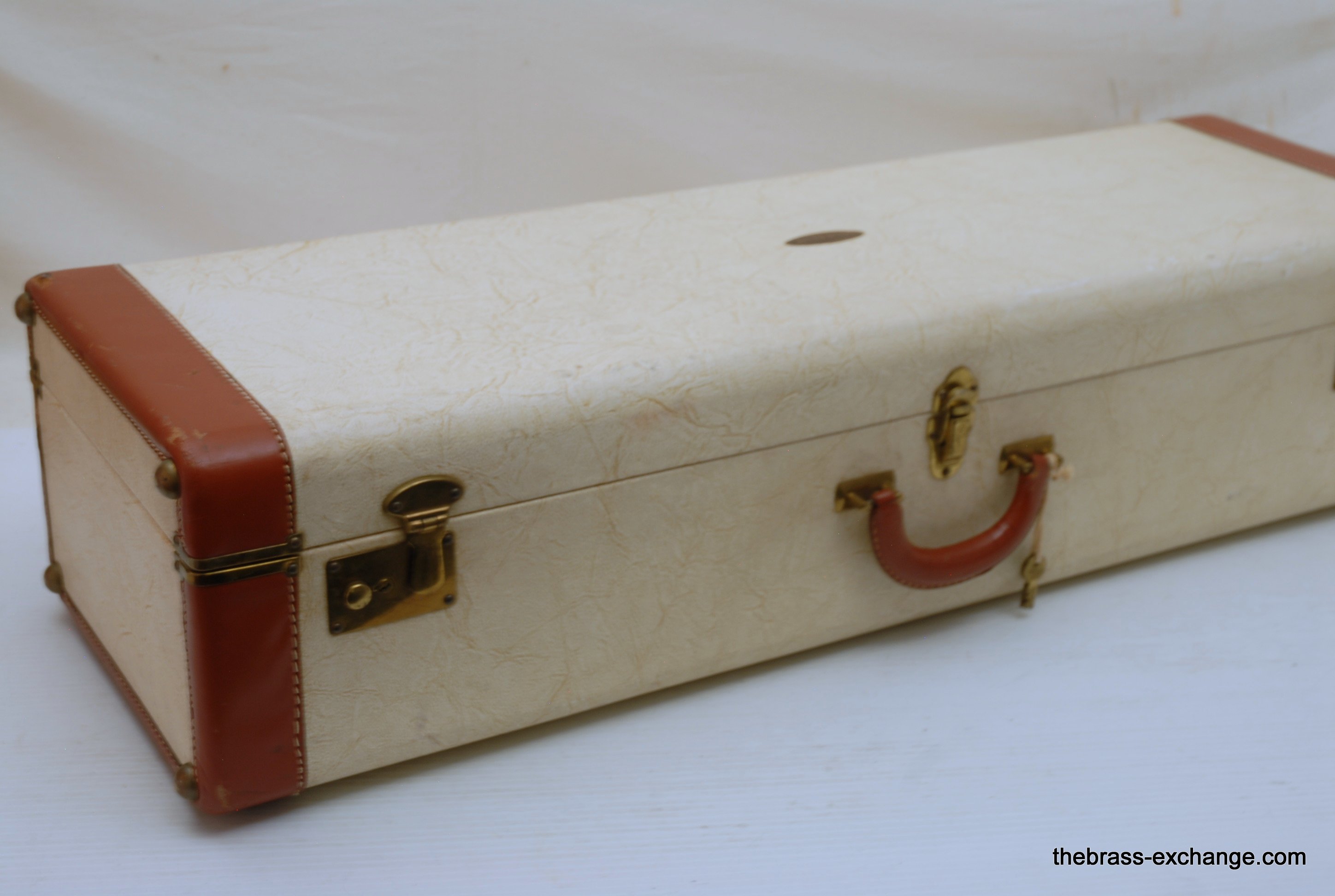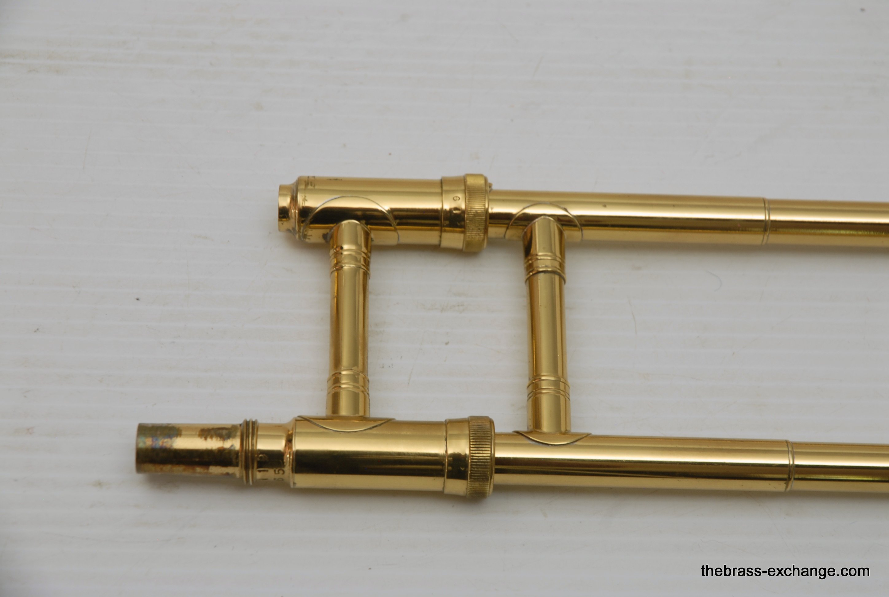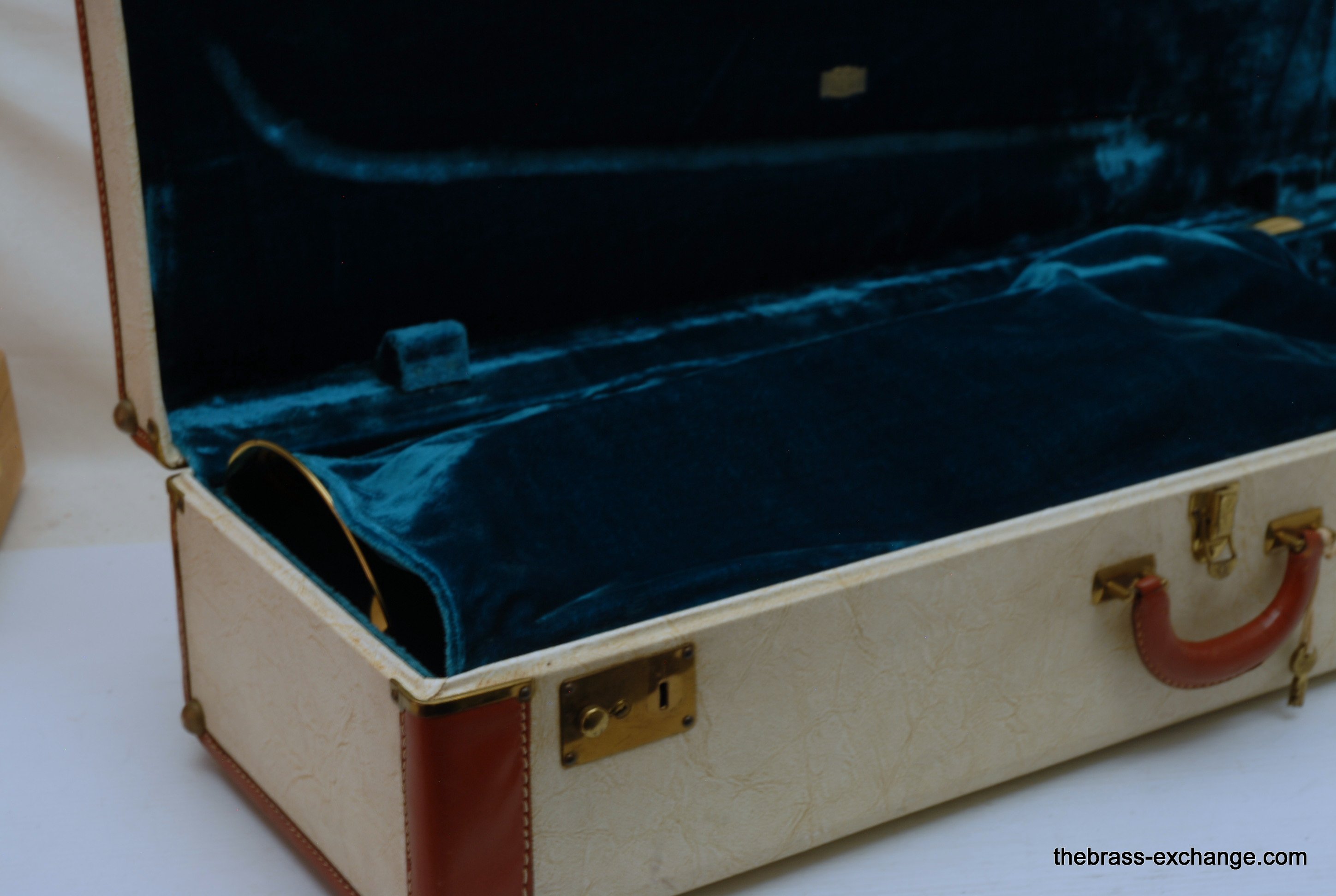 Holton 65 This is a special order custom. Vintage 1948-49, small bore tenor. The special order Holton's are very rare, is considered a step above the more ubiquitous Stratodyne model. Although this 65 includes a deluxe Stratodyne case. They went all out on this model. Yes is a small bore, with 7" bell. Ideal for lead, jazz, trad jazz. This horn absolutely screams in the upper register., Nothing is left on the table. No damage or repairs ever. Handslide is excellent. All original parts and lacquer, is both a collectible and a pro level pro player horn. The case is off white ivory with leather wrap, and turquoise blue interior, with flap cover. This one has been closet kept for years. Original mouthpiece, mint. Also includes 4 mutes. We have never seen anything quite like it here, and doubt that we will anytime soon. No service needs to improve playability. Is ready for immediate delivery.