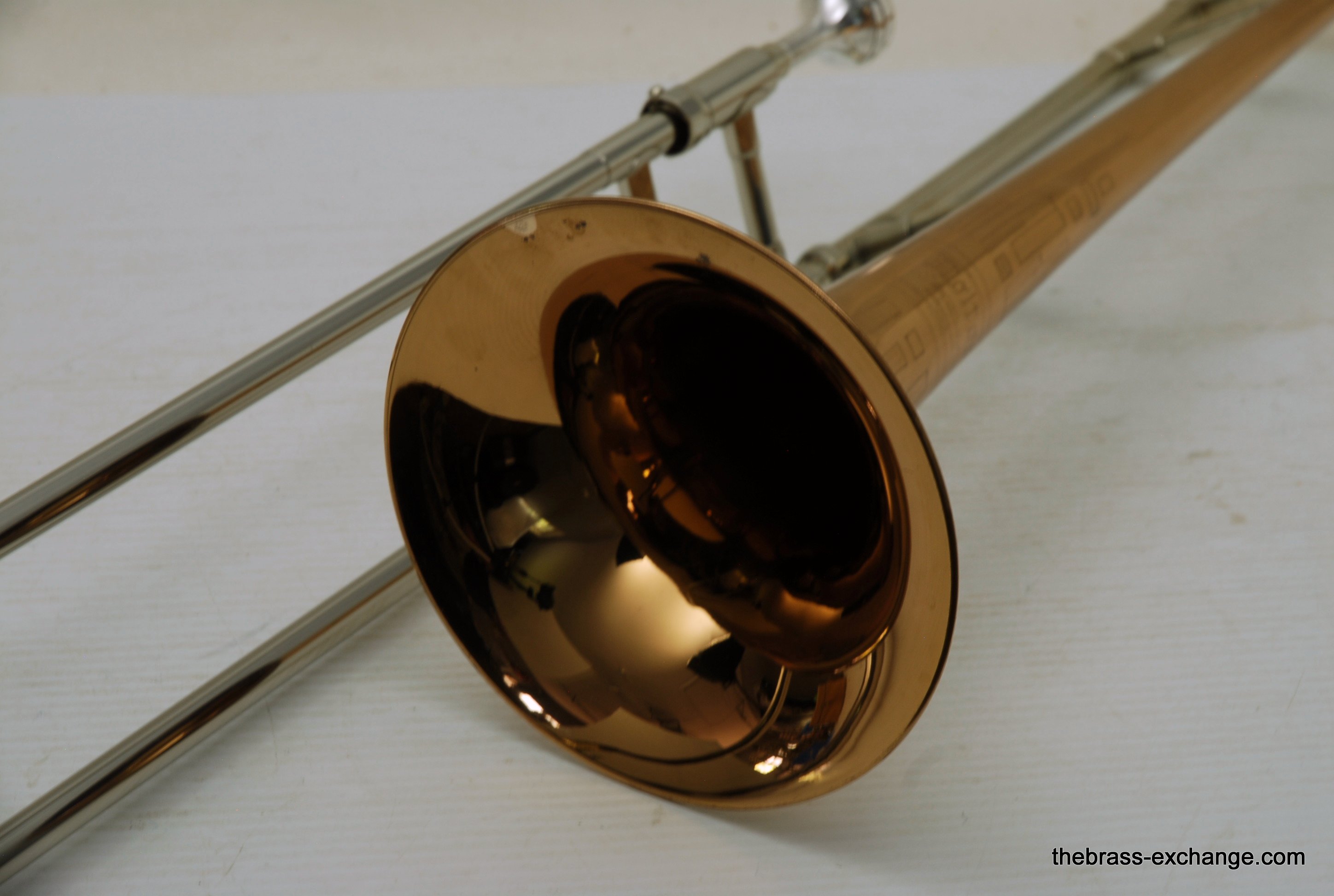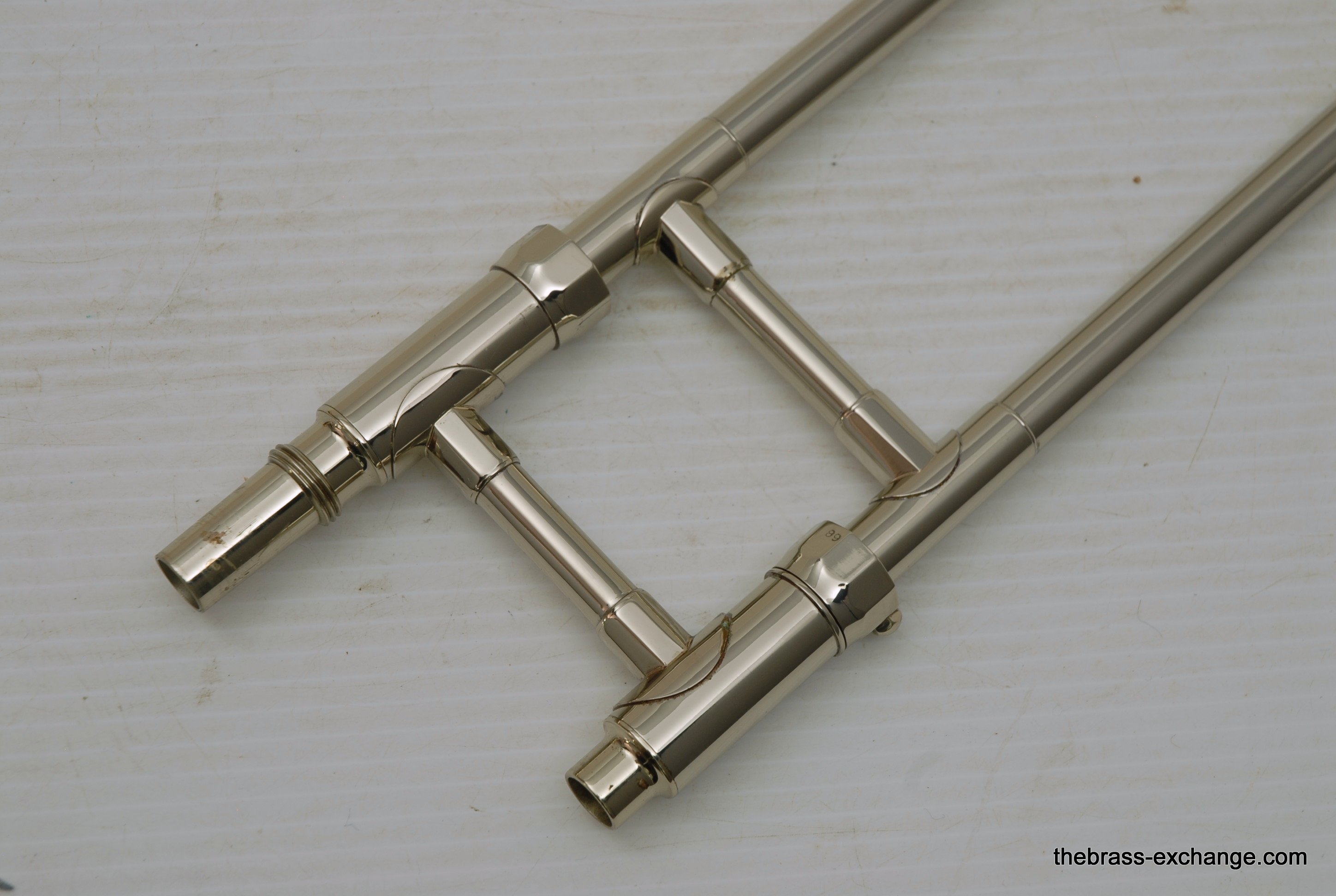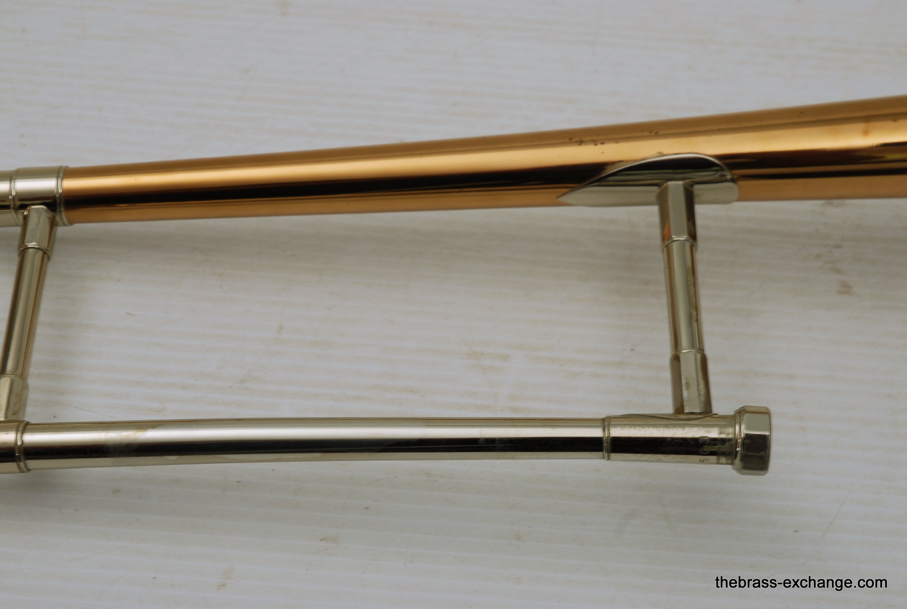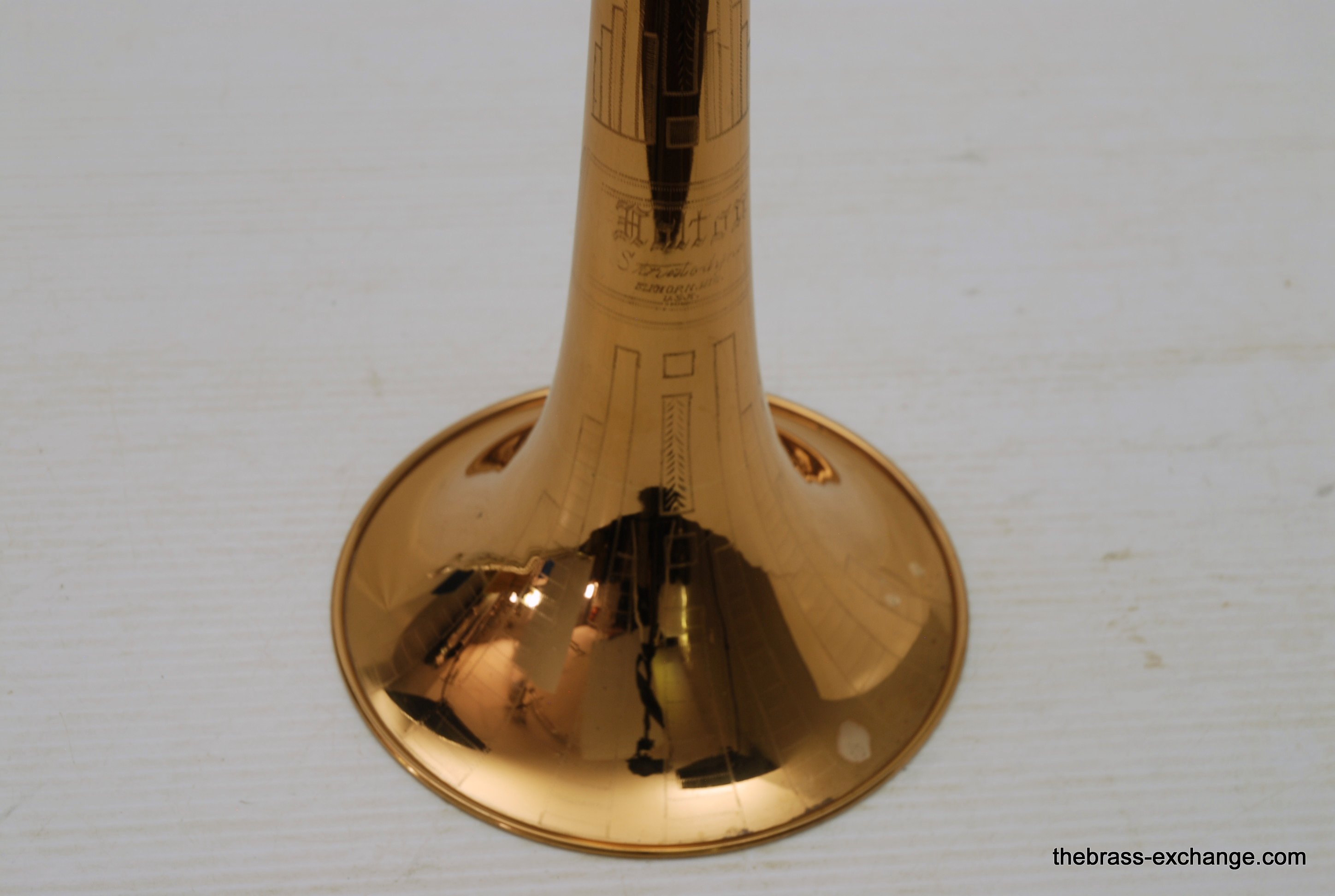 Holton Stratodyne Model 67. This is an amazing small bore jazz/commerical style tromobone. It was made in the early 1960's, most likely 63' according to the serial number. It has a .485 bore size, but feels and plays much larger. It feels more like a .500. Has a 7.5 gold brass bell with fancy deco style engraving. Some people consider Holton Gold Brass Bells to be actually Rose Brass, but that is a matter of opinion. We find that red brass or rose brass bells have a higher copper content than gold brass. An example of a rose brass bell would be a Conn 88H. Regardless of whether this bell was originally referred to as gold, bronze, or rose brass, it doesn't really matter because it is gorgeous and plays fantastic. The lightweight nickel silver slide is in perfect condition, straight inners-outers, no drag or tension, no plating wear on the inners. This horn plays very easily and would be an excellent alternative to a jazz guy looking to find his individual sound. Plays very warm and has a hint of darkness in the sound, as one would expect with gold brass, but it can also really sizzle when you ask it to. There is a small ding on the tuning slide which will be taken out prior to delivery. Original case in excellent condition, also includes original Holton Mouthpiece. This is a very rare instrument and could be the horn of a lifetime for the right player.