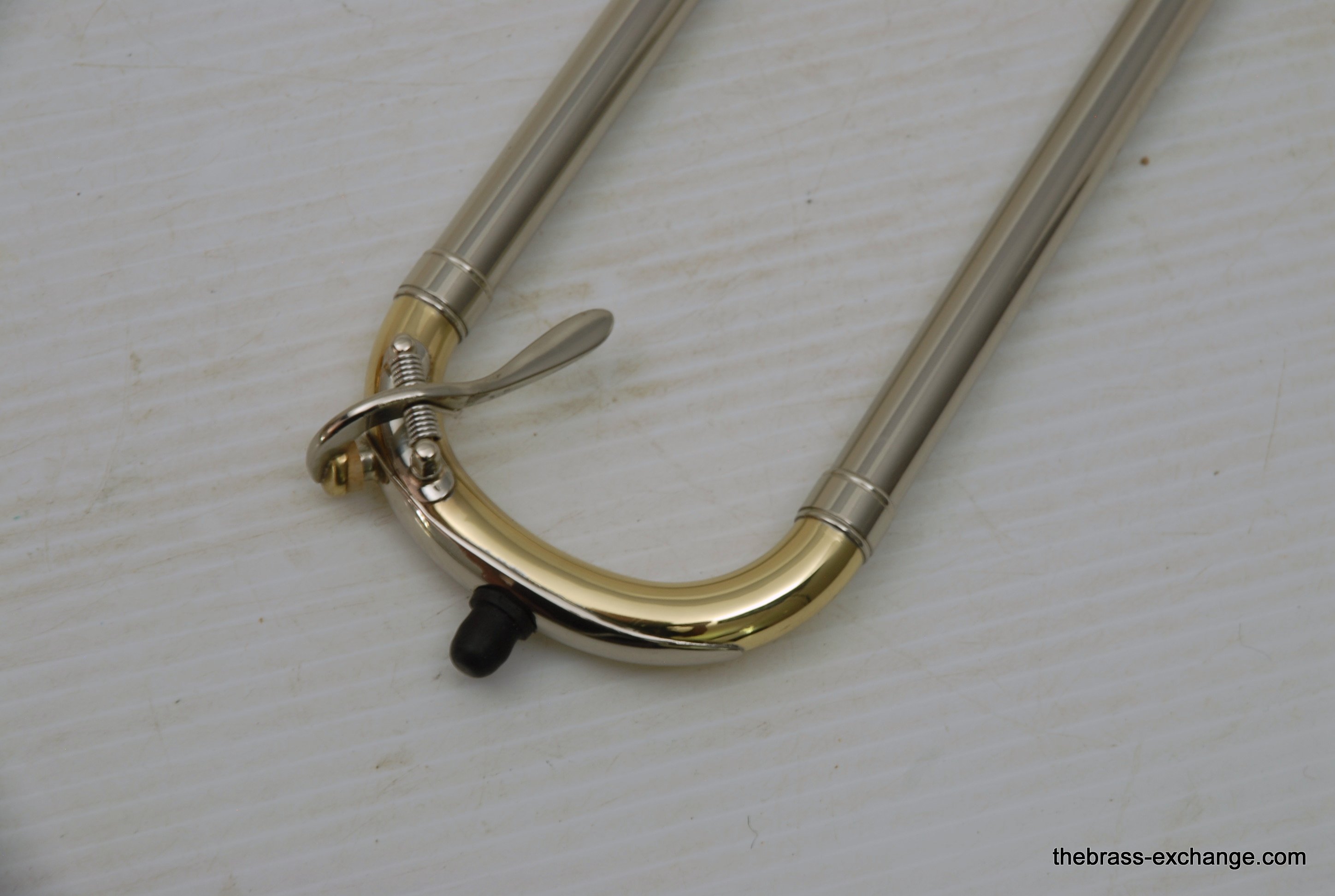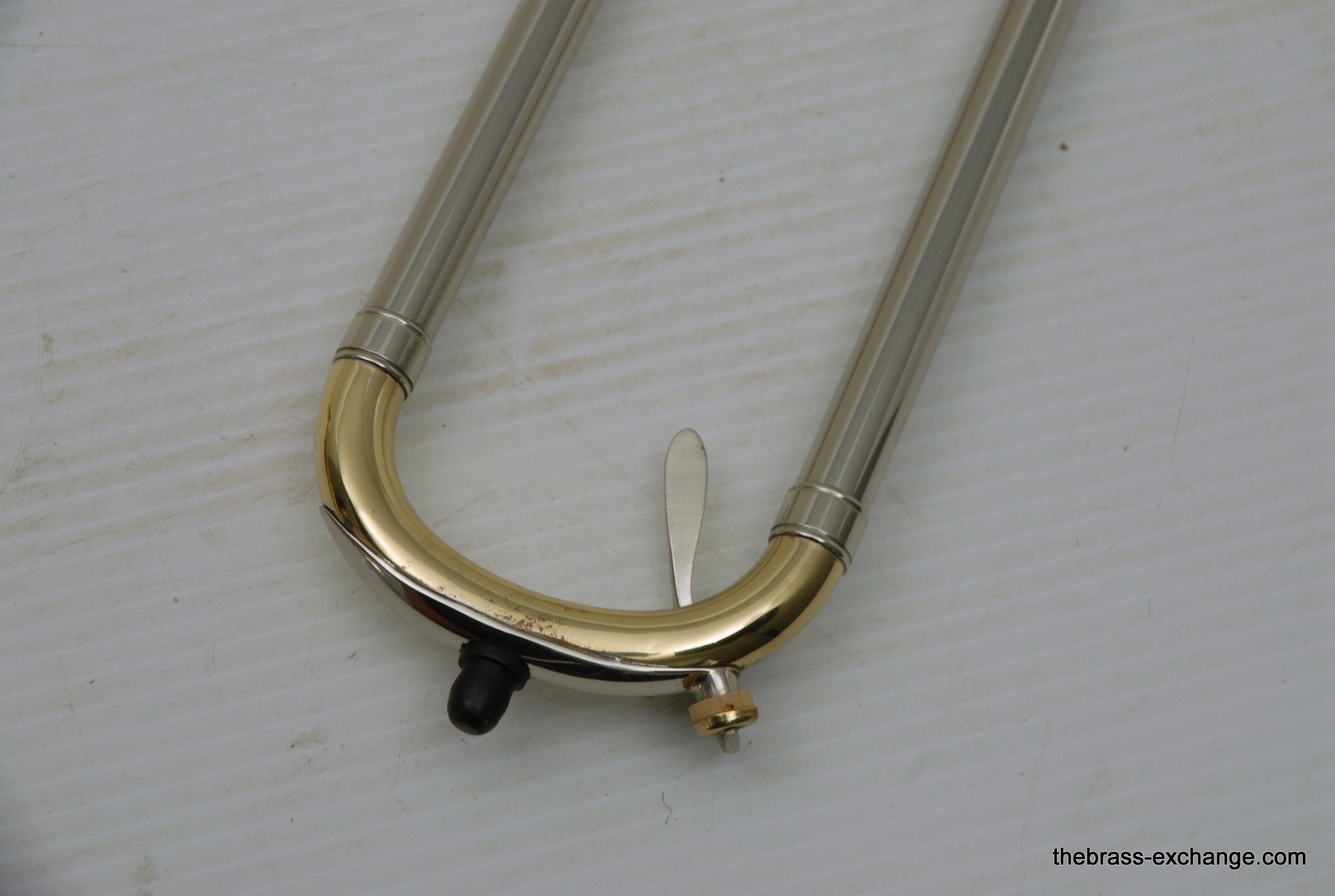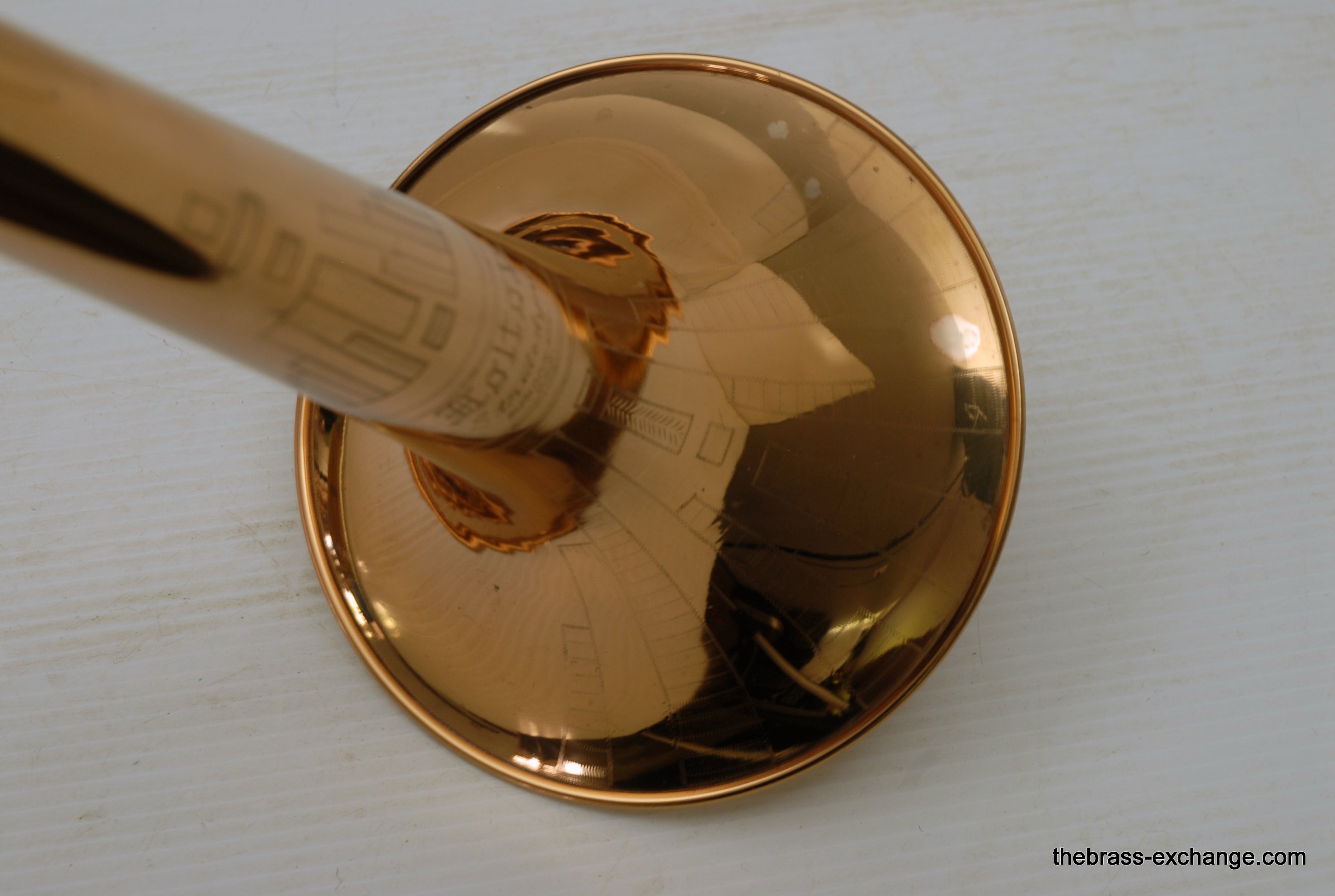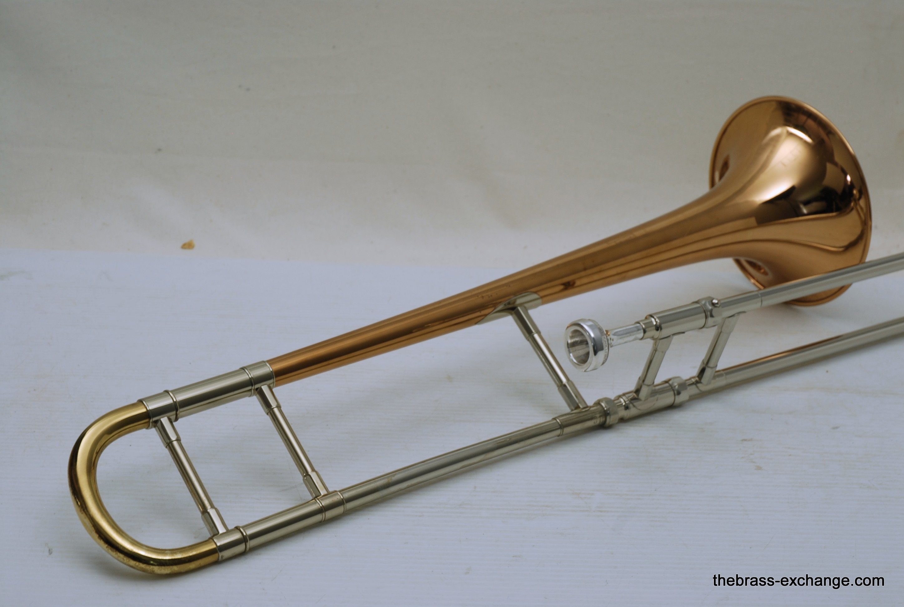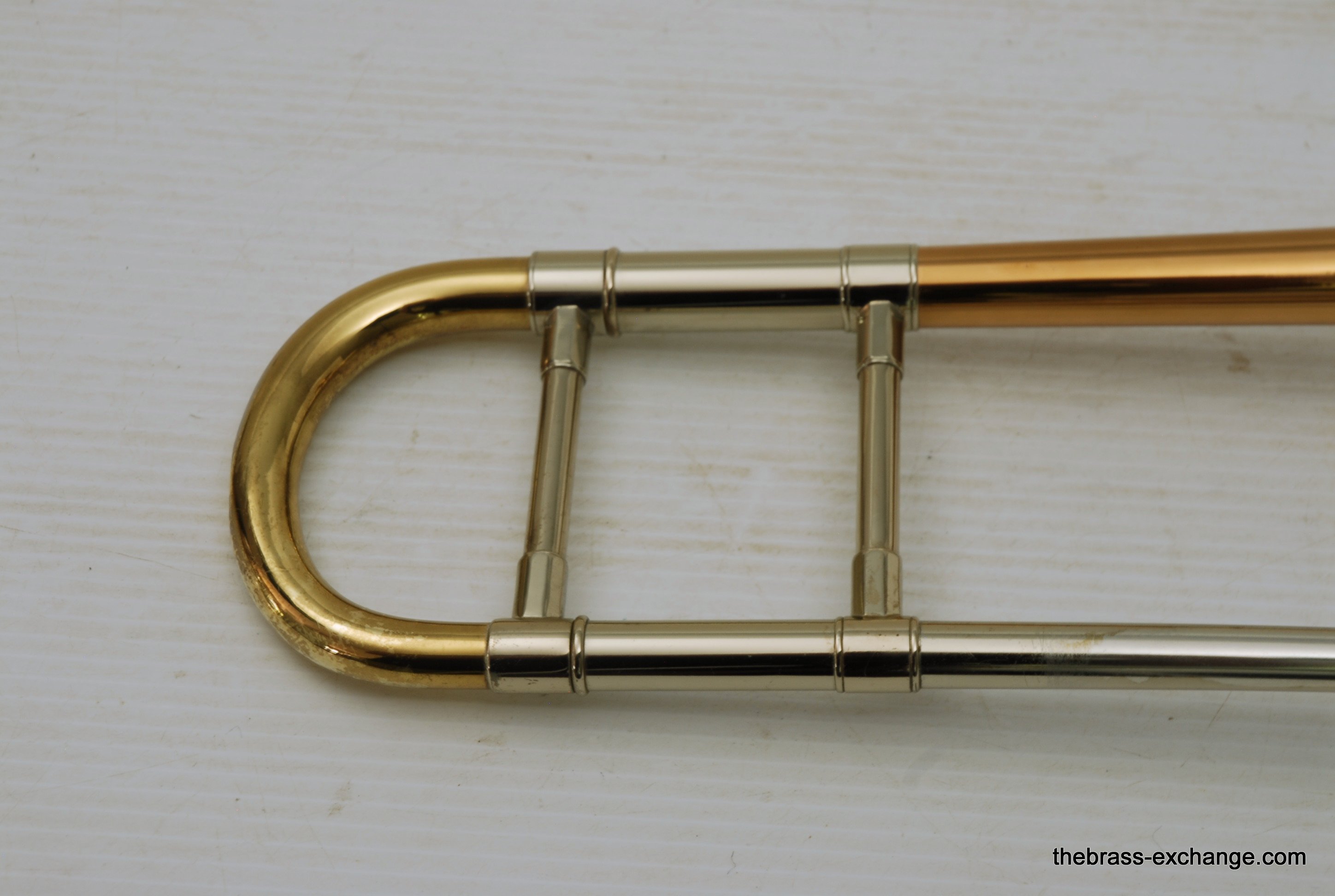 Holton Stratodyne Model 67. This is an amazing small bore jazz/commerical style tromobone. It was made in the early 1960's, most likely 63' according to the serial number. It has a .485 bore size, but feels and plays much larger. It feels more like a .500. Has a 7.5 gold brass bell with fancy deco style engraving. Some people consider Holton Gold Brass Bells to be actually Rose Brass, but that is a matter of opinion. We find that red brass or rose brass bells have a higher copper content than gold brass. An example of a rose brass bell would be a Conn 88H. Regardless of whether this bell was originally referred to as gold, bronze, or rose brass, it doesn't really matter because it is gorgeous and plays fantastic. The lightweight nickel silver slide is in perfect condition, straight inners-outers, no drag or tension, no plating wear on the inners. This horn plays very easily and would be an excellent alternative to a jazz guy looking to find his individual sound. Plays very warm and has a hint of darkness in the sound, as one would expect with gold brass, but it can also really sizzle when you ask it to. There is a small ding on the tuning slide which will be taken out prior to delivery. Original case in excellent condition, also includes original Holton Mouthpiece. This is a very rare instrument and could be the horn of a lifetime for the right player.