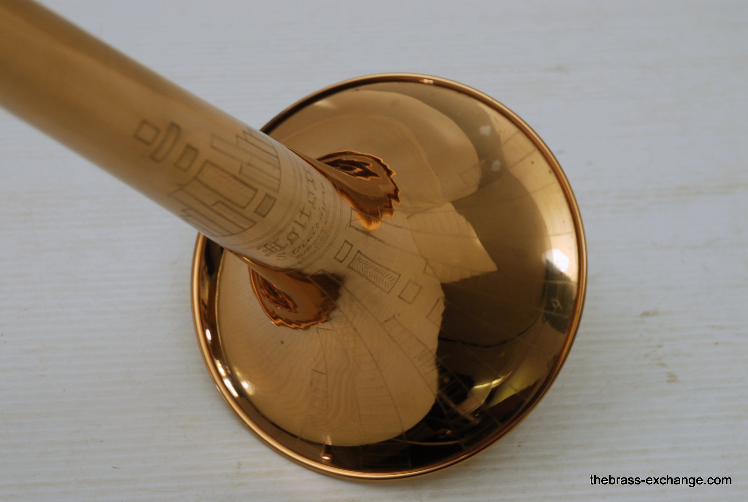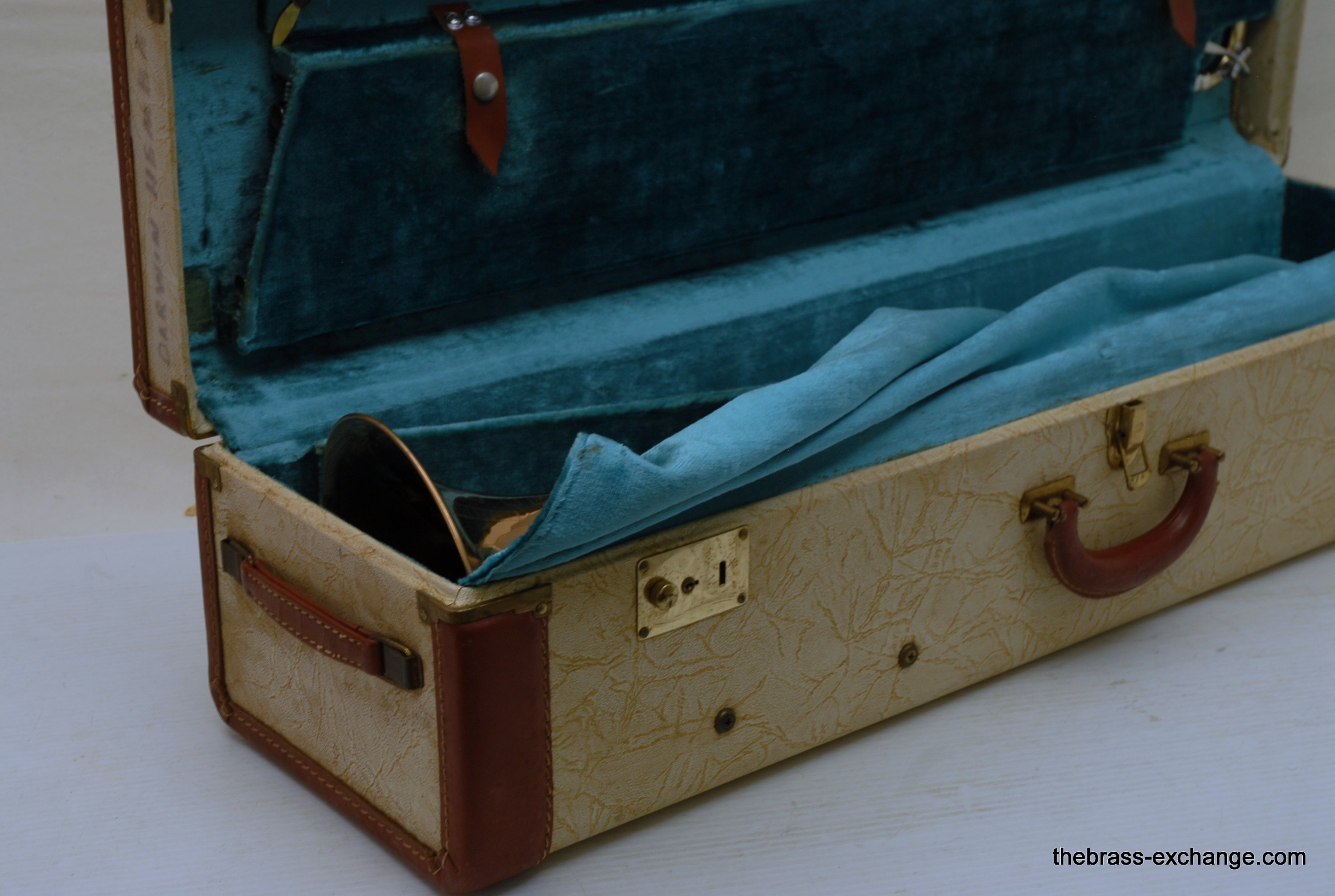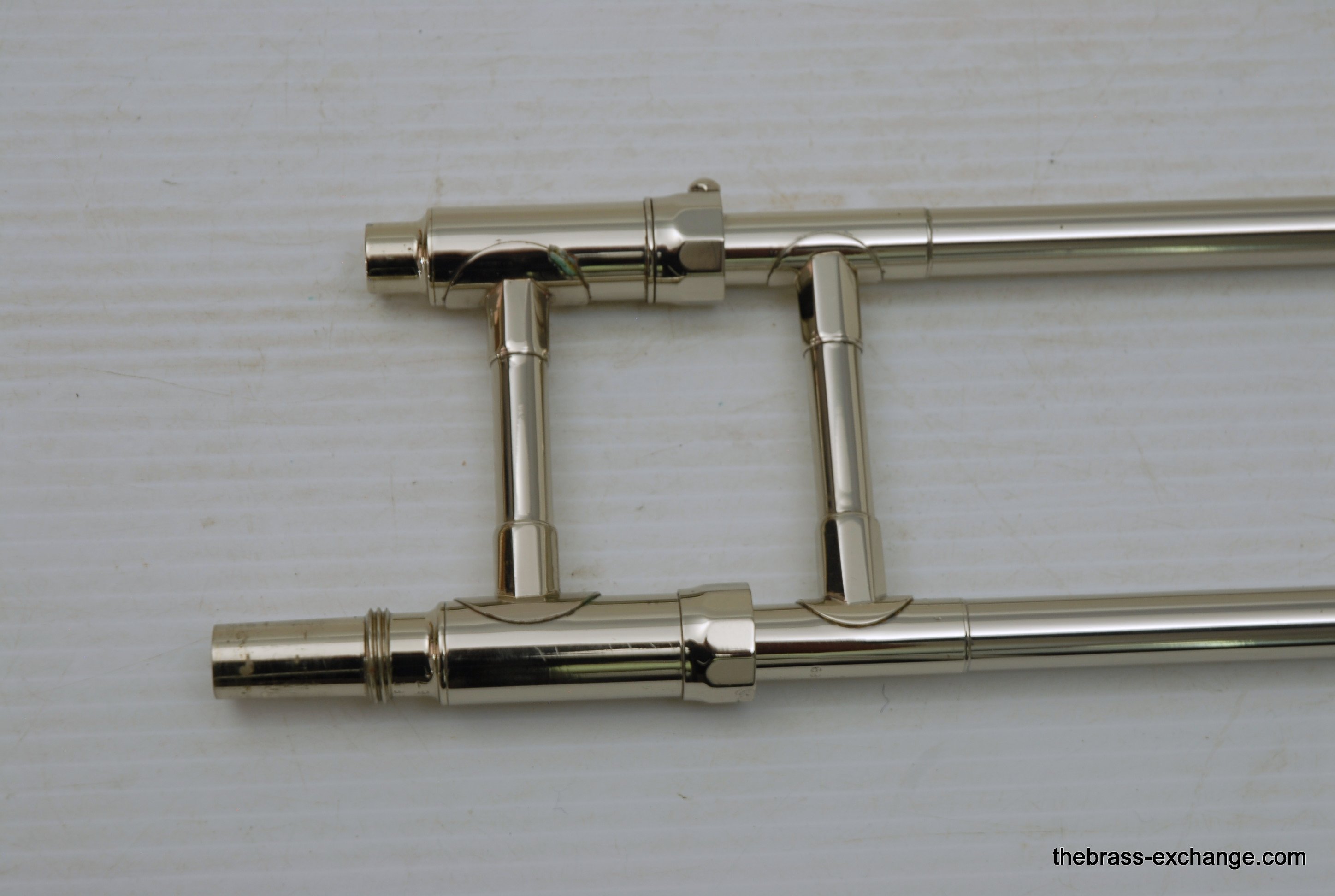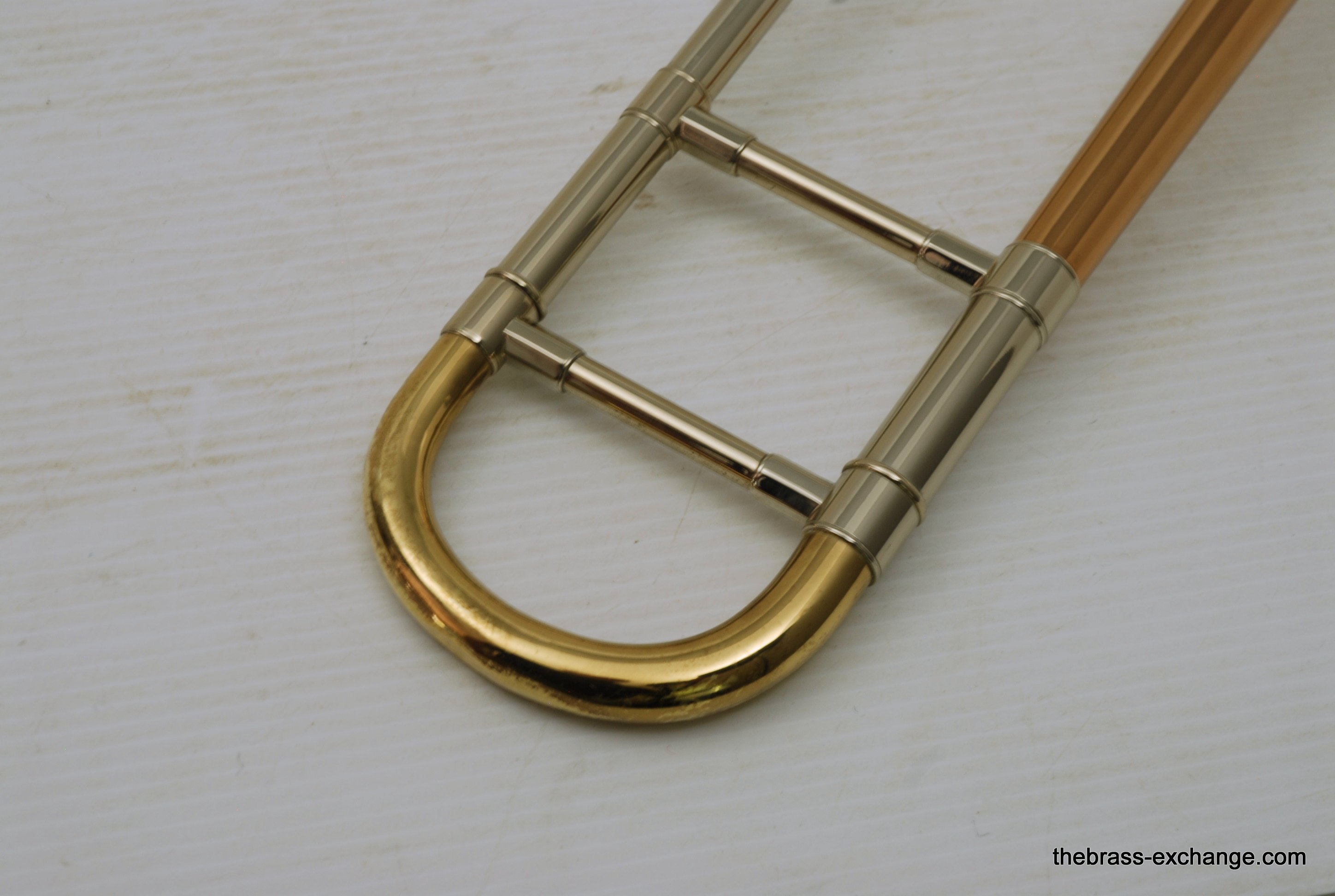 Holton Stratodyne Model 67. This is an amazing small bore jazz/commerical style tromobone. It was made in the early 1960's, most likely 63' according to the serial number. It has a .485 bore size, but feels and plays much larger. It feels more like a .500. Has a 7.5 gold brass bell with fancy deco style engraving. Some people consider Holton Gold Brass Bells to be actually Rose Brass, but that is a matter of opinion. We find that red brass or rose brass bells have a higher copper content than gold brass. An example of a rose brass bell would be a Conn 88H. Regardless of whether this bell was originally referred to as gold, bronze, or rose brass, it doesn't really matter because it is gorgeous and plays fantastic. The lightweight nickel silver slide is in perfect condition, straight inners-outers, no drag or tension, no plating wear on the inners. This horn plays very easily and would be an excellent alternative to a jazz guy looking to find his individual sound. Plays very warm and has a hint of darkness in the sound, as one would expect with gold brass, but it can also really sizzle when you ask it to. There is a small ding on the tuning slide which will be taken out prior to delivery. Original case in excellent condition, also includes original Holton Mouthpiece. This is a very rare instrument and could be the horn of a lifetime for the right player.