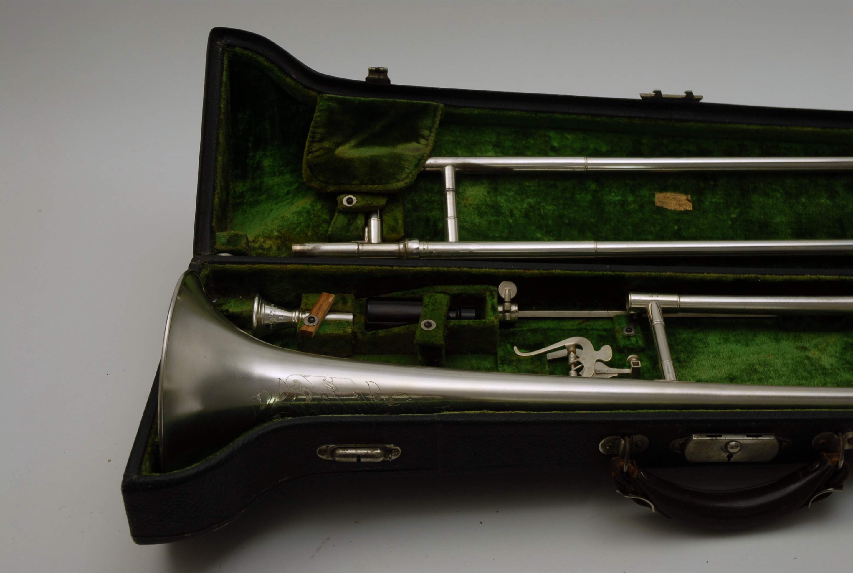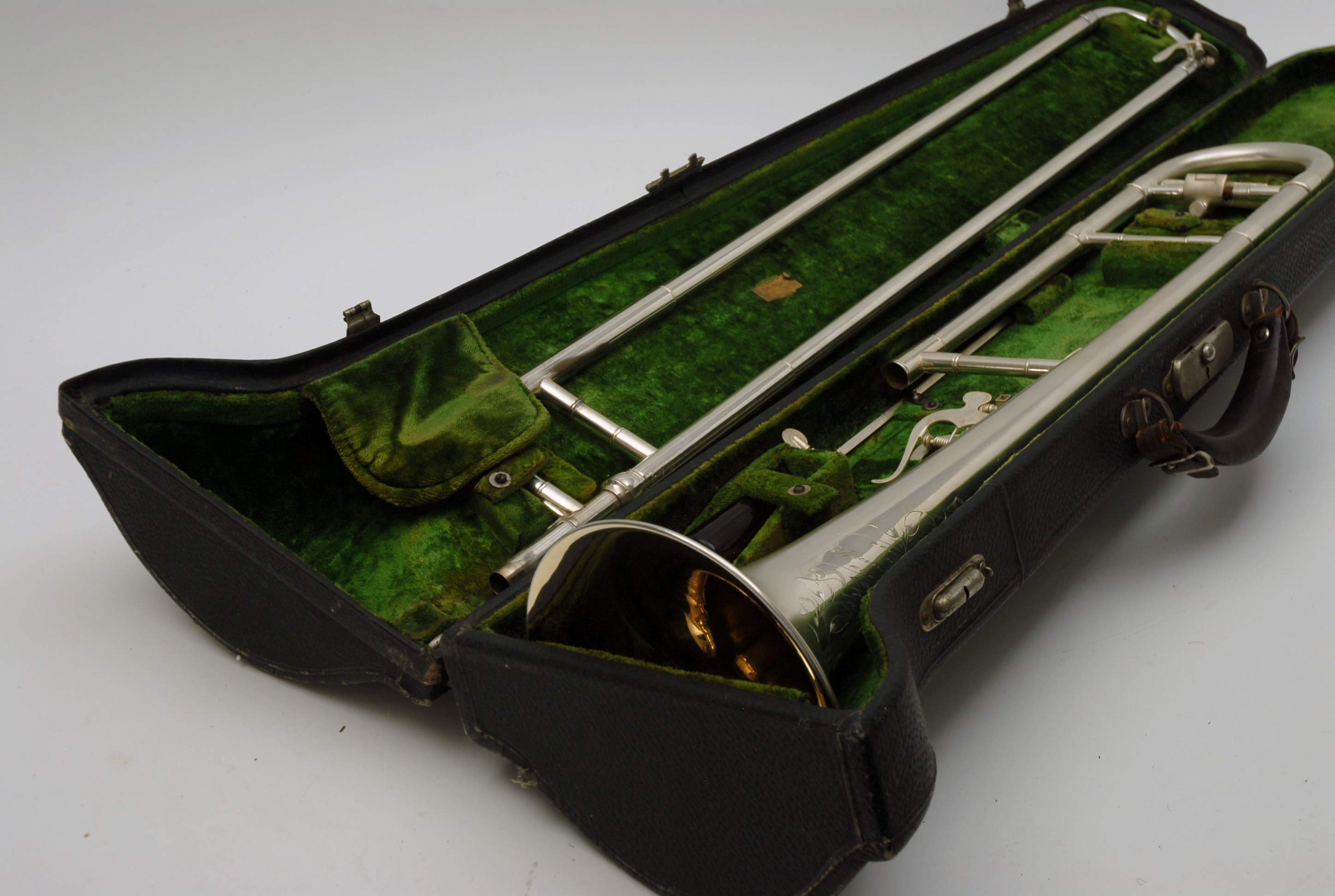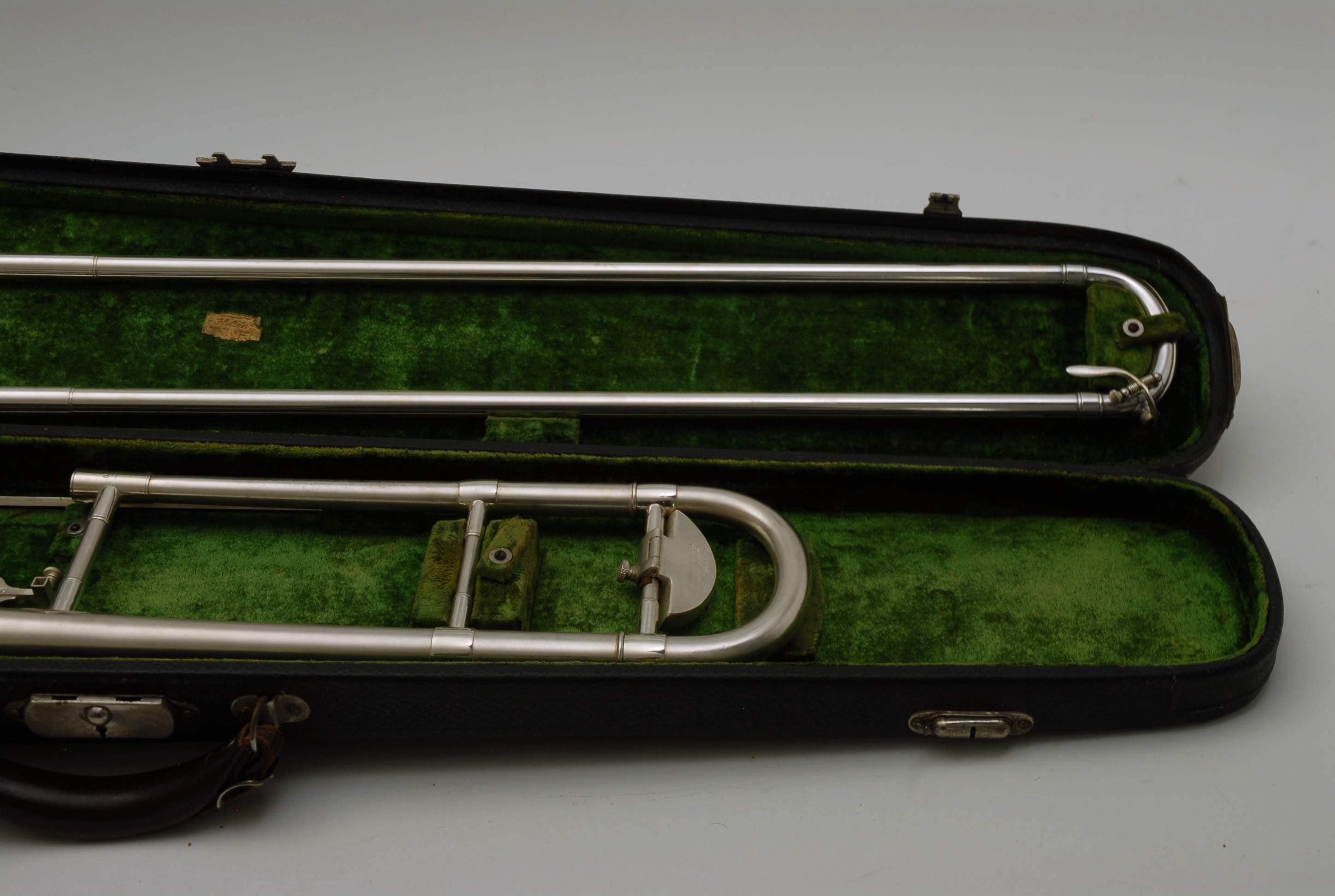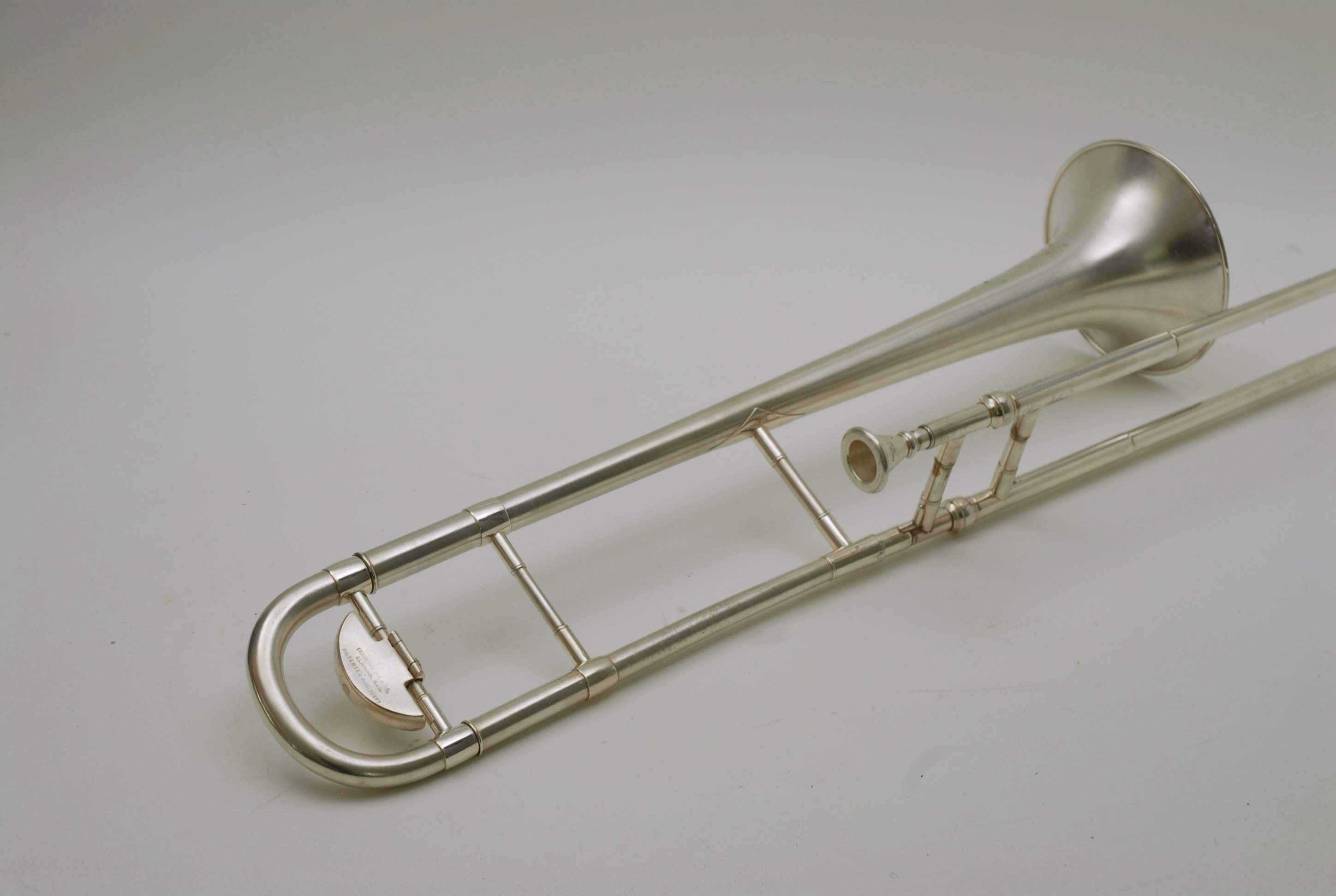 Holton Revelation Trombone Vintage 1924 SN 72469, LP low pitch model. Is all original parts, lacquer, plating, mouthpiece, and case. Ha 6.5" bell and is small bore. Brass bell with glass bead silver plating and gold wash inner bell, all original. The inner slide is also original, nickel silver tubes with copper plated stockings. You don't have to worry about chrome plating loss on this slide because they were not using yet on these early models. Is the type of trombone that you may have played if you were in the John Philip Sousa band, which toured from 1892-1931. Frank Holton was on the Sousa Band Roster in 1892 as a trombonist, a well known professional player, who went on later to start his own instrument factory which began in 1896. An interesting note is that one of the first products Holton was to invent was his own formula of trombone slide oil. This instrument has an original bottle of it still in tact, but it does sort of smell when you open the bottle. I would not use the oil. Is like an museum piece, yet the trombone plays just like it should. Personally, I would love to hear someone play some Arthur Pryor solos with it. Is a piece of American Brass Instrument History.