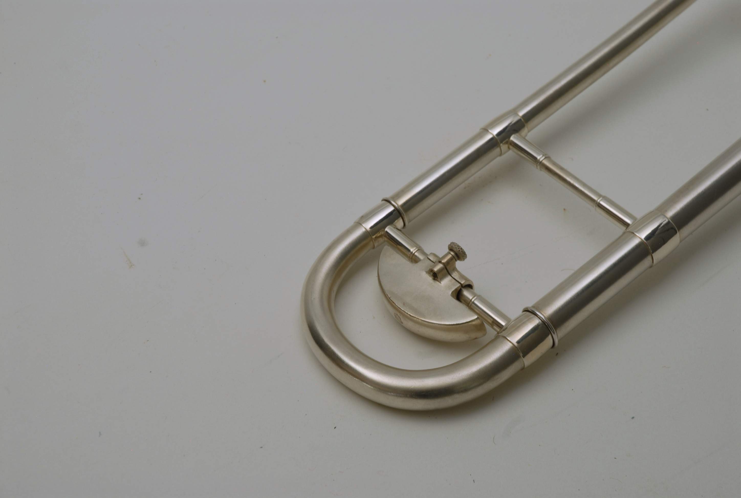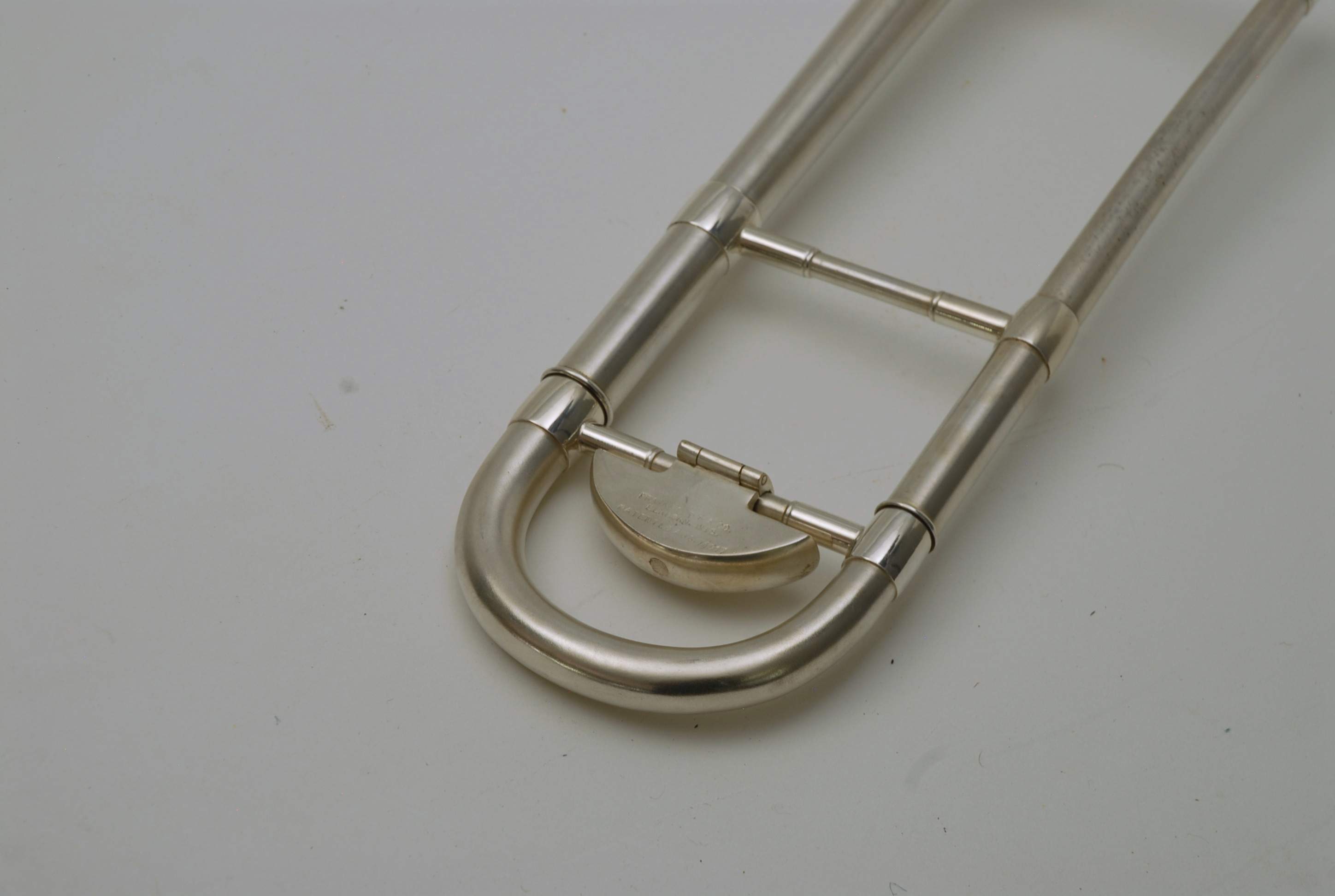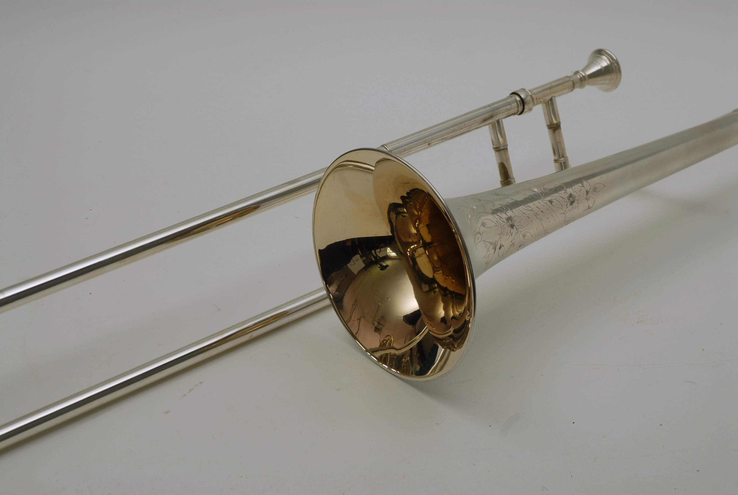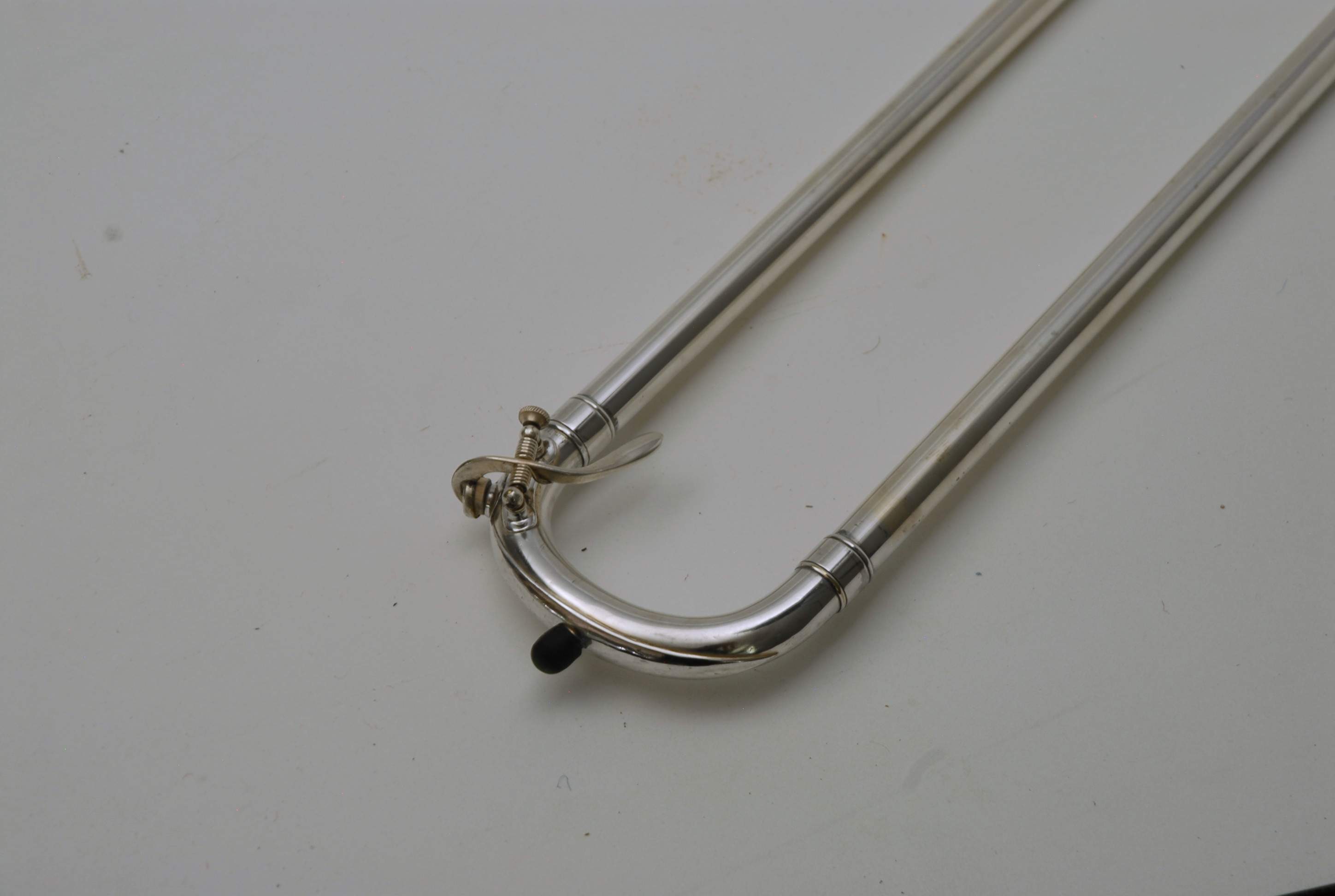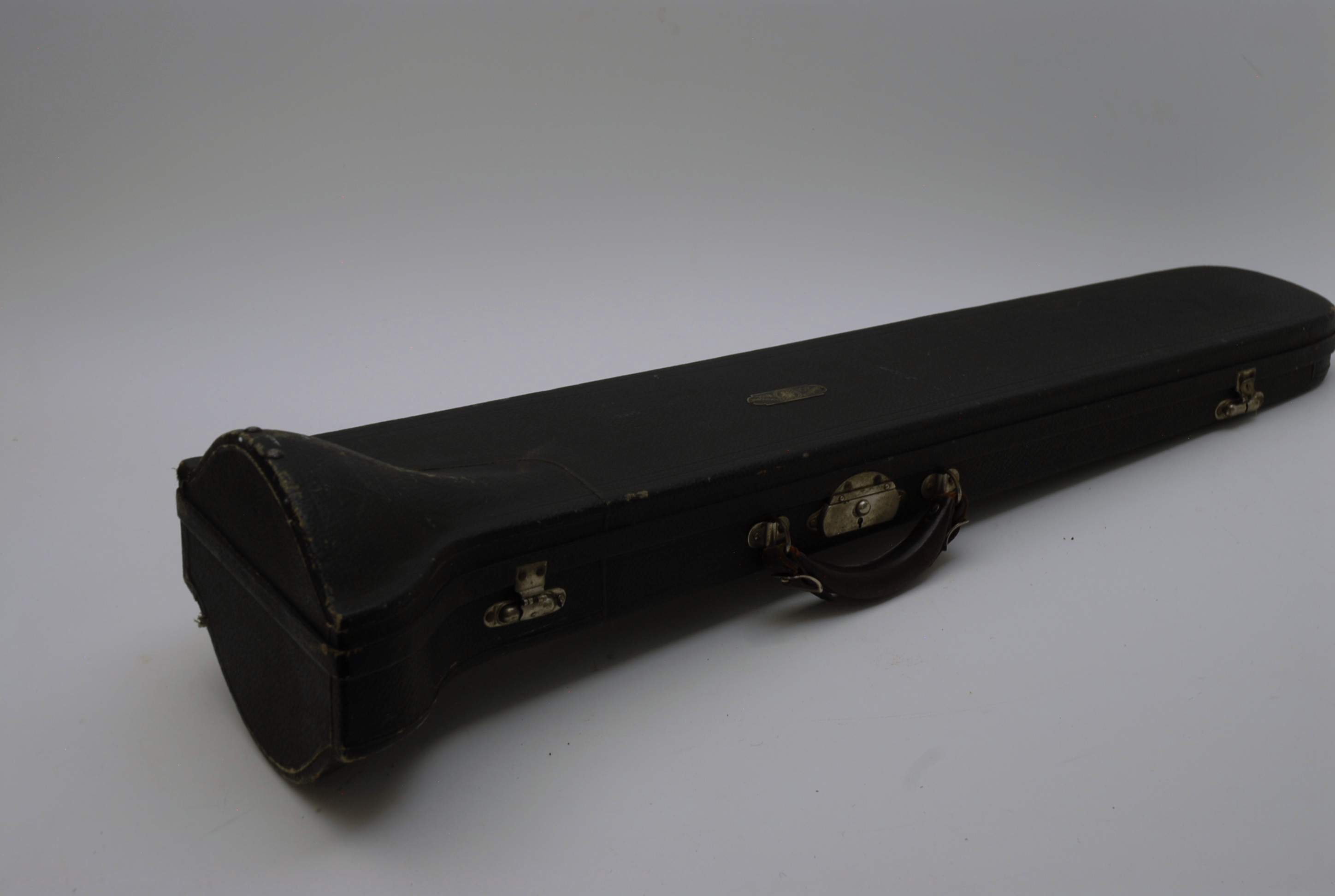Holton Revelation Trombone Vintage 1924 SN 72469, LP low pitch model. Is all original parts, lacquer, plating, mouthpiece, and case. Ha 6.5" bell and is small bore. Brass bell with glass bead silver plating and gold wash inner bell, all original. The inner slide is also original, nickel silver tubes with copper plated stockings. You don't have to worry about chrome plating loss on this slide because they were not using yet on these early models. Is the type of trombone that you may have played if you were in the John Philip Sousa band, which toured from 1892-1931. Frank Holton was on the Sousa Band Roster in 1892 as a trombonist, a well known professional player, who went on later to start his own instrument factory which began in 1896. An interesting note is that one of the first products Holton was to invent was his own formula of trombone slide oil. This instrument has an original bottle of it still in tact, but it does sort of smell when you open the bottle. I would not use the oil. Is like an museum piece, yet the trombone plays just like it should. Personally, I would love to hear someone play some Arthur Pryor solos with it. Is a piece of American Brass Instrument History.
