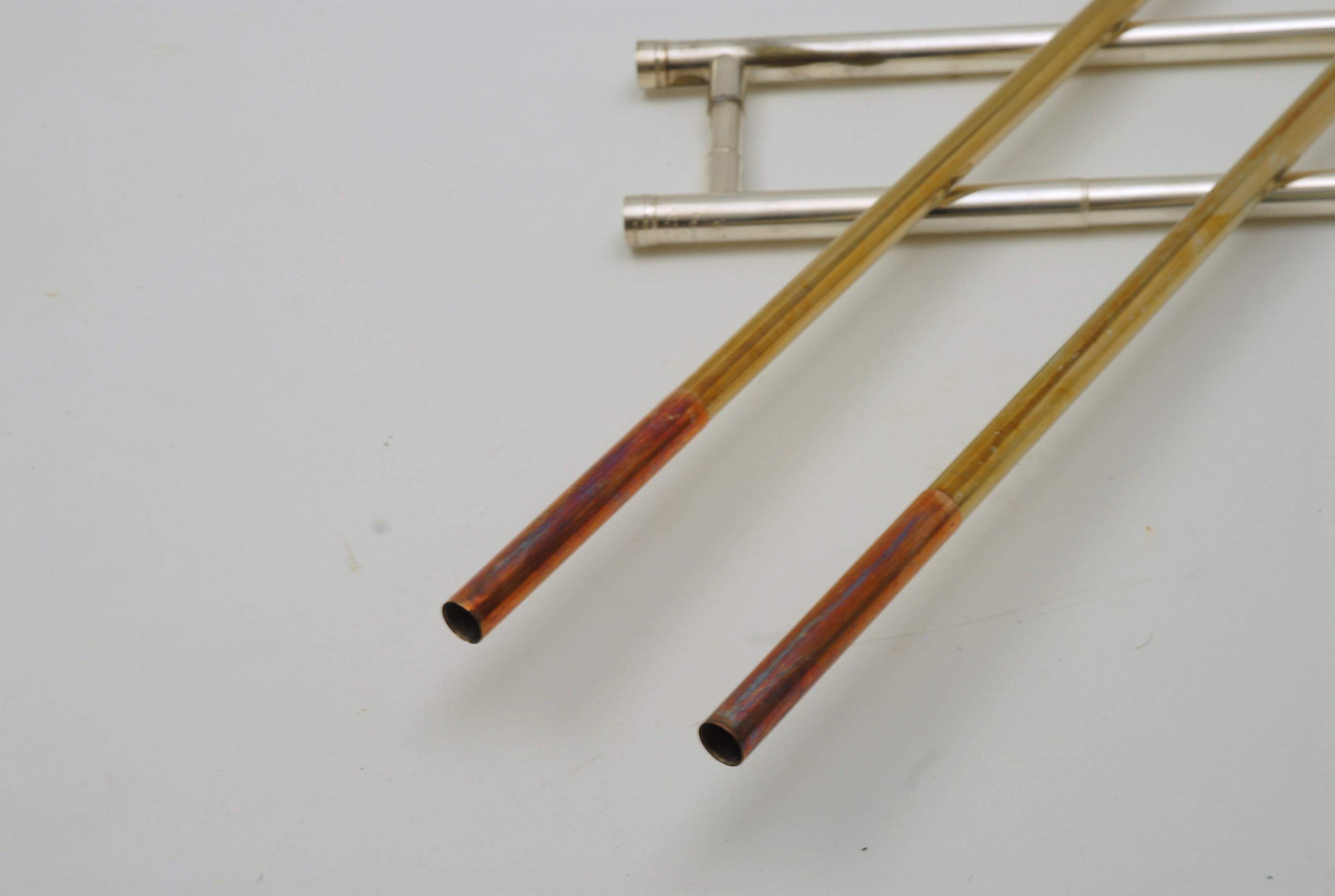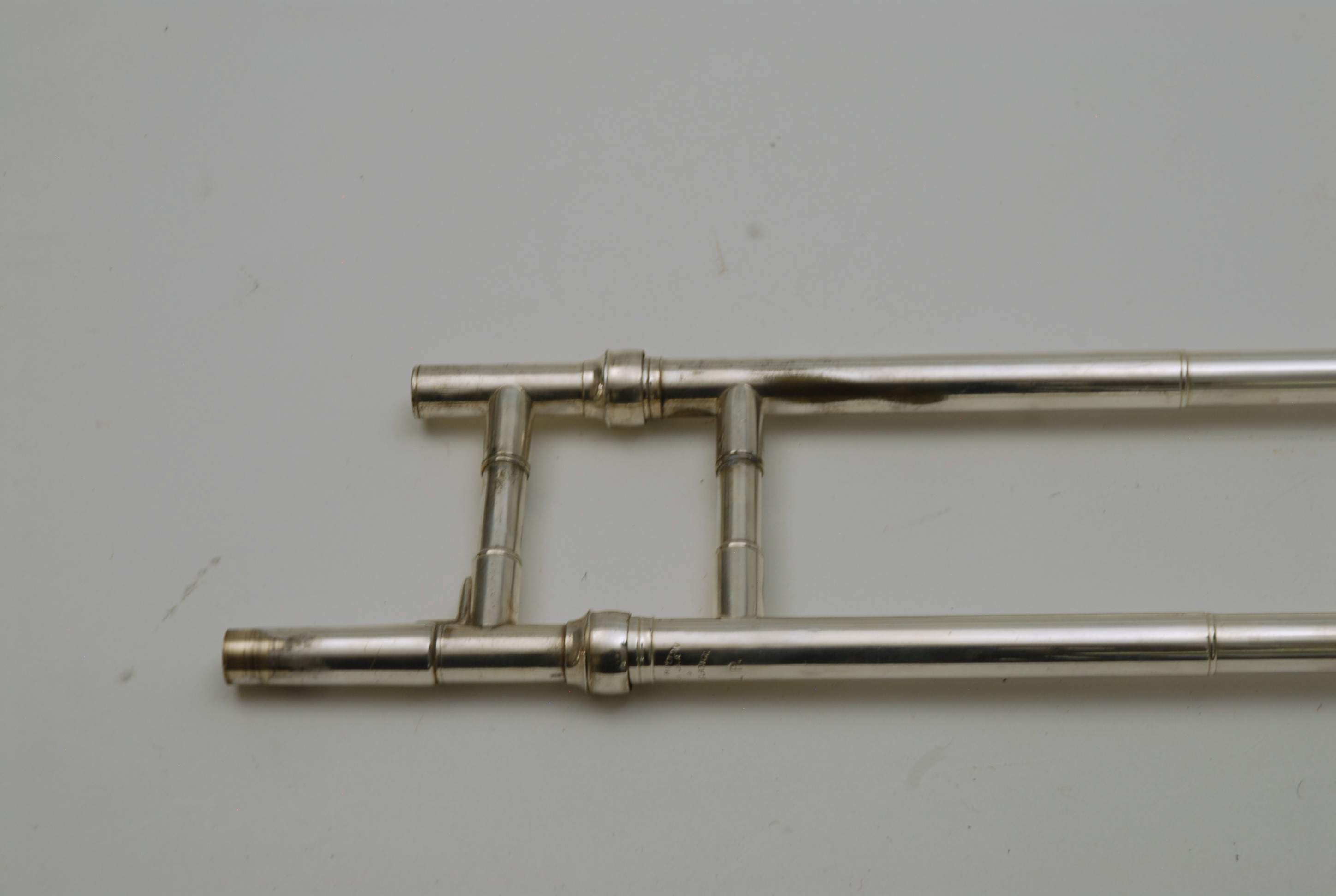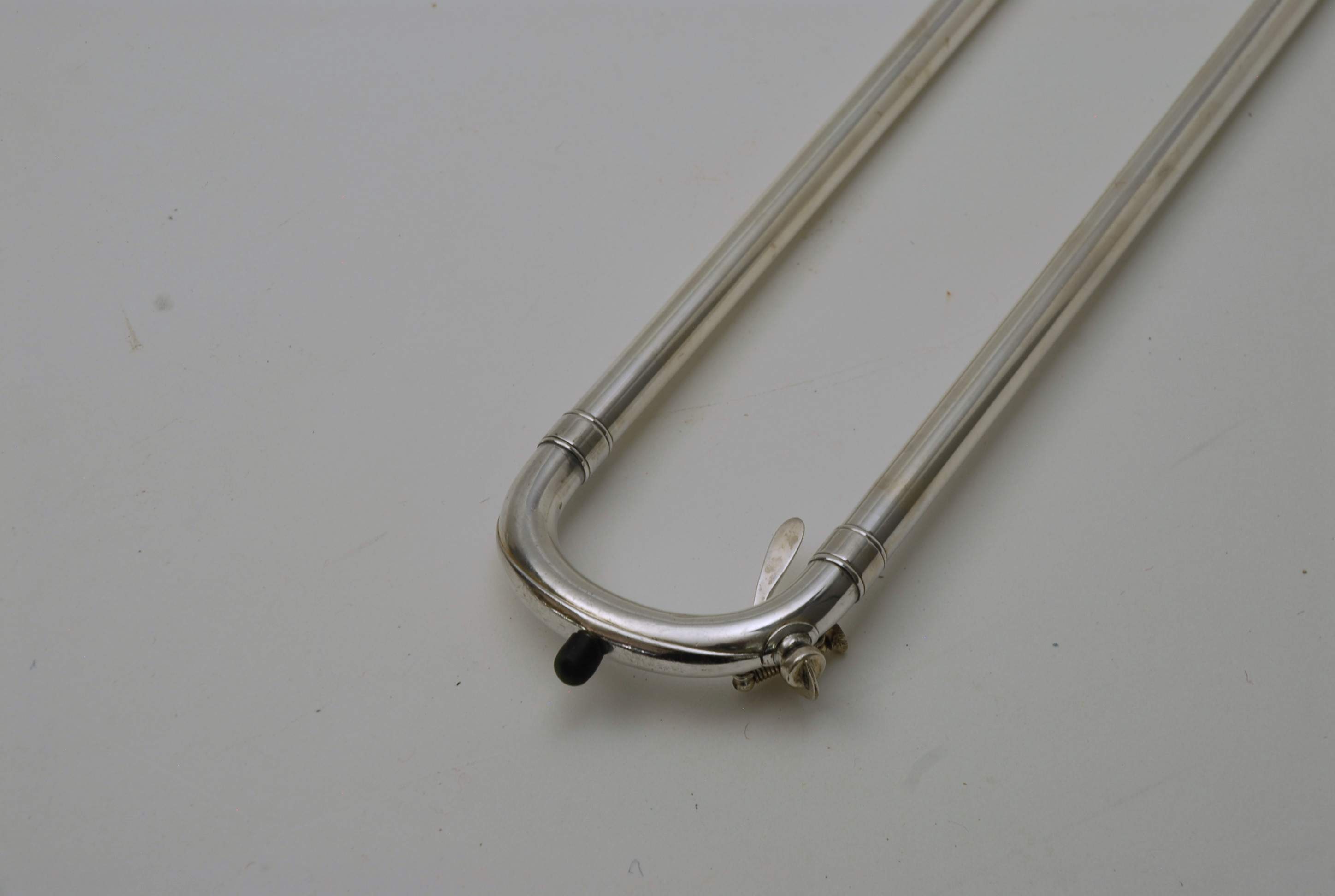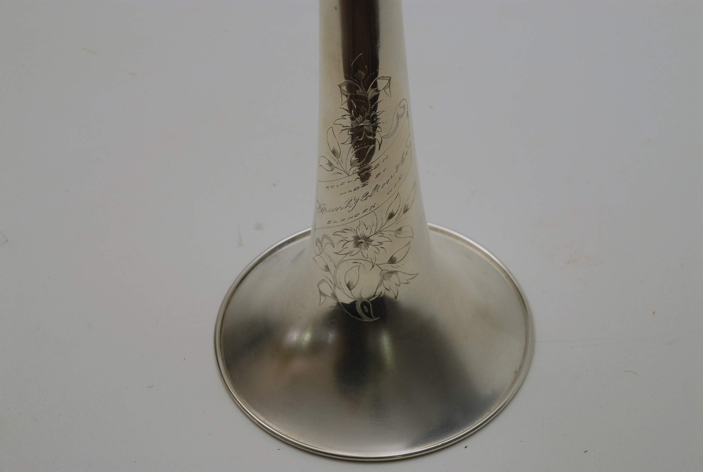 Holton Revelation Trombone Vintage 1924 SN 72469, LP low pitch model. Is all original parts, lacquer, plating, mouthpiece, and case. Ha 6.5" bell and is small bore. Brass bell with glass bead silver plating and gold wash inner bell, all original. The inner slide is also original, nickel silver tubes with copper plated stockings. You don't have to worry about chrome plating loss on this slide because they were not using yet on these early models. Is the type of trombone that you may have played if you were in the John Philip Sousa band, which toured from 1892-1931. Frank Holton was on the Sousa Band Roster in 1892 as a trombonist, a well known professional player, who went on later to start his own instrument factory which began in 1896. An interesting note is that one of the first products Holton was to invent was his own formula of trombone slide oil. This instrument has an original bottle of it still in tact, but it does sort of smell when you open the bottle. I would not use the oil. Is like an museum piece, yet the trombone plays just like it should. Personally, I would love to hear someone play some Arthur Pryor solos with it. Is a piece of American Brass Instrument History.