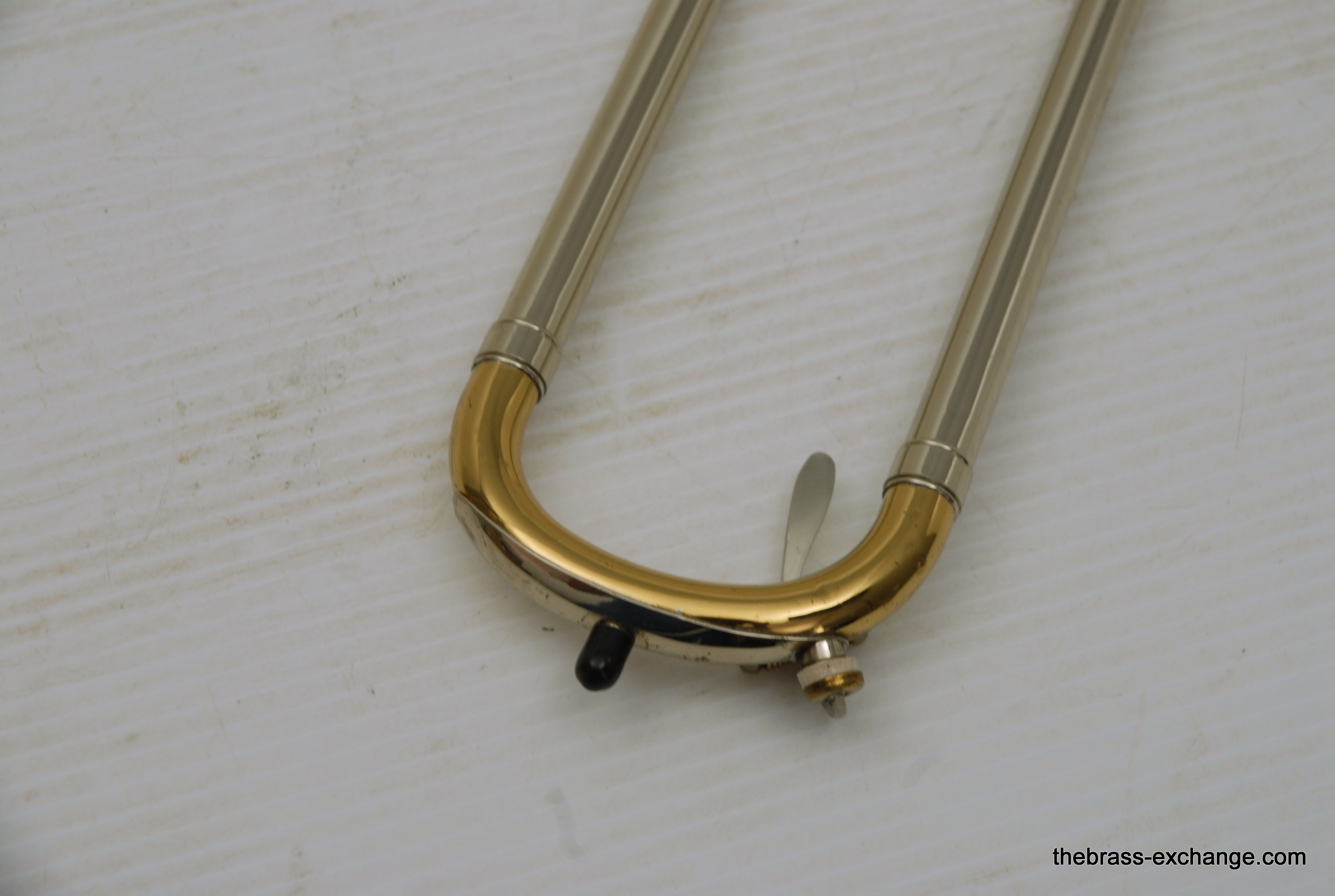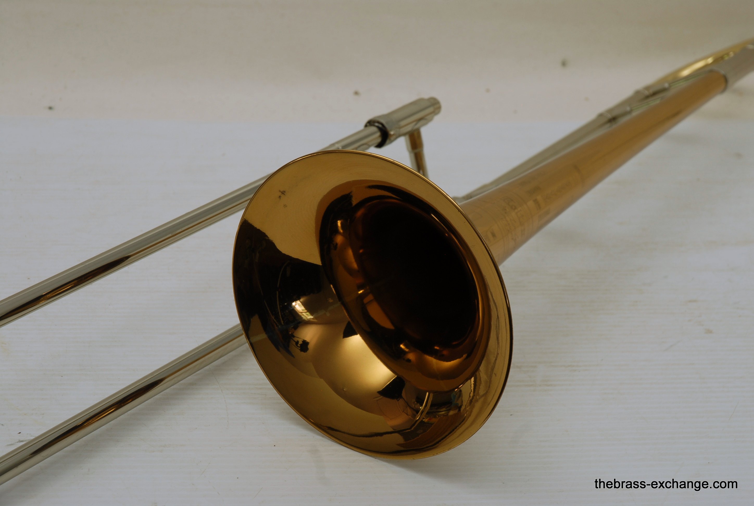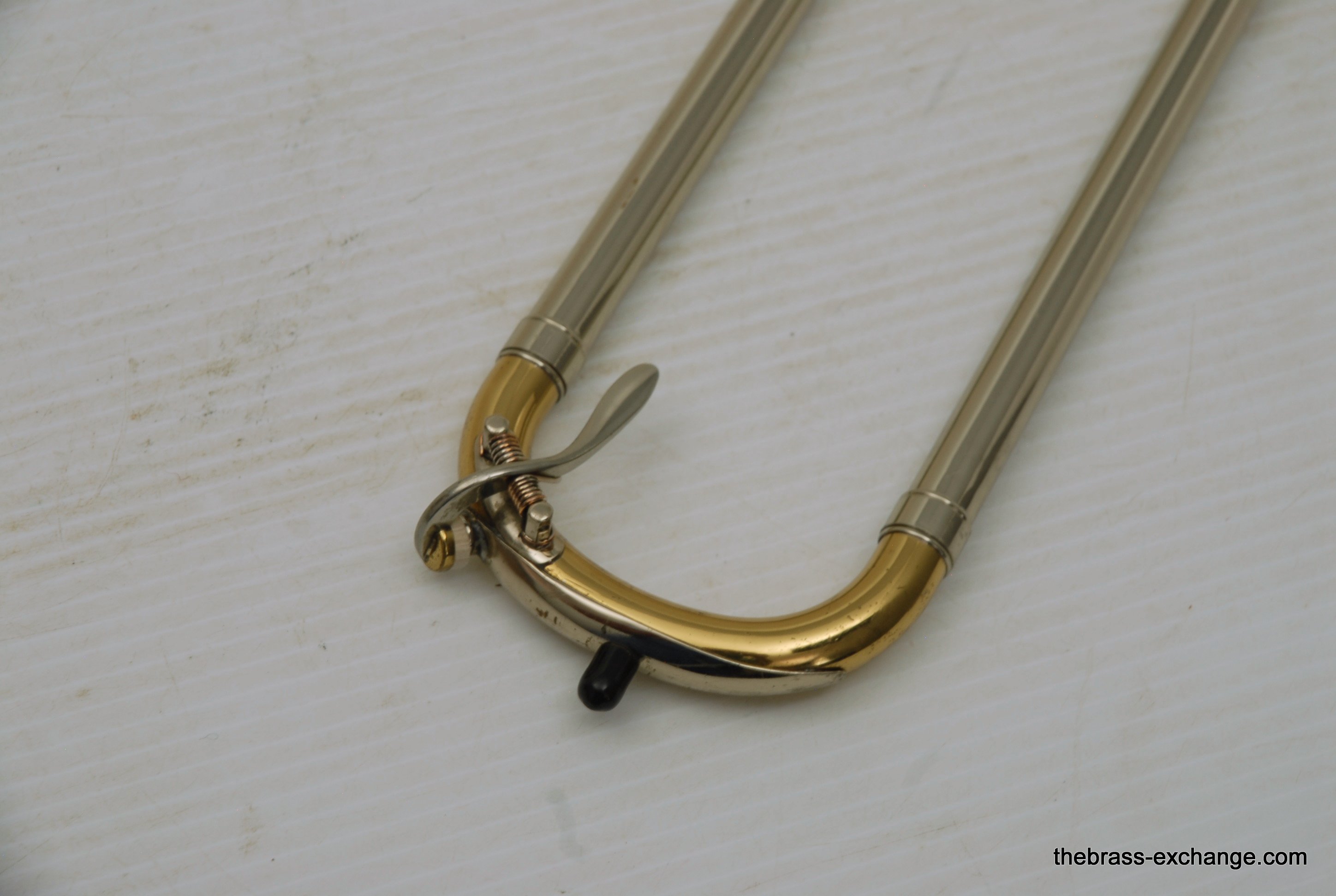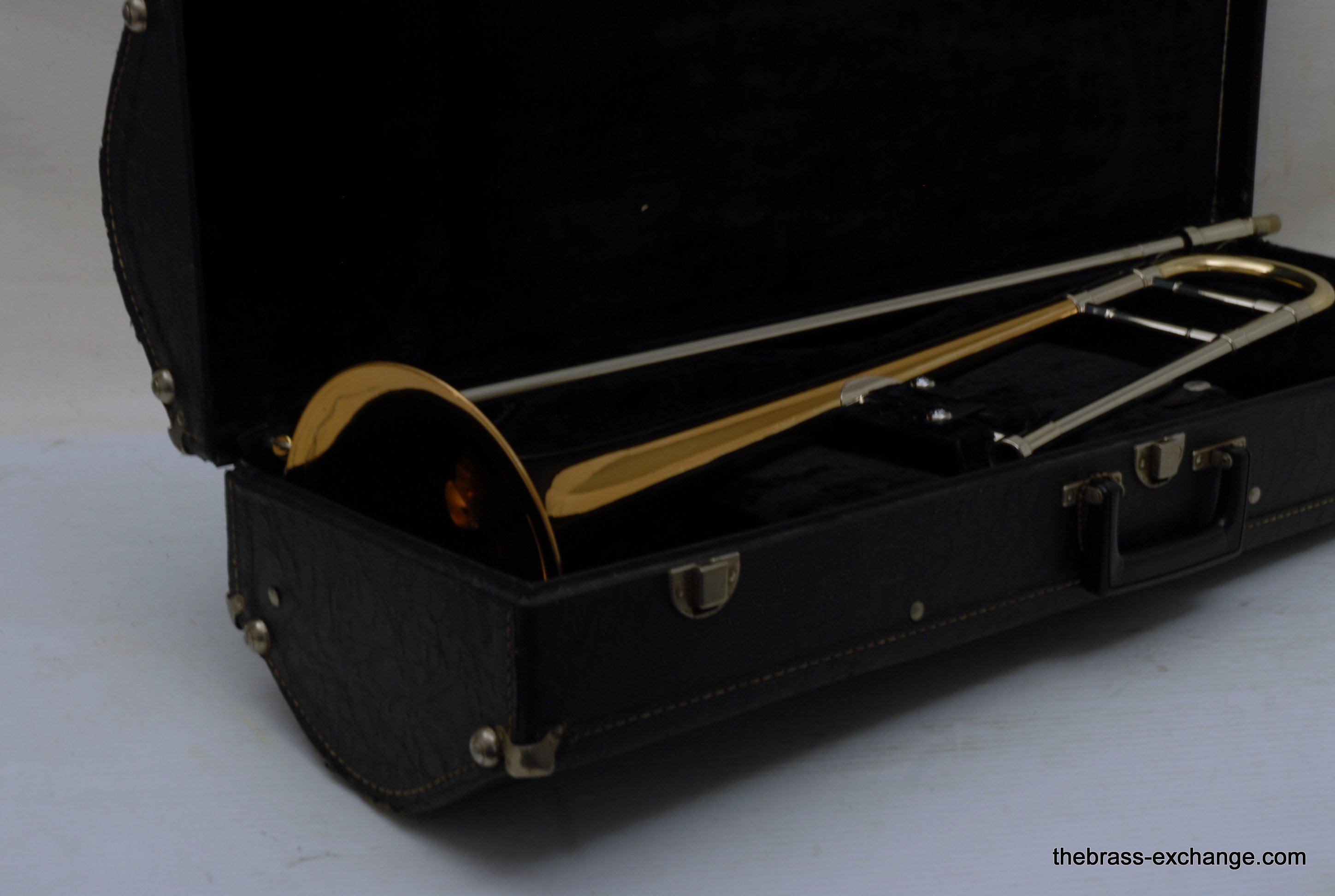 Holton Stratodyne Model 67 Vintage 1955.  Holton was making trombones going back to 1900.  This one was made 55 years into the companies existence. Has a 7.5" gold brass bell, hand engraved, and lightweight nickel silver handslide with .485.  Has had full shop service with chemical bath. Has also had a professional handslide set-up, tube straightening, de-stressed, outer tube inner surface polishing, is as good as it gets now.  No dents or dings, inner and outer slide tubes are in excellent shape.  Has very good slide alignment and plays fantastic.  Previous dent work on bell flare, no issues. All original lacquer, in very good shape.  There has always been something special about the combination of gold brass bell paired with a nickel silver handslide.  It produces a very warm yet vibrant sound, with lot's of depth.  The horn plays multi-dimensional and will do what you ask it to.  Great sound for lead/jazz/solo.  Many famous jazz guys loved these Holton's, including Buddy Morrow.  Not many of them become available becasue usually the guys that own them are real players and they know they have something special.  This one is available now.  Comes with orignal case.  In-stock for immediate delivery.