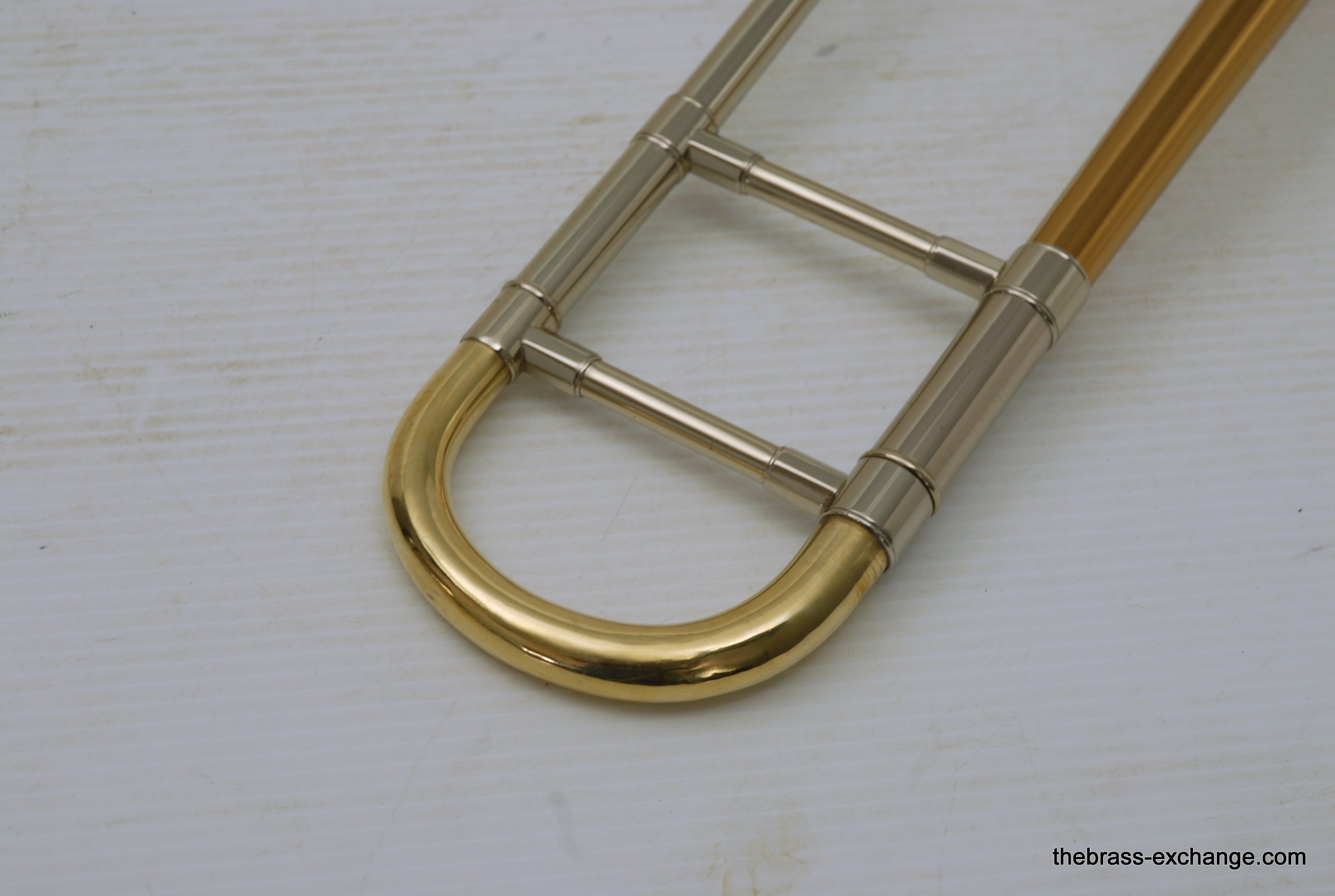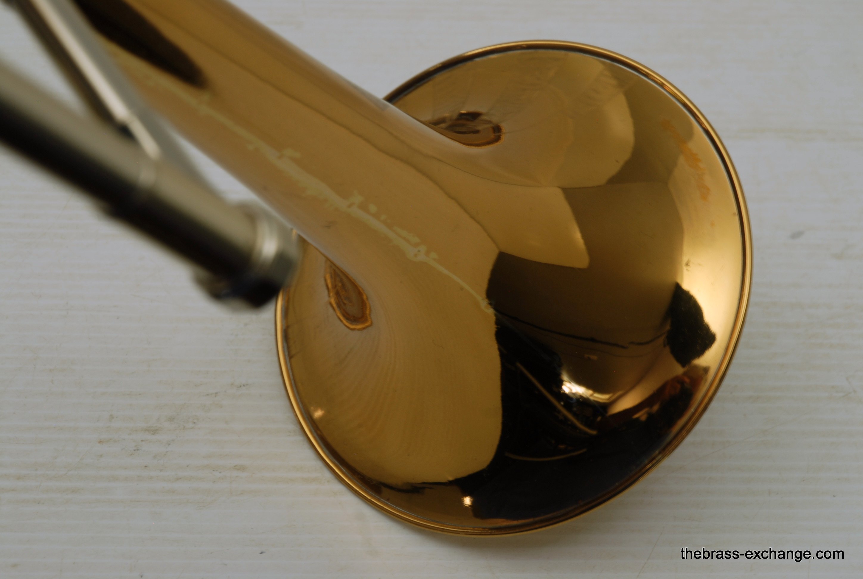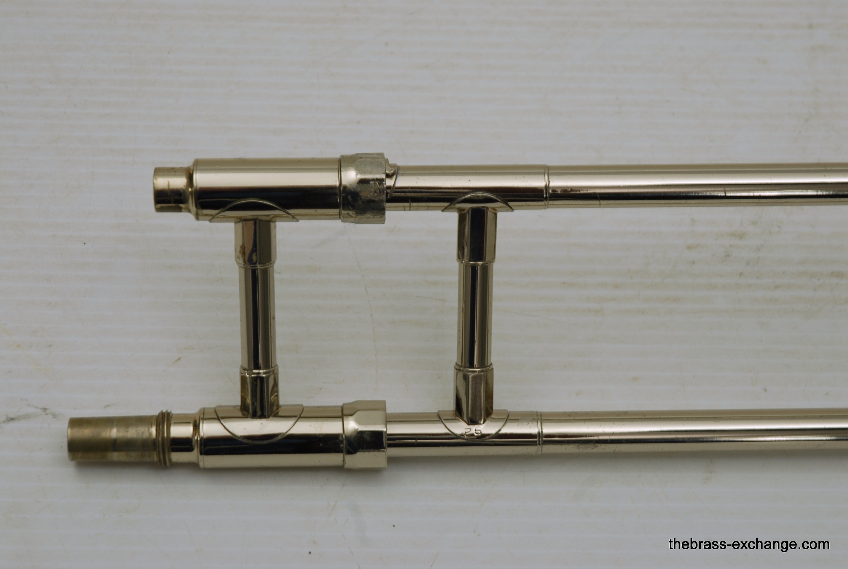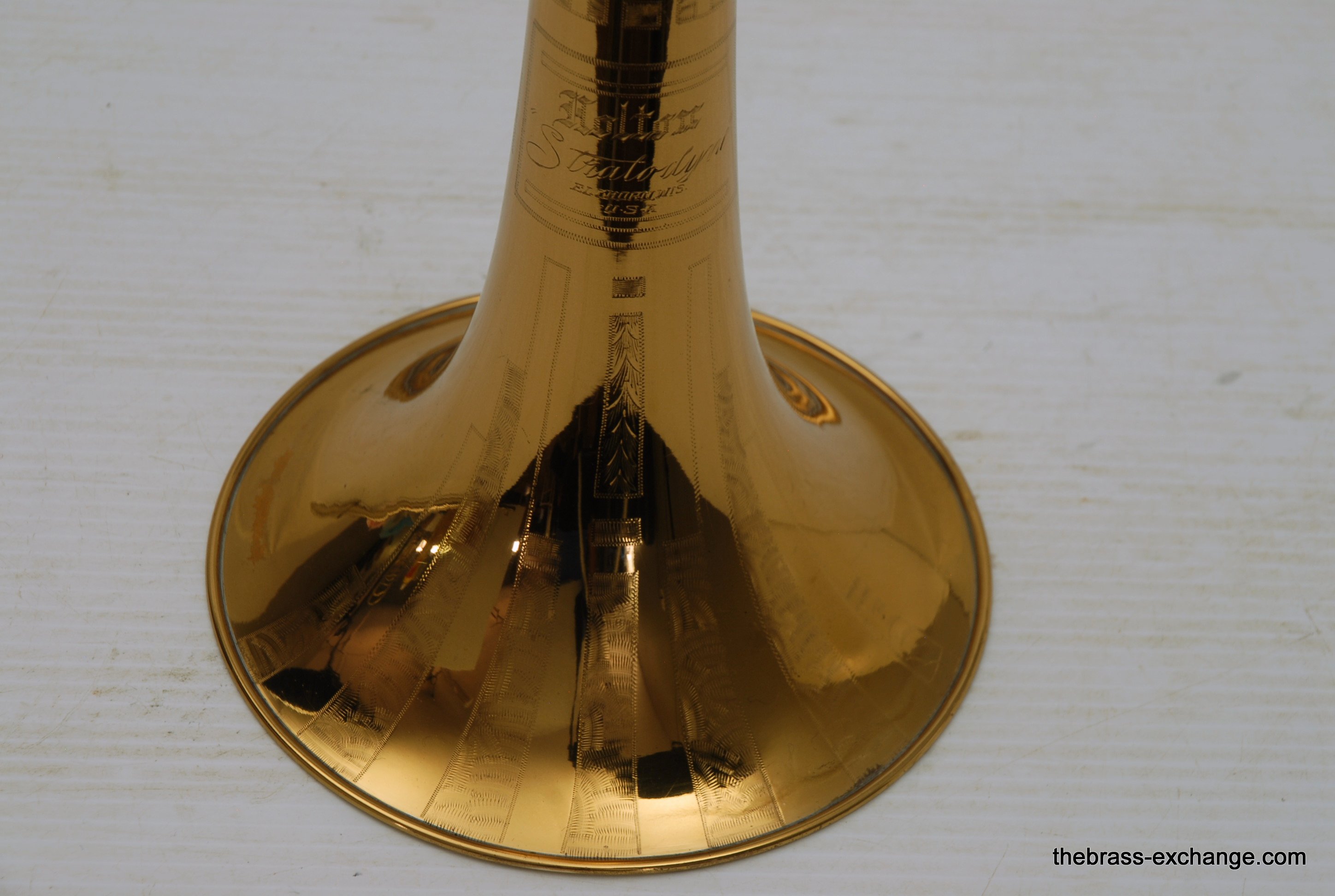 Holton Stratodyne Model 67 Vintage 1955.  Holton was making trombones going back to 1900.  This one was made 55 years into the companies existence. Has a 7.5" gold brass bell, hand engraved, and lightweight nickel silver handslide with .485.  Has had full shop service with chemical bath. Has also had a professional handslide set-up, tube straightening, de-stressed, outer tube inner surface polishing, is as good as it gets now.  No dents or dings, inner and outer slide tubes are in excellent shape.  Has very good slide alignment and plays fantastic.  Previous dent work on bell flare, no issues. All original lacquer, in very good shape.  There has always been something special about the combination of gold brass bell paired with a nickel silver handslide.  It produces a very warm yet vibrant sound, with lot's of depth.  The horn plays multi-dimensional and will do what you ask it to.  Great sound for lead/jazz/solo.  Many famous jazz guys loved these Holton's, including Buddy Morrow.  Not many of them become available becasue usually the guys that own them are real players and they know they have something special.  This one is available now.  Comes with orignal case.  In-stock for immediate delivery.