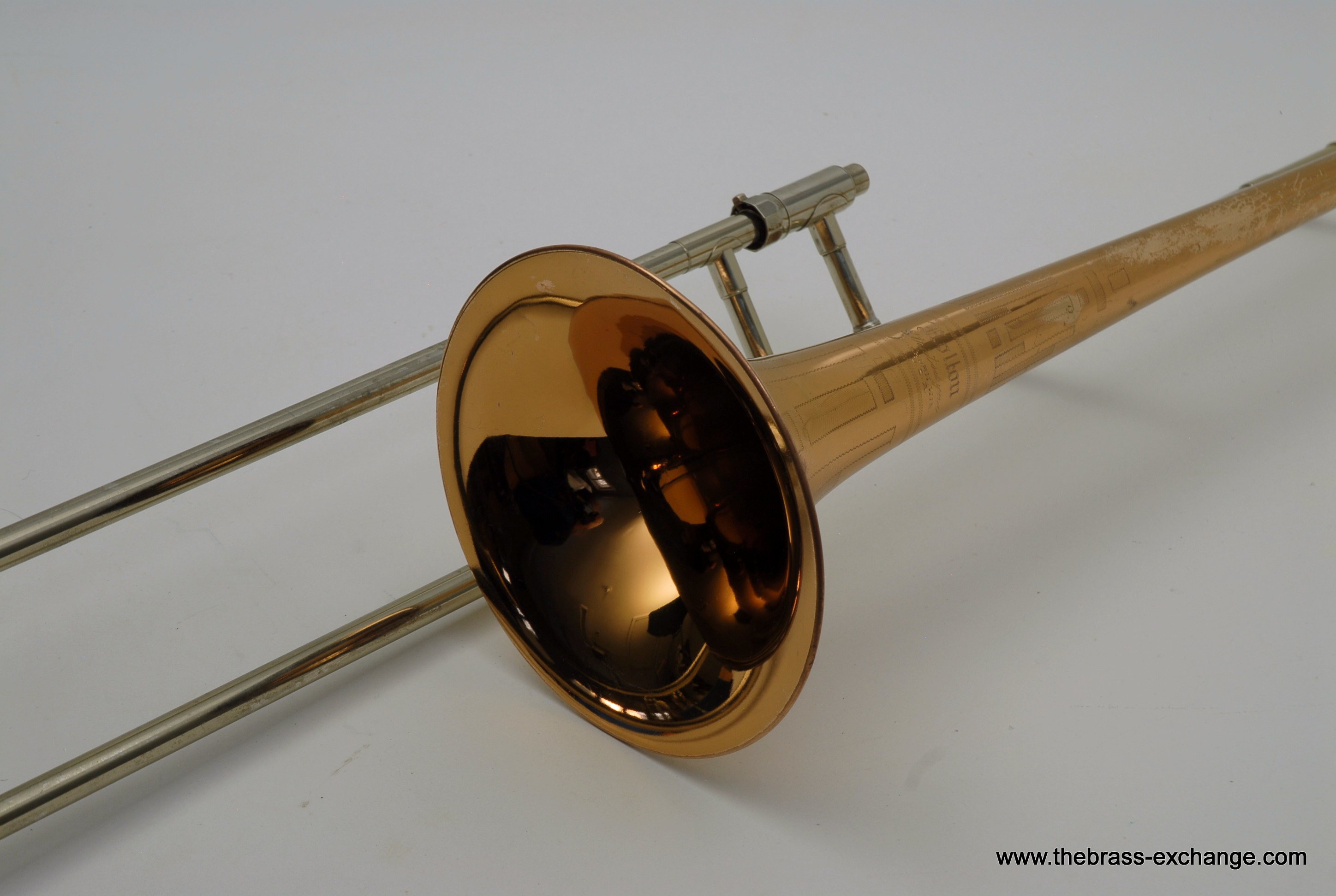 The instrument features a 7.5-inch gold-brass bell with hand-engraved decoration, paired with a lightweight nickel-silver handslide of .485 bore.