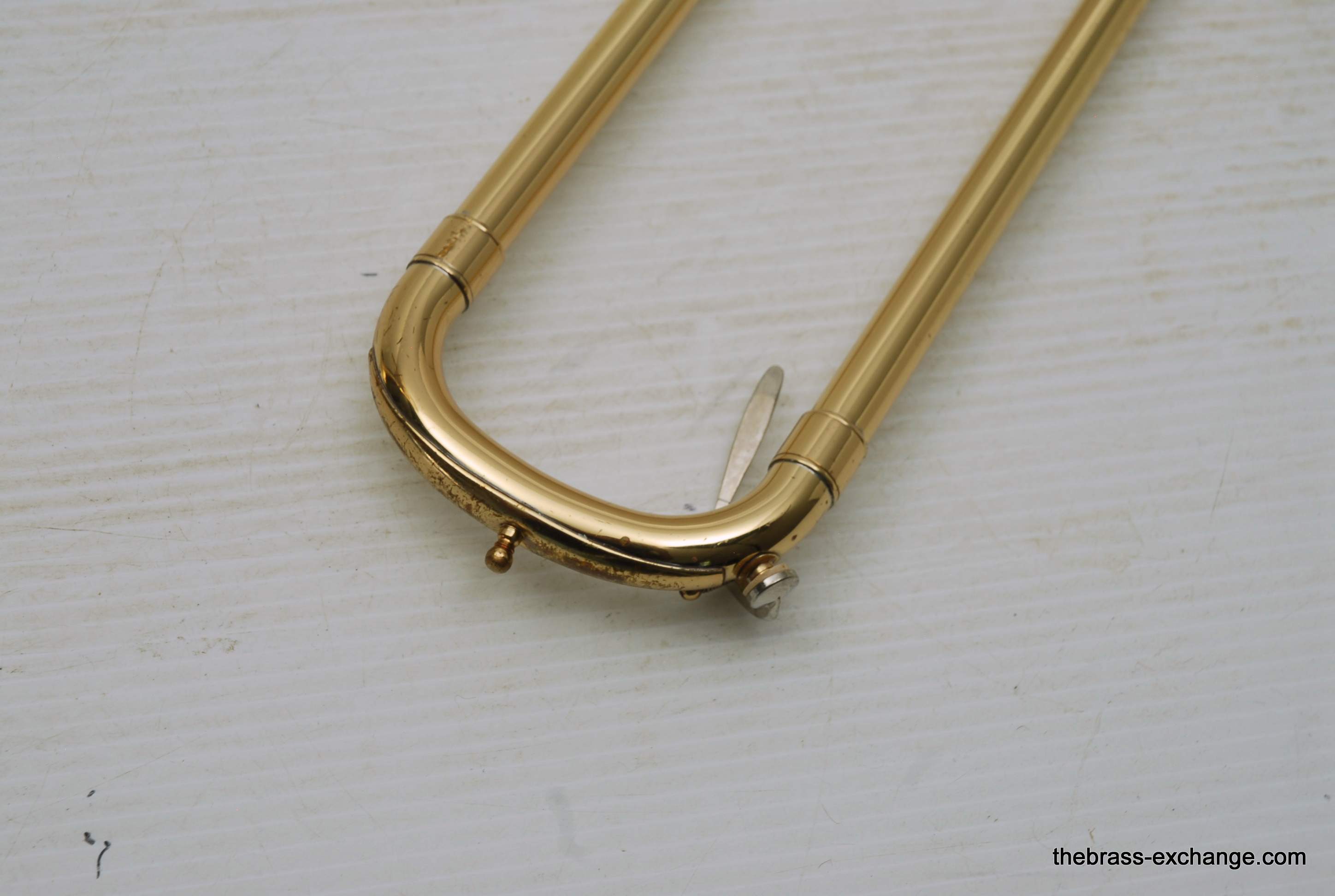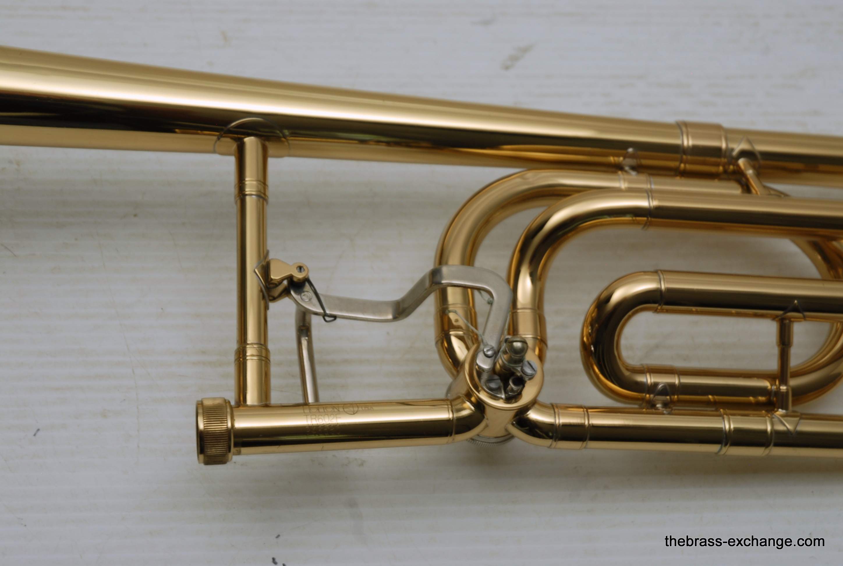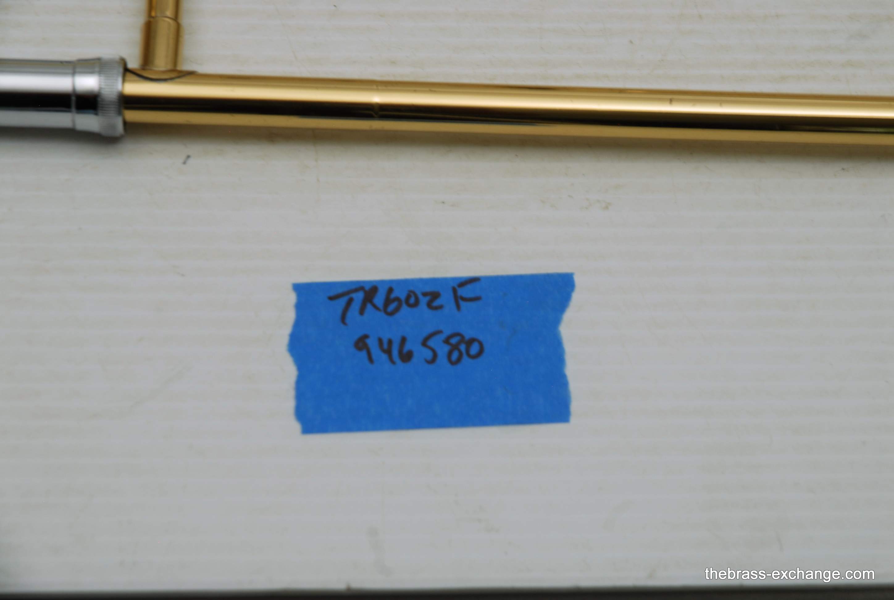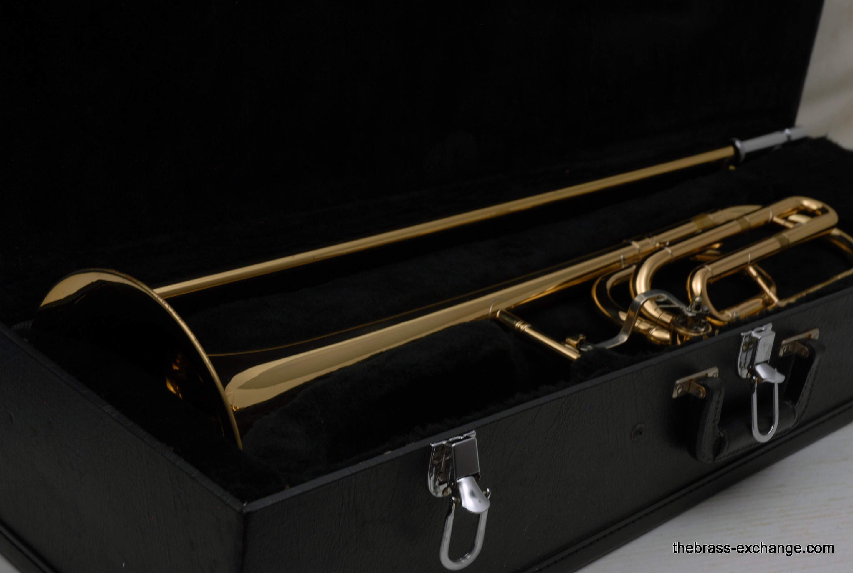 Holton TR-602F, Medium bore intermediate level used trombone.  Good condition, above average appearance, plays proper.  Has 8" Yellow Brass Bell, Traditional Wrap F rotor, .525 bore medium size slide for standard shank trombone mouthpiece.  A 6 1/2 size MP is right in the sweet spot of this horn, which is perfect for an advancing student looking to depart from an entry level instrument.  Has original wood shell case in very good conditon. No service needs to improve playability.  Slide checks out just fine with proper lubricant.  Would be a great choice for a young player looiing for an instrument that actually plays.  Mouthpiece not included.  In stock for immediate delivery.