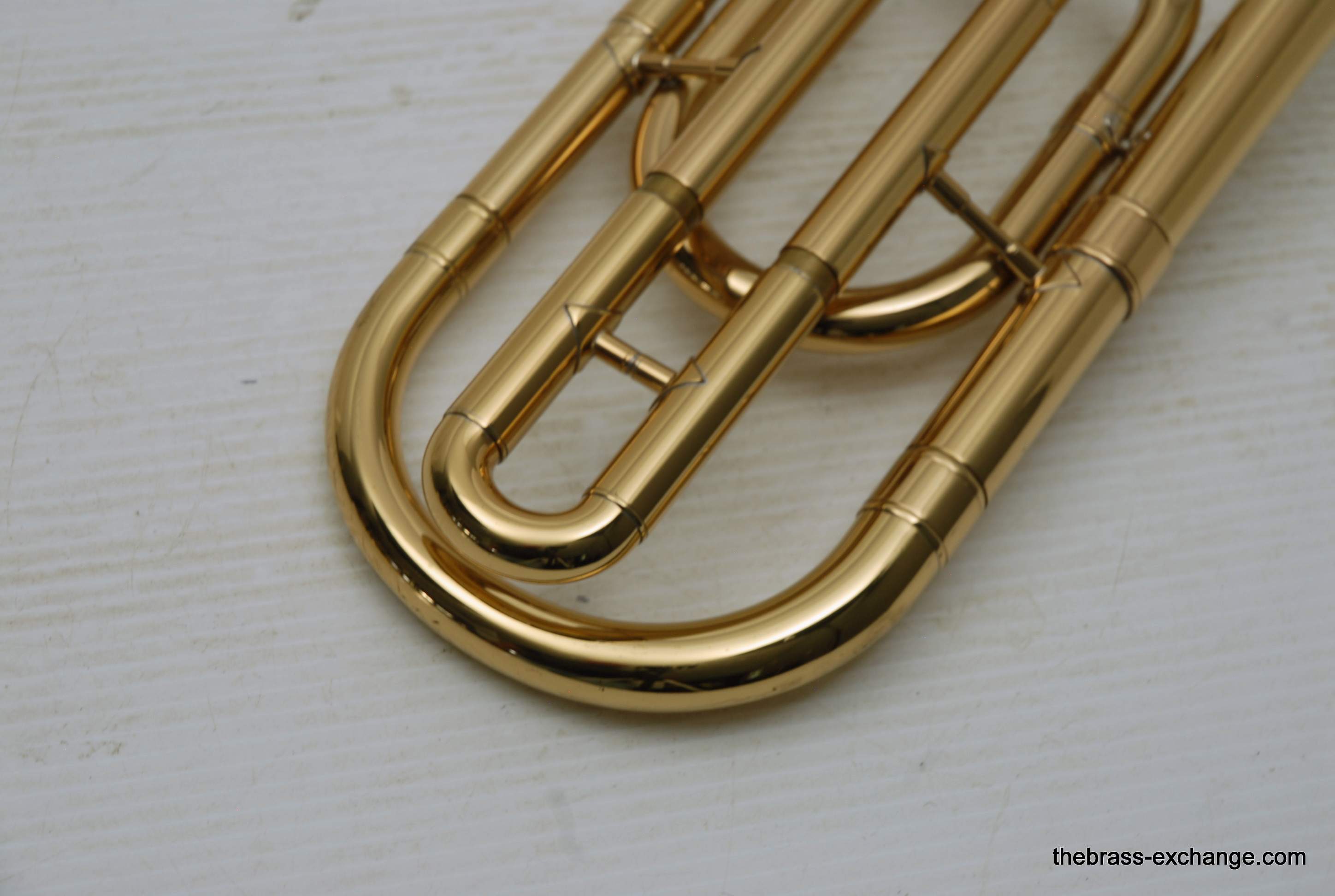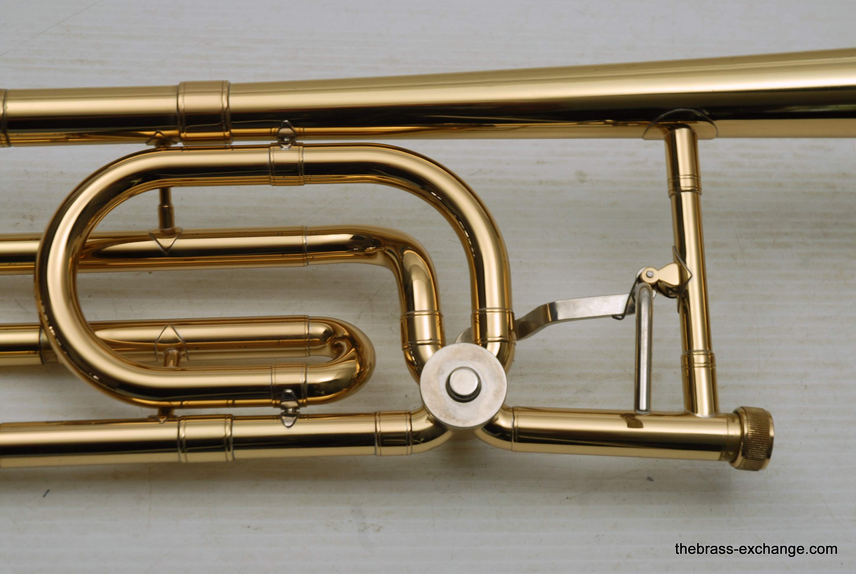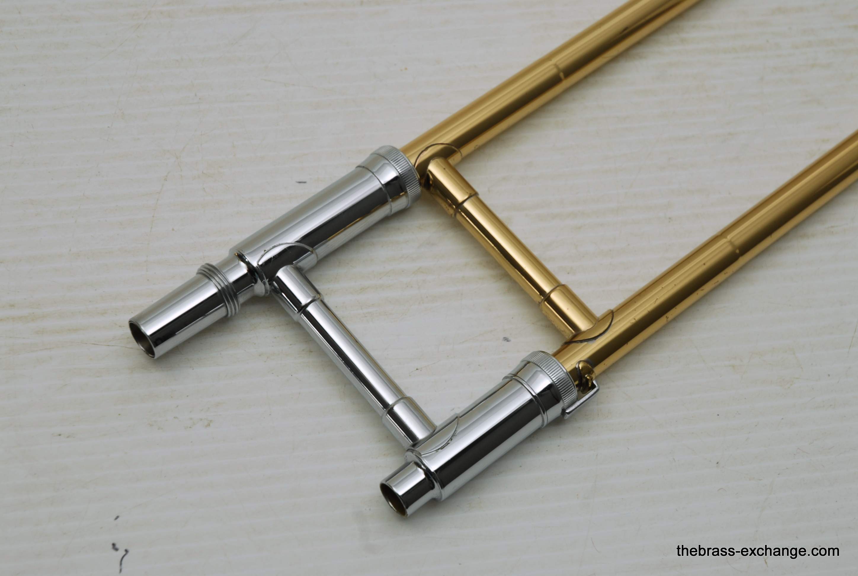 Holton TR-602F, Medium bore intermediate level used trombone.  Good condition, above average appearance, plays proper.  Has 8" Yellow Brass Bell, Traditional Wrap F rotor, .525 bore medium size slide for standard shank trombone mouthpiece.  A 6 1/2 size MP is right in the sweet spot of this horn, which is perfect for an advancing student looking to depart from an entry level instrument.  Has original wood shell case in very good conditon. No service needs to improve playability.  Slide checks out just fine with proper lubricant.  Would be a great choice for a young player looiing for an instrument that actually plays.  Mouthpiece not included.  In stock for immediate delivery.