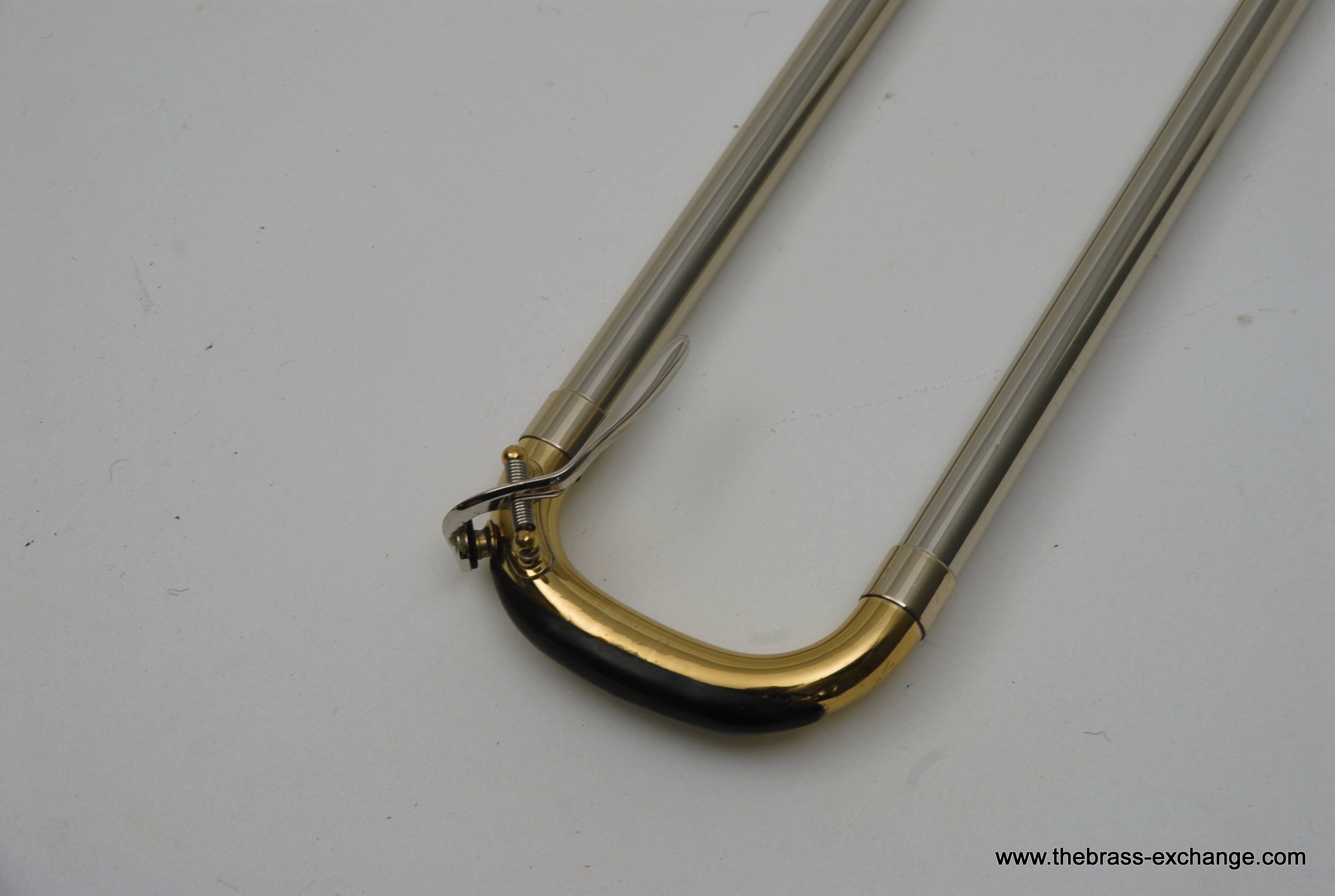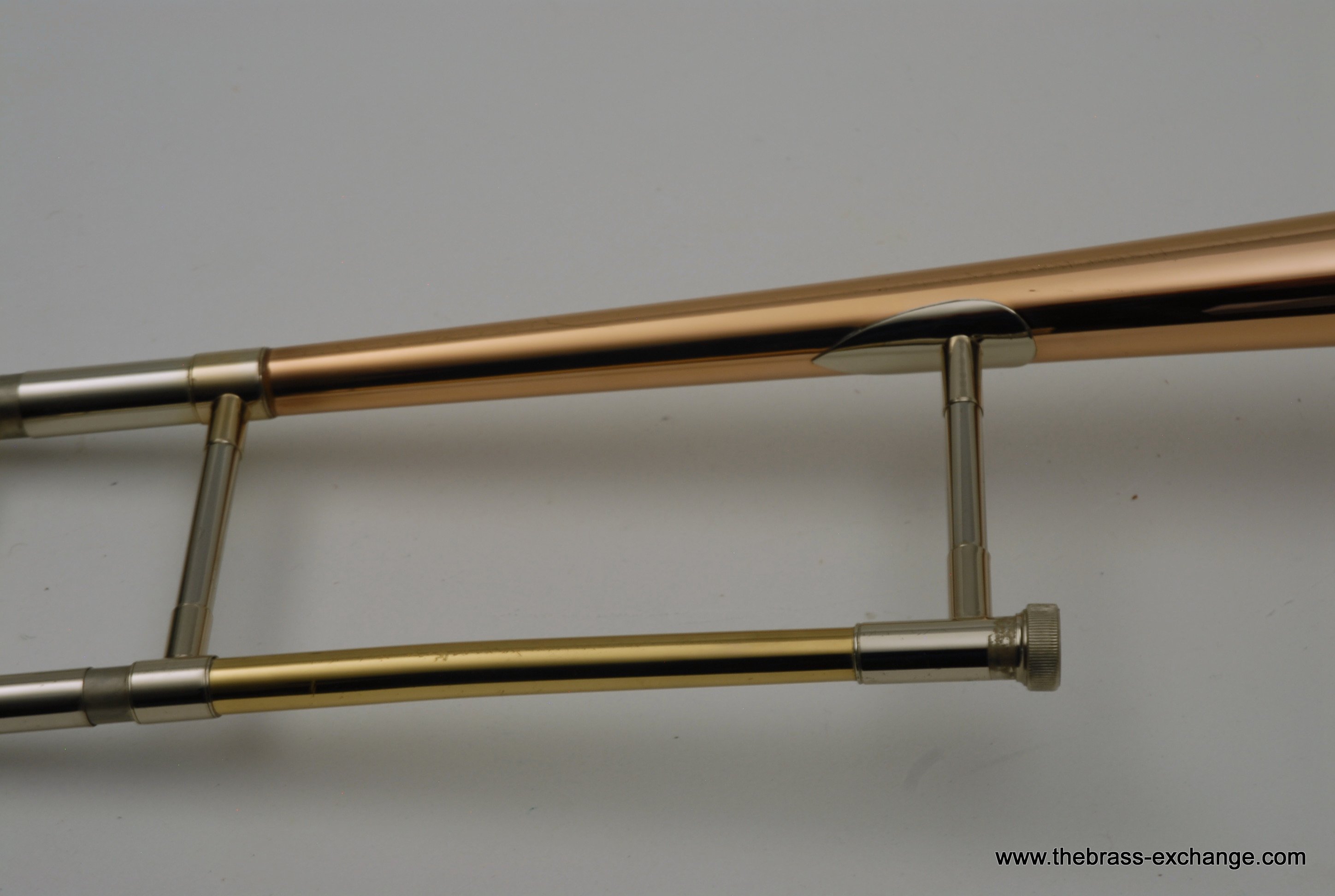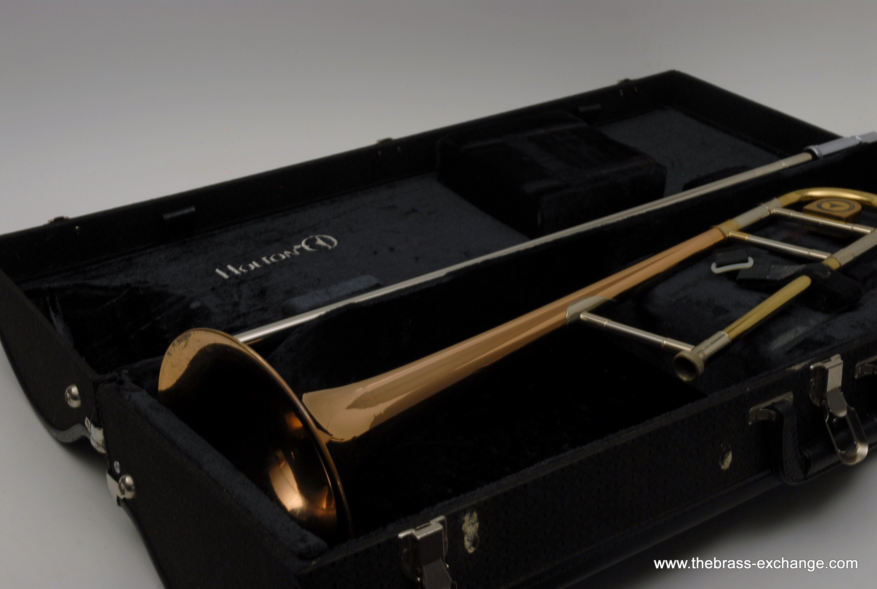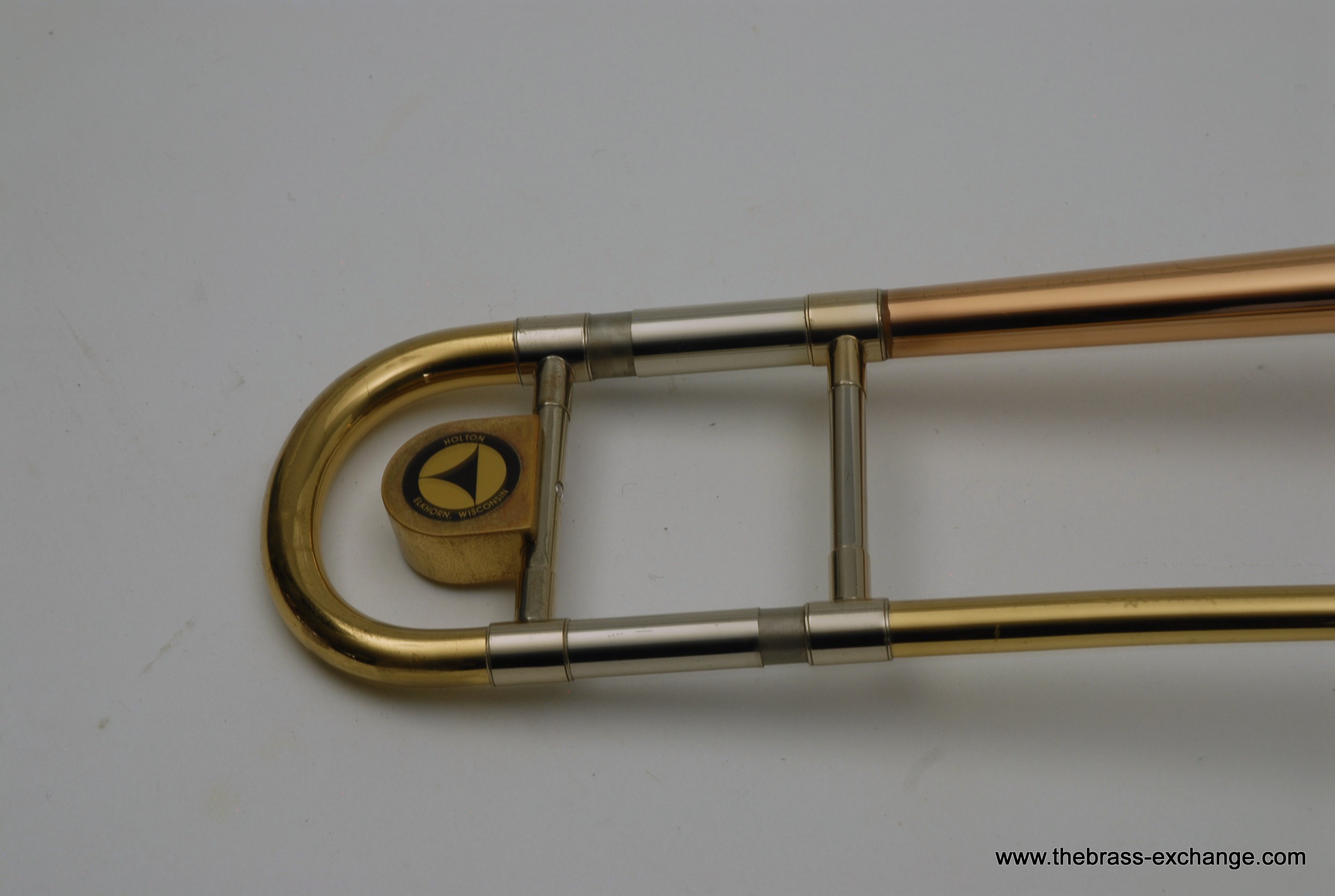 Holton TR100 Jazz Trombone SN 622166.  Has 8" gold brass bell with .500 bore light weight nickel silver slide.  Is in very good condition.  No cleaning or service needed.  Has the same specs as the classic Conn 6H Model, except with Gold Brass Bell.  Holton was making brass instruments going all the way back to the early 1900's.  Quality build was always a priority for the company.  We think this is an excellent example of a great Holton.  Gold brass plays with more warmth than standard yellow.  Is an excellent choice for Jazz/Commercial style music.  No slide inner tube plating defects on this instrument.  The slide is fantastic and will not disappoint.  Includes original case.